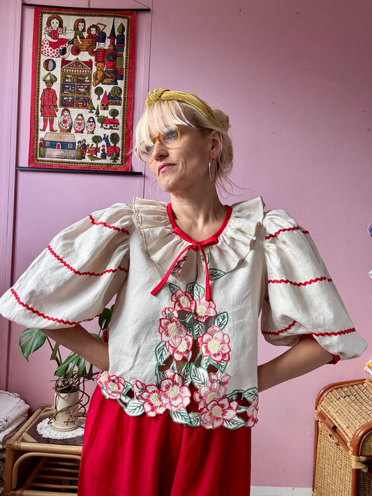 Beige blouse with red flowers and ric rac