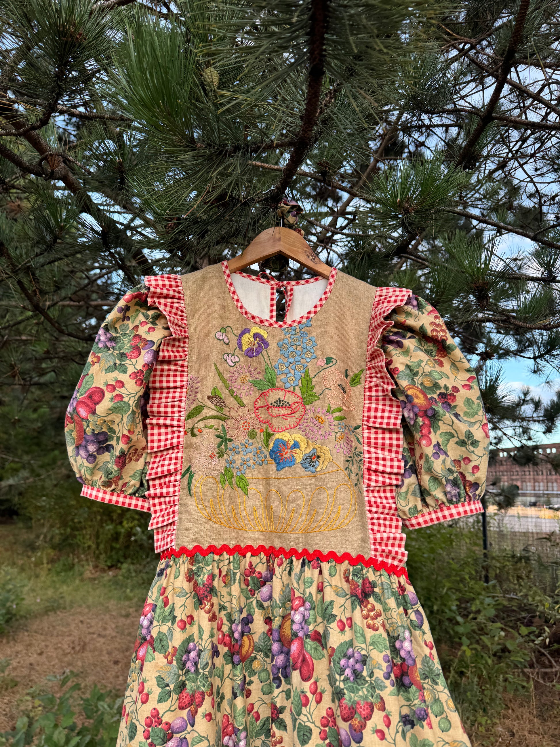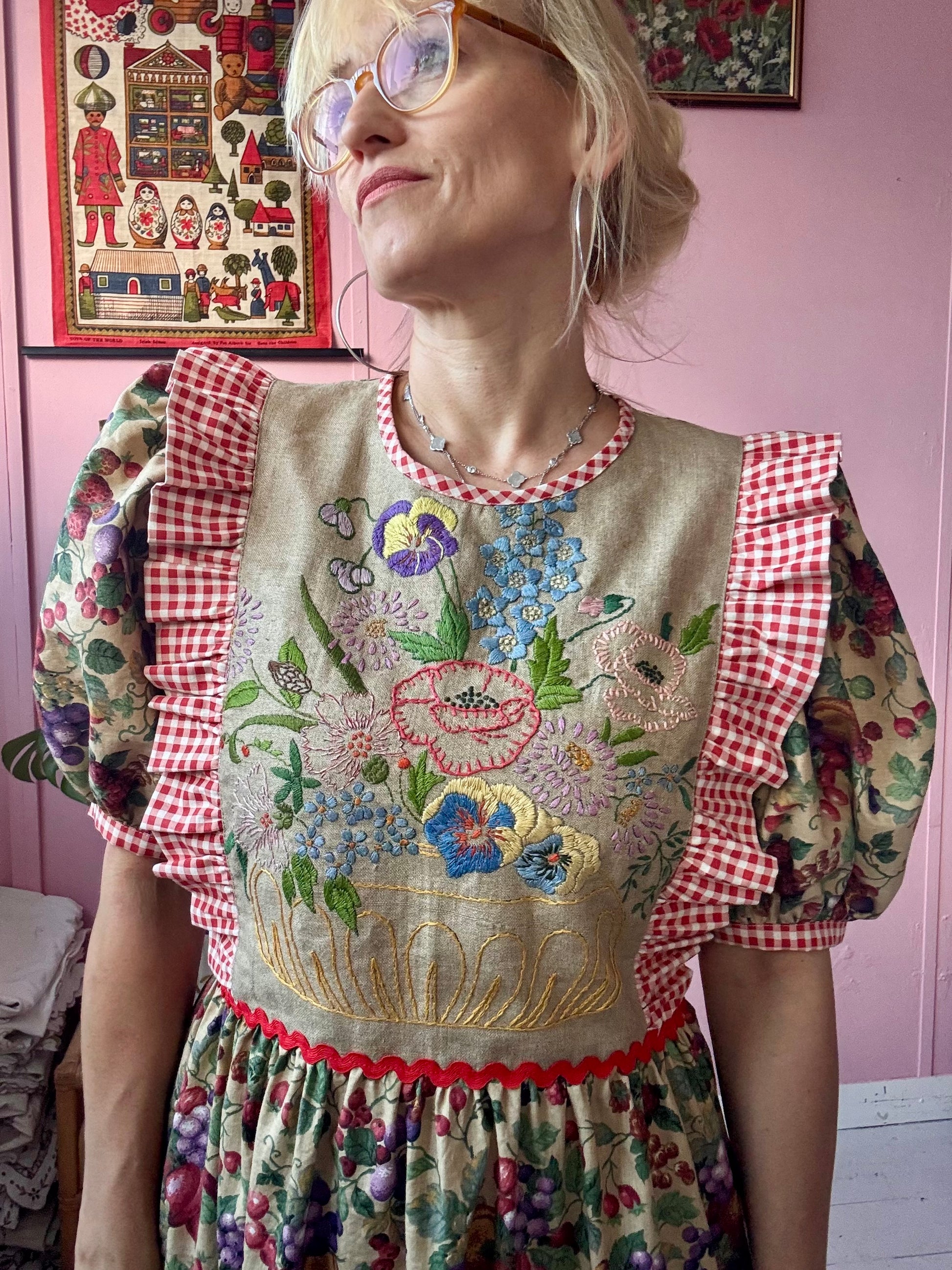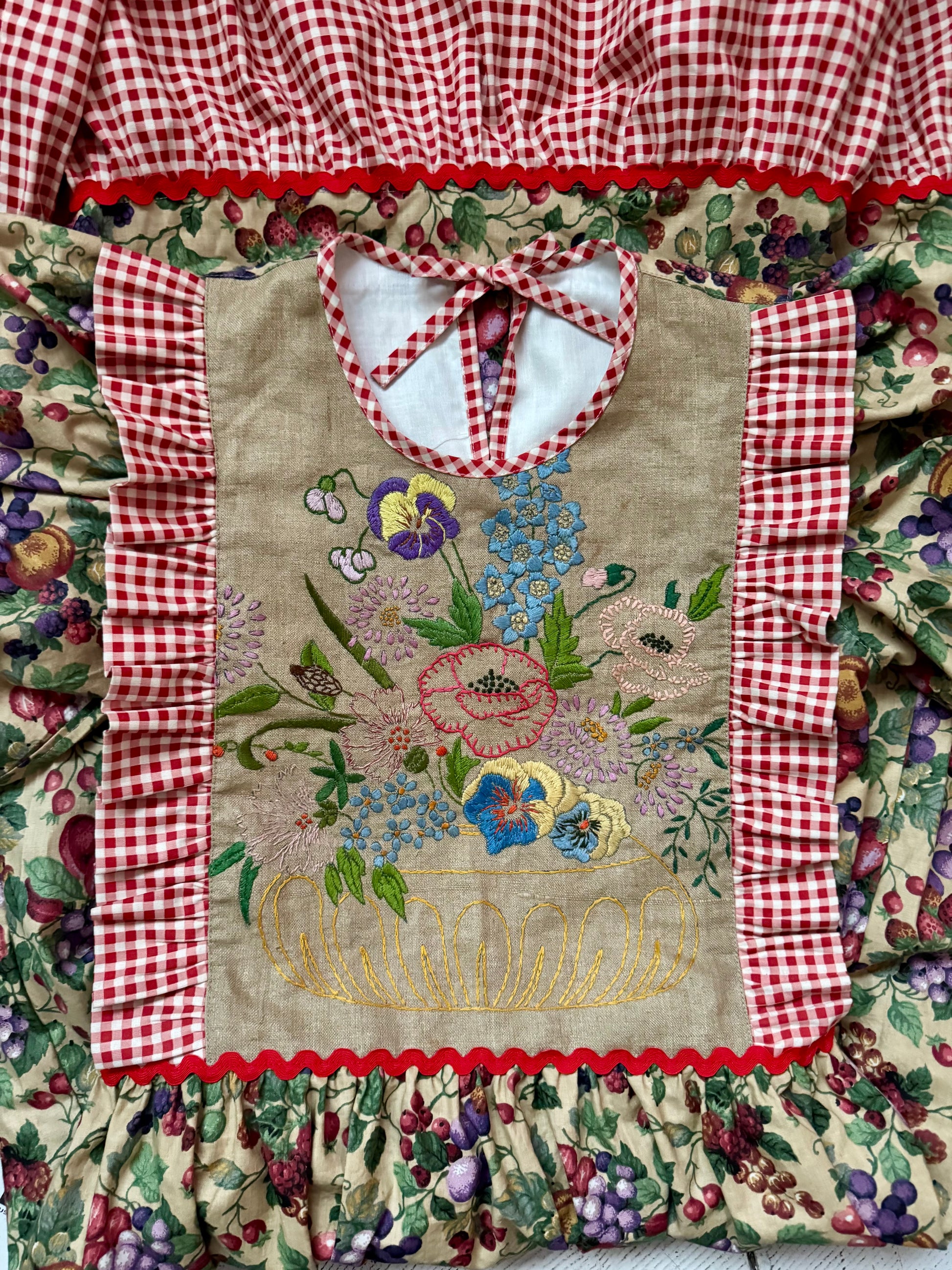 Front panel made from vintage floral hand embroidery tablecloth and gingham side frills