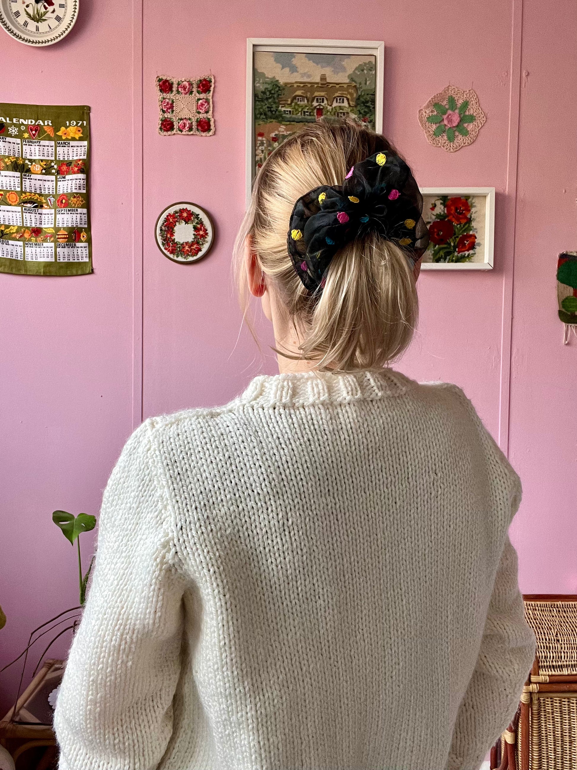 Black chiffon scrunchie made from vintage head scarf with multicoloured embroidery dots