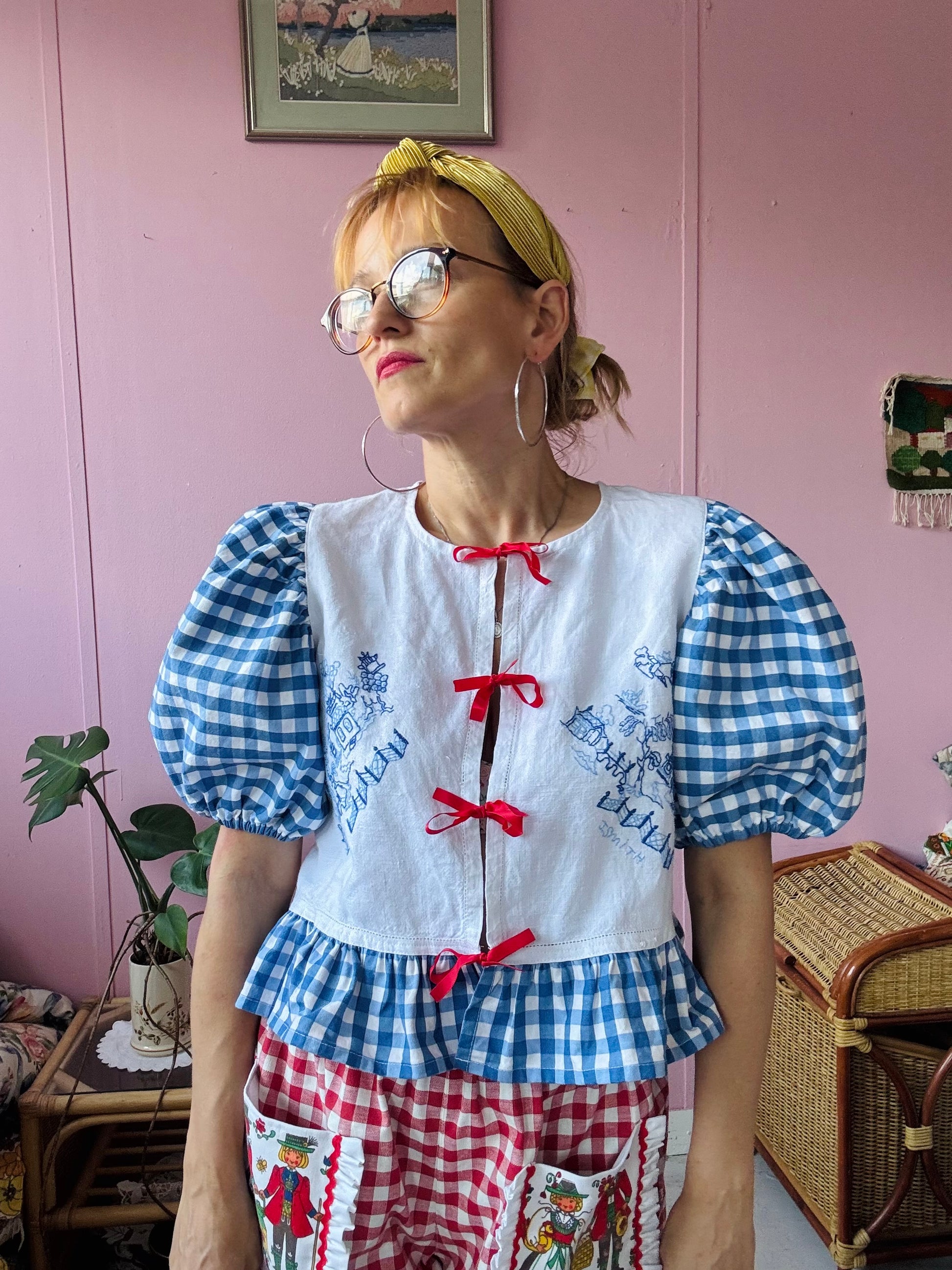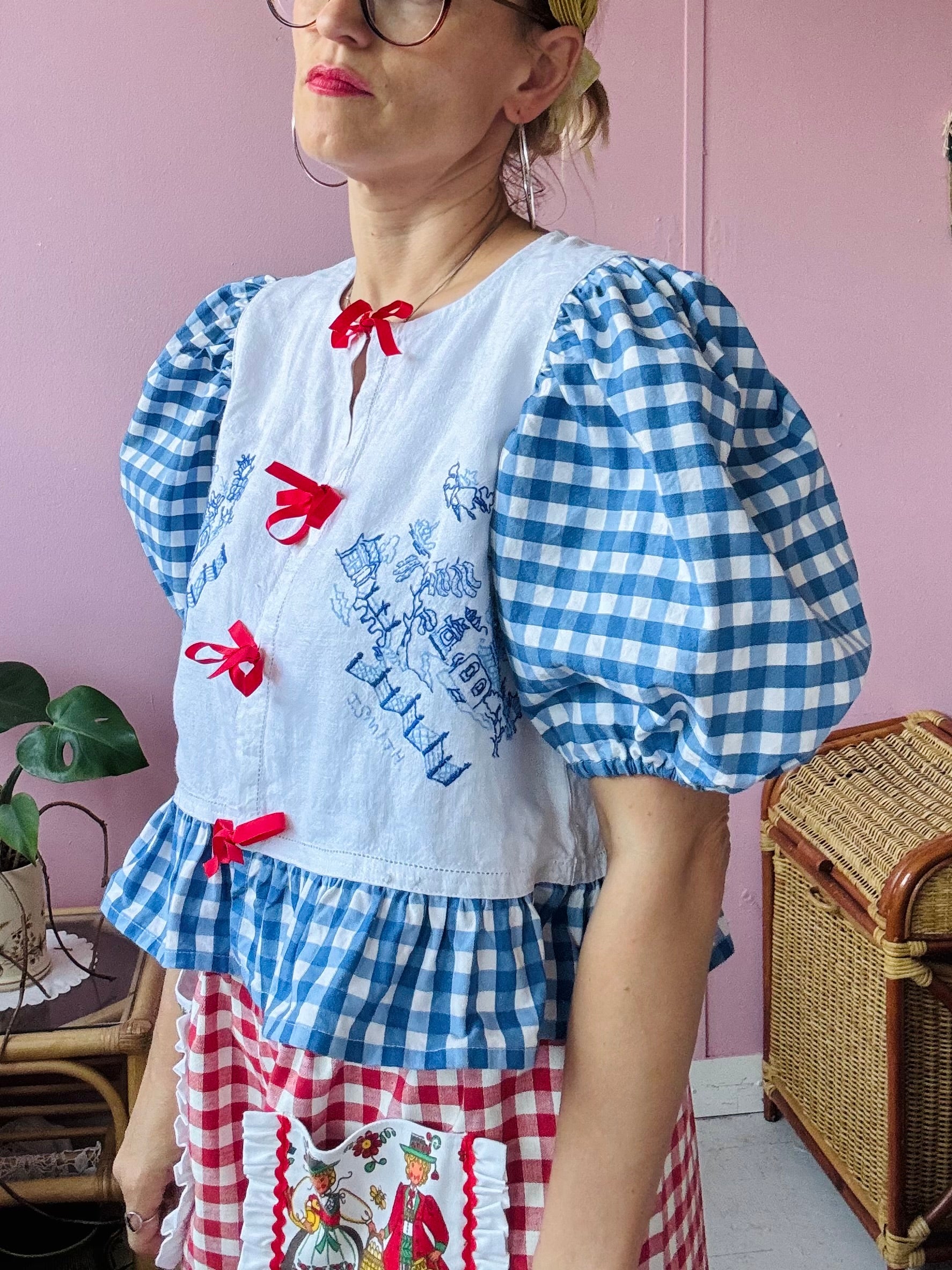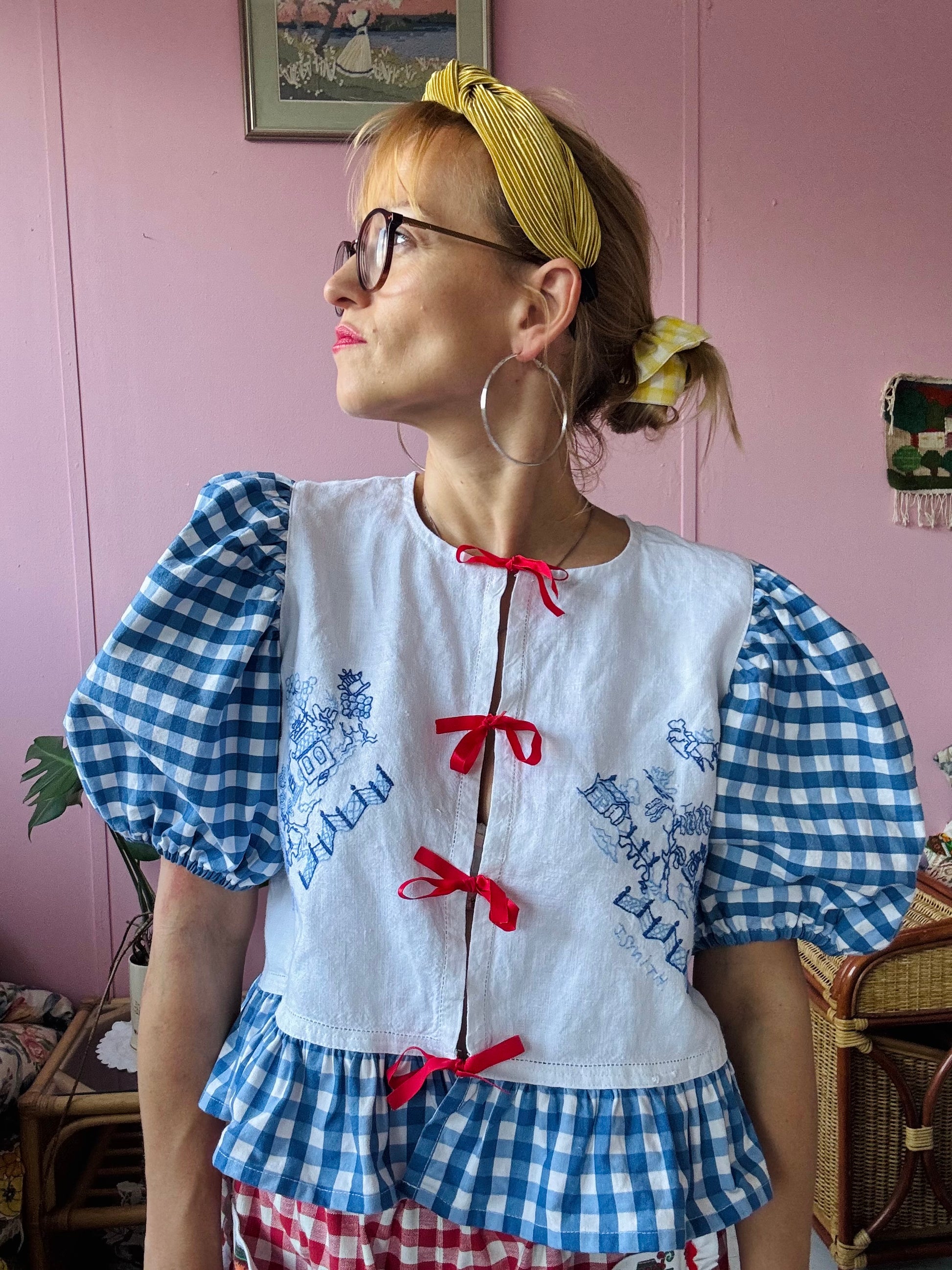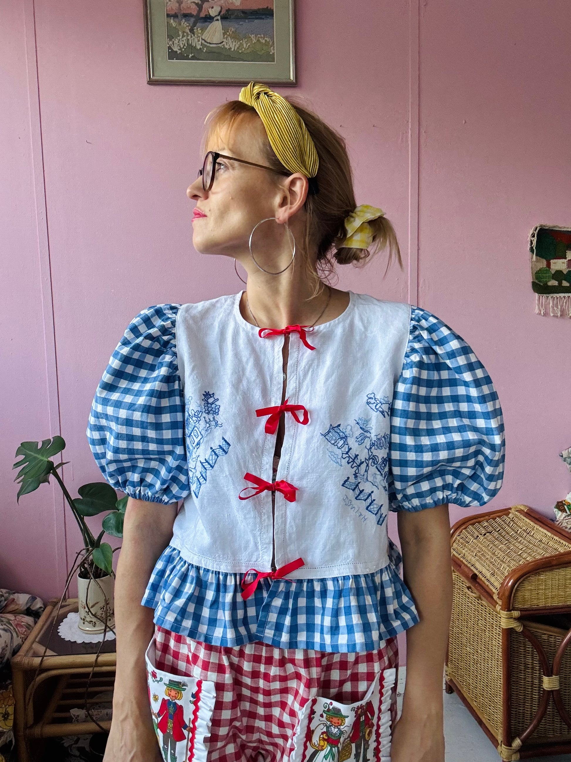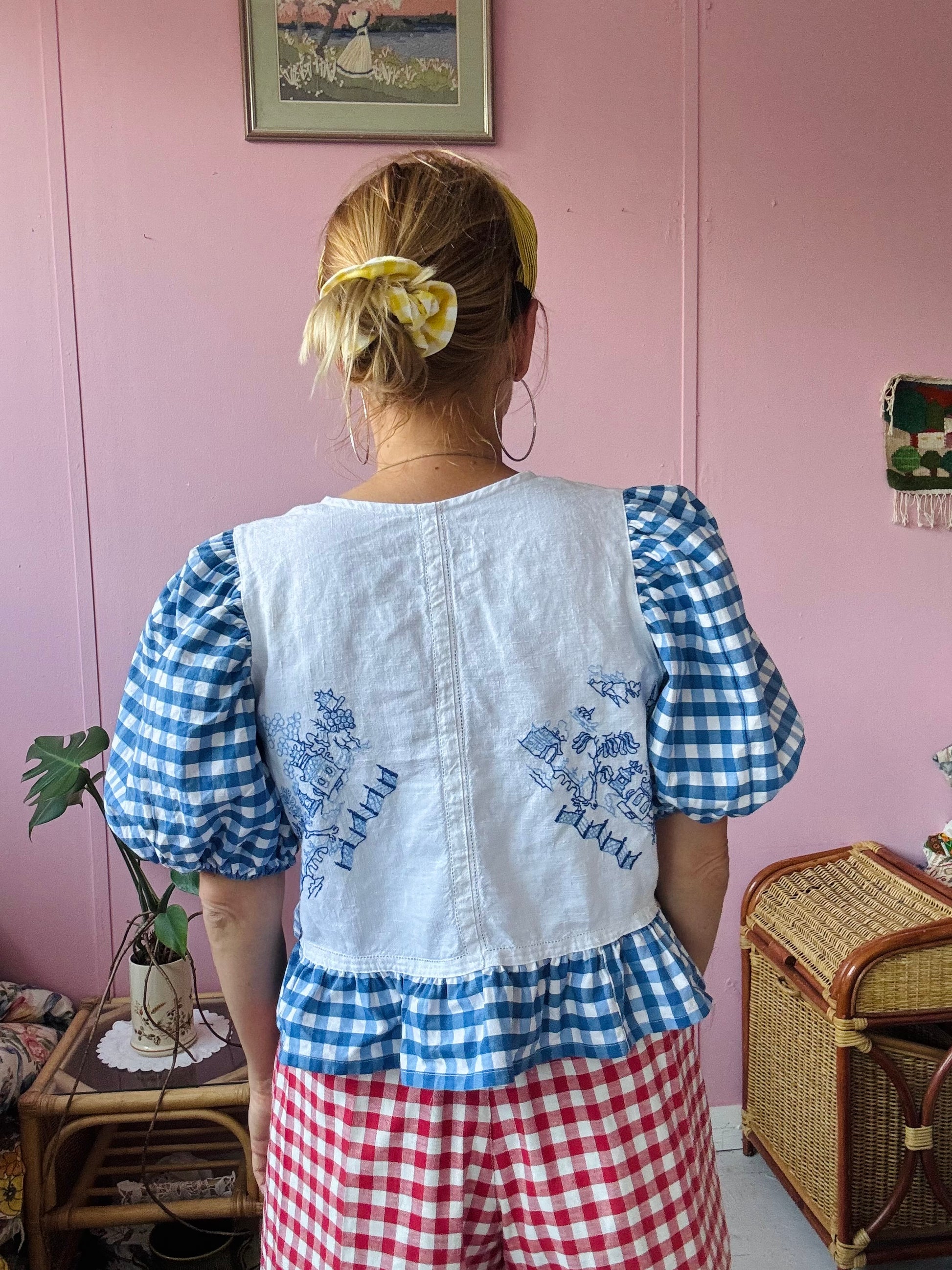 Blue embroidery and gingham blouse made from vintage tablecloth