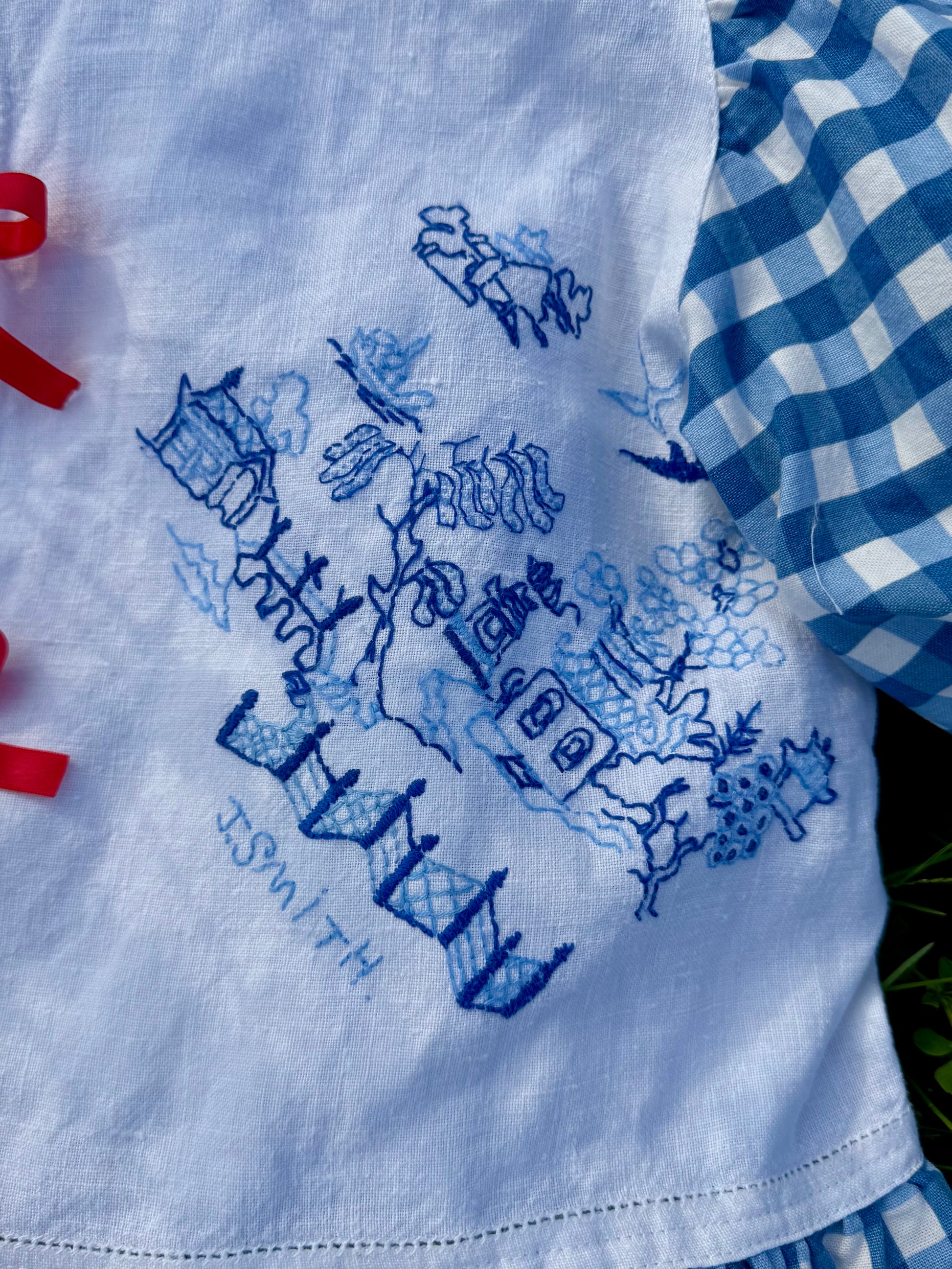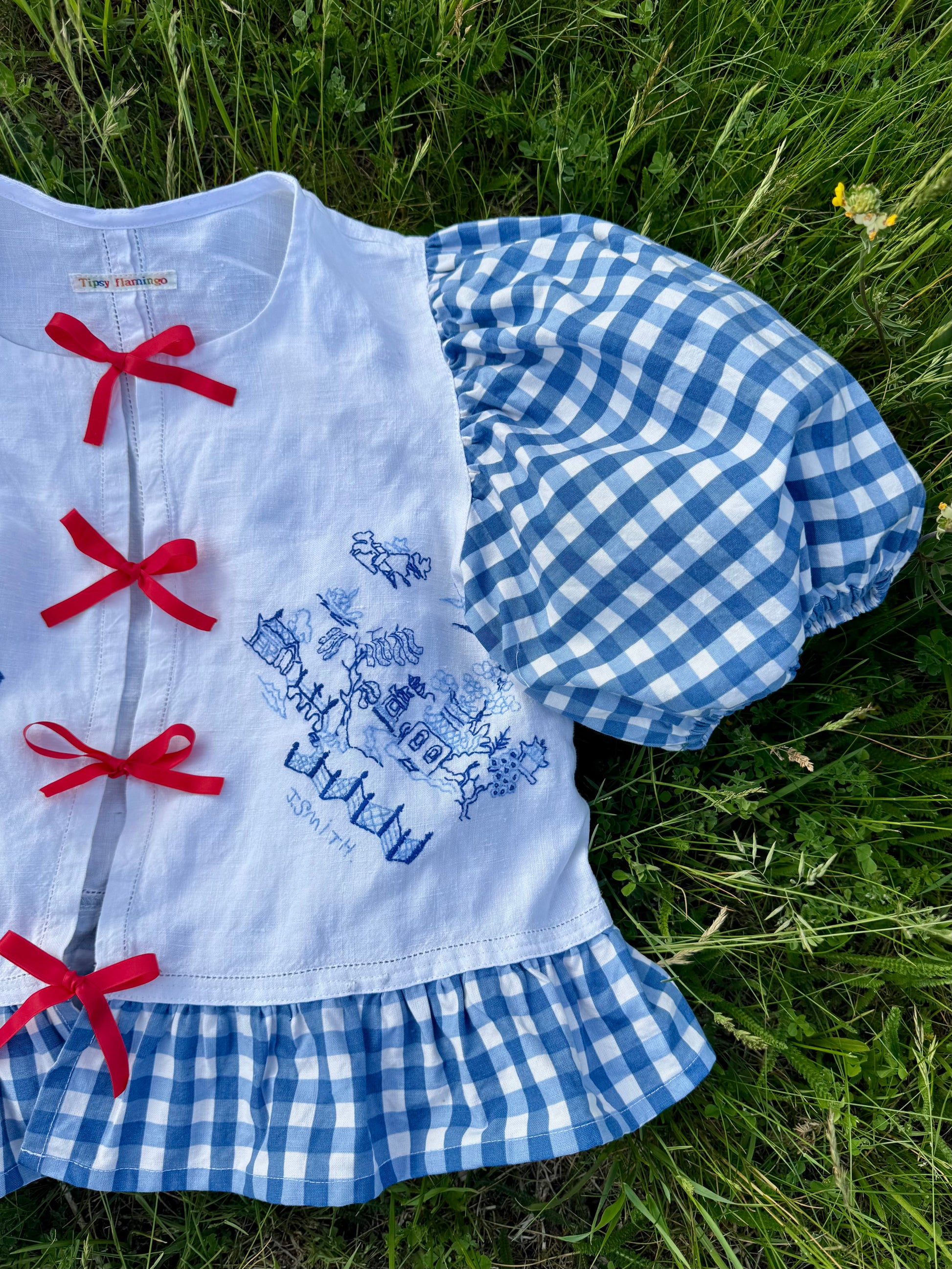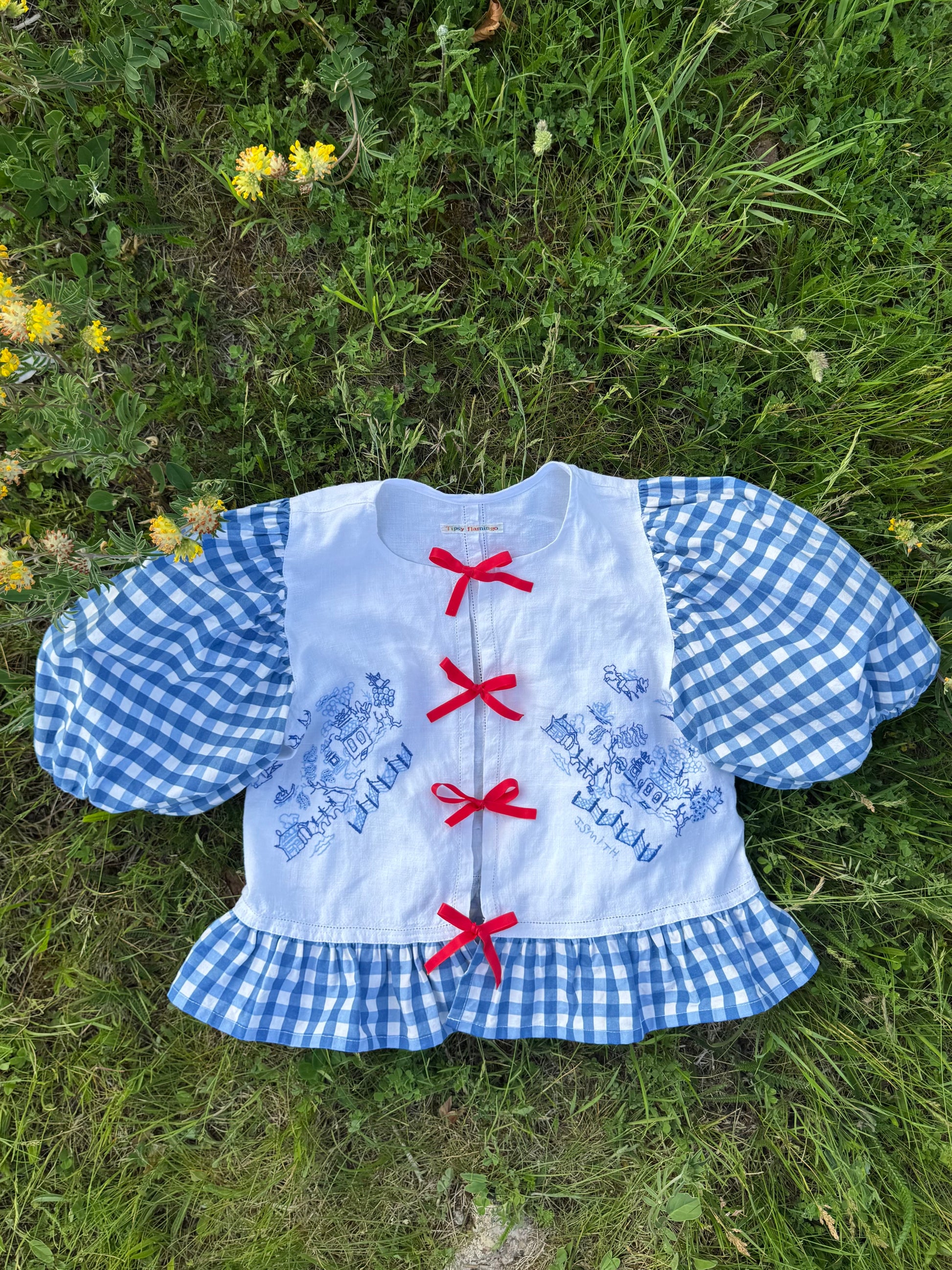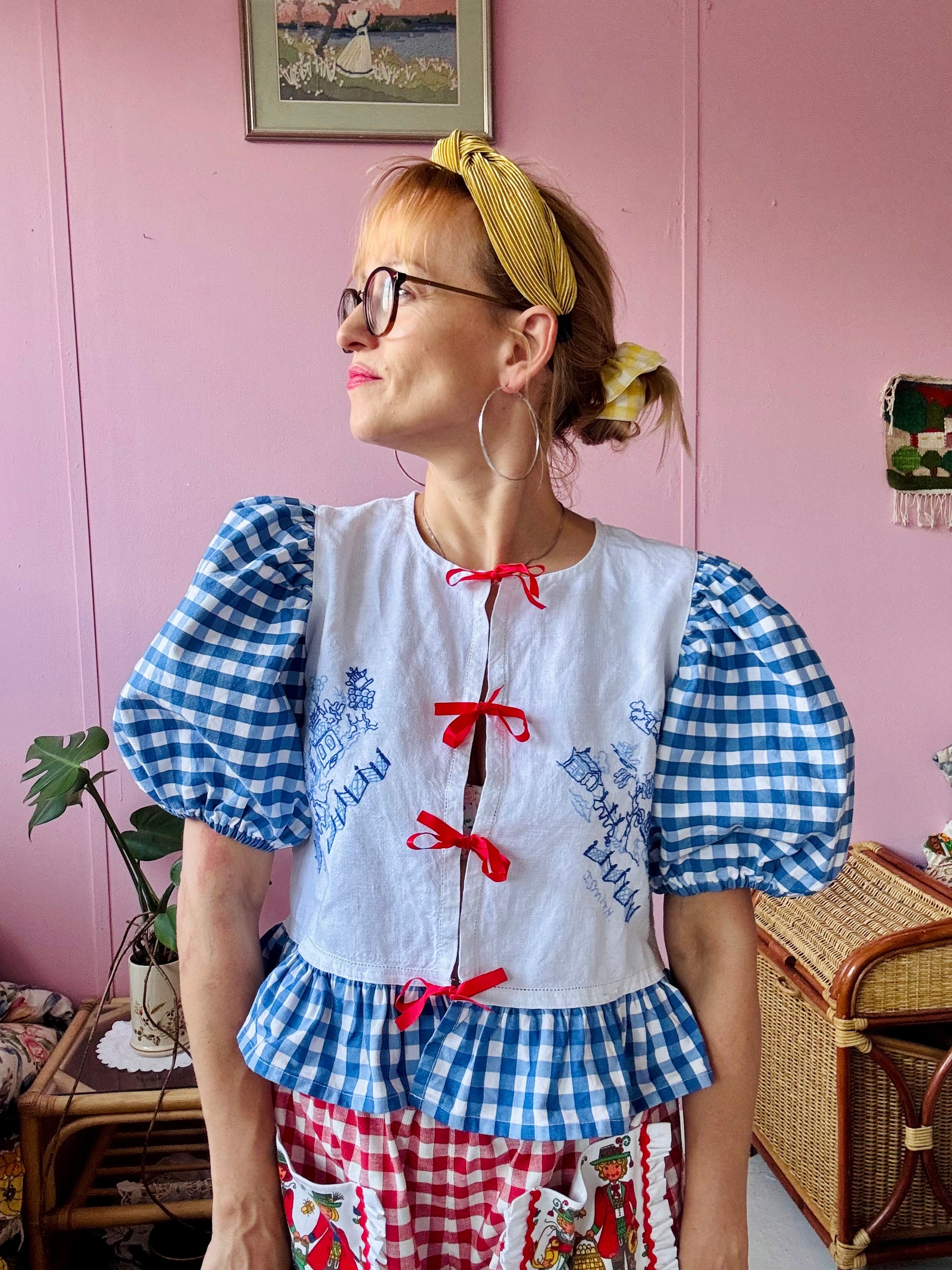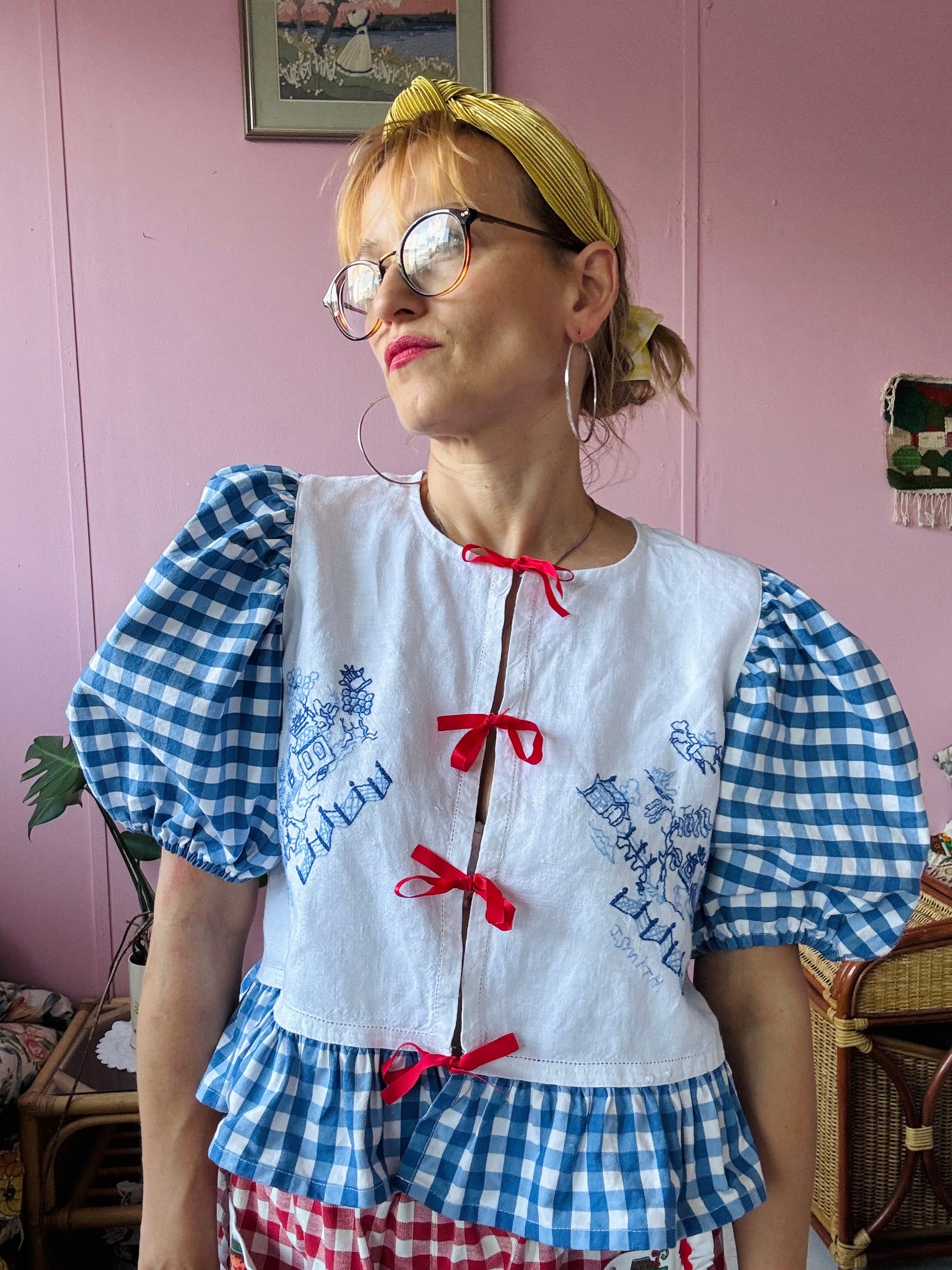 Blue embroidery and gingham blouse made from vintage tablecloth