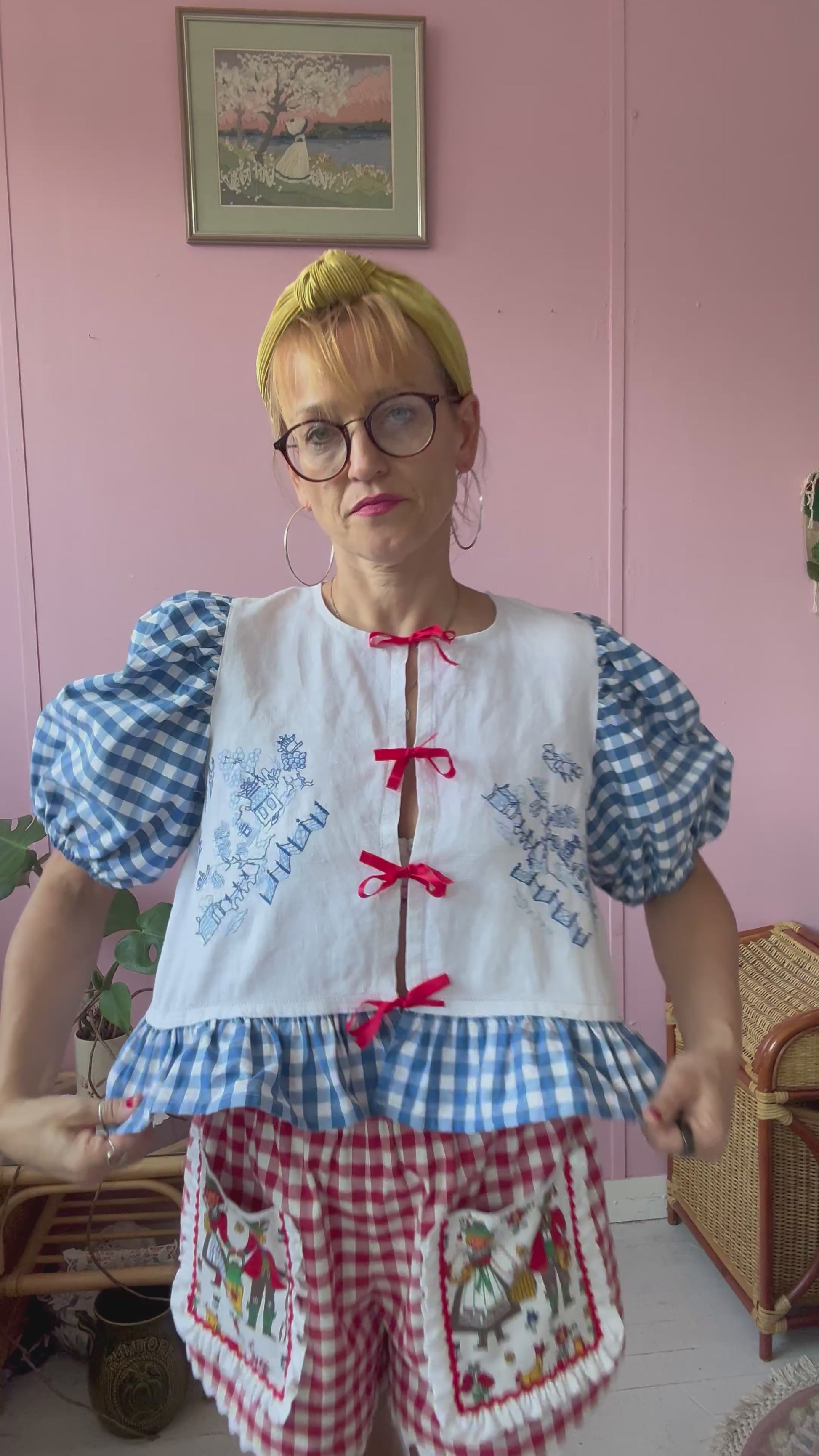 Short puffy sleeves made from blue/white vintage gingham curtains
