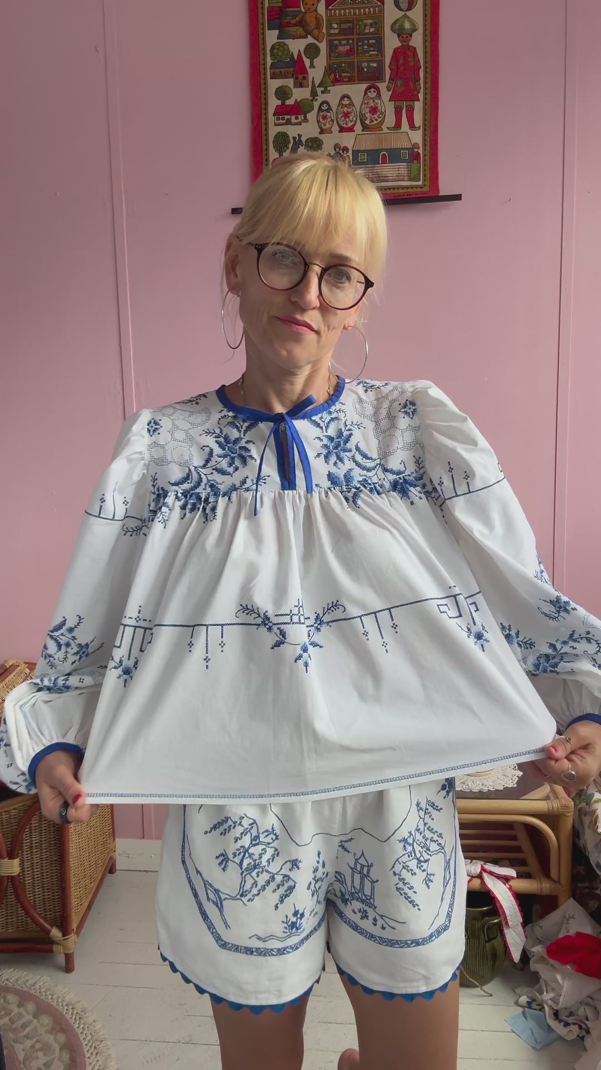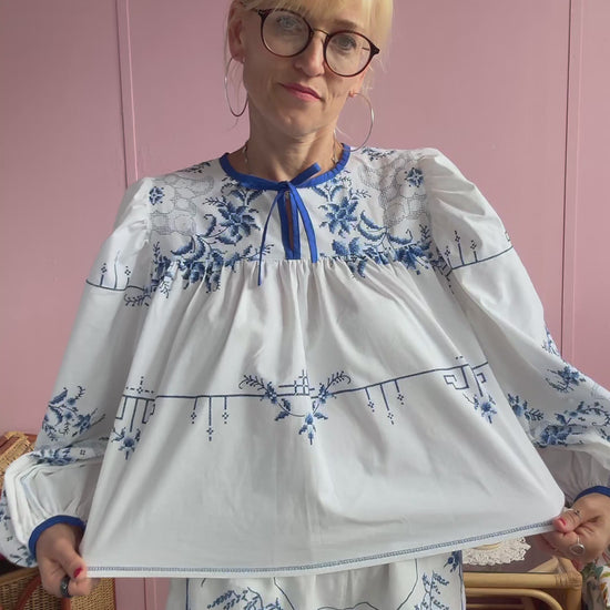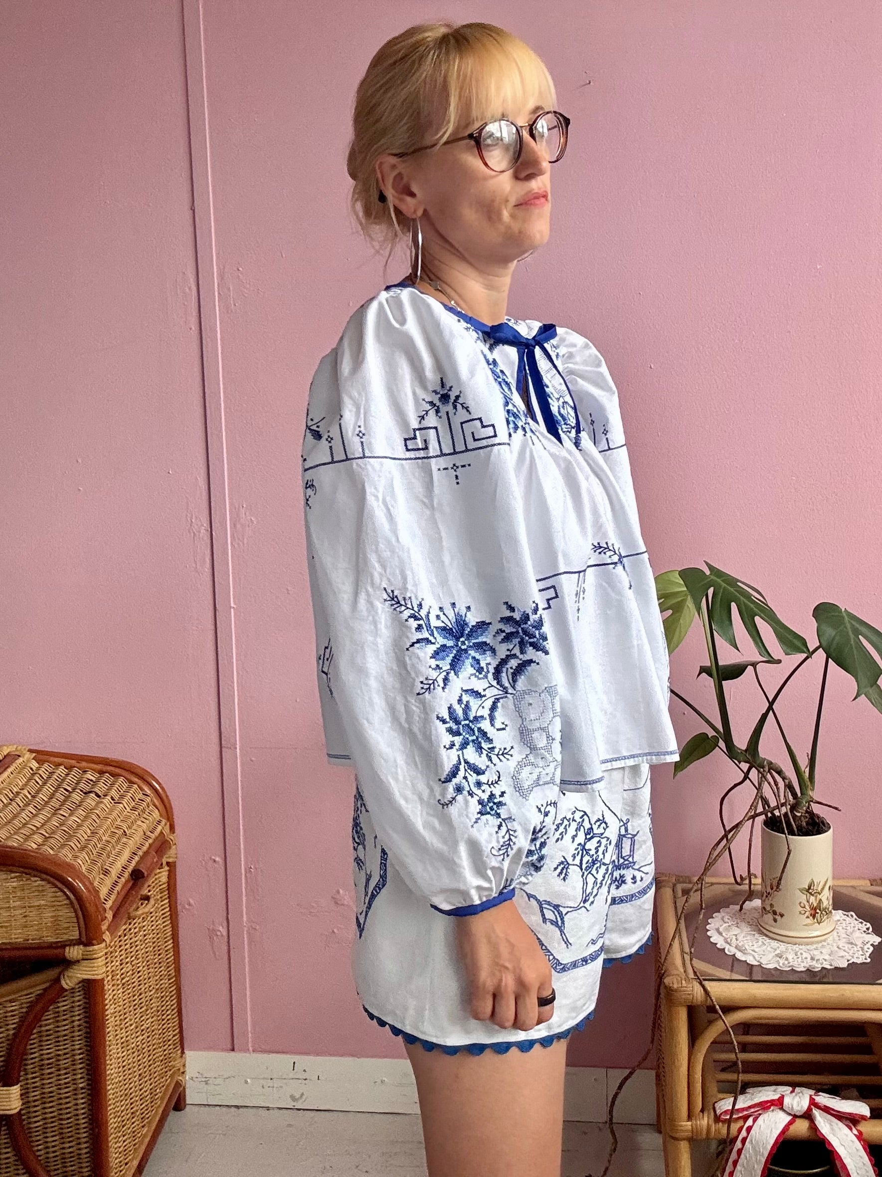 White blouse made from vintage tablecloth with hand embroidery -amazing cross stitching embroidery and details all over