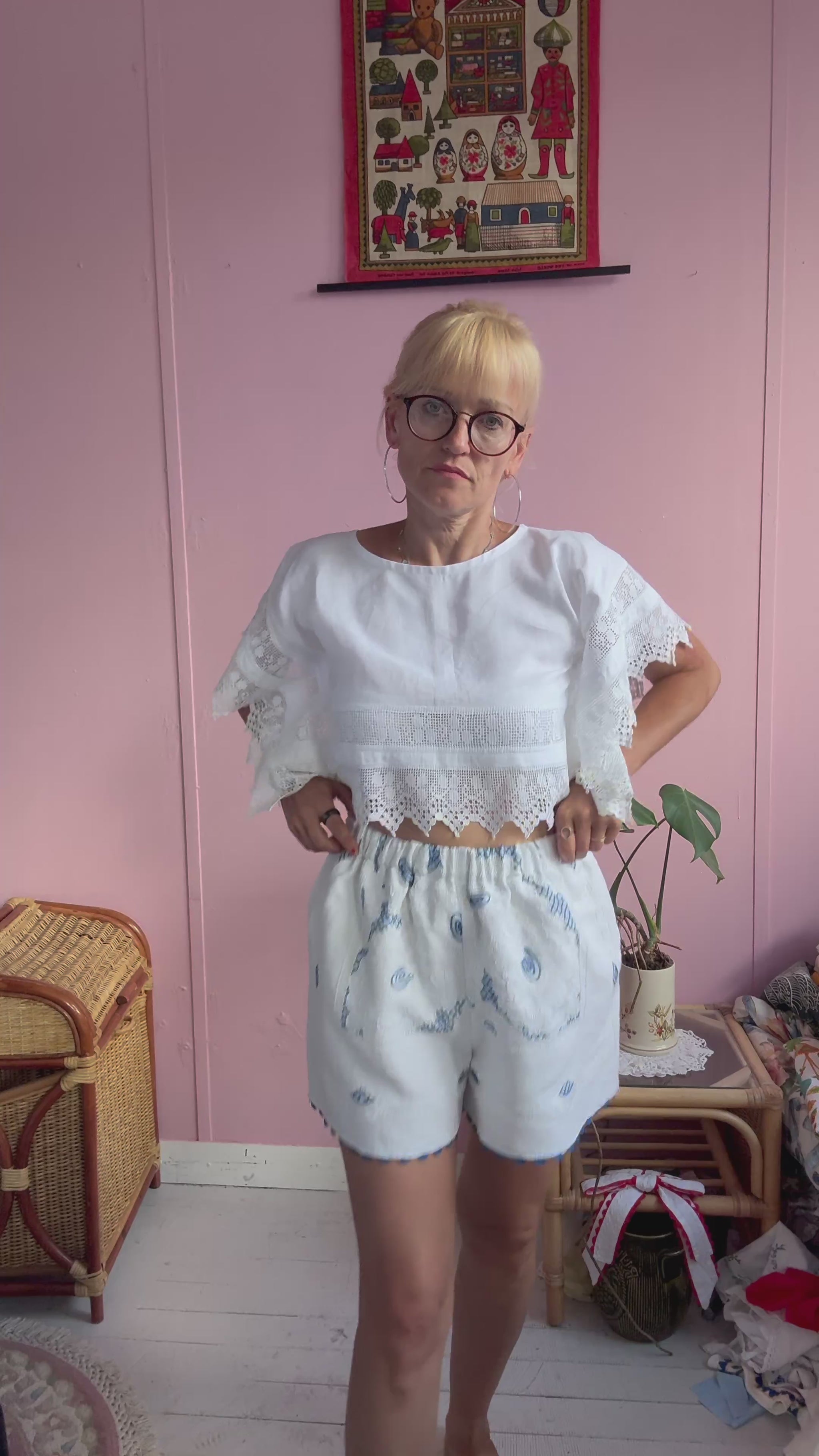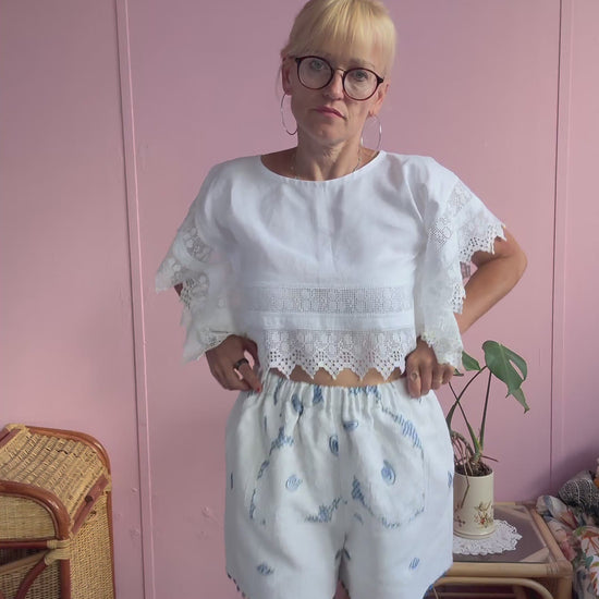 White shorts made from vintage tablecloth with floral white/blue hand embroidery-all over amazing details