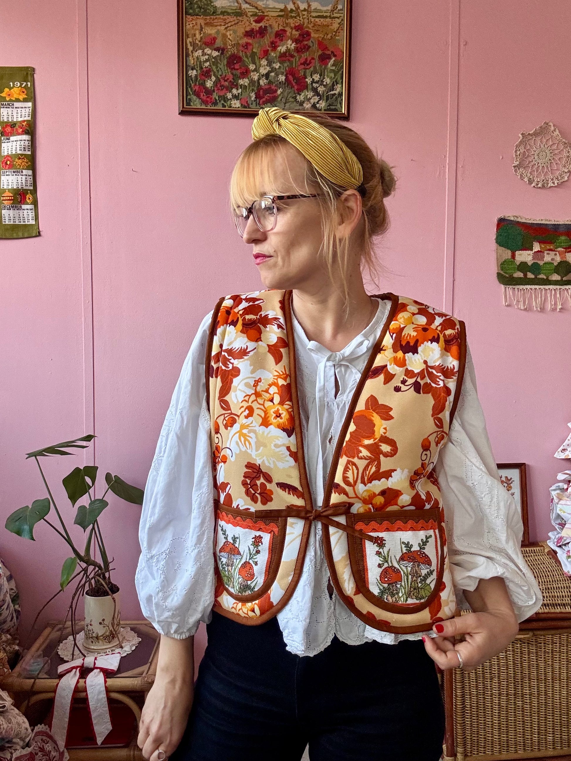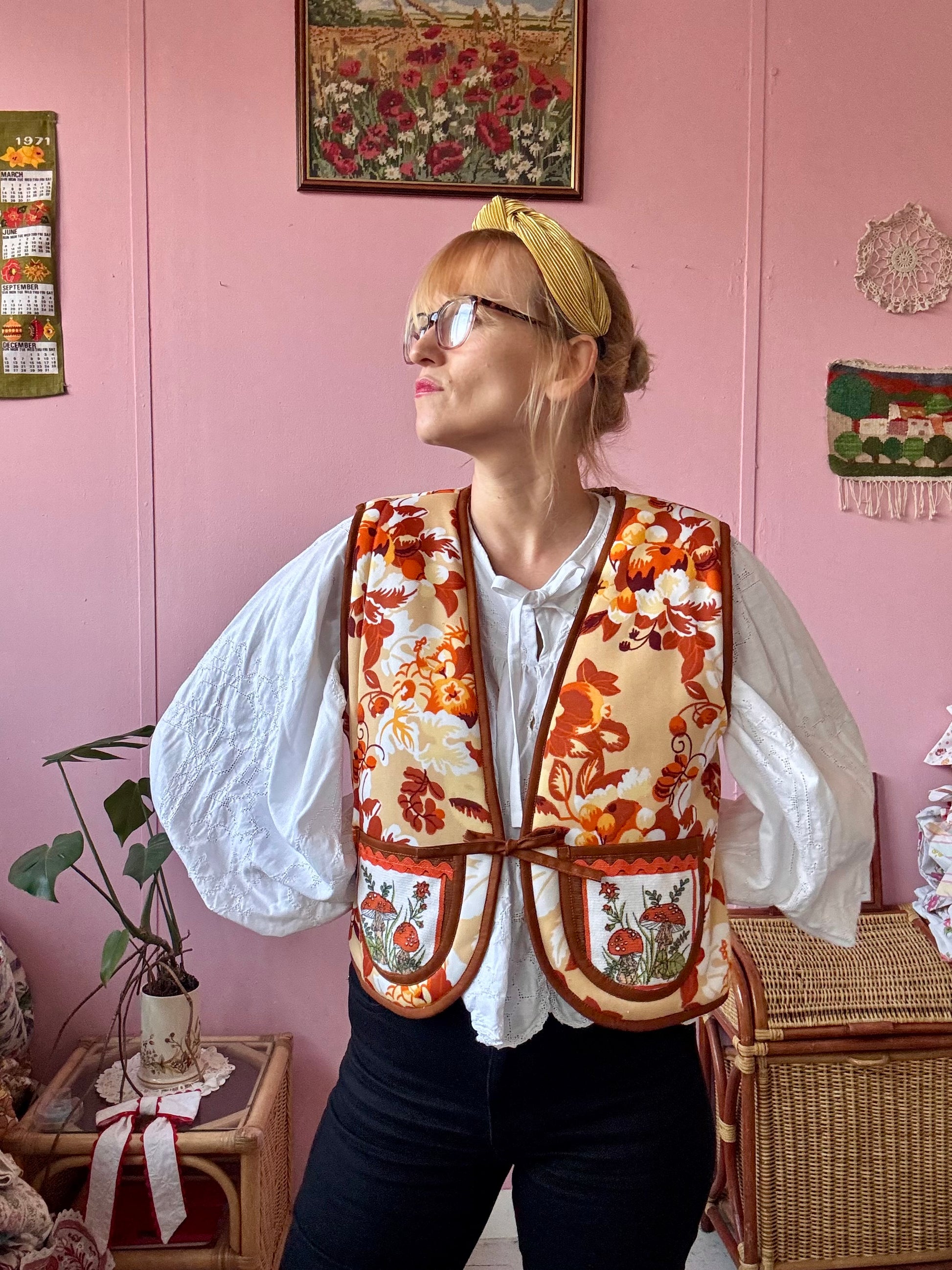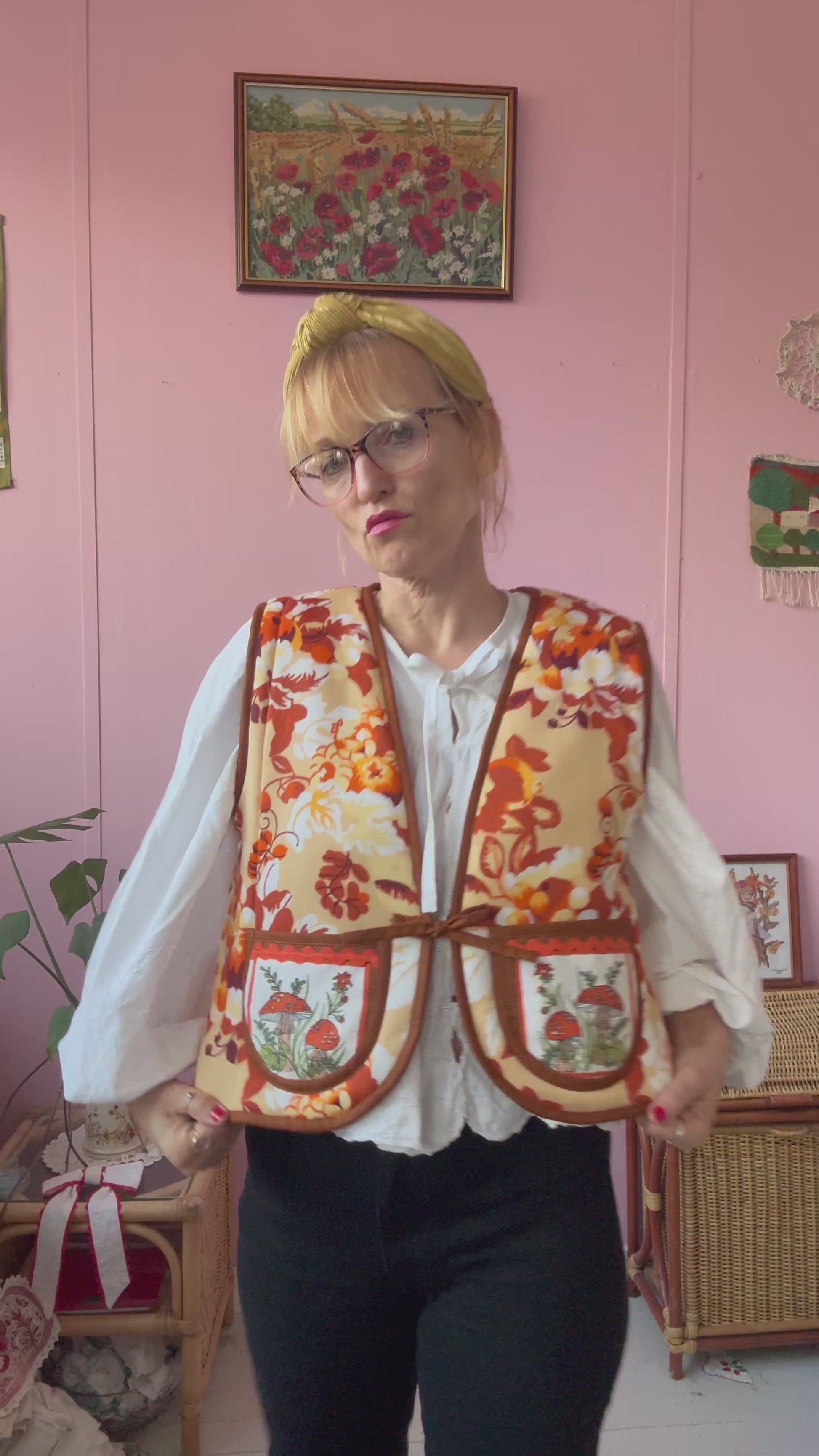 Beige/yellow/orange/brown floral vest made from vintage blanket-it’s about 1cm thick