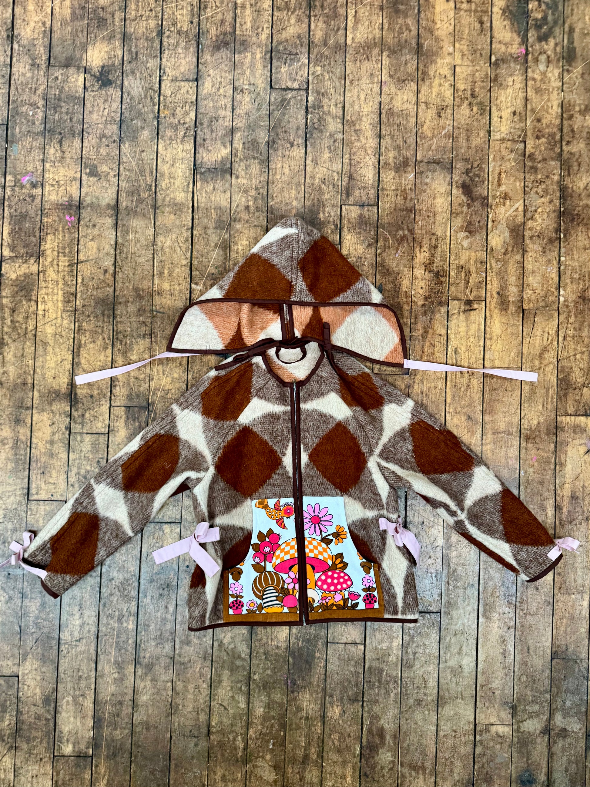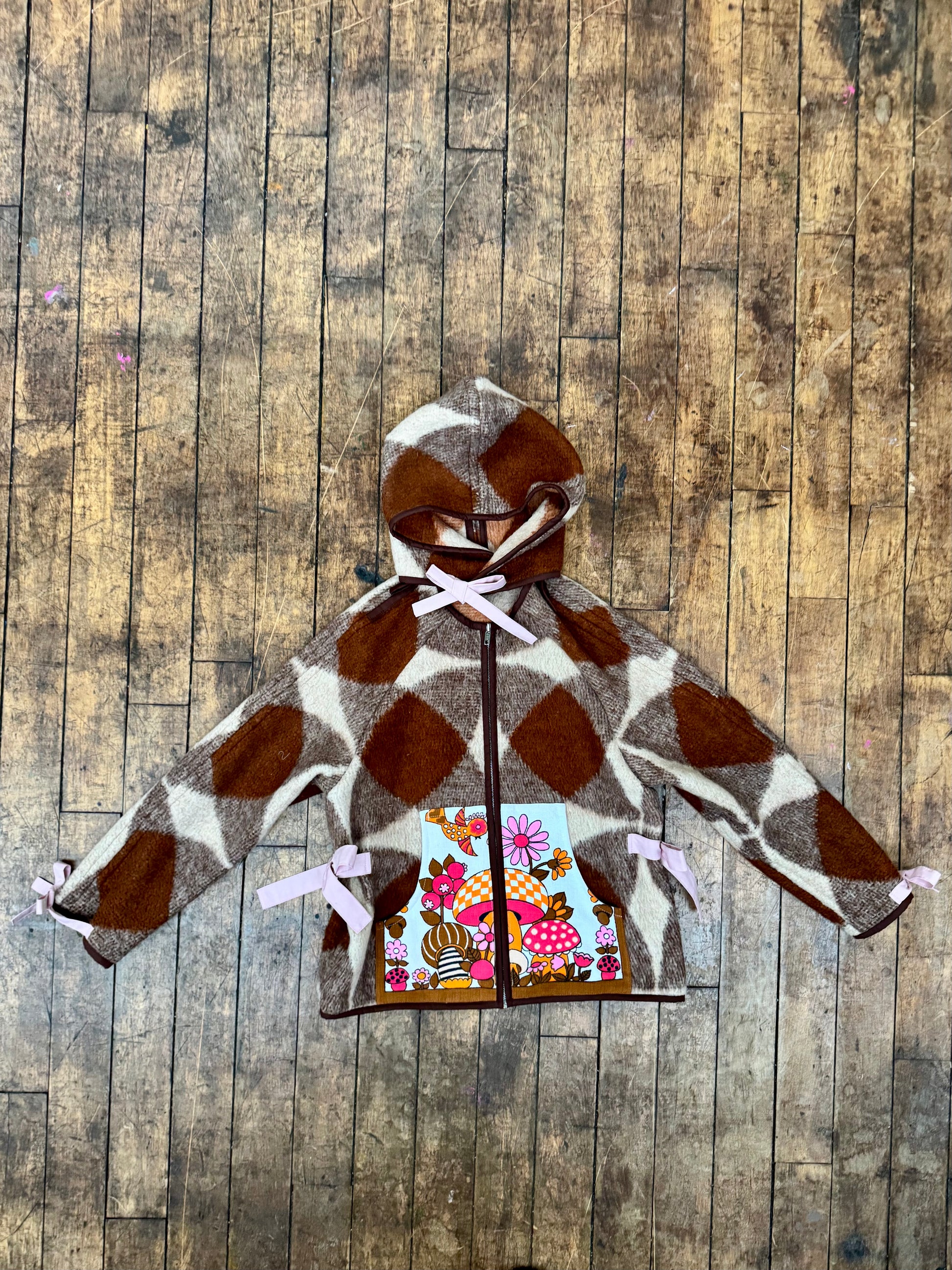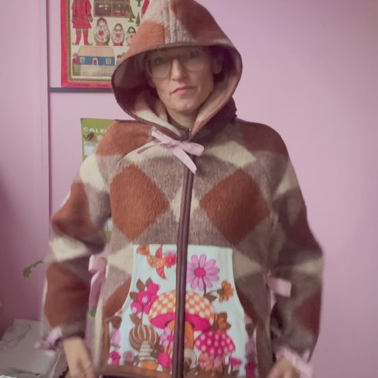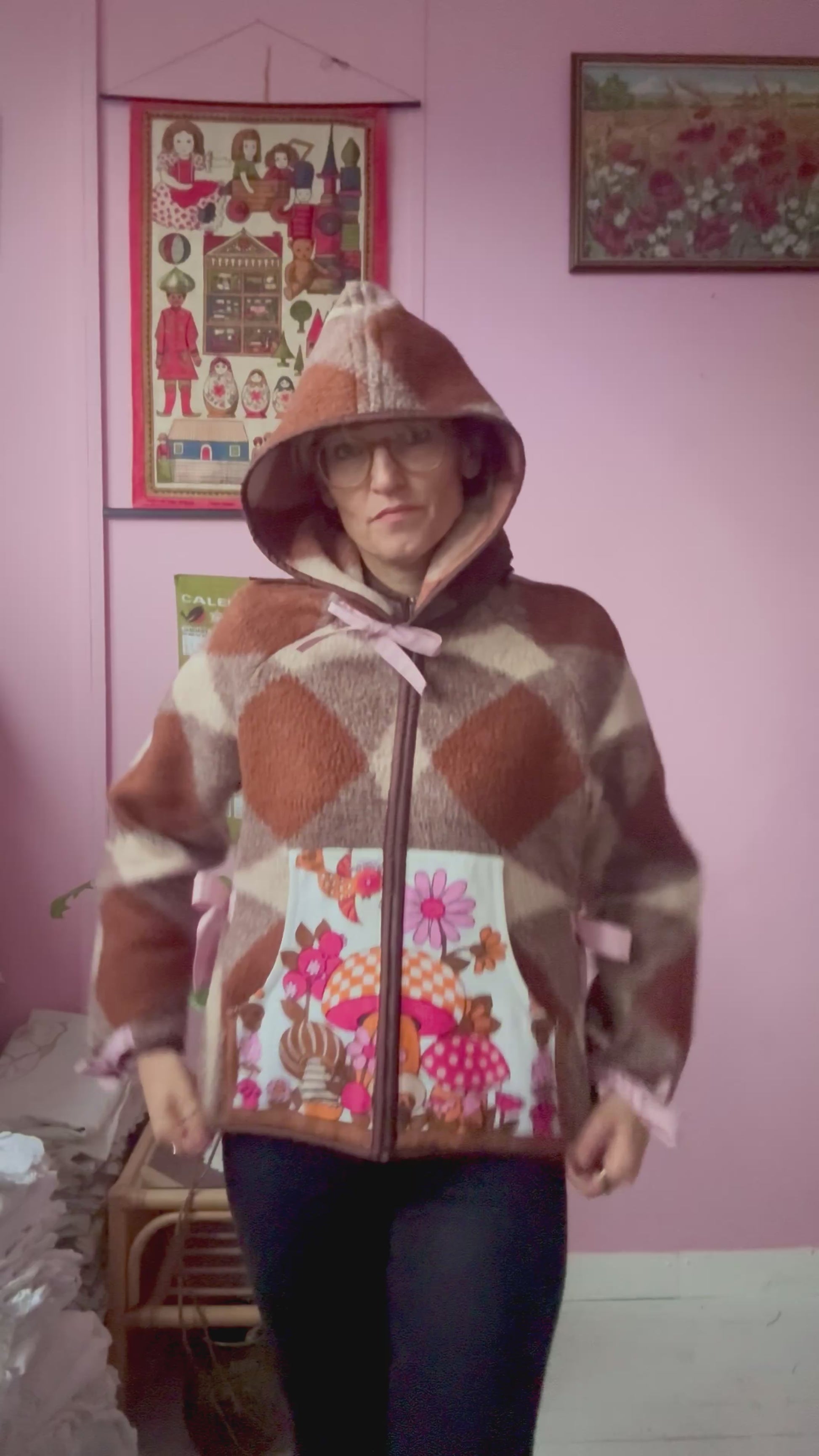 2 front pockets made from vintage teatowel with cute mushroom/birds/floral print(they are lined)
