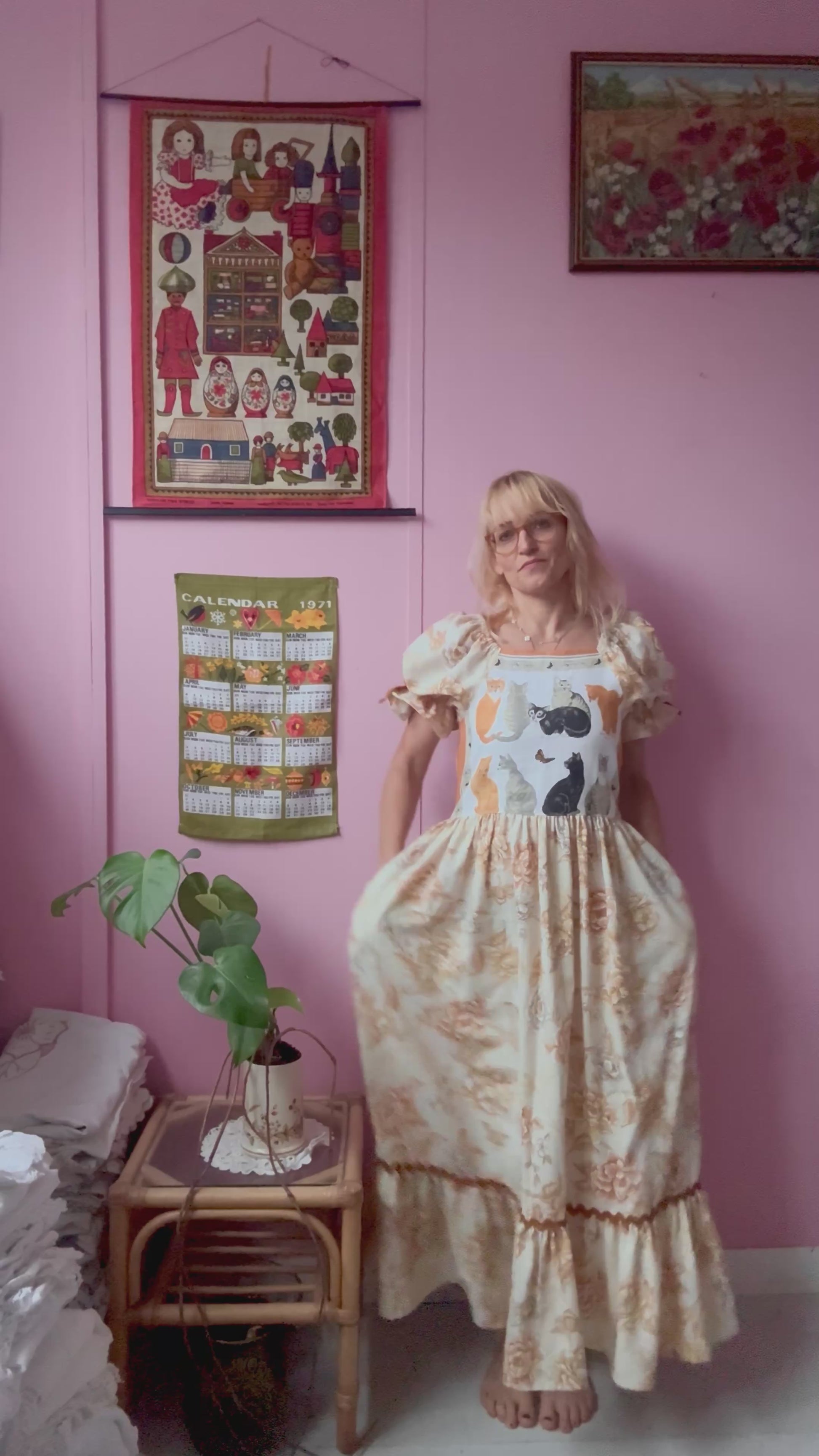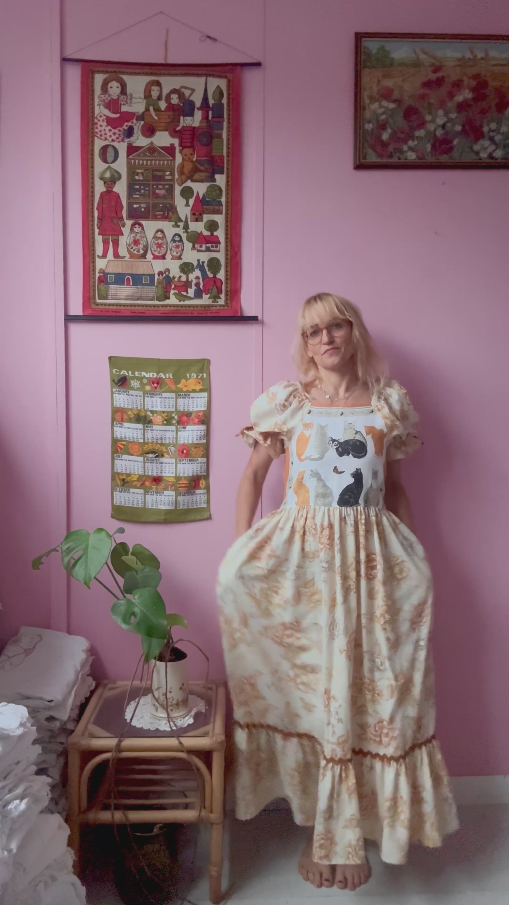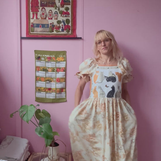 Cats and floral maxi dress made from vintage bedding and vintage teatowel with cats