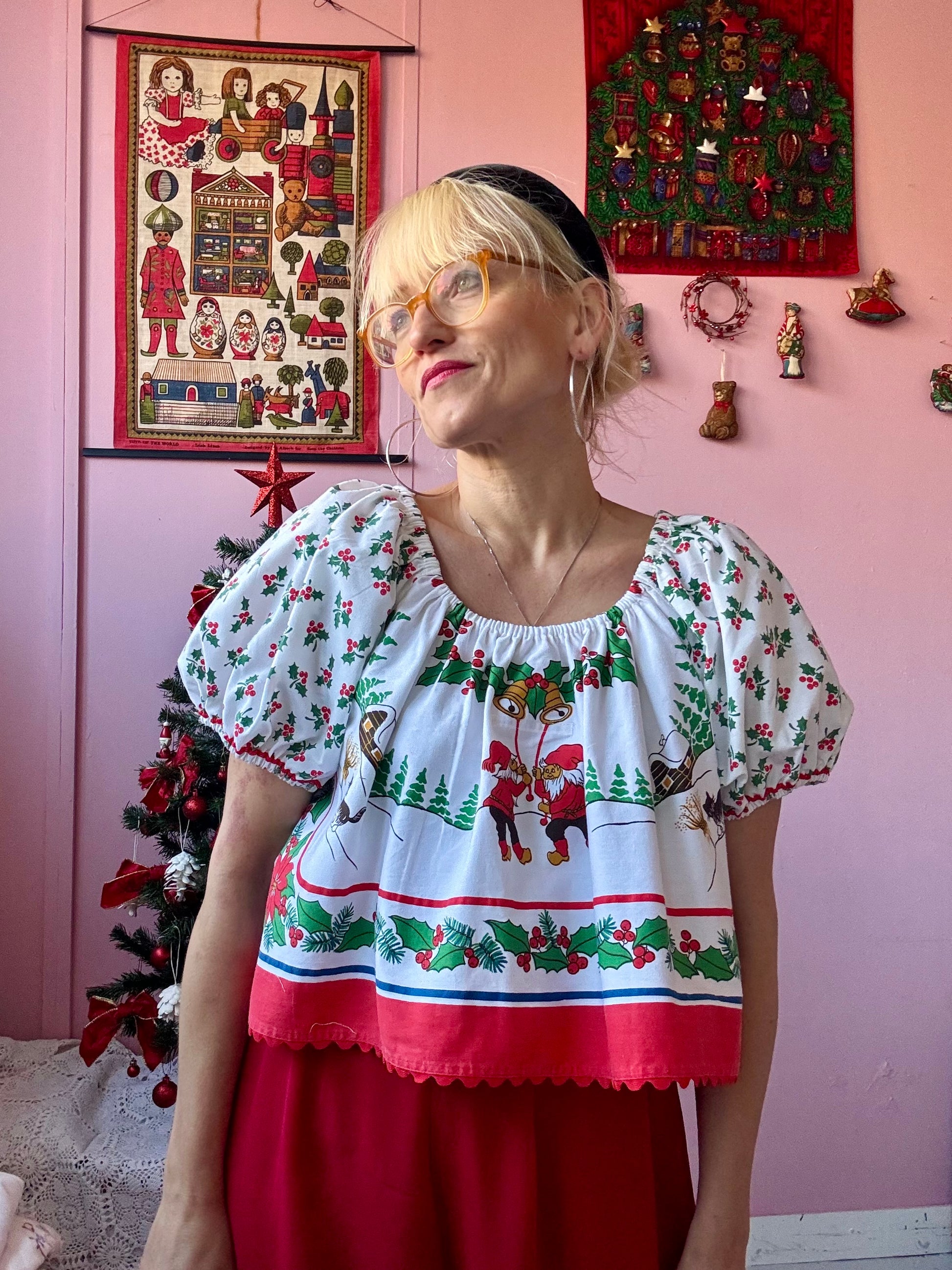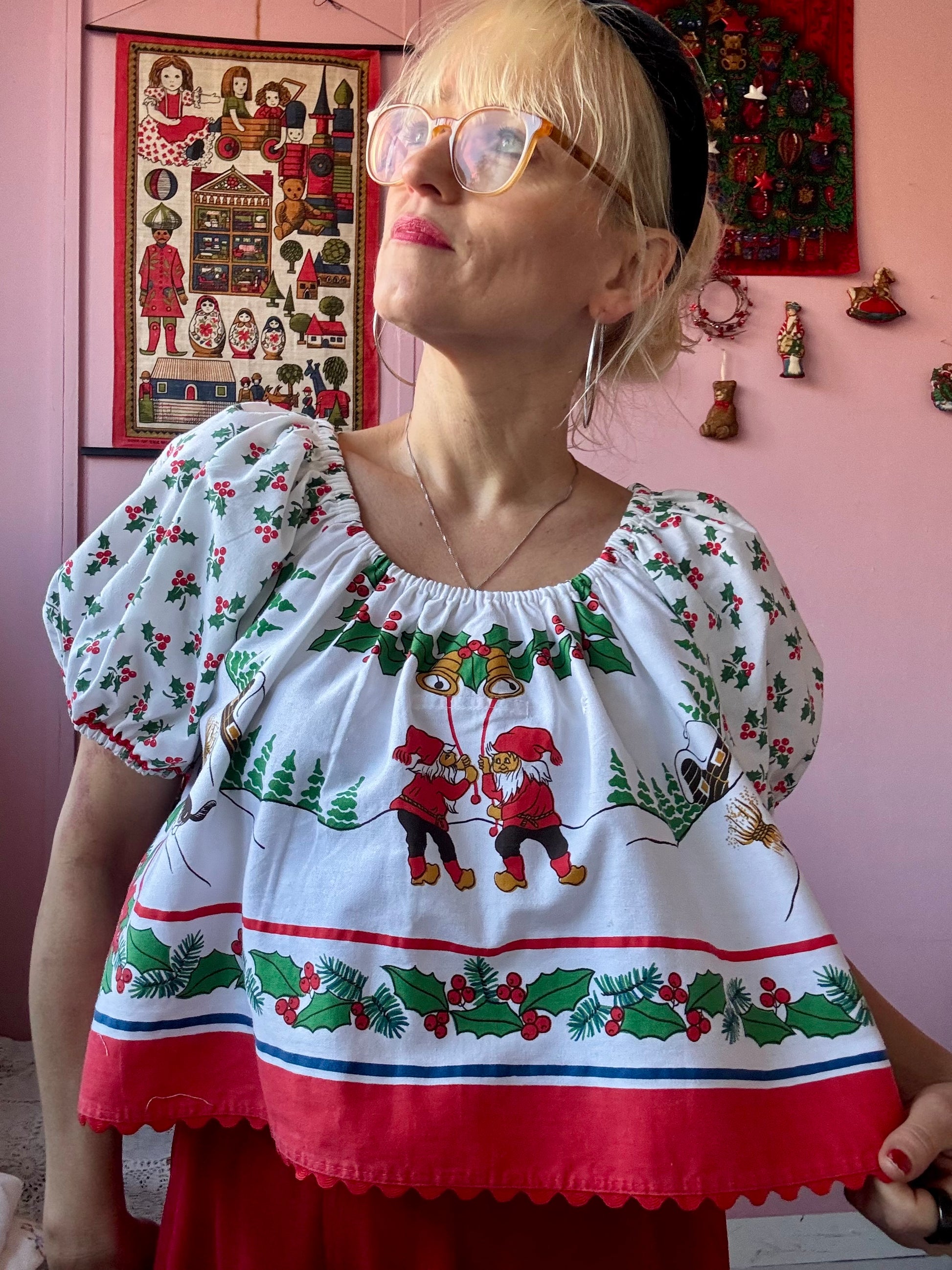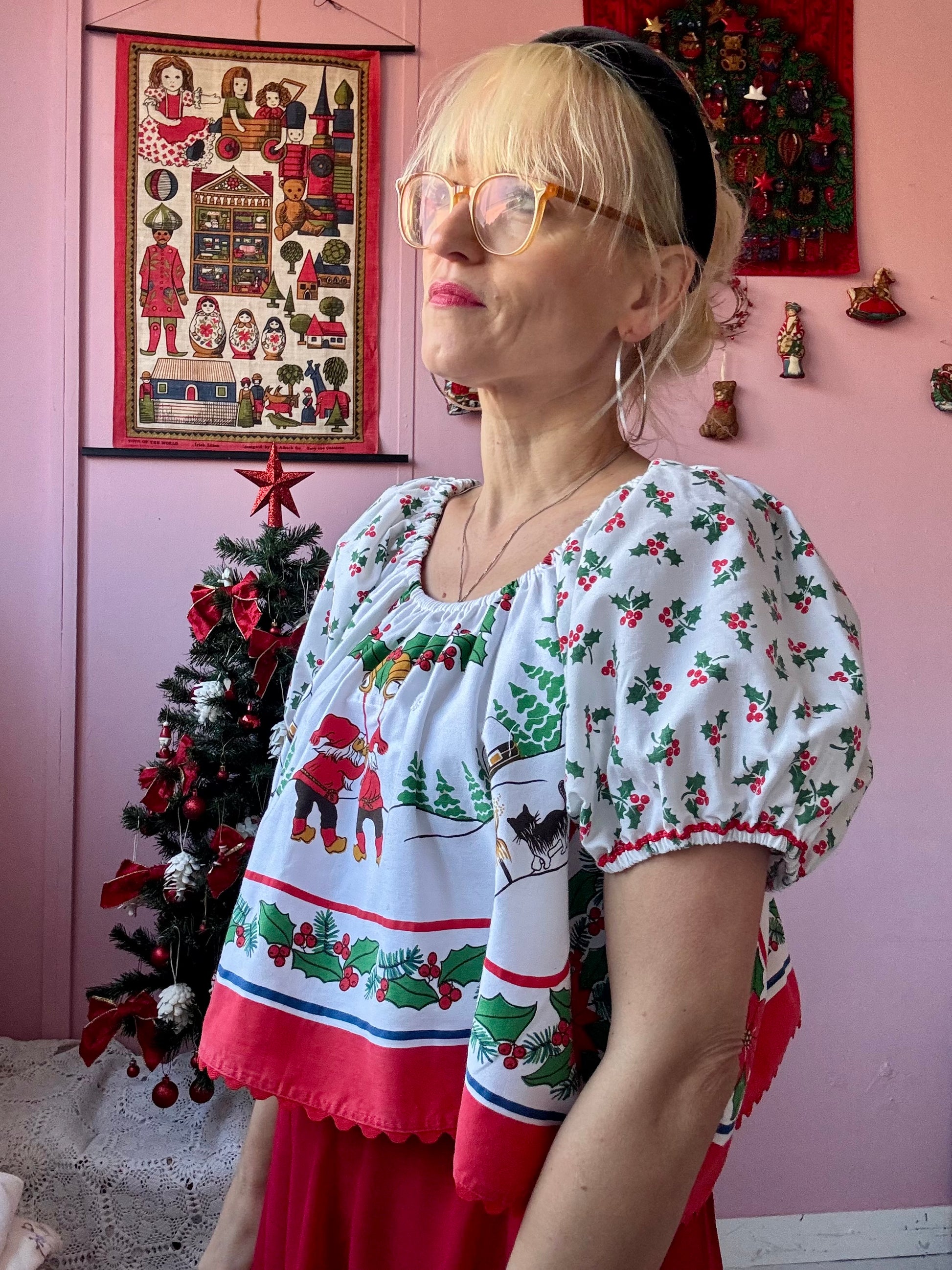 Christmas blouse made from 2 vintage tablecloths with Christmas themed print