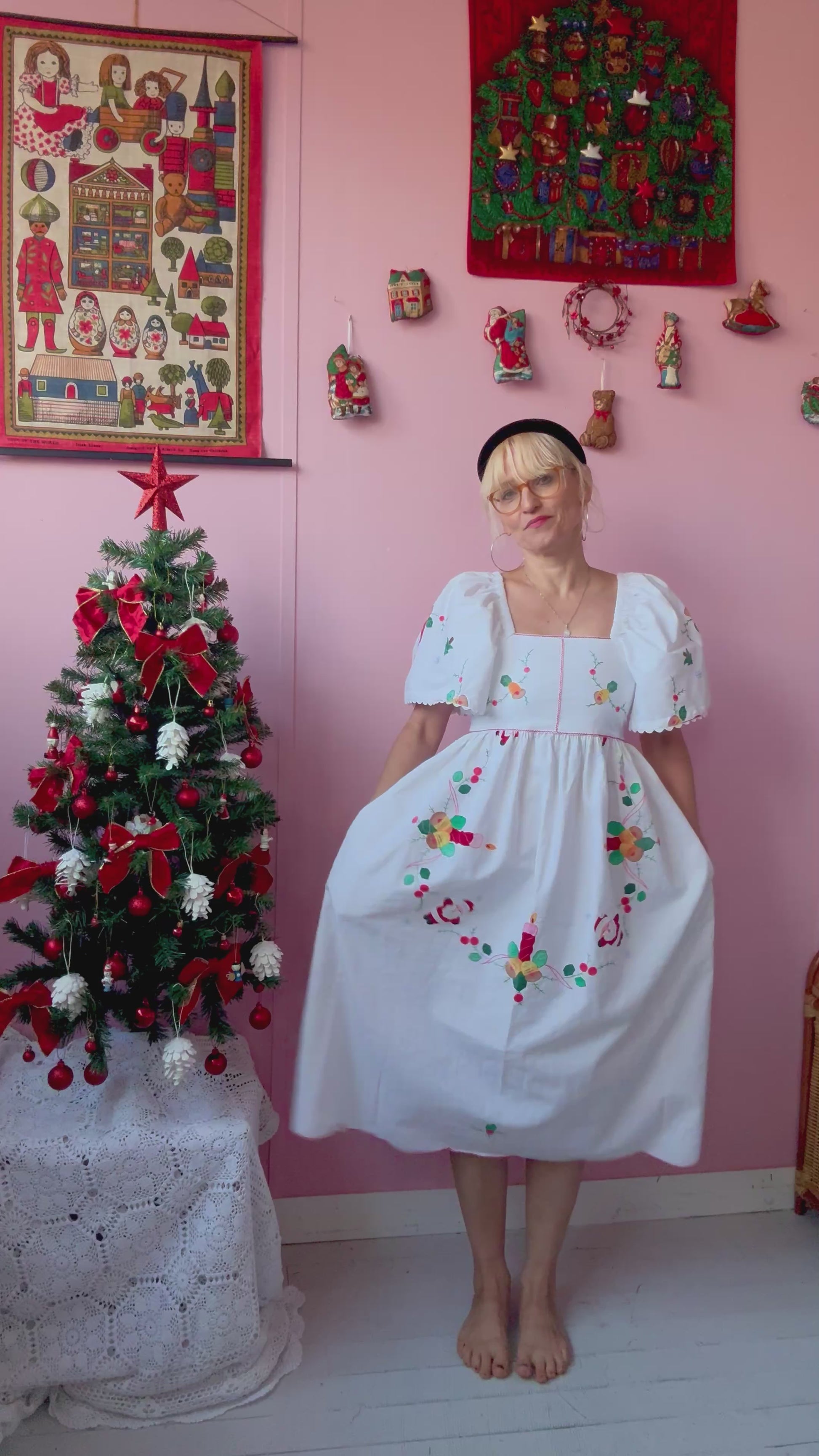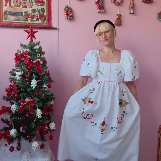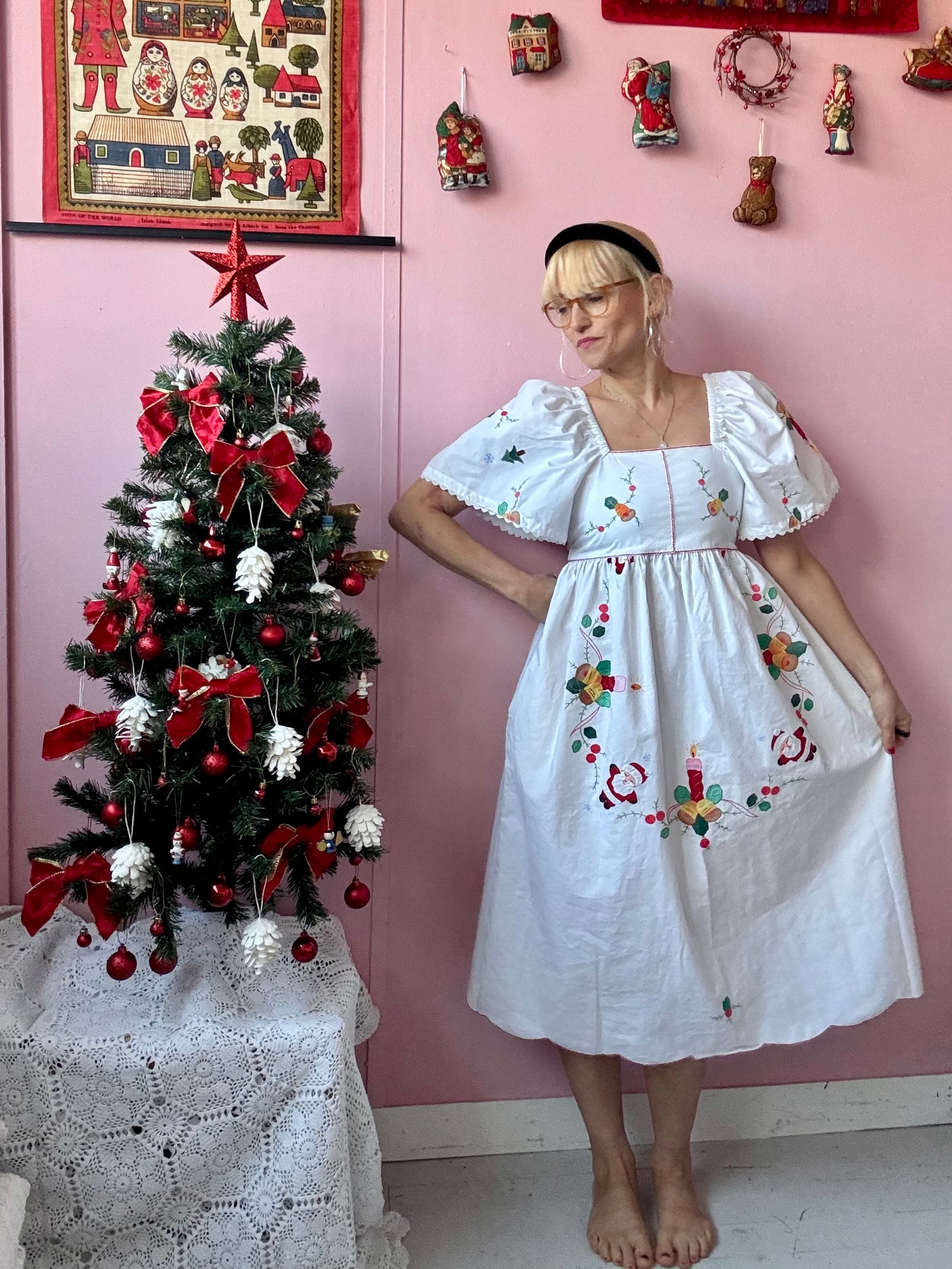 White cotton midi dress made from vintage tablecloth with Christmas themed embroidery and appliqués