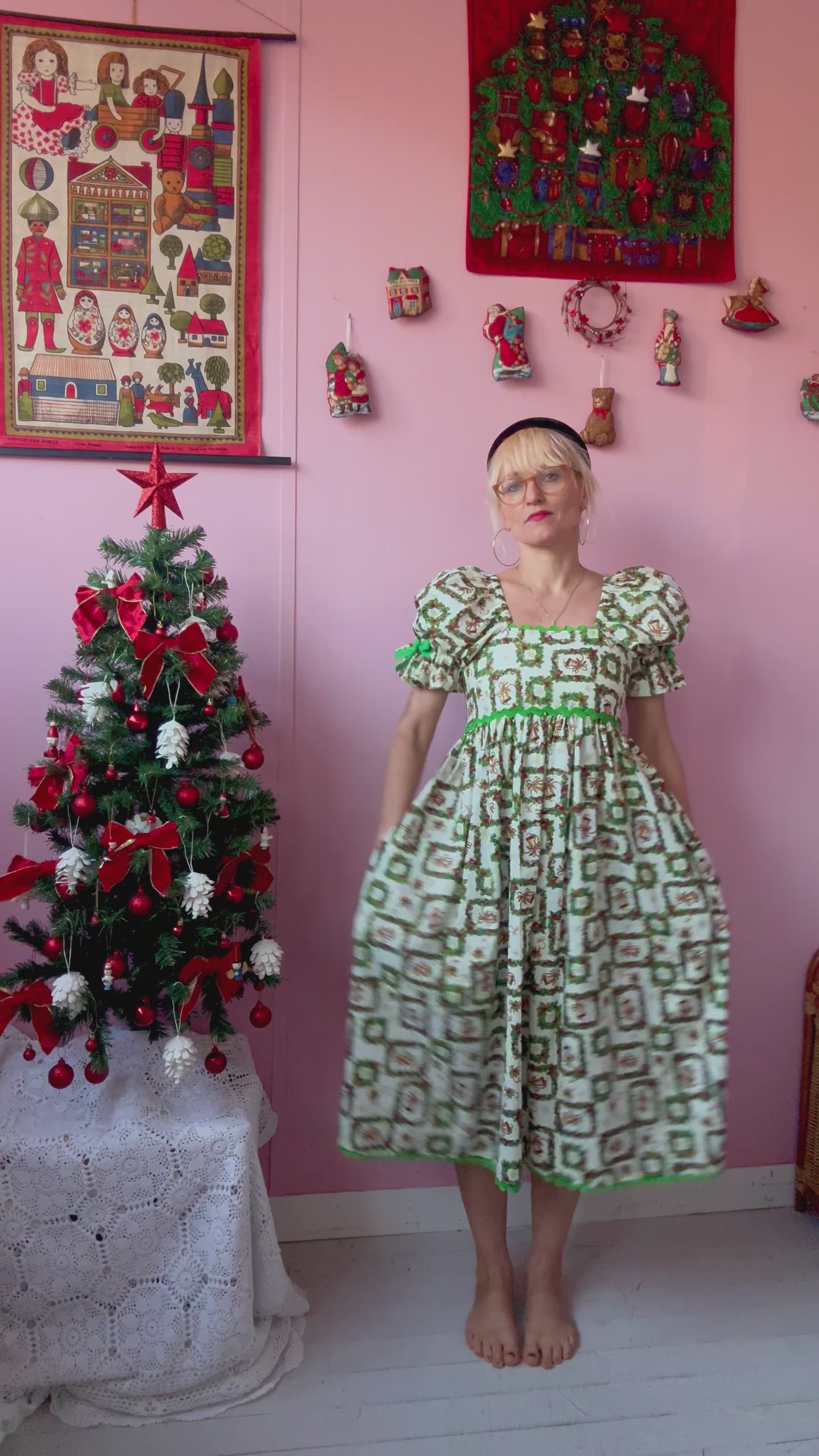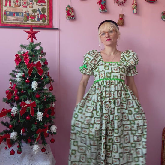Green cotton midi dress made from vintage fabric with Christmas themed print