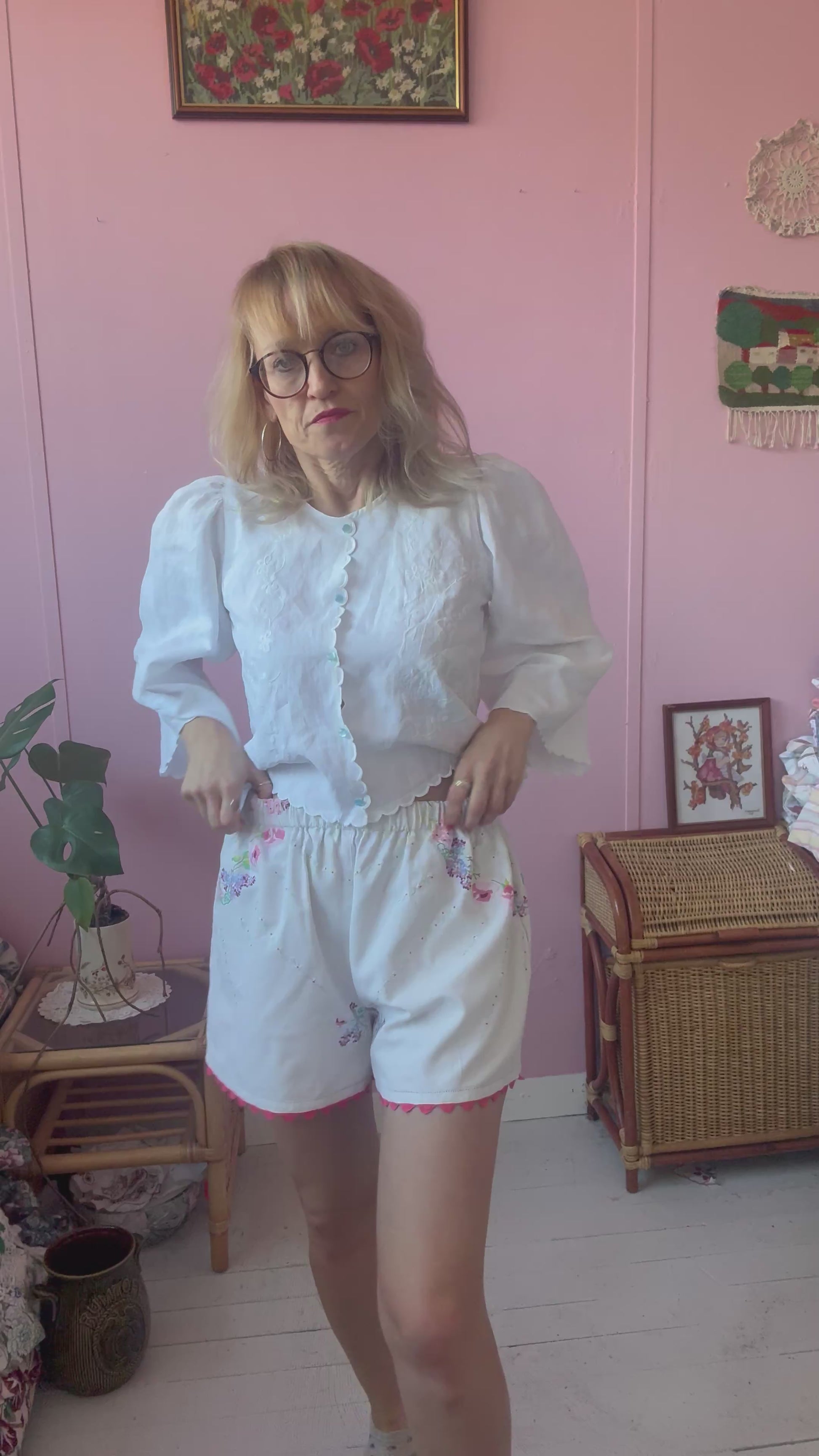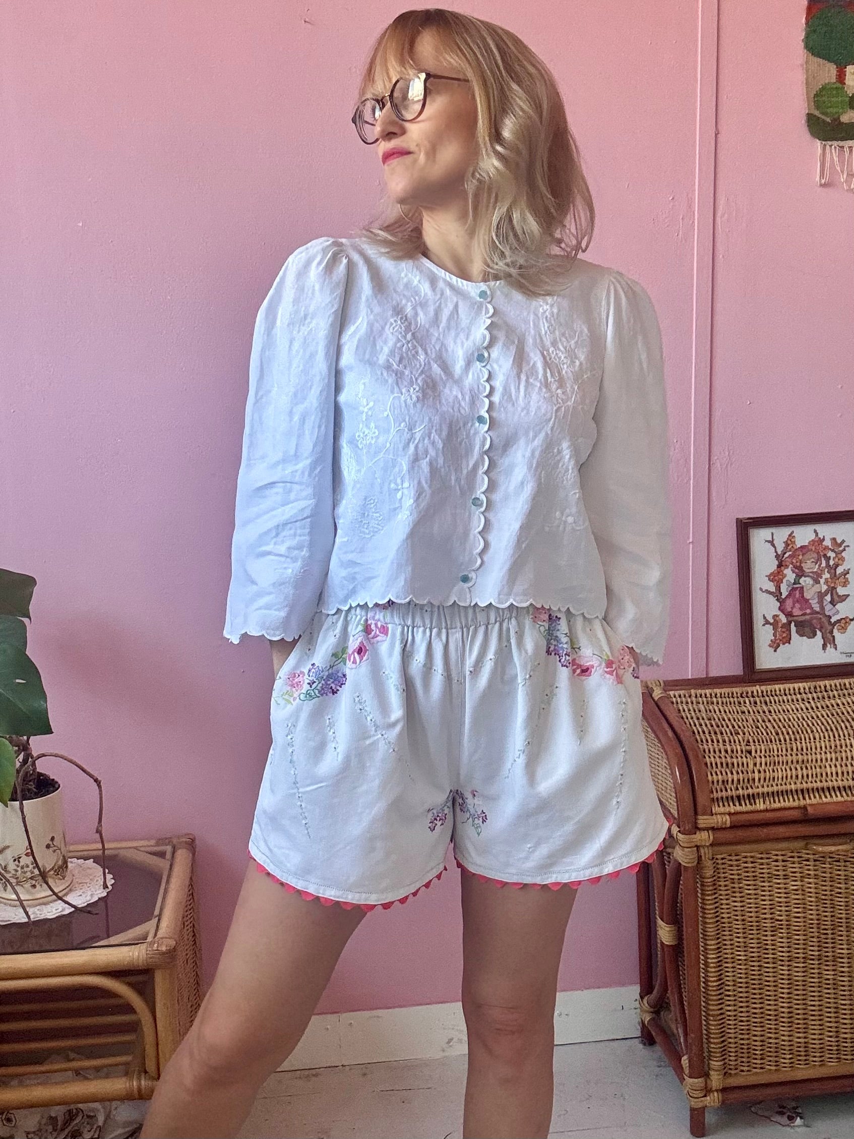Cotton shorts made from vintage tablecloth with floral hand embroidery-amazing details