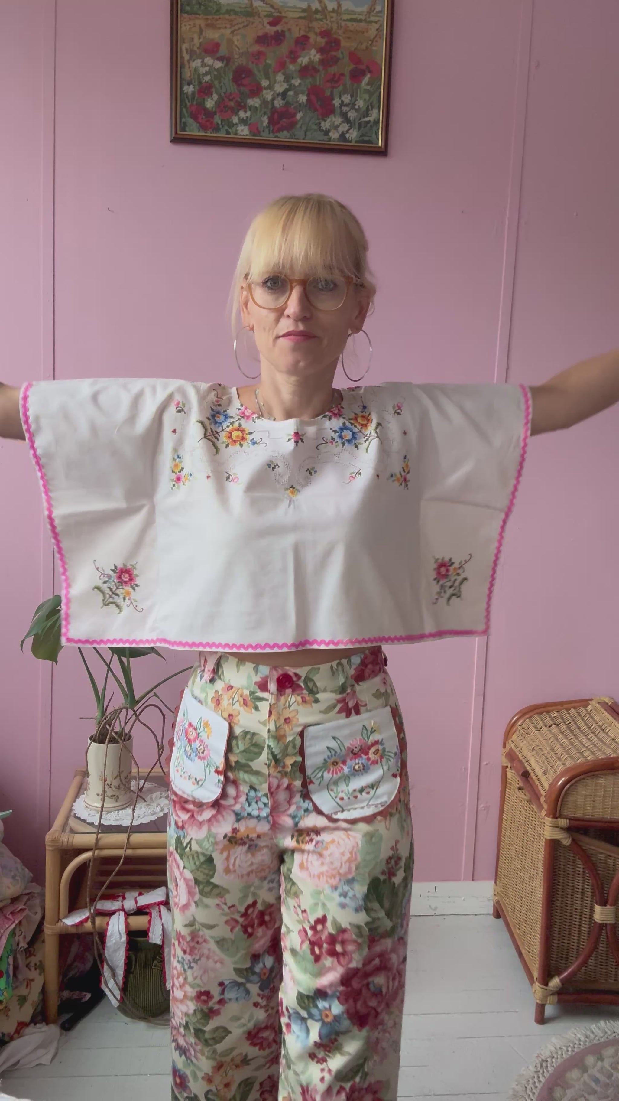 Cross stitch and pink ric rac basic top