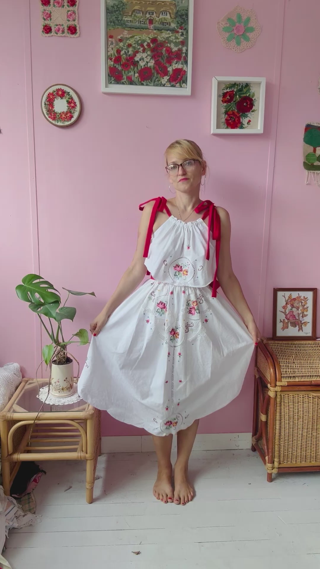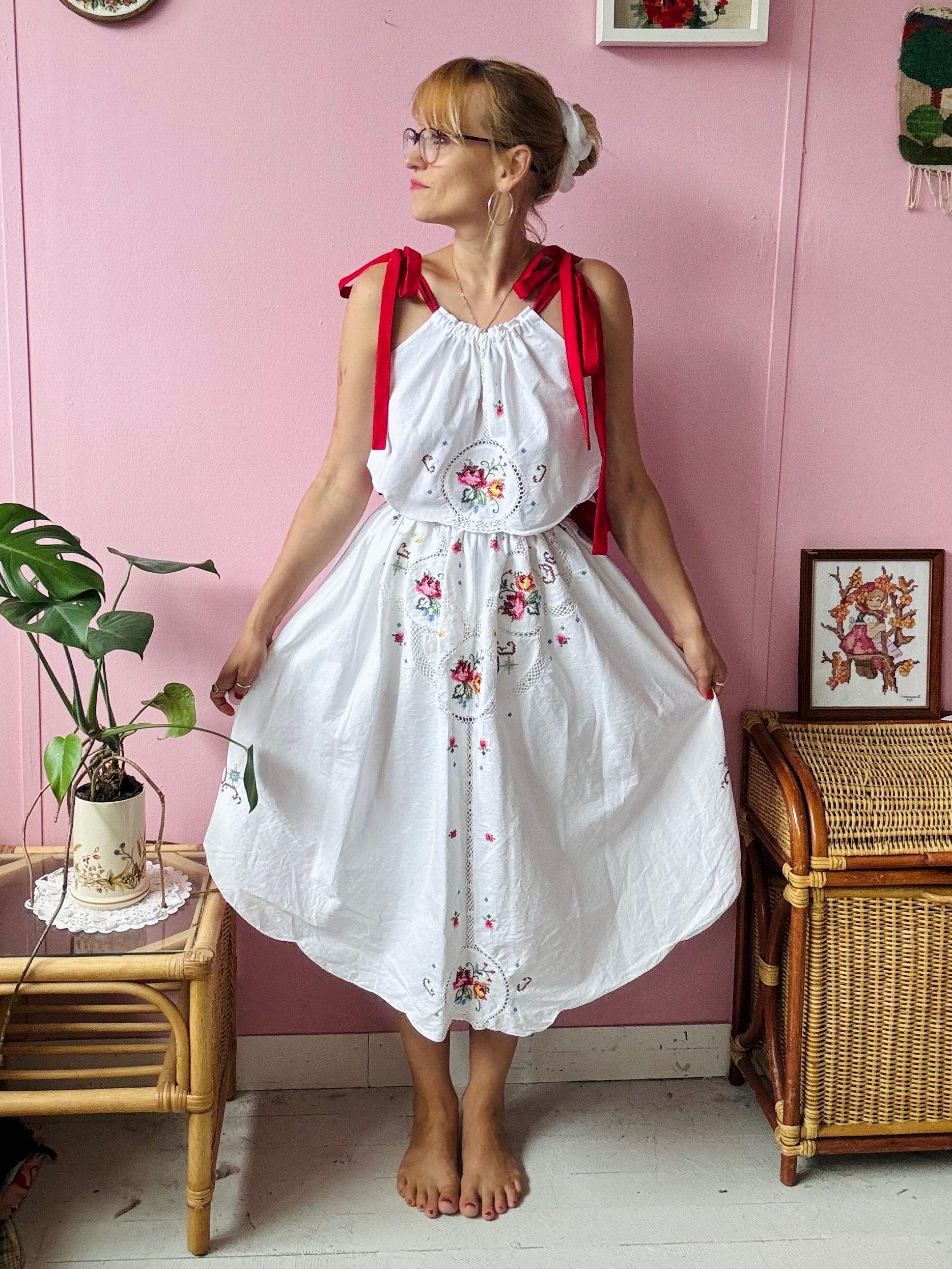 White cotton skirt and top set made from Vintage tablecloth with cross stitch hand embroidery and lace