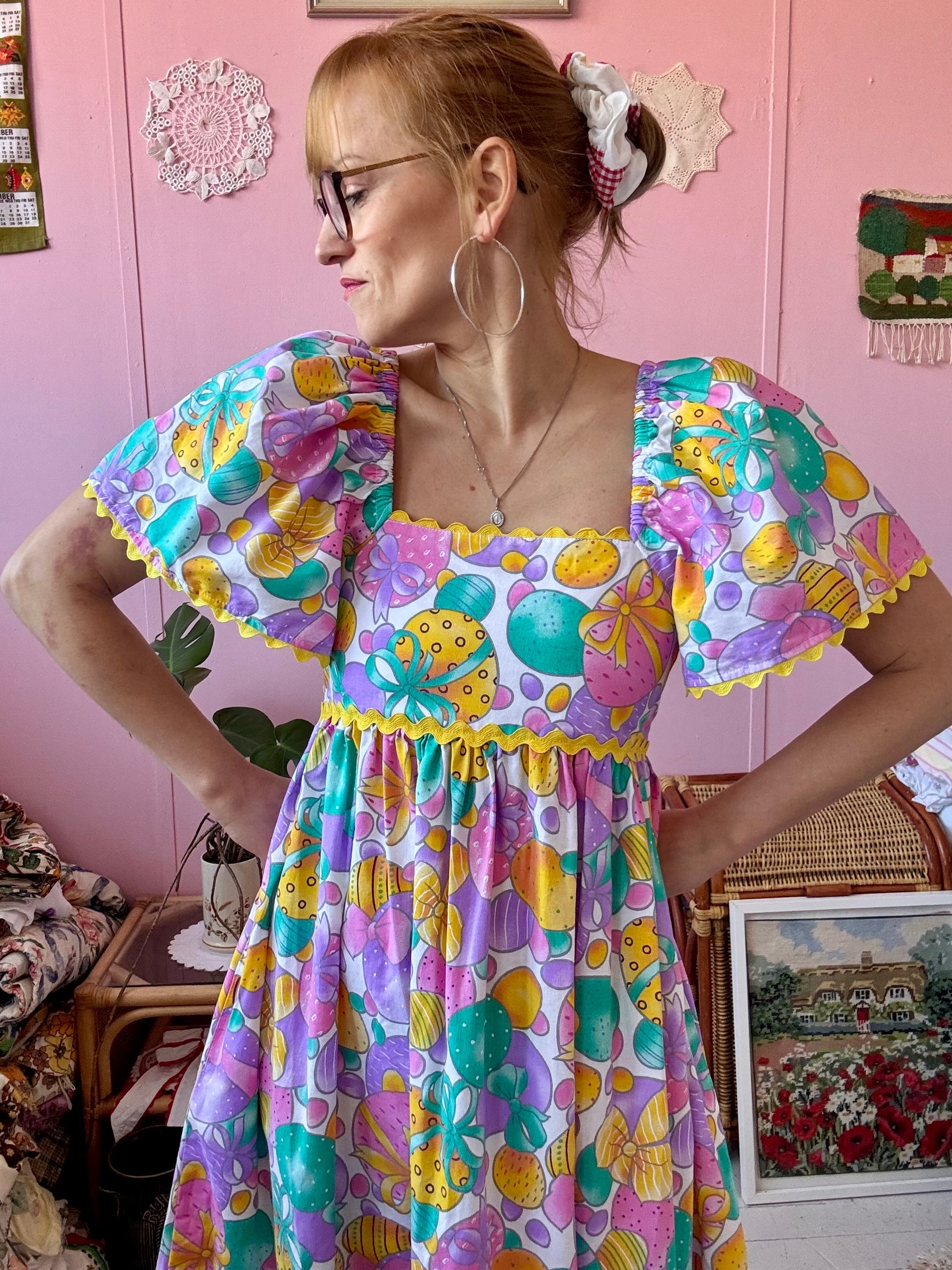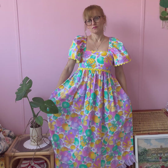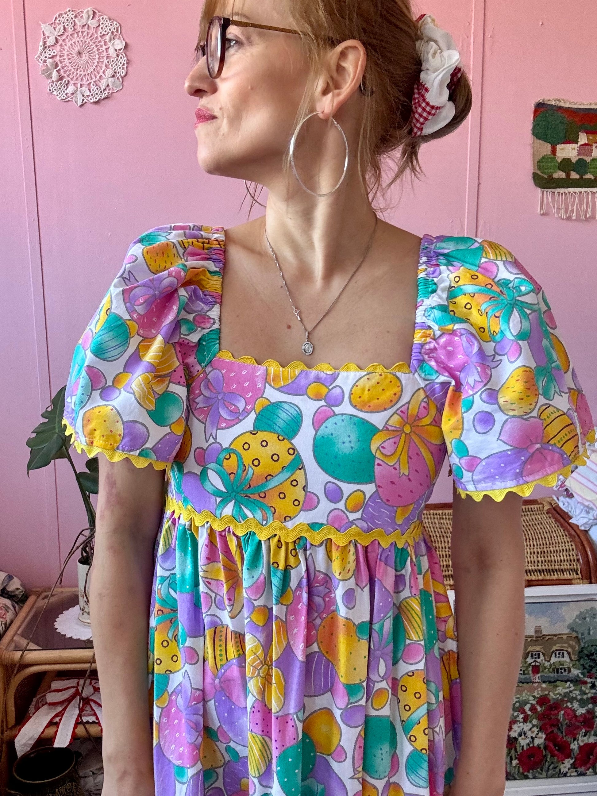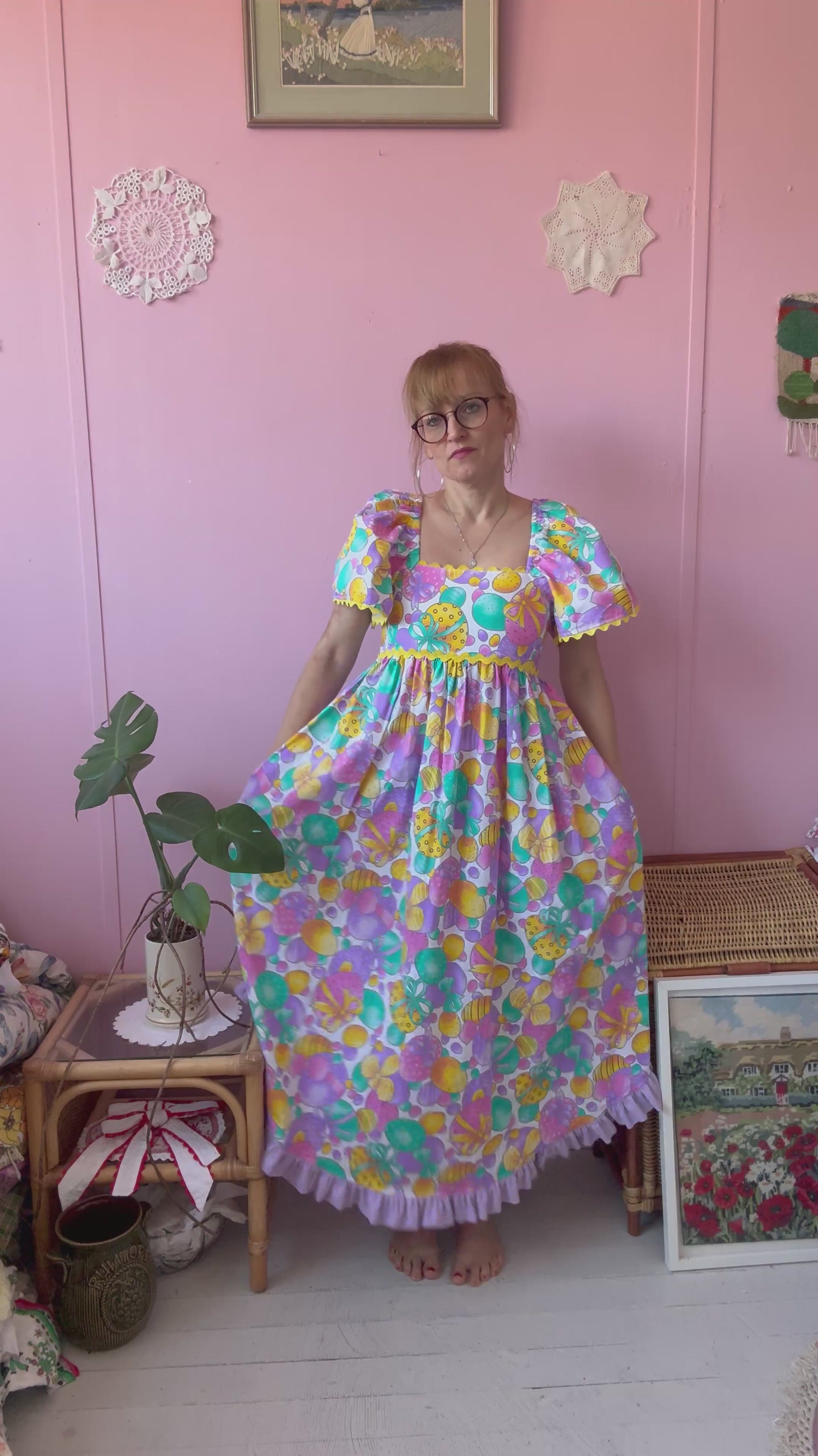 Cotton maxi dress made from vintage tablecloth with funky and bright Easter print