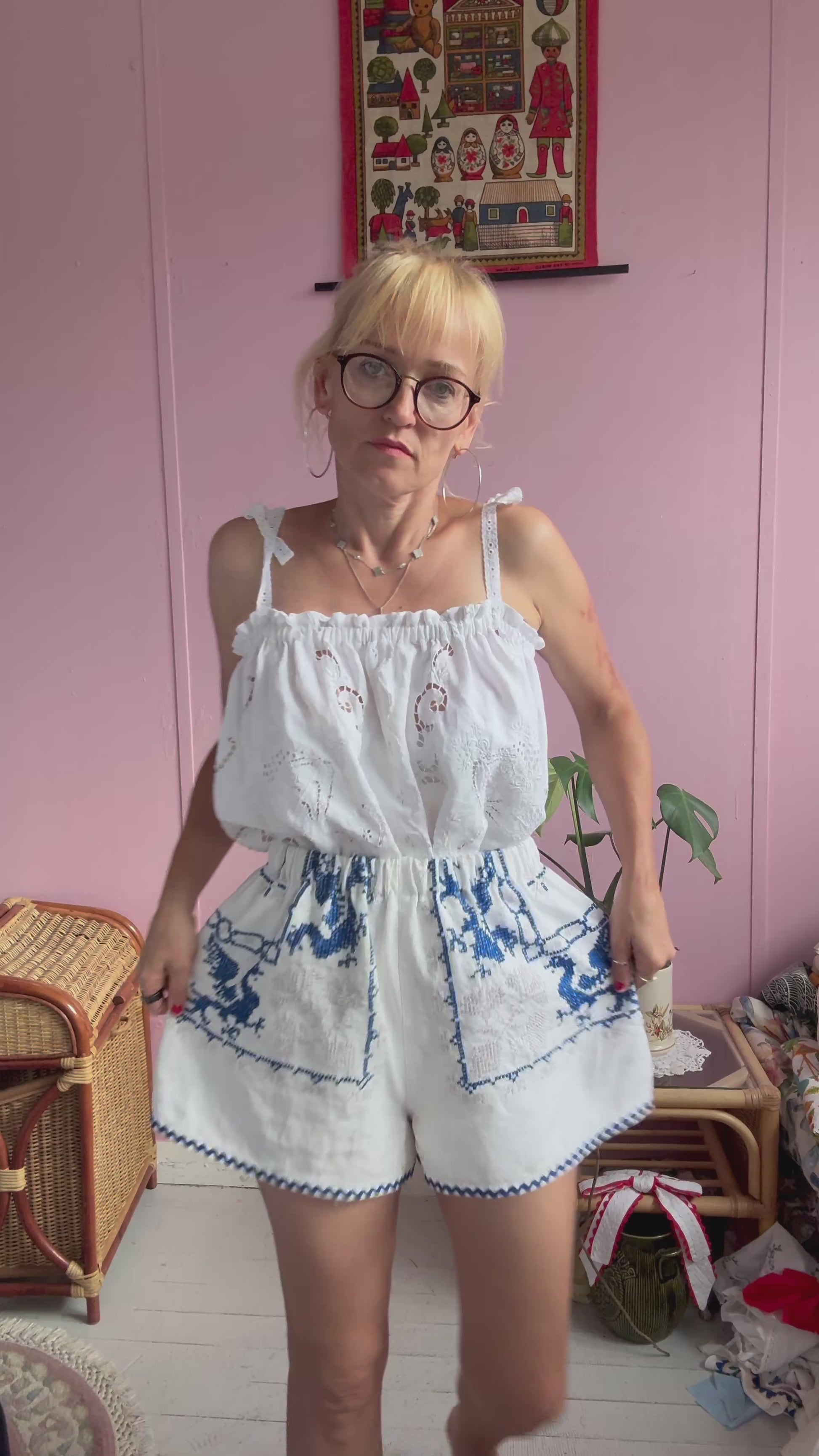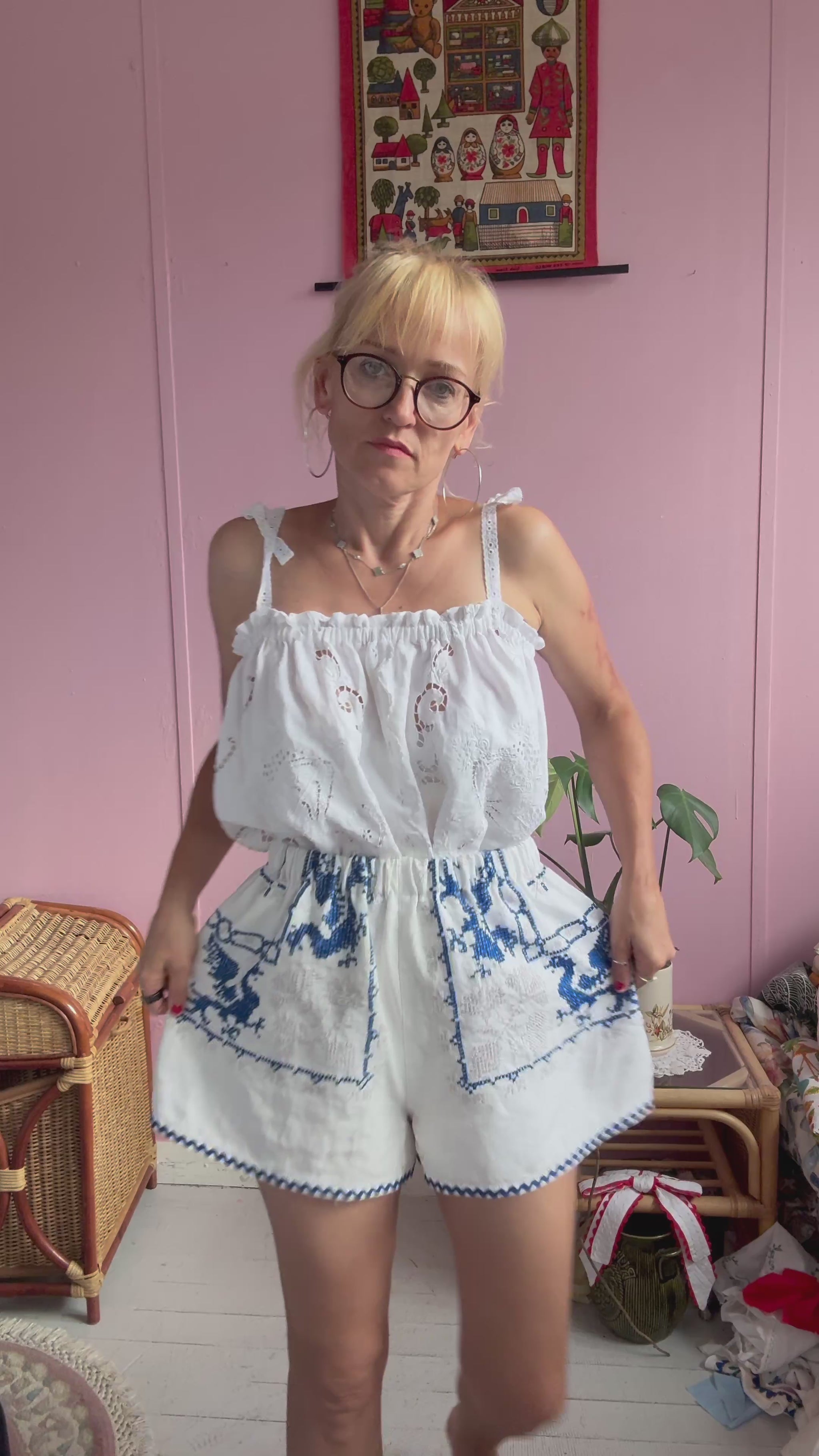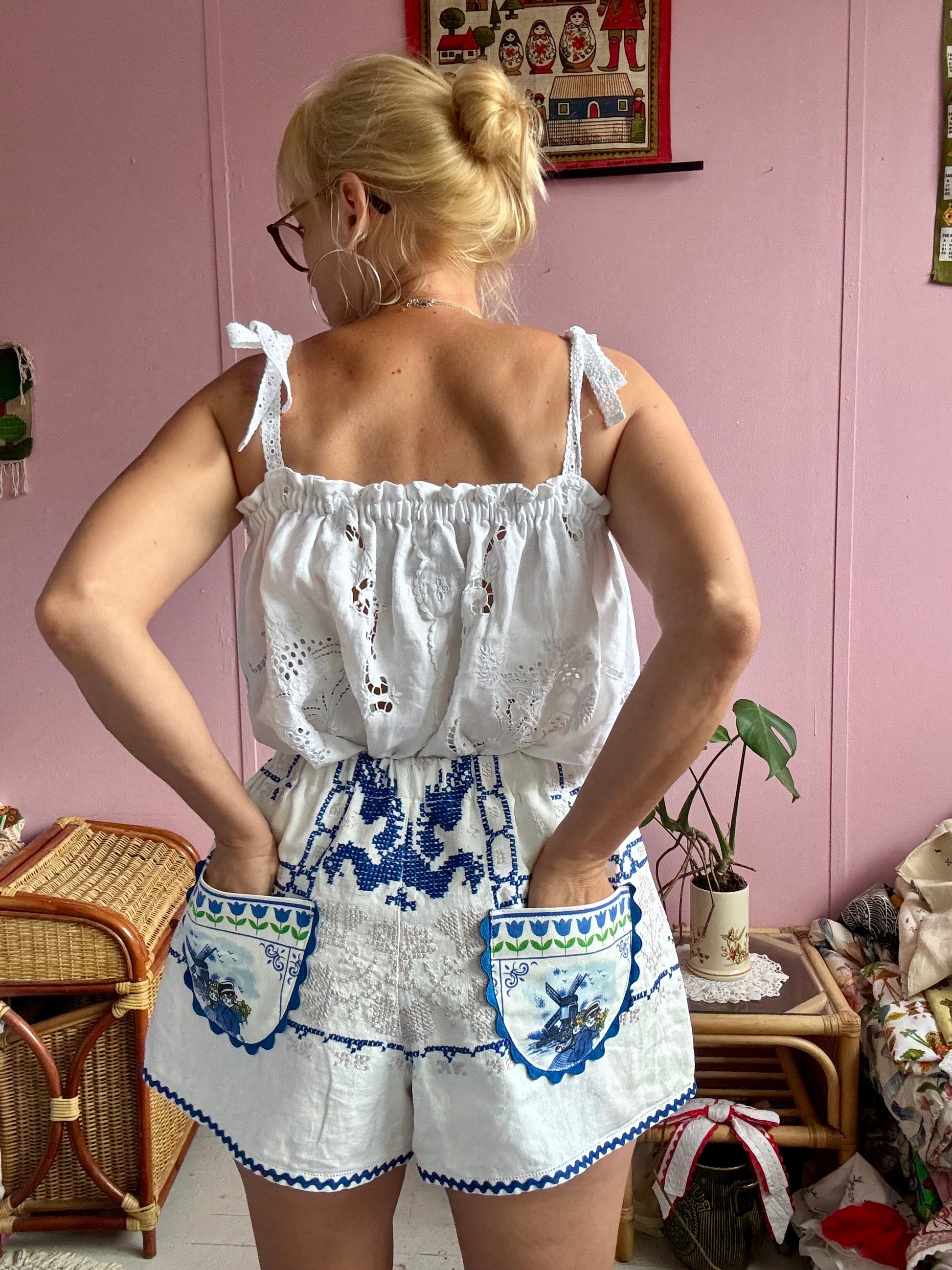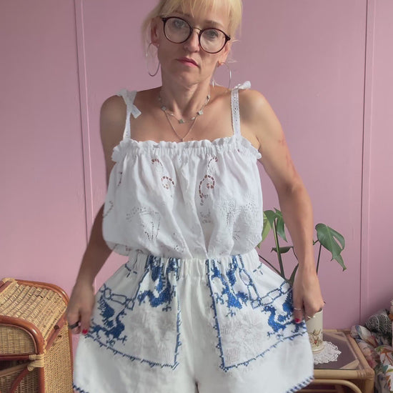 Linen shorts made from vintage tablecloth with cross stitching hand embroidery-amazing details
