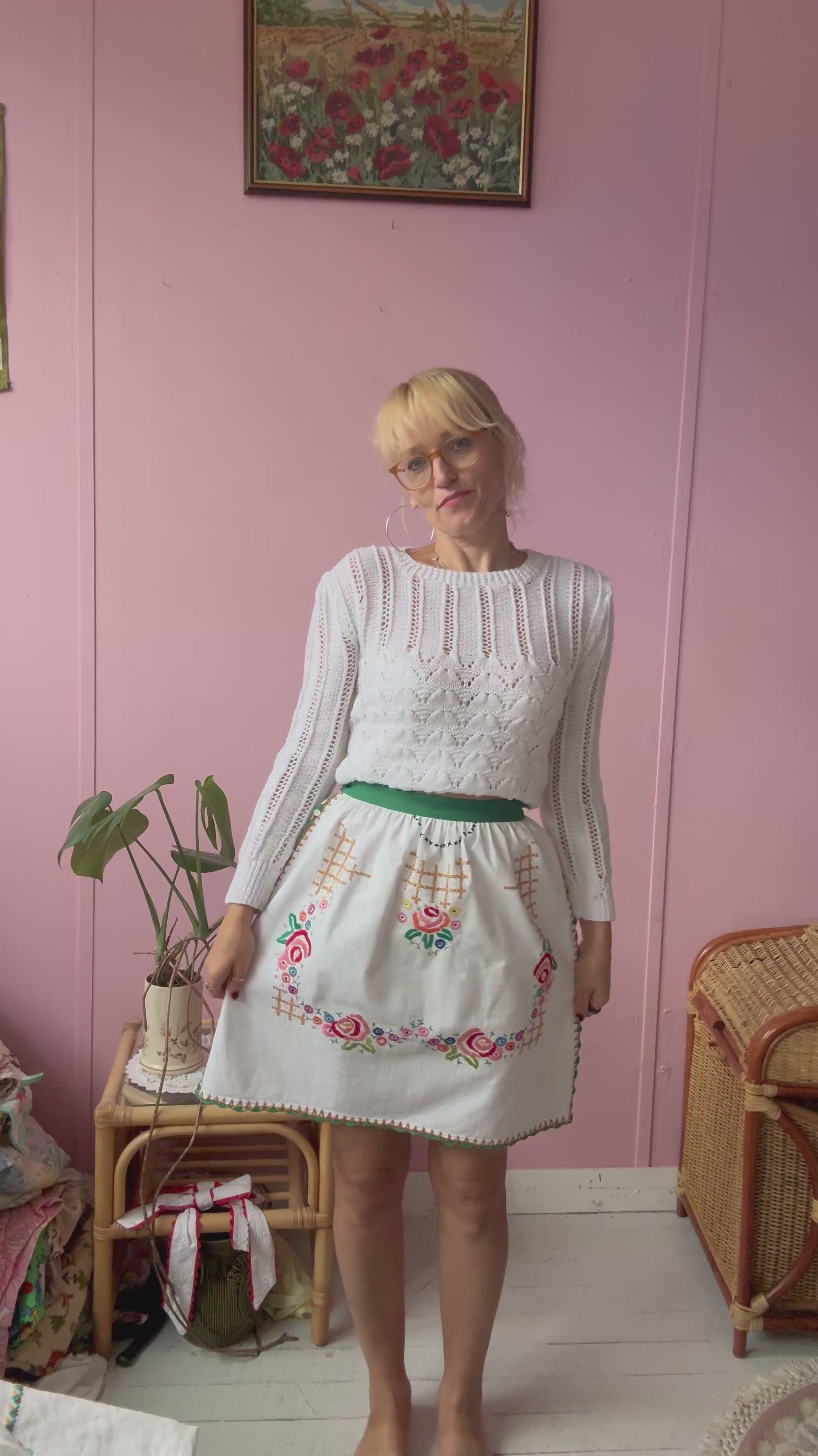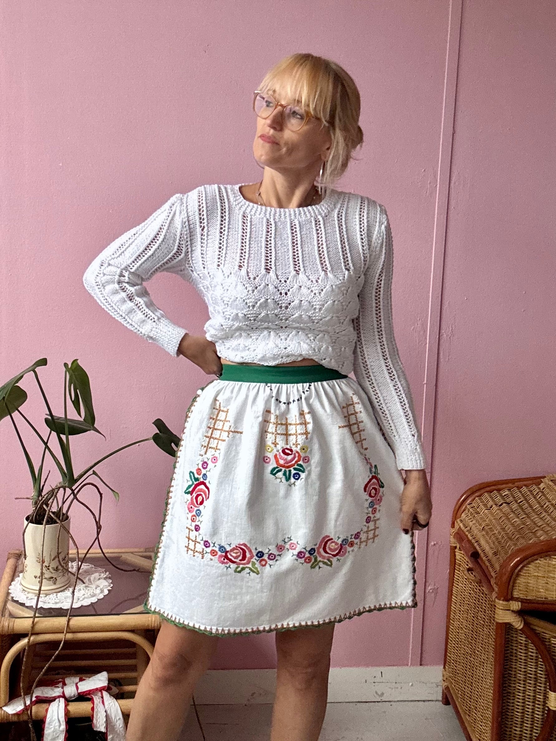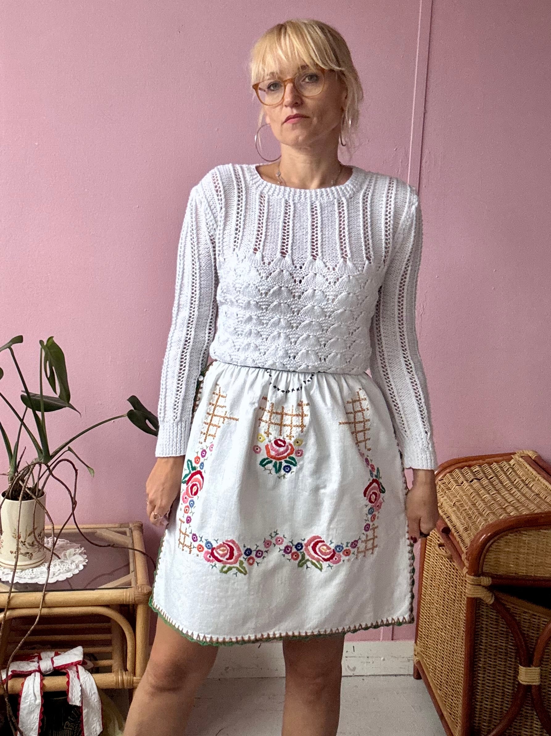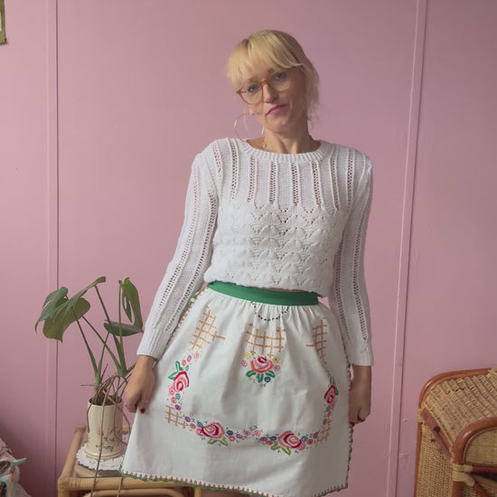 White above knee length skirt made from vintage cotton tablecloth