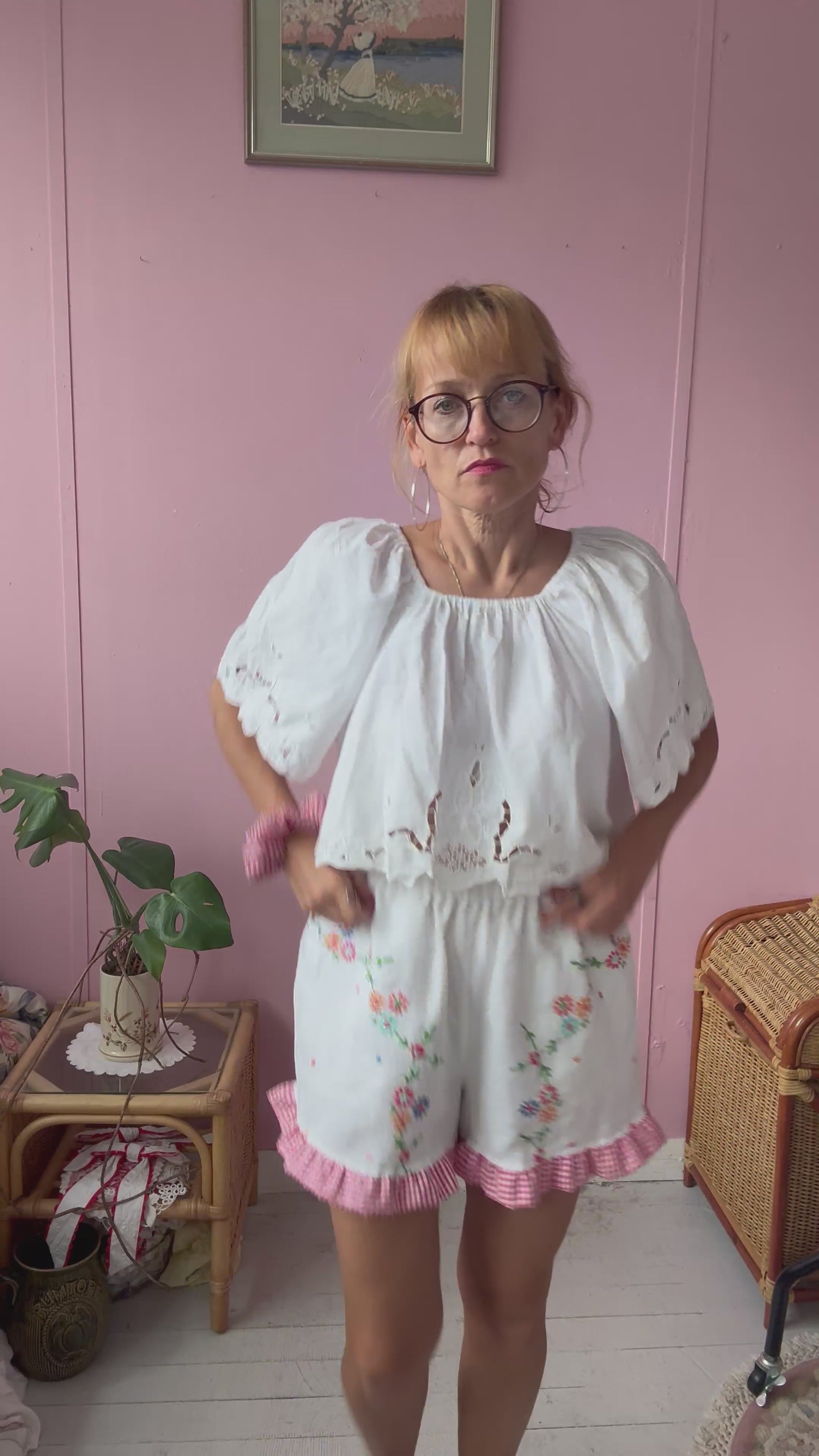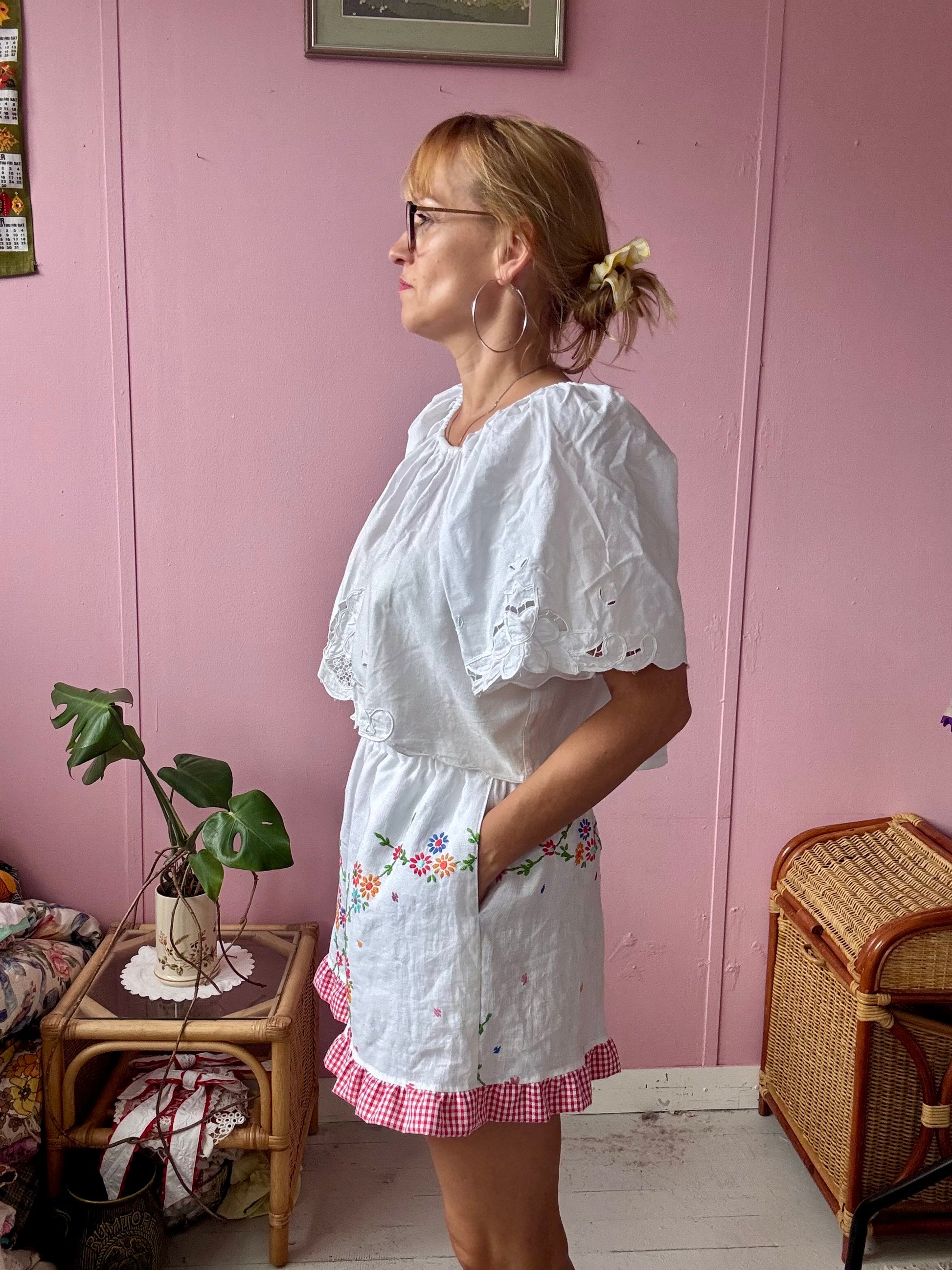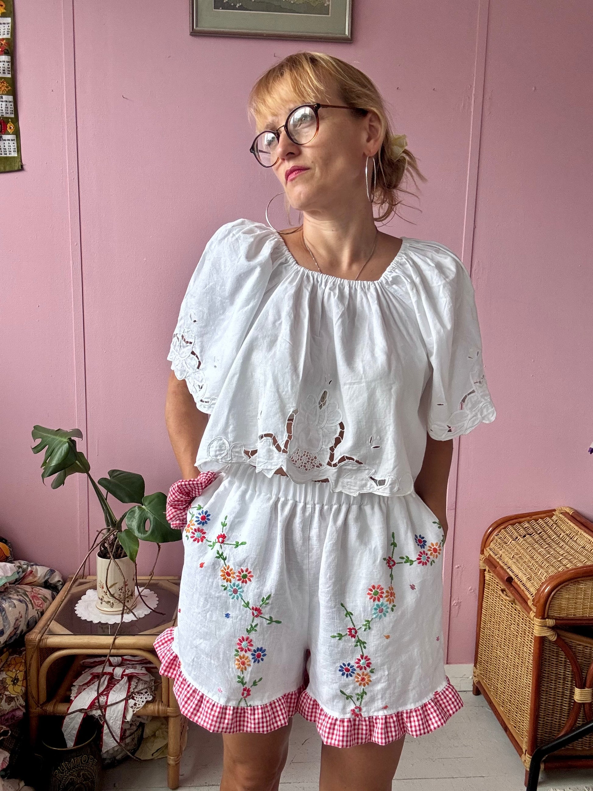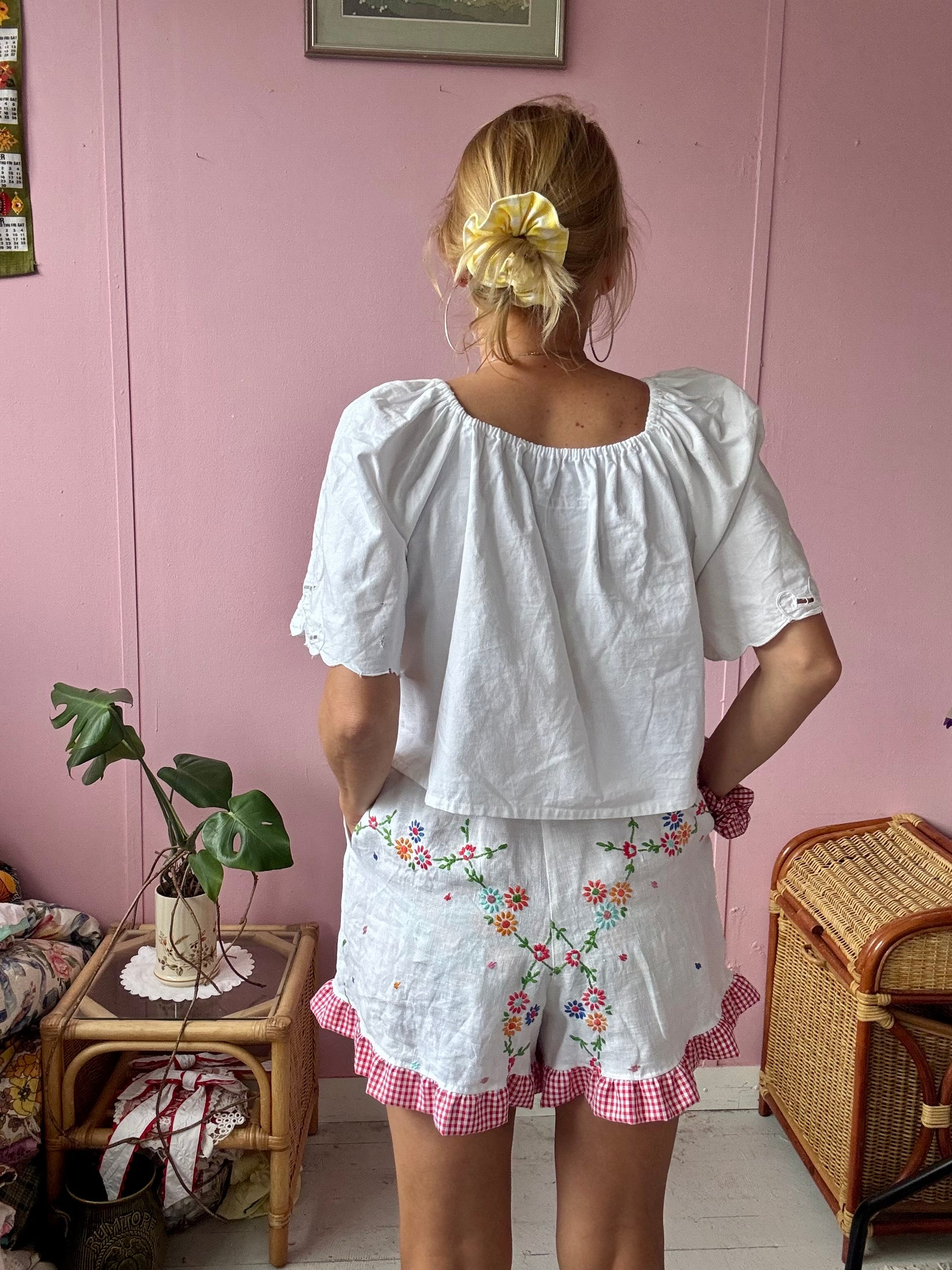 Linen shorts made from vintage tablecloth with floral hand embroidery