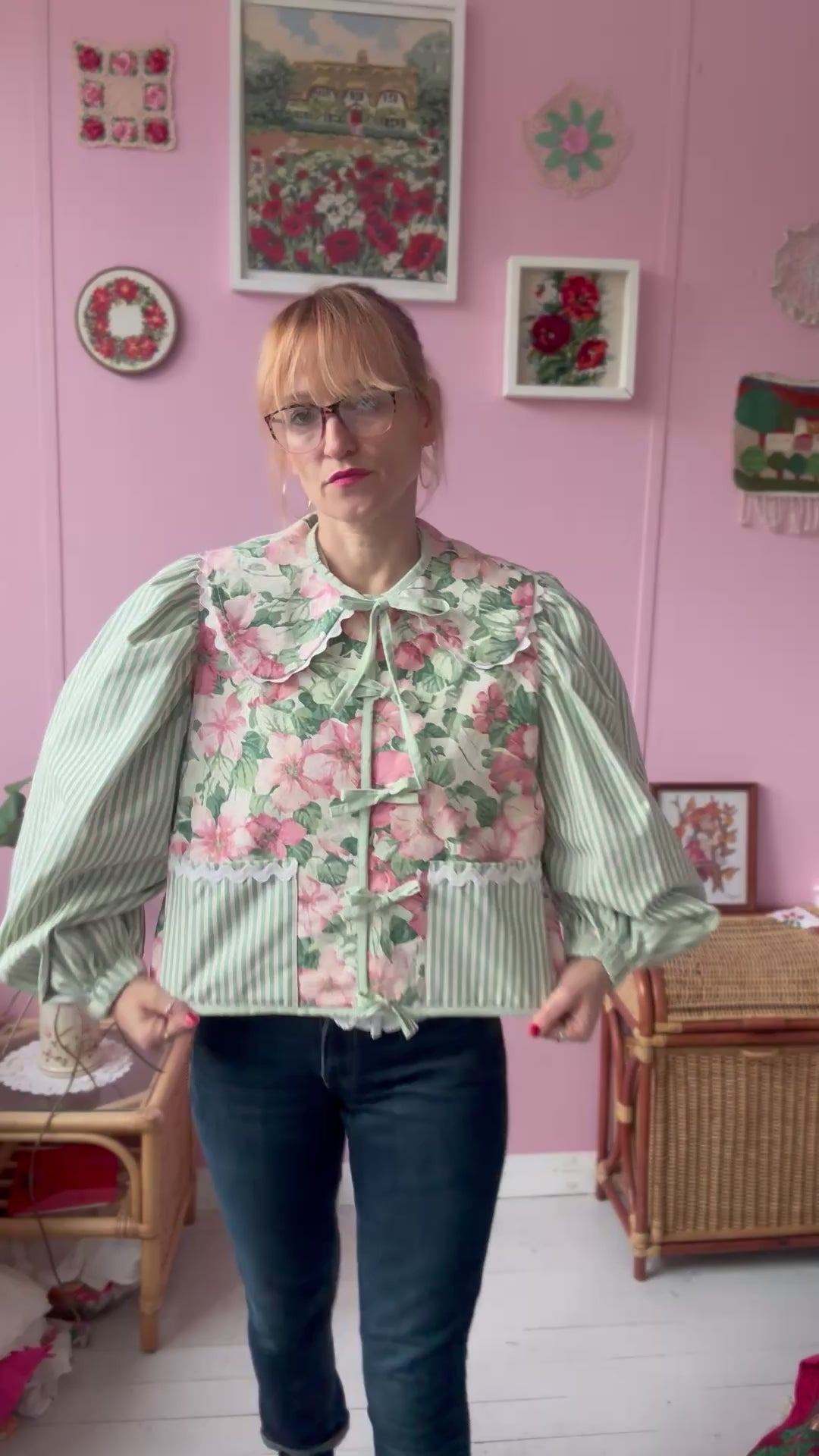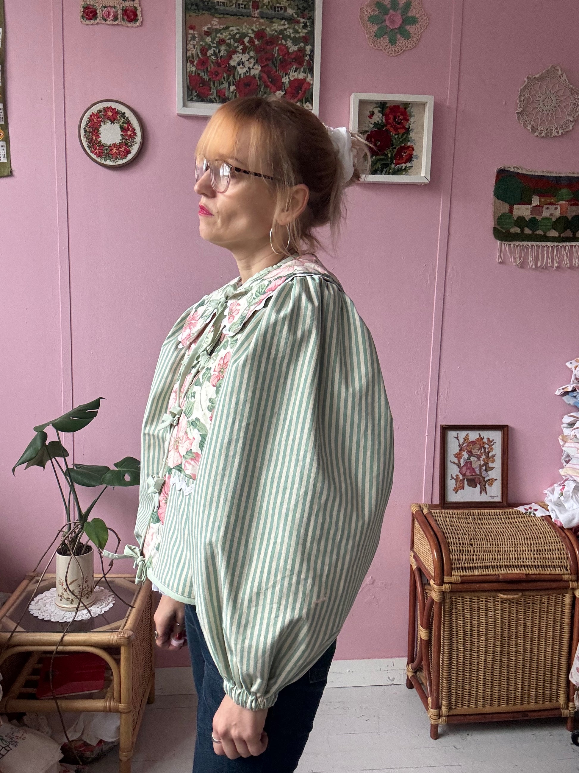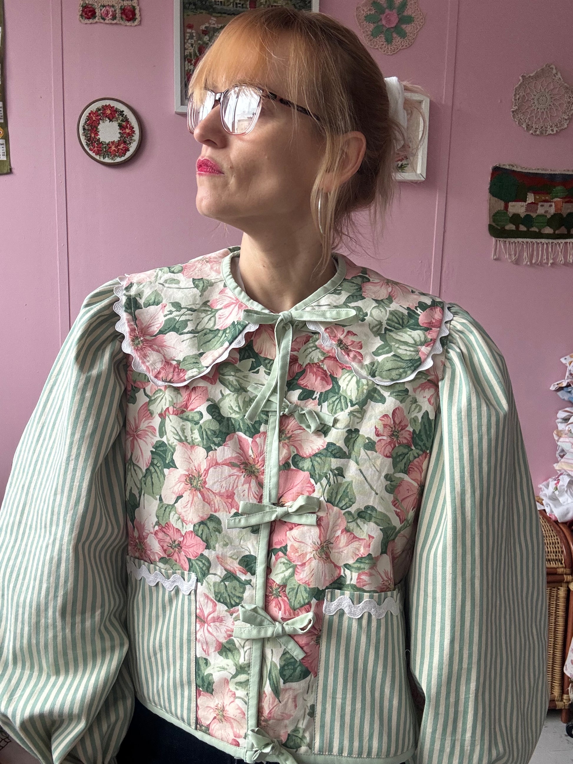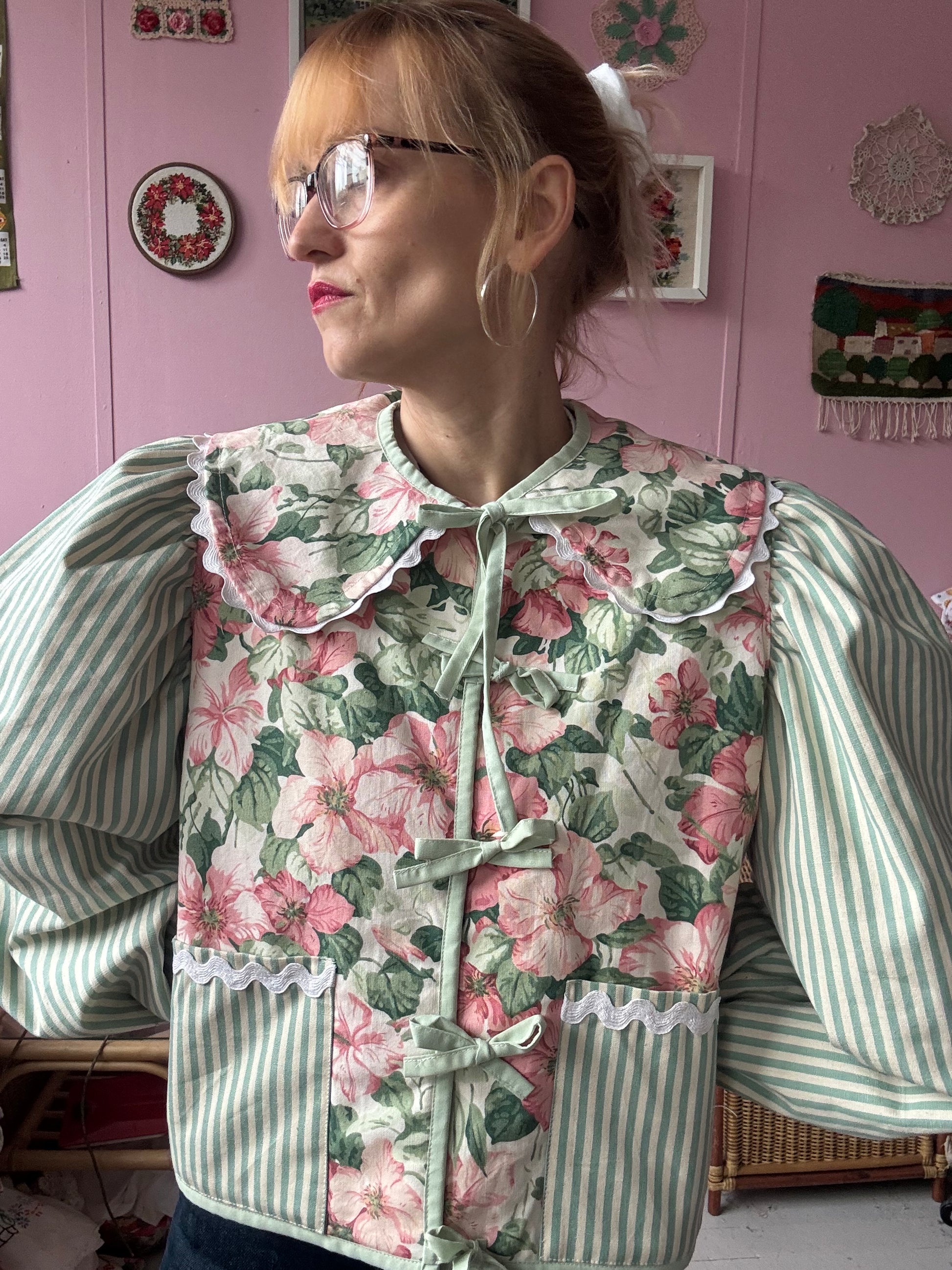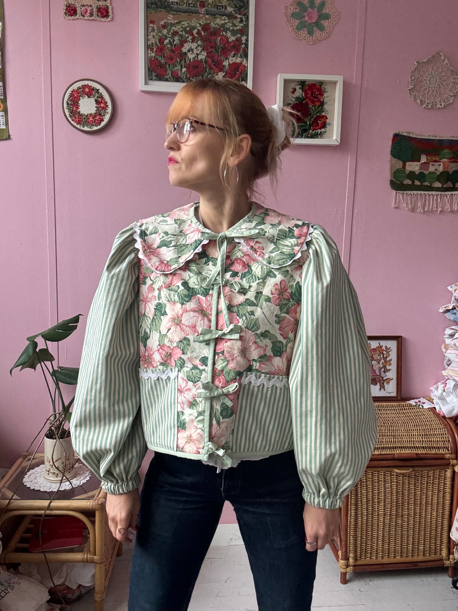 Floral and stripes jacket made from vintage curtains