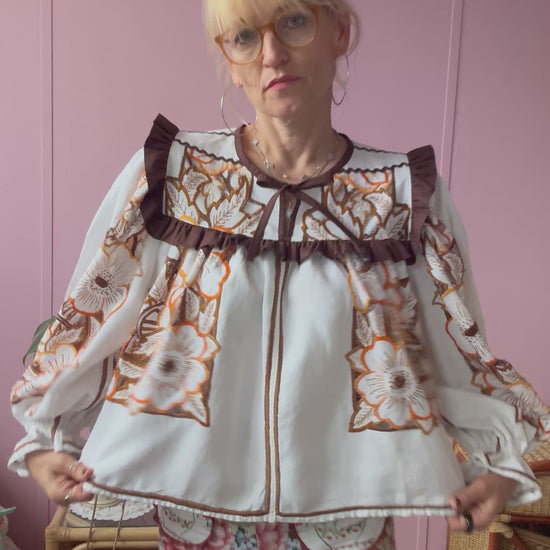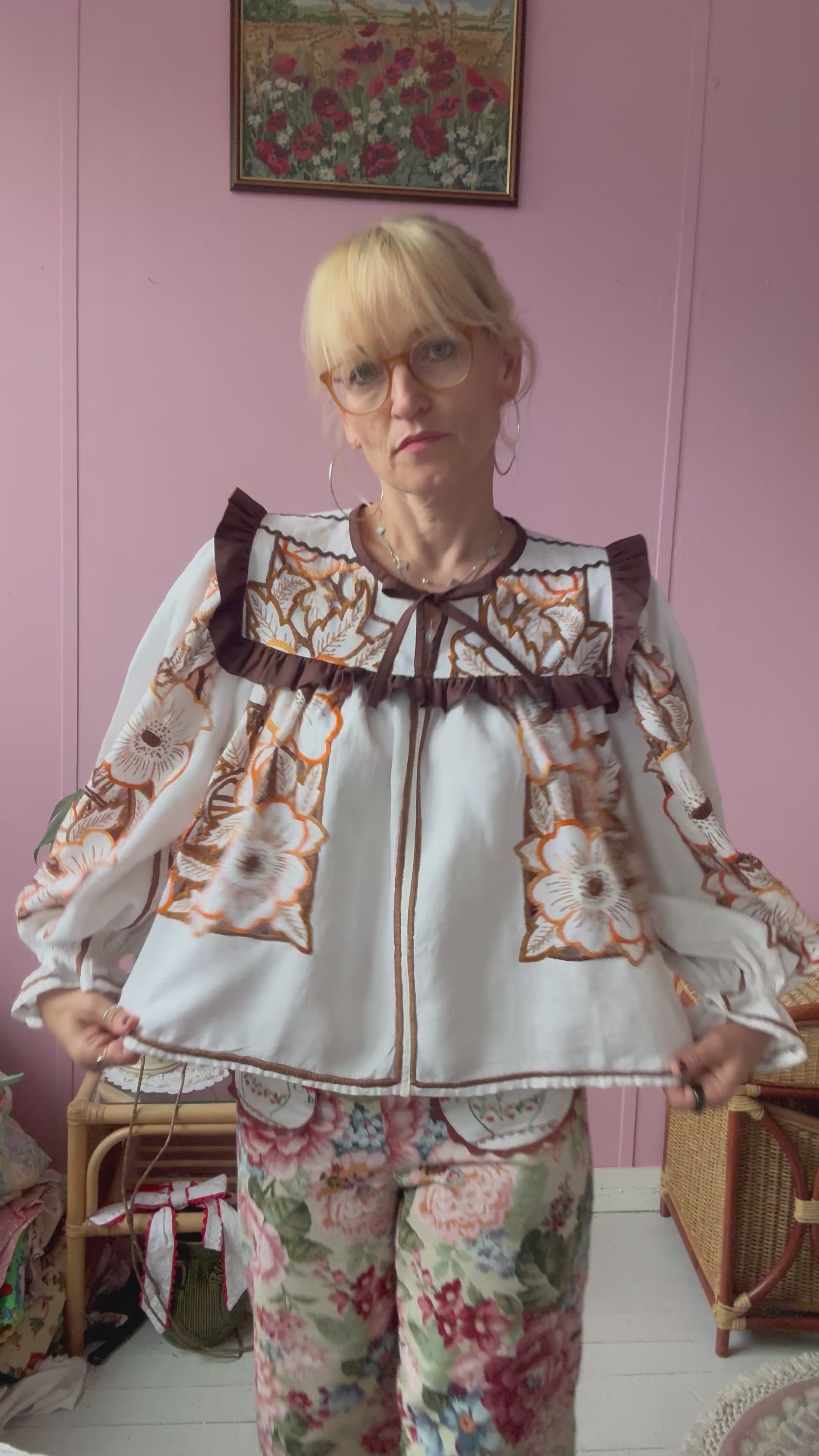 White linen blouse made from vintage tablecloth with floral cut out hand embroidery on sleeves and bodice-amazing details all over
