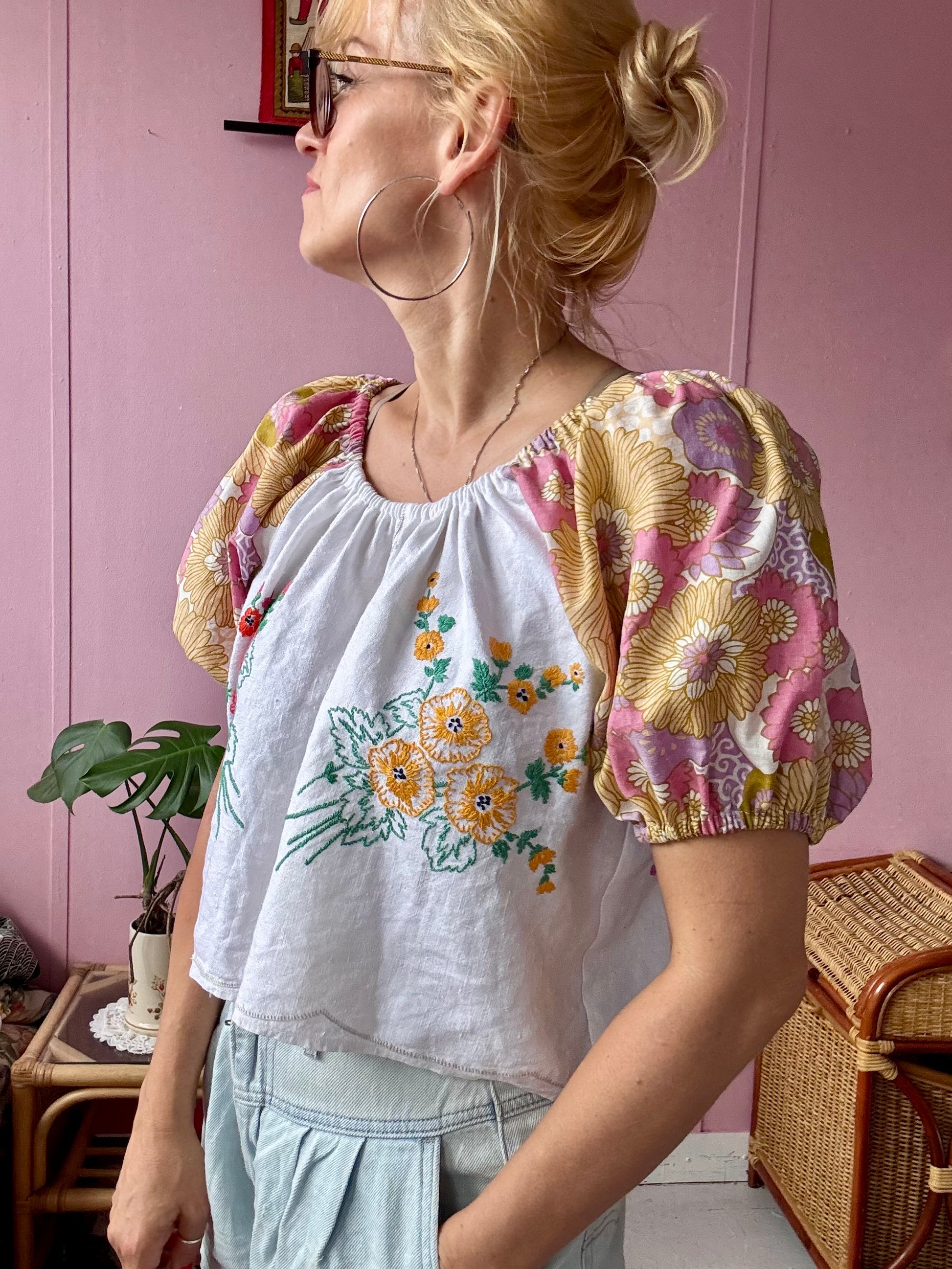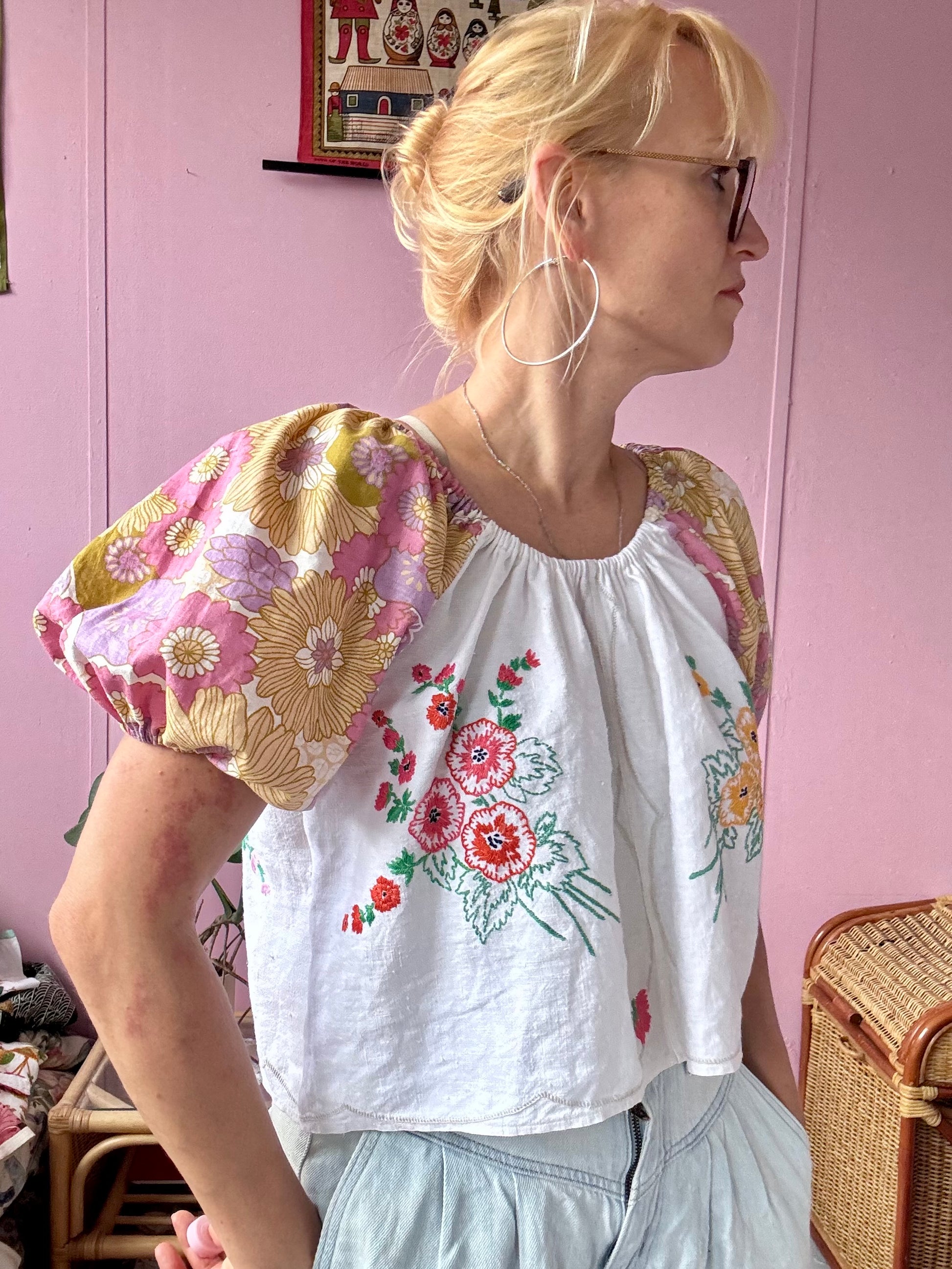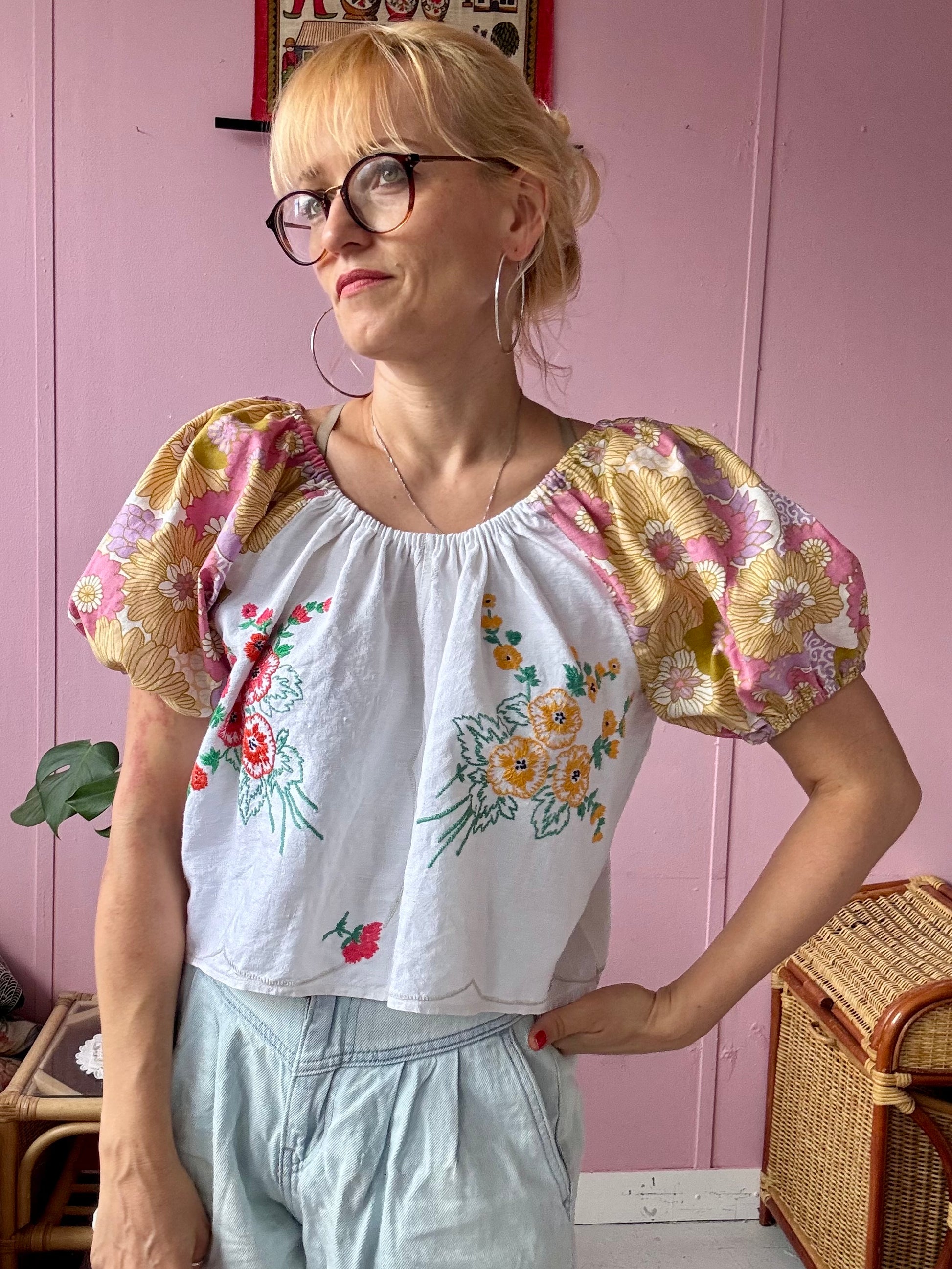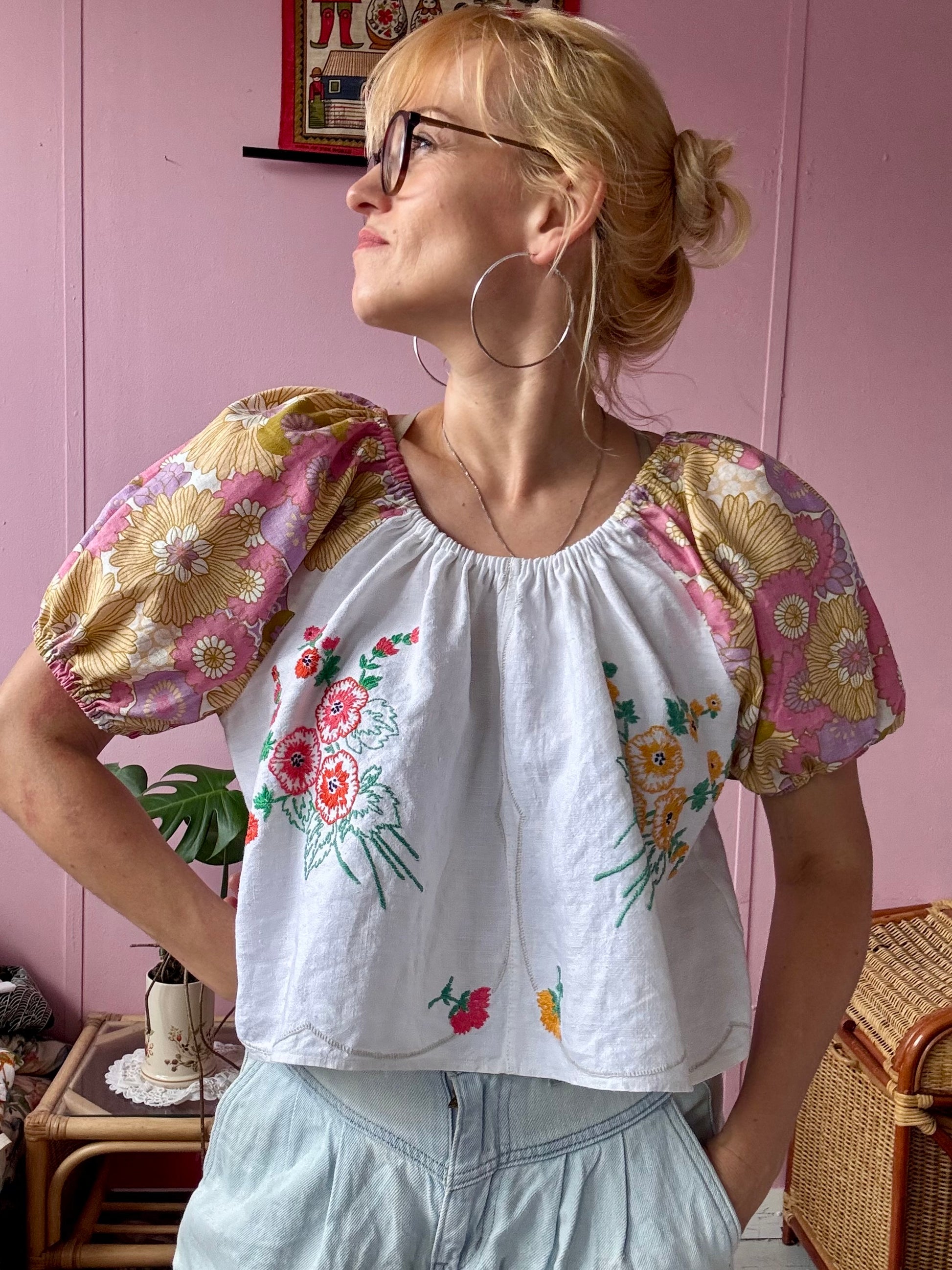 Floral blouse made from vintage tablecloth with floral hand embroidery and floral print vintage fabric