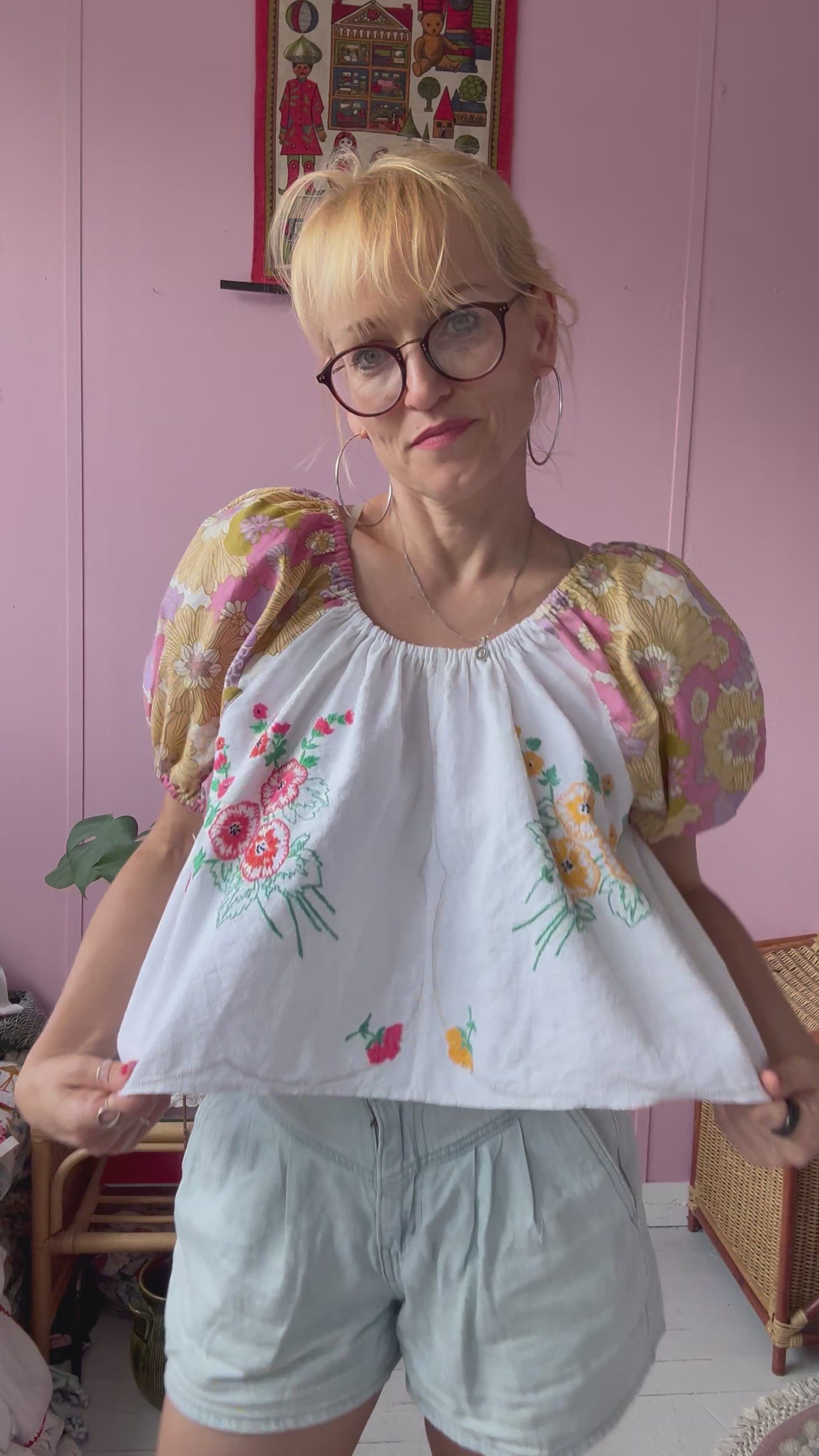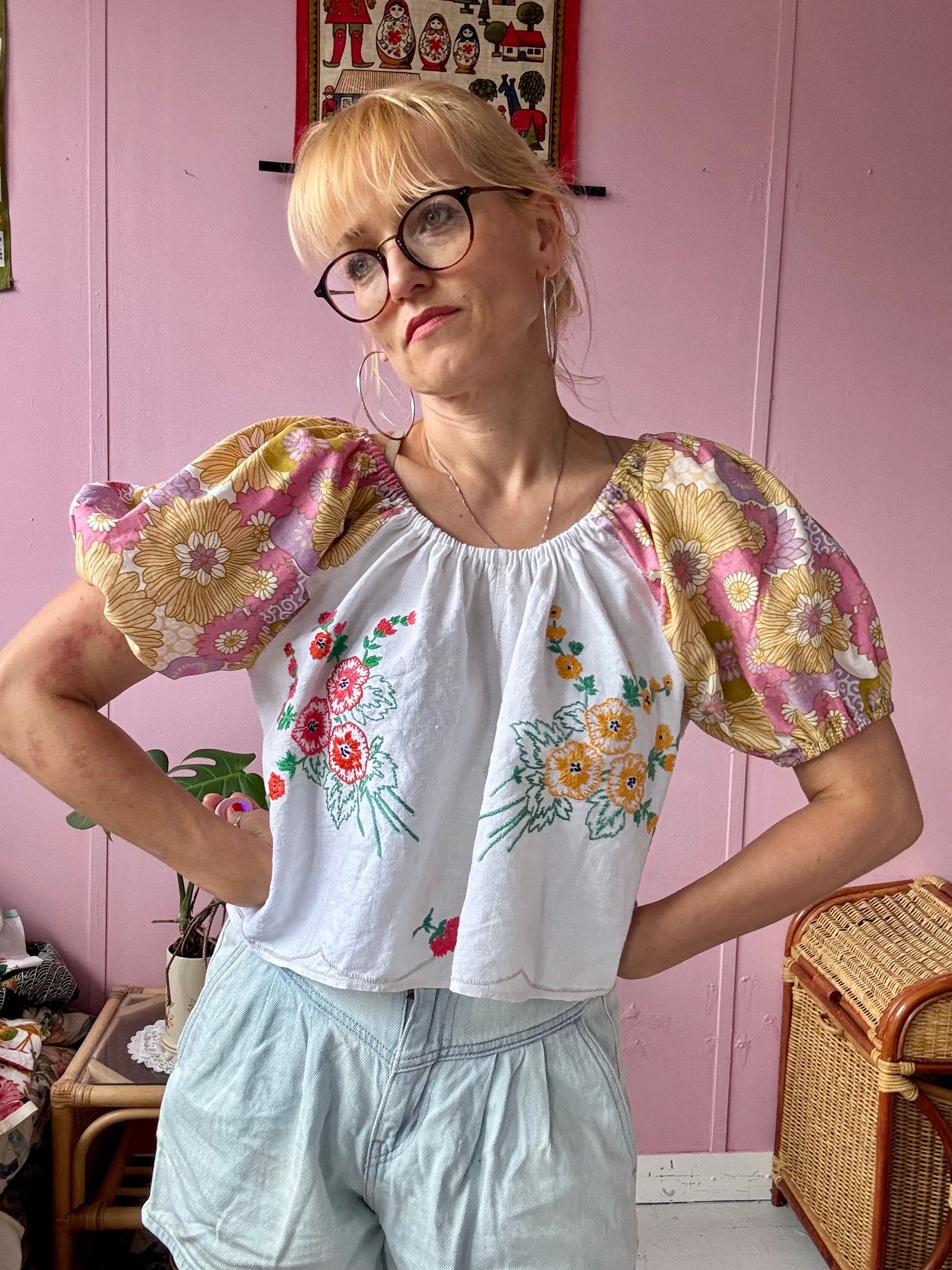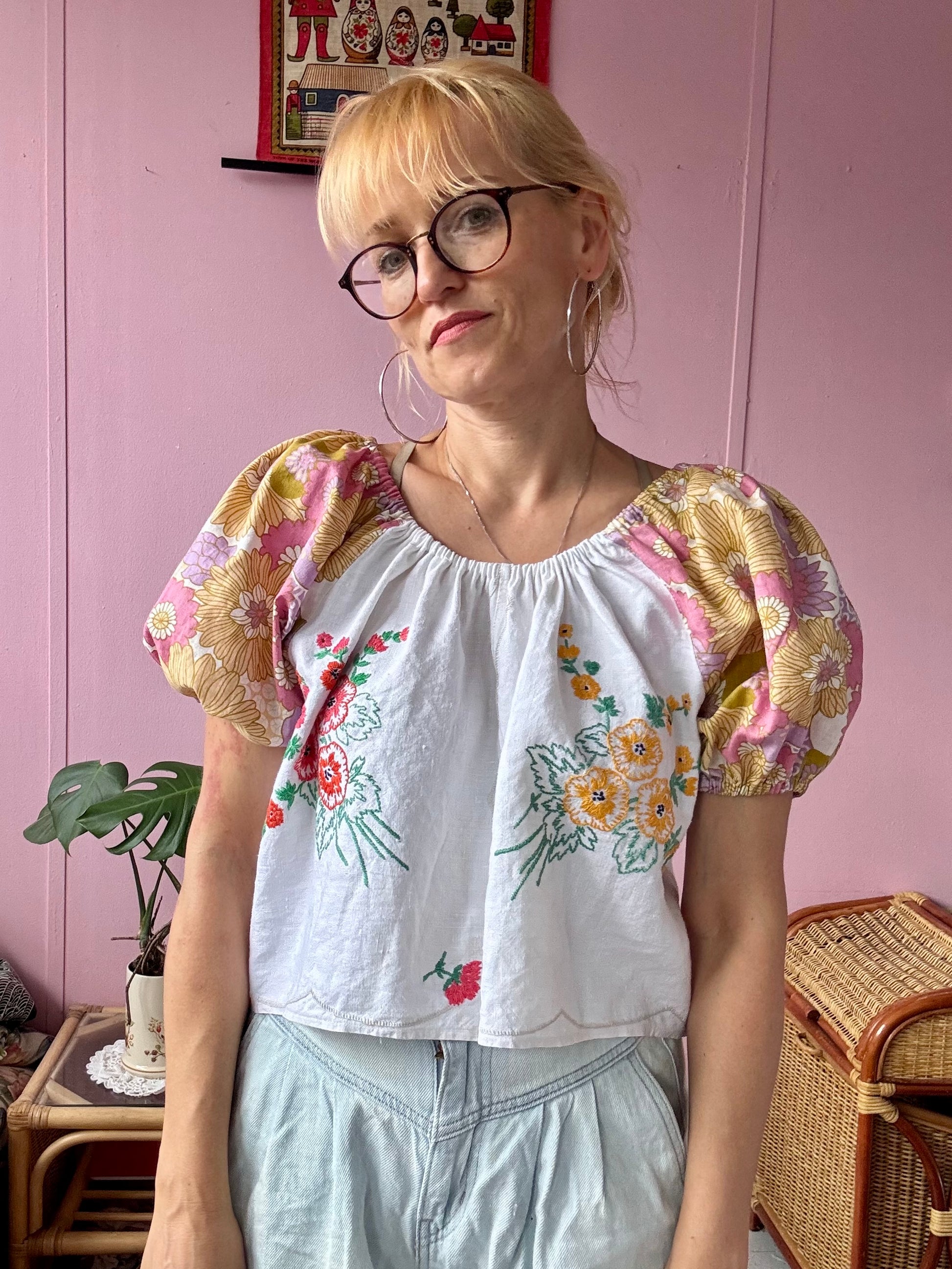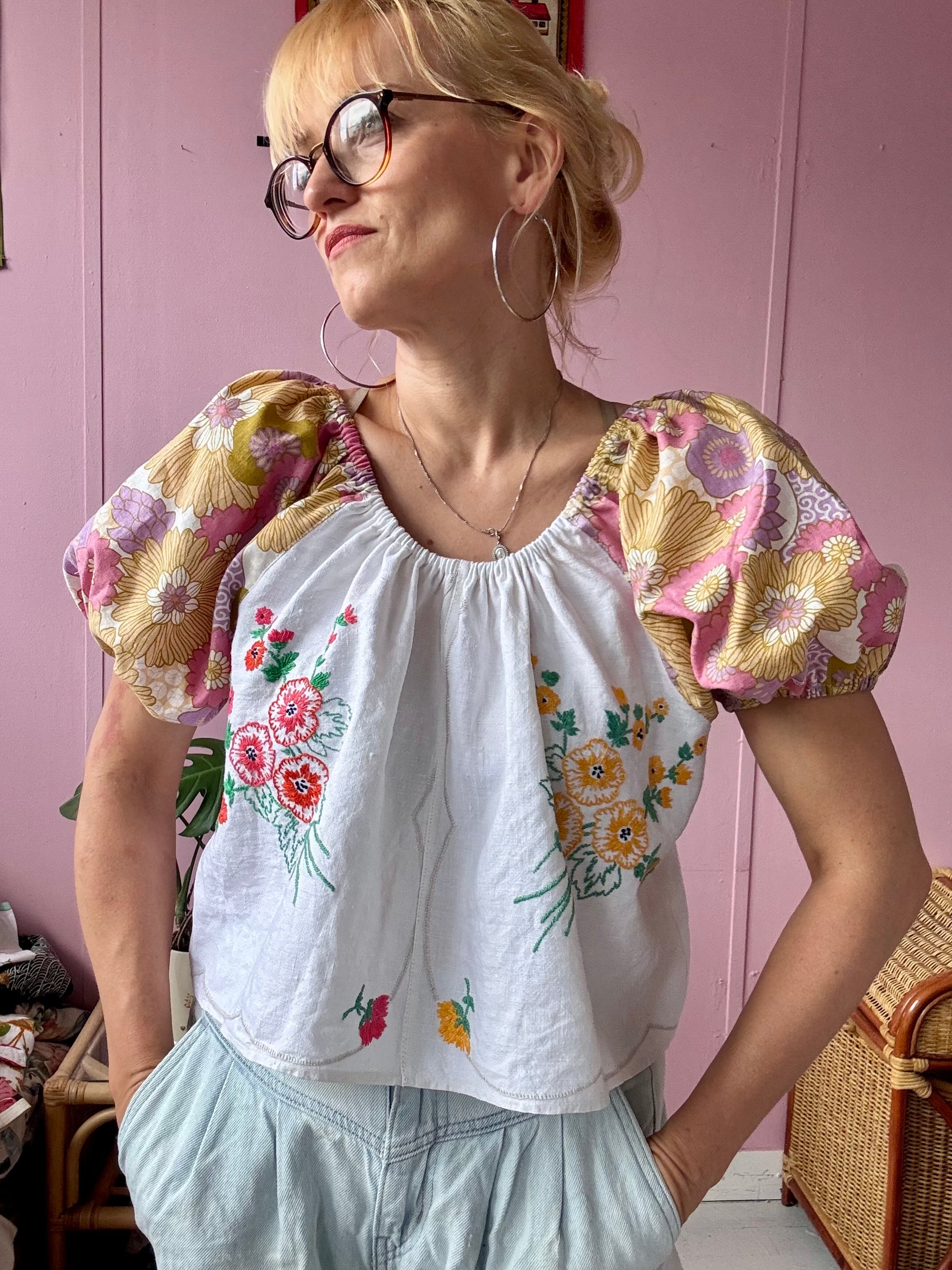 Floral blouse made from vintage tablecloth with floral hand embroidery and floral print vintage fabric