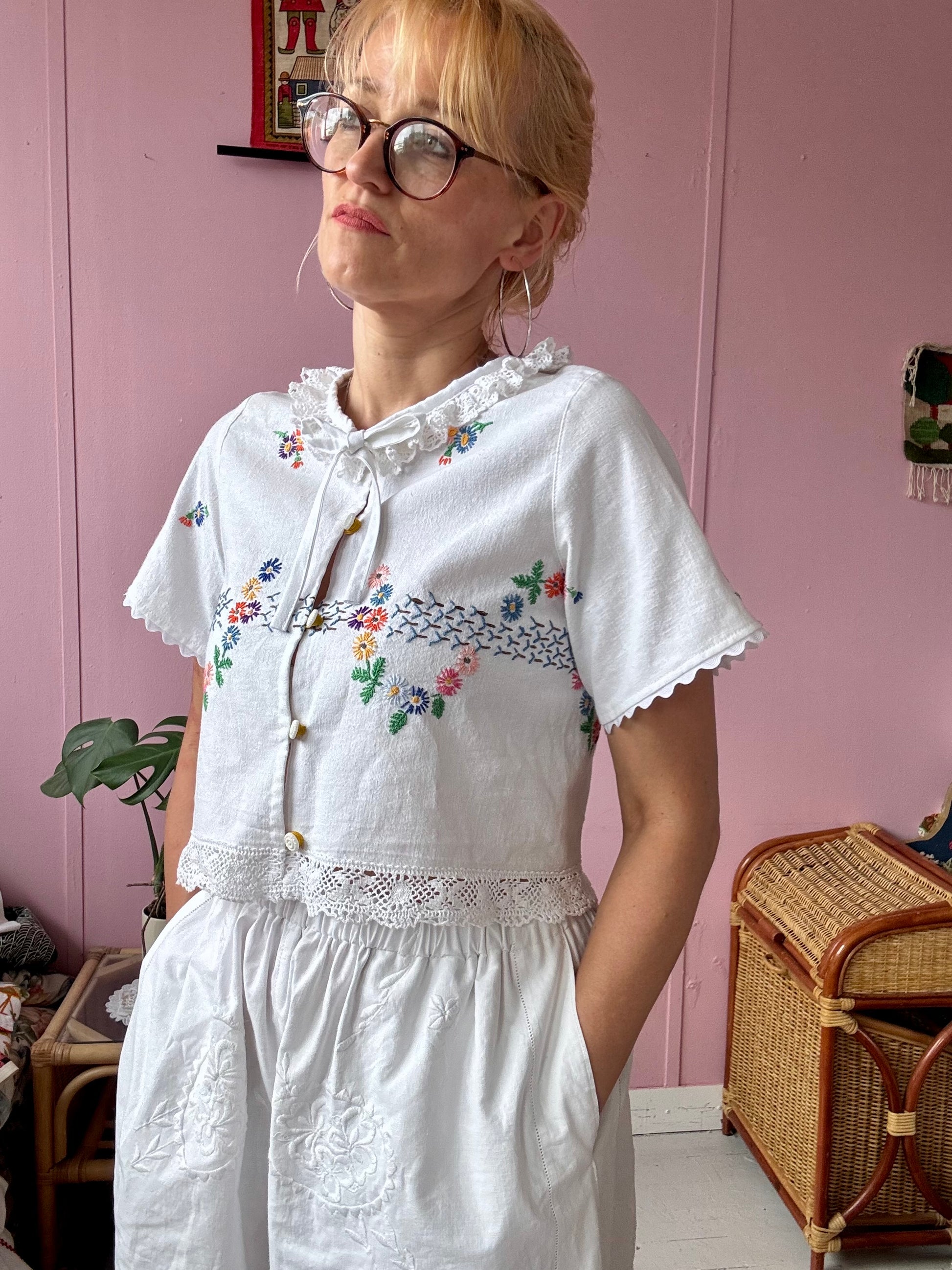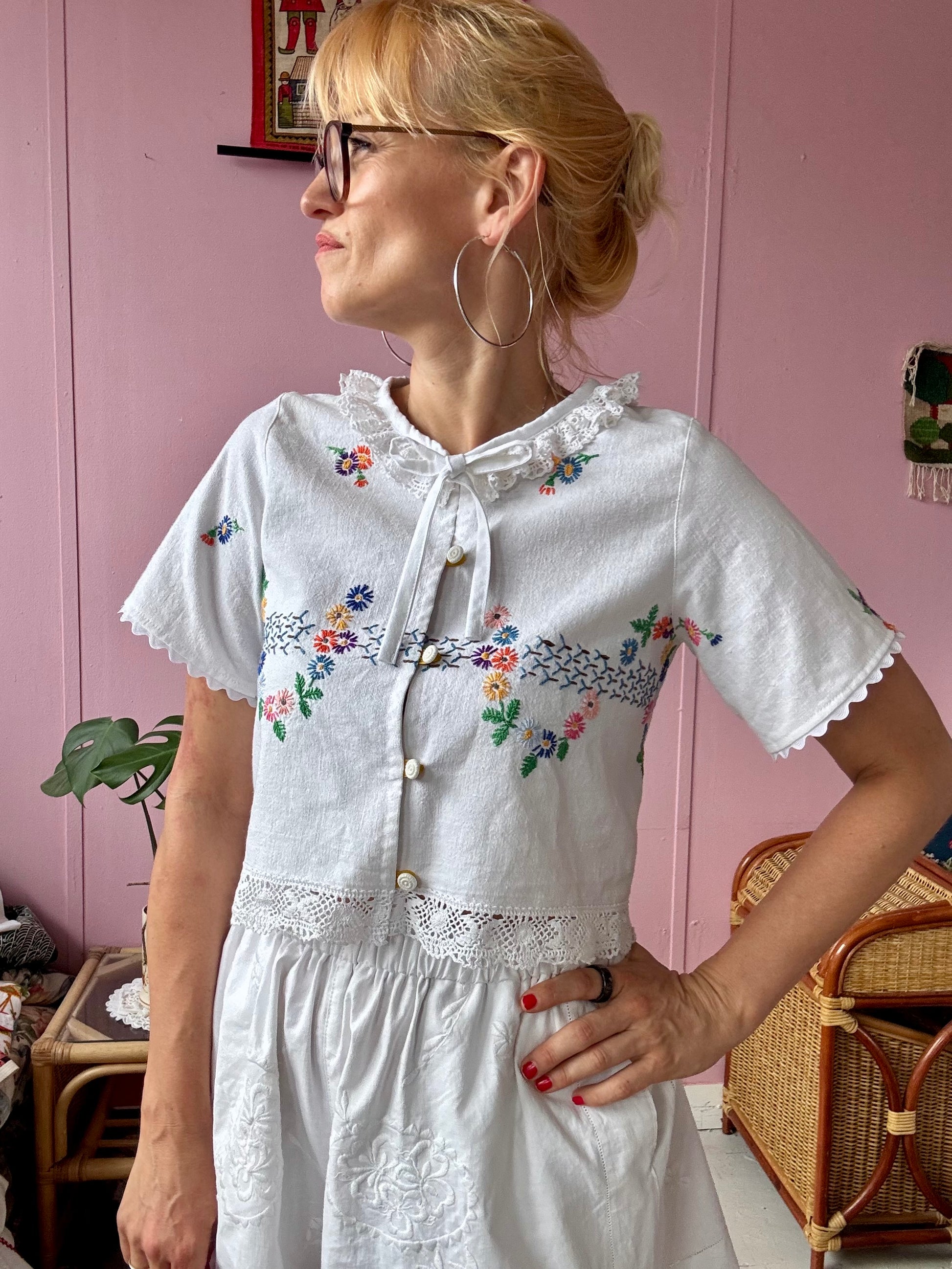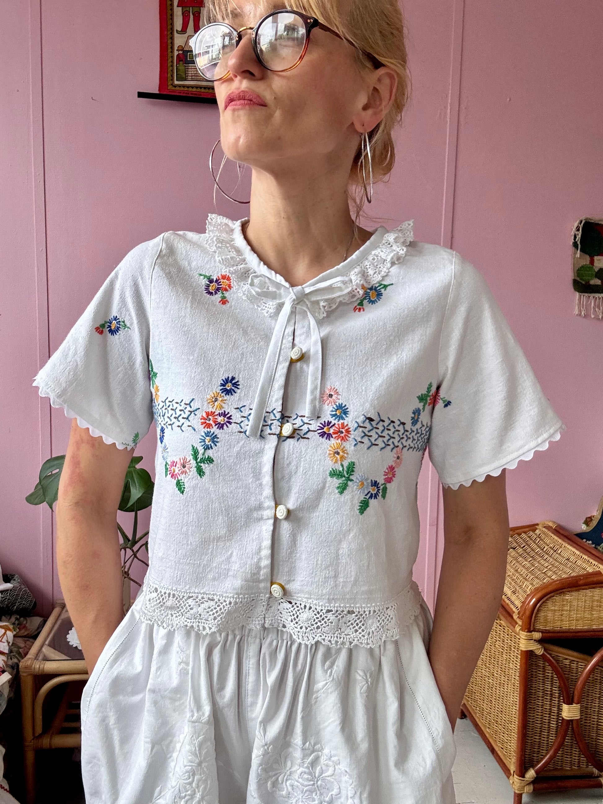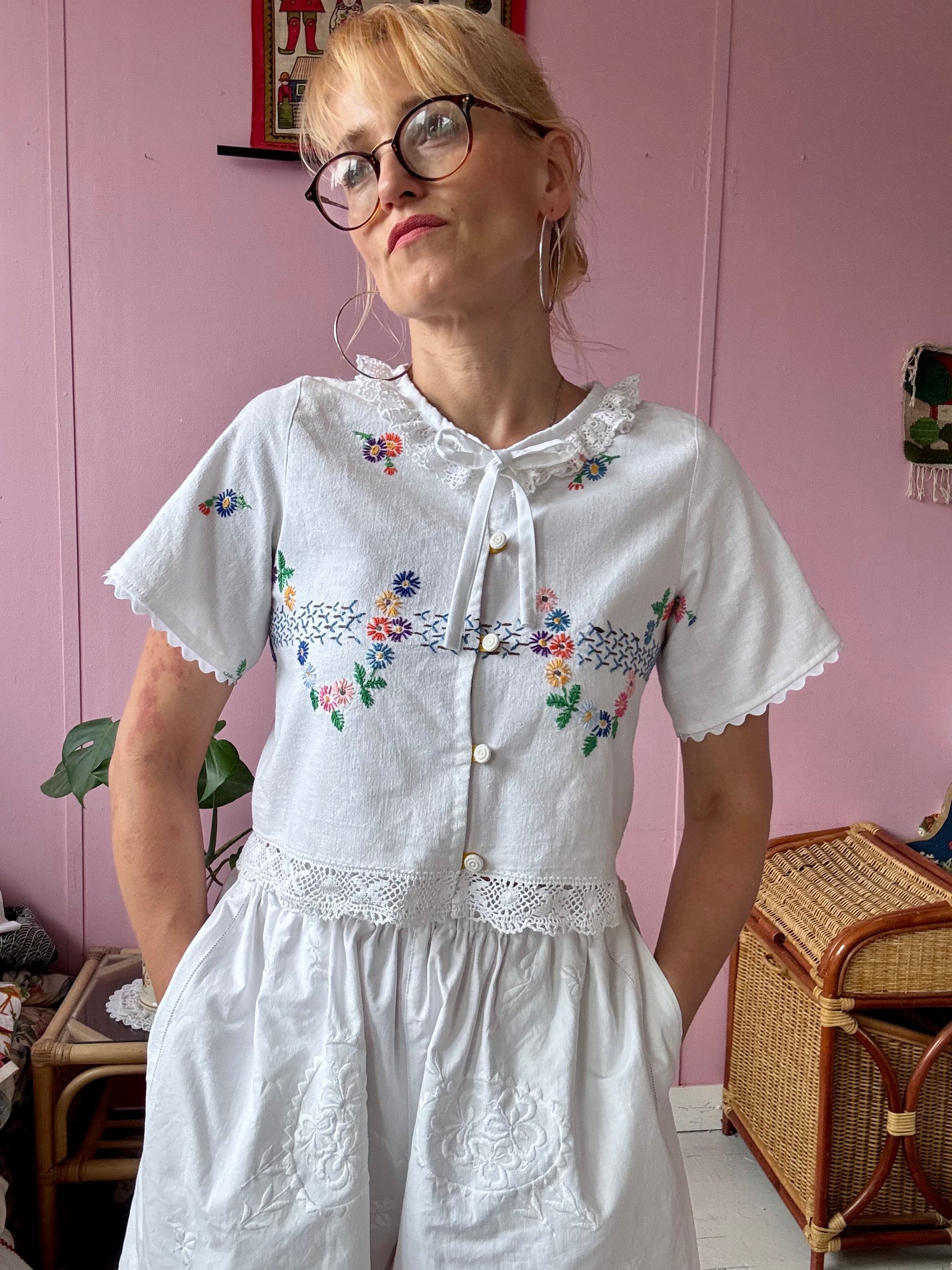 White blouse made from vintage tablecloth with floral hand embroidery -cottton material