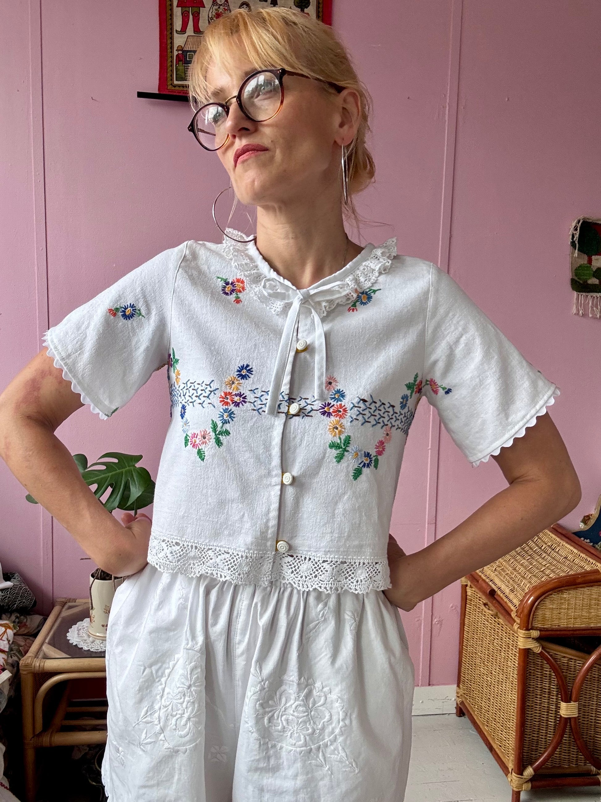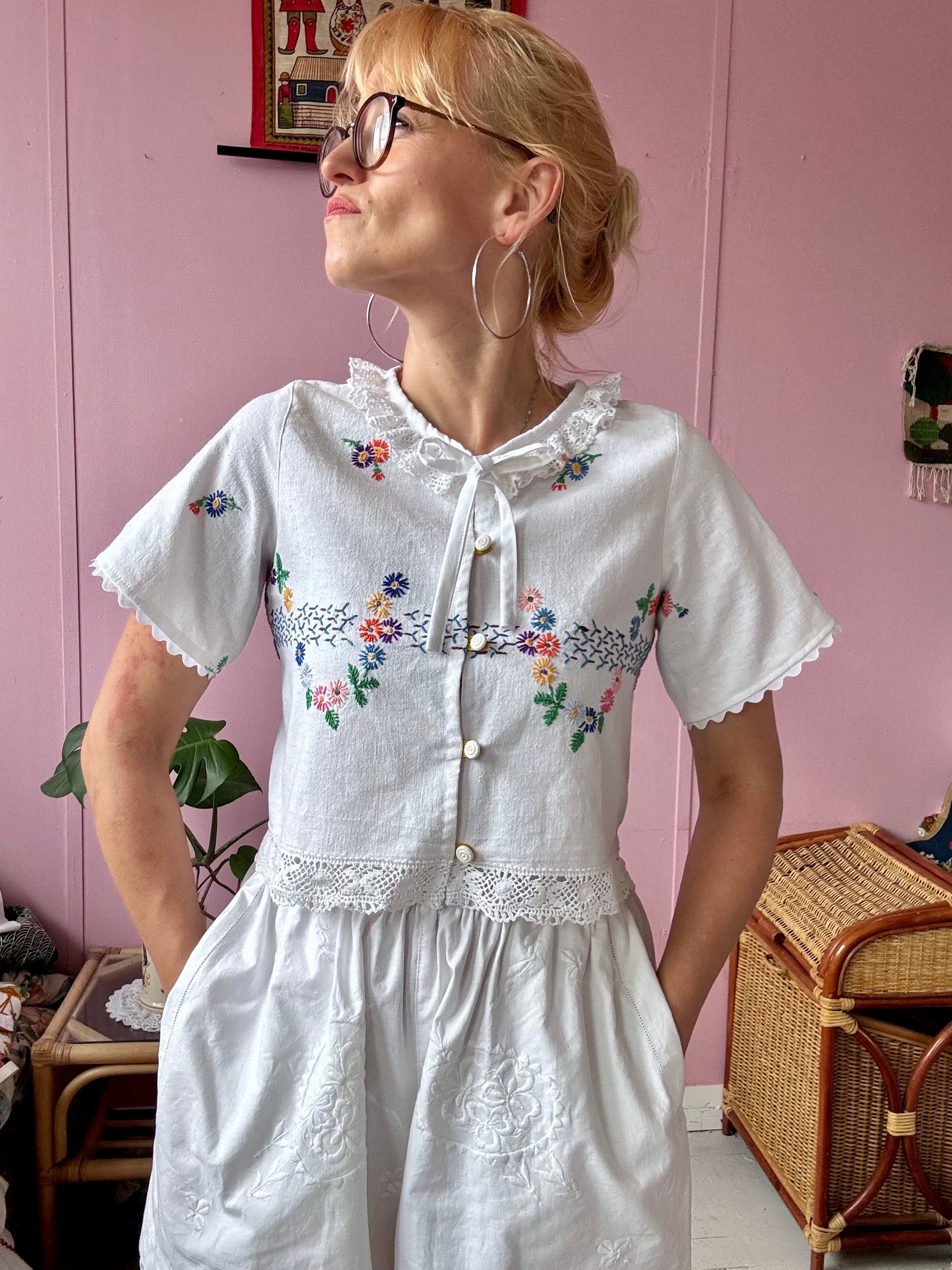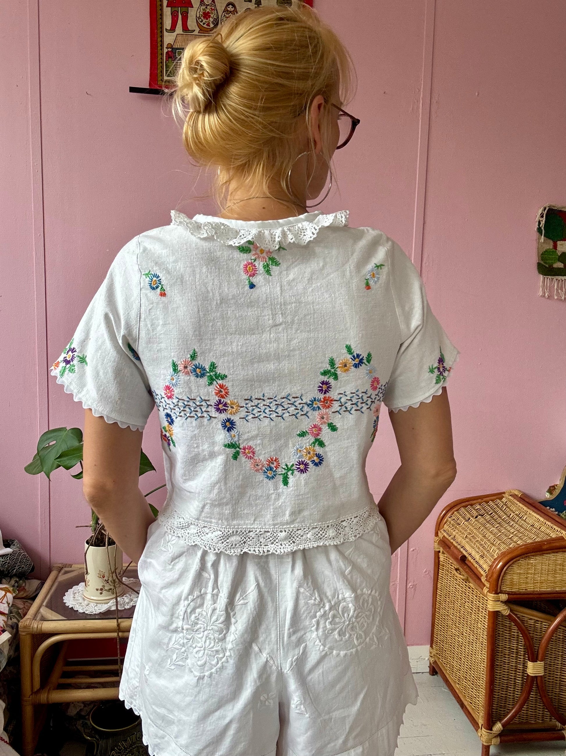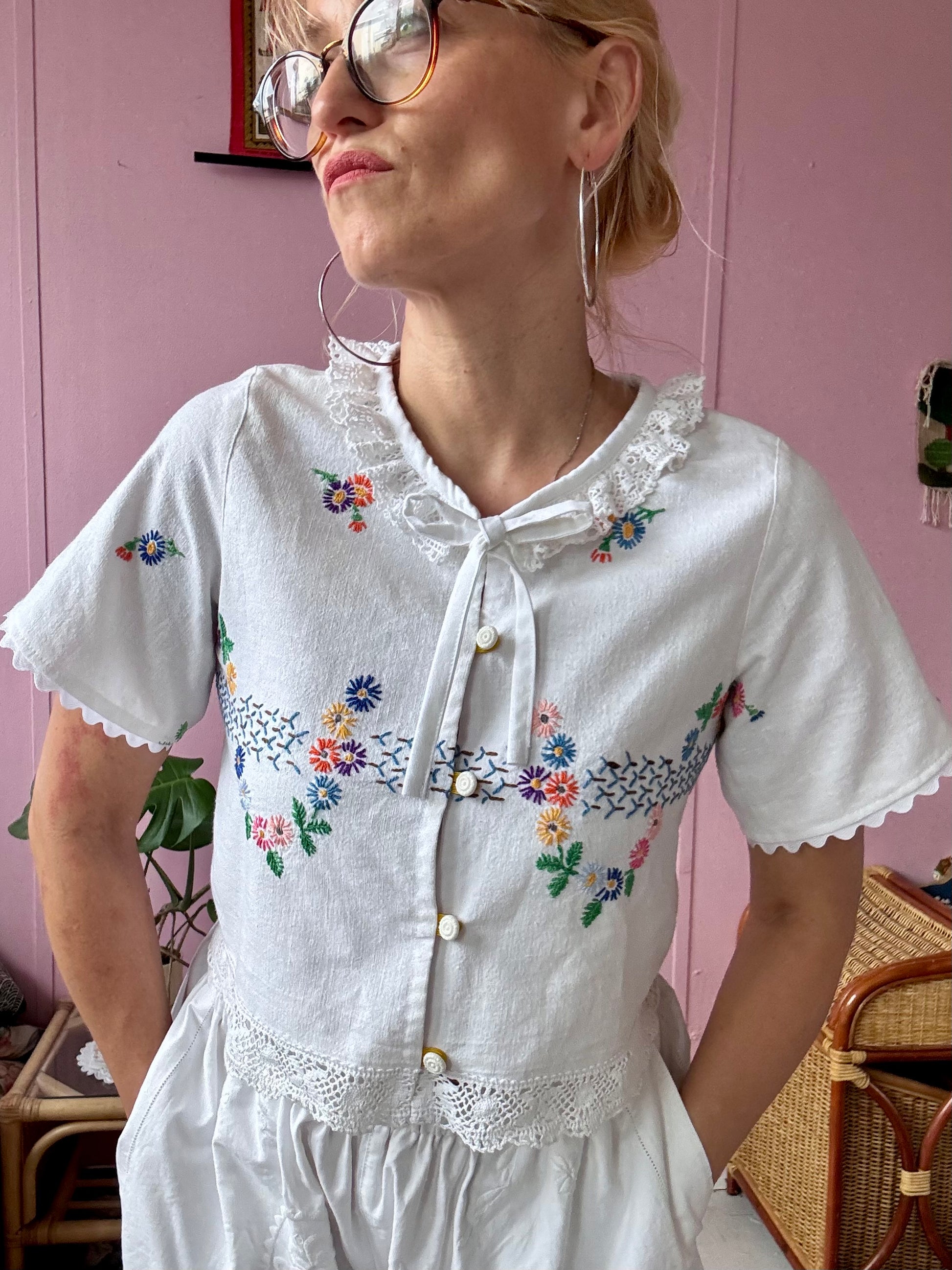 White blouse made from vintage tablecloth with floral hand embroidery -cottton material