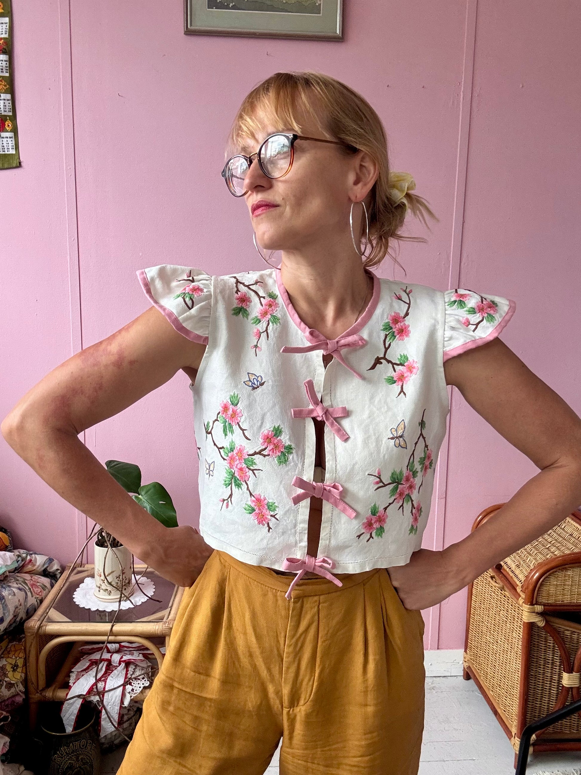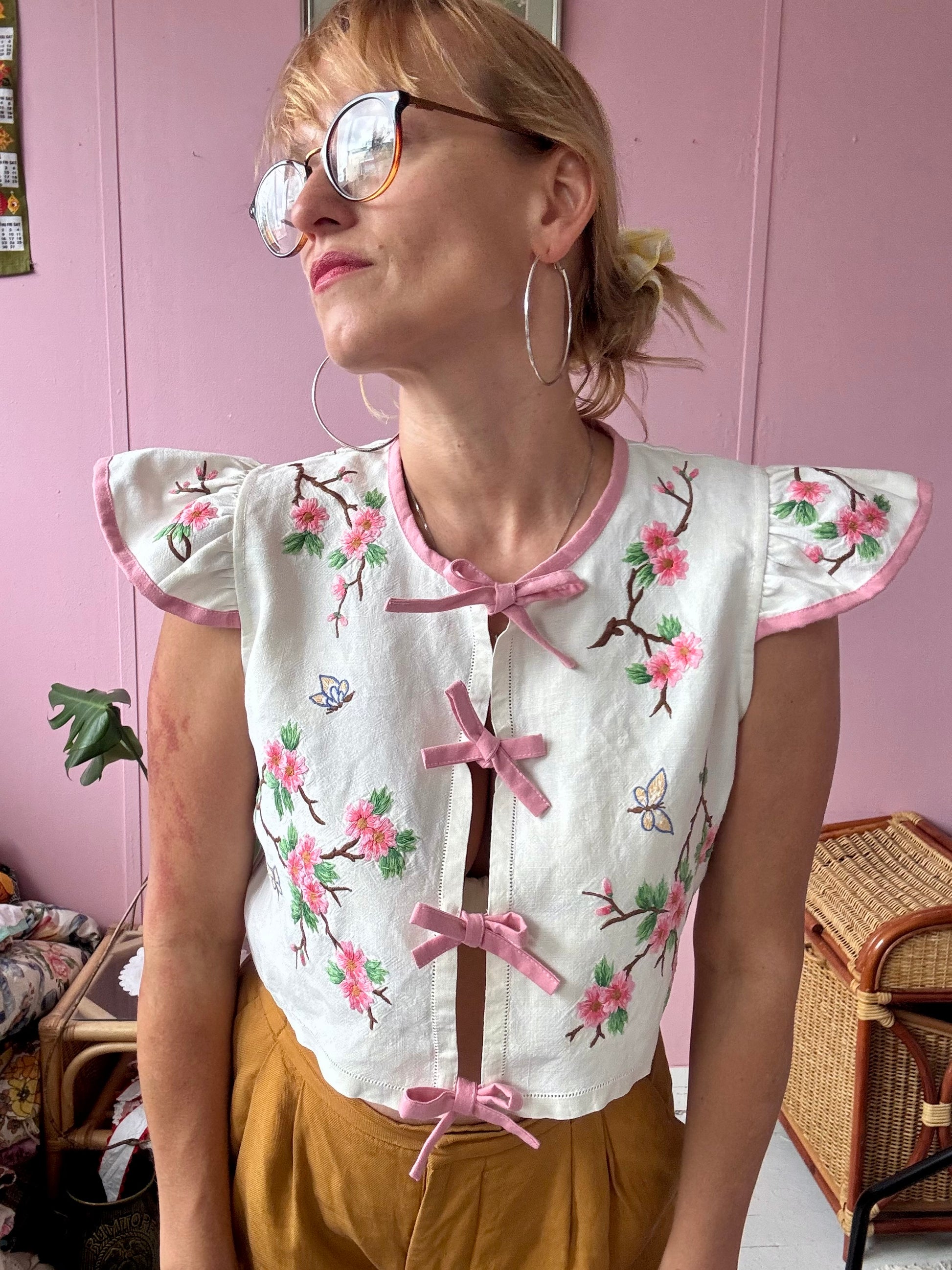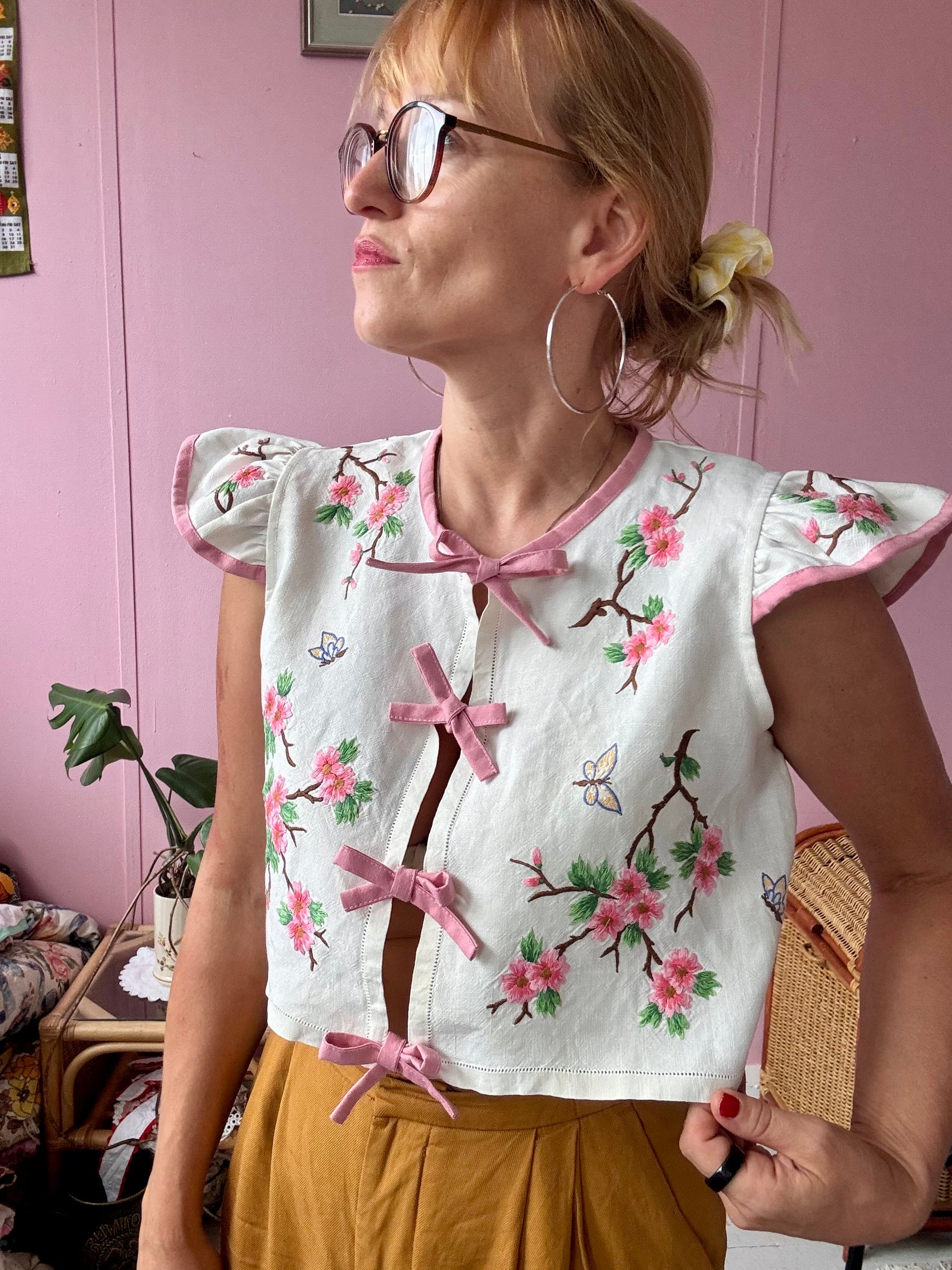 floral blouse made from vintage tablecloth with hand embroidery -beautiful details