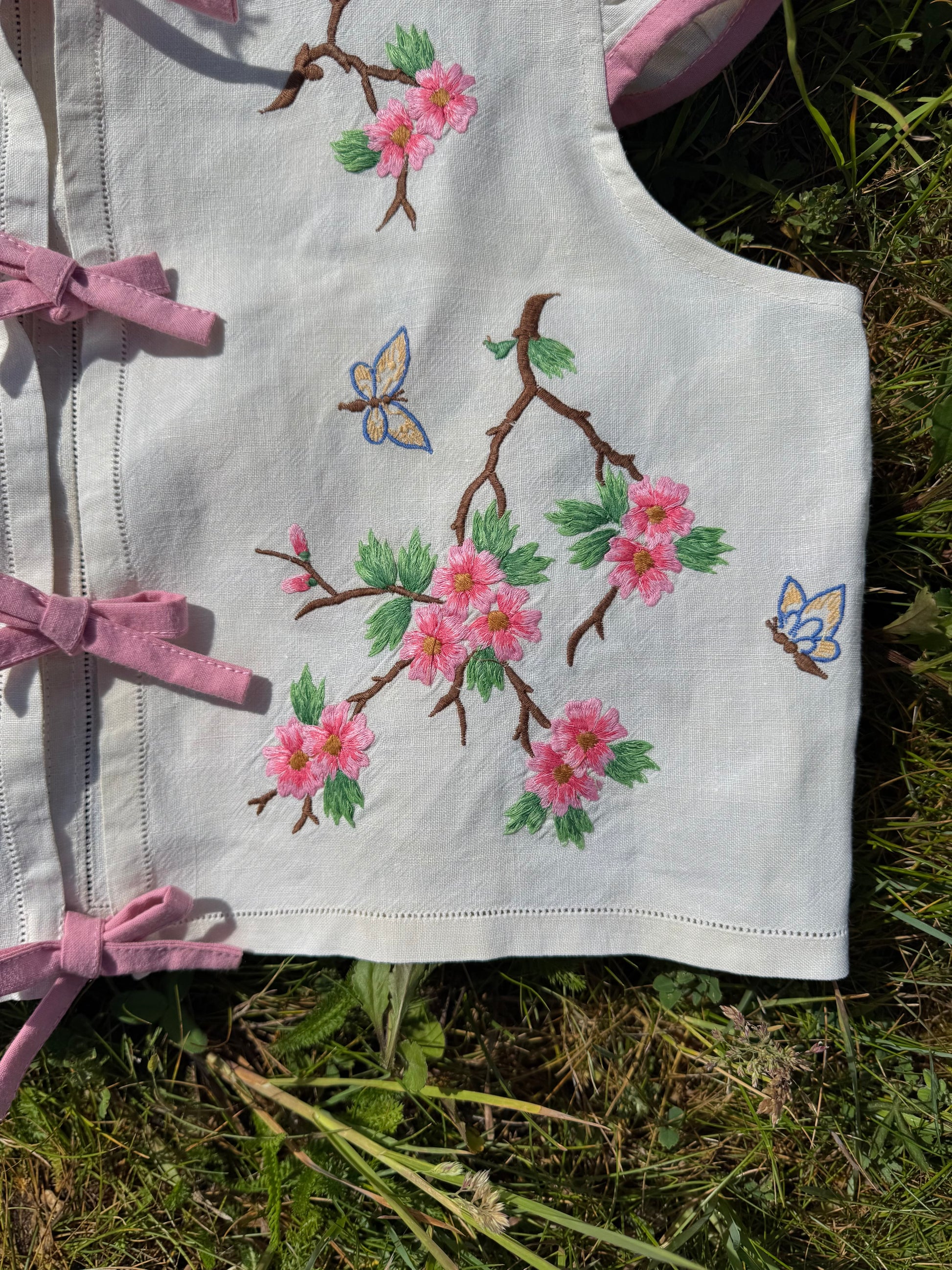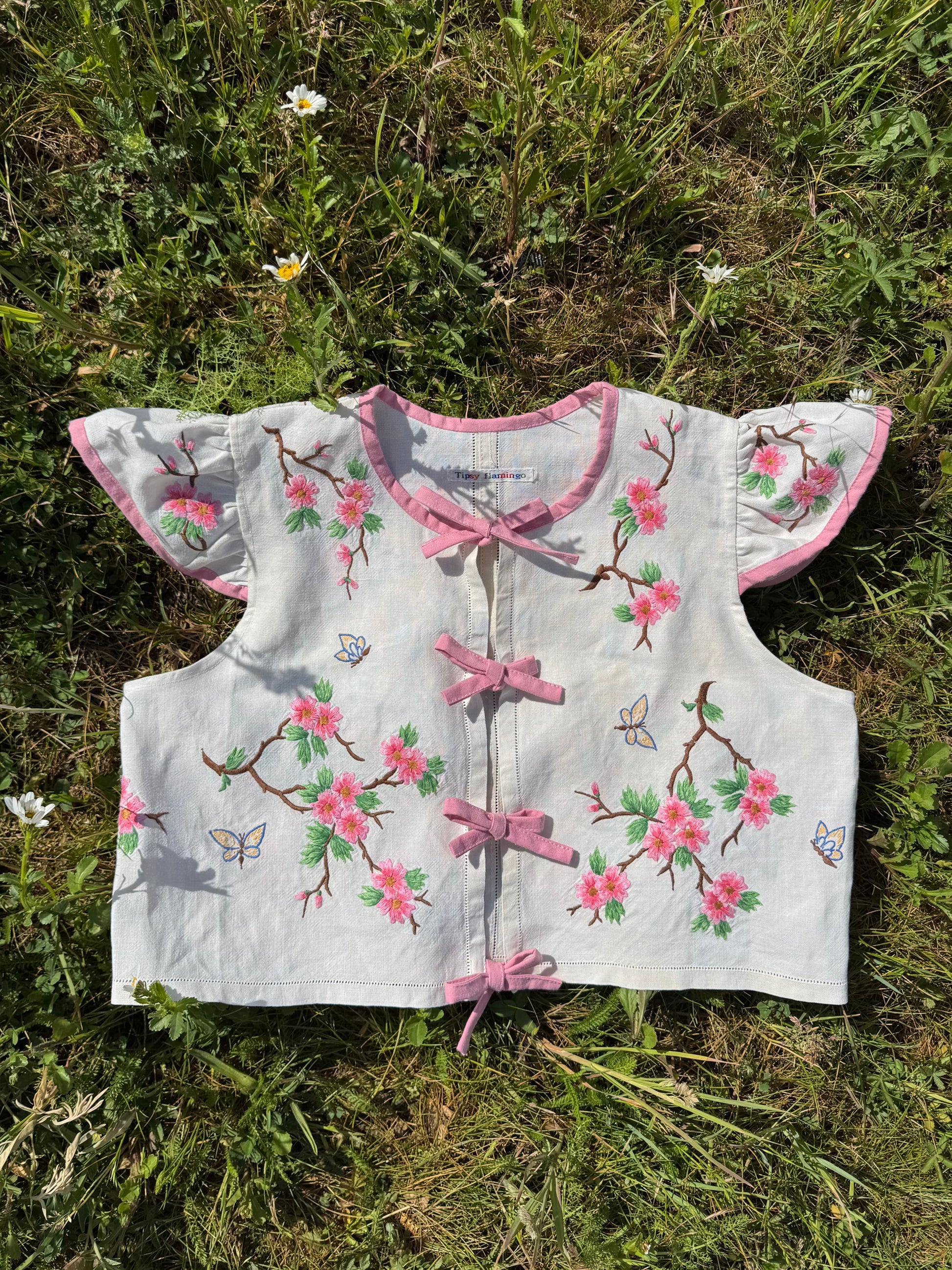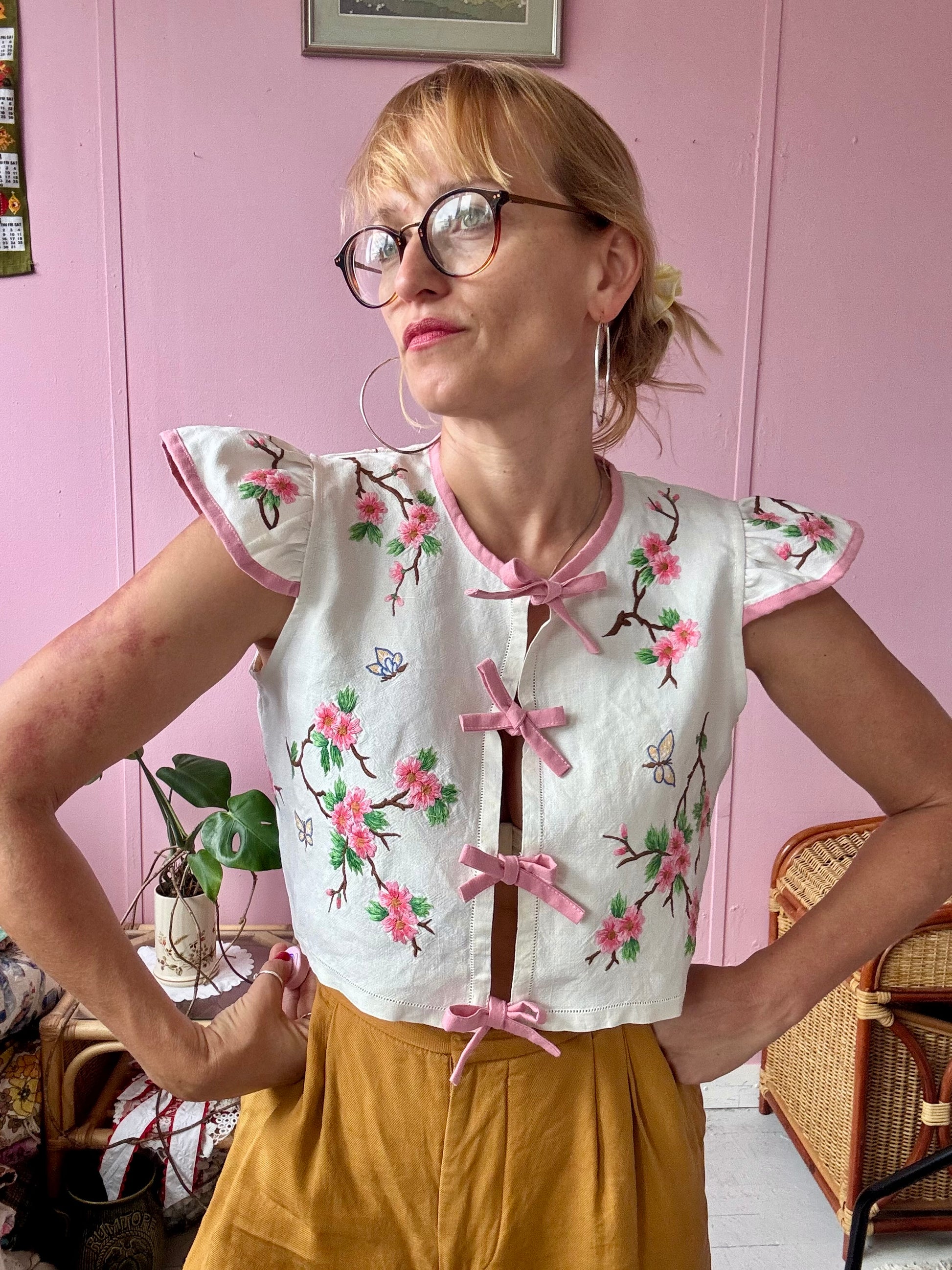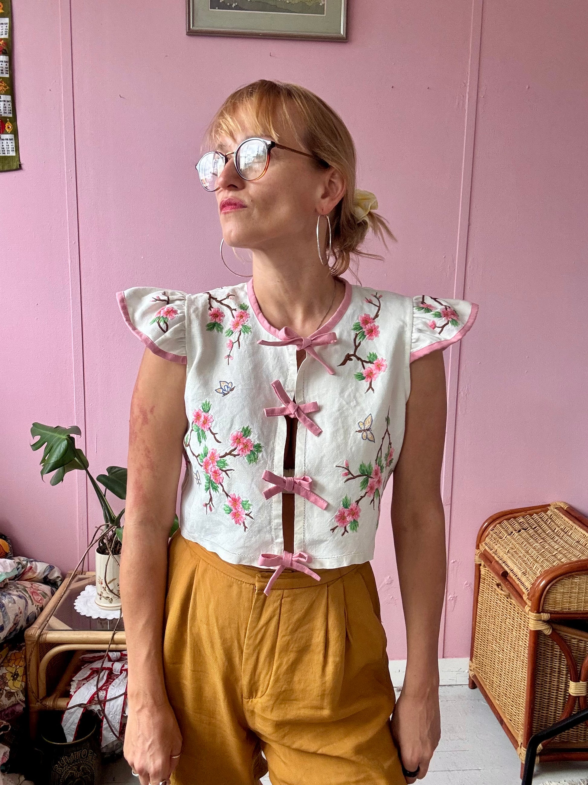 floral blouse made from vintage tablecloth with hand embroidery -beautiful details