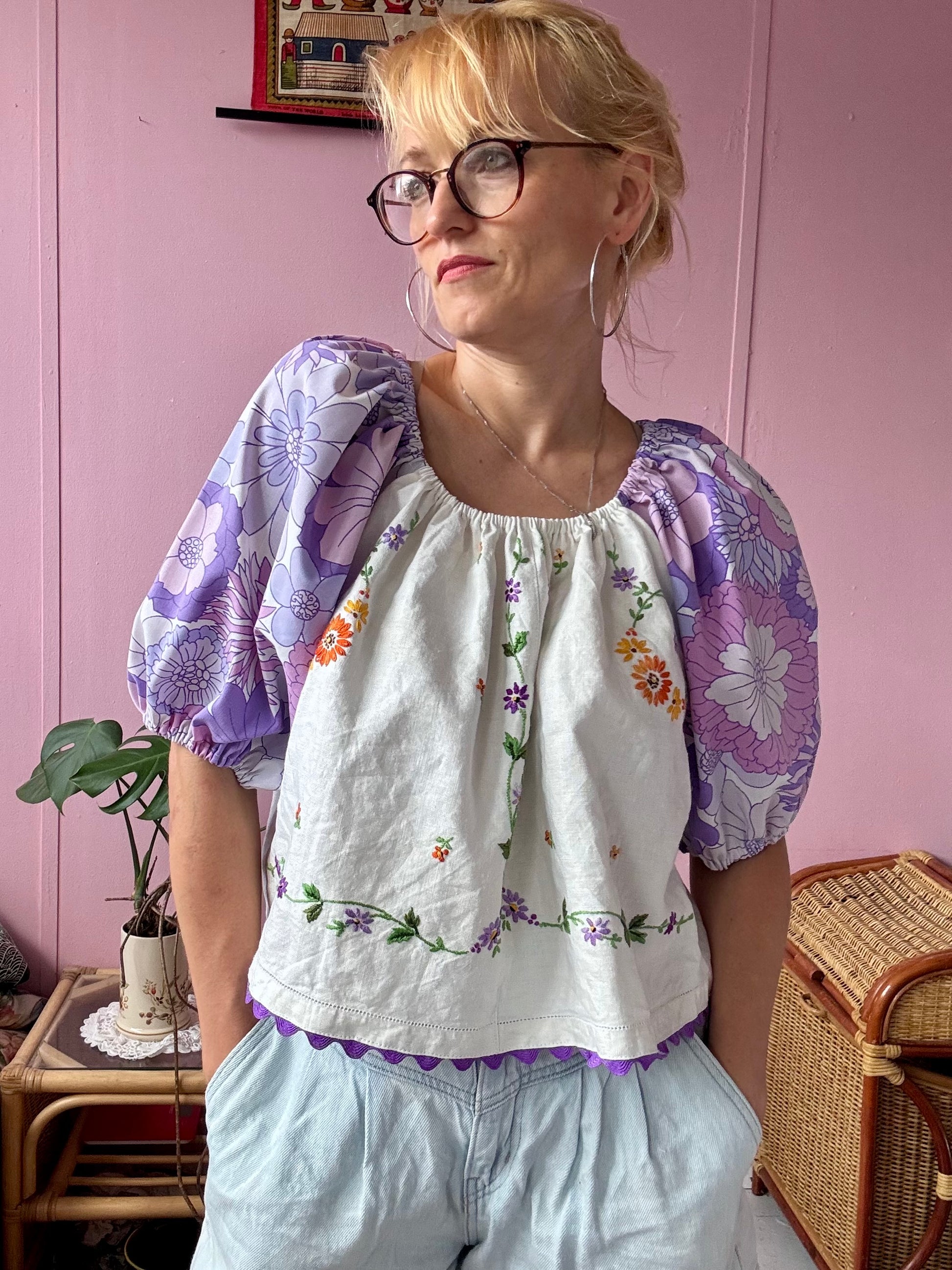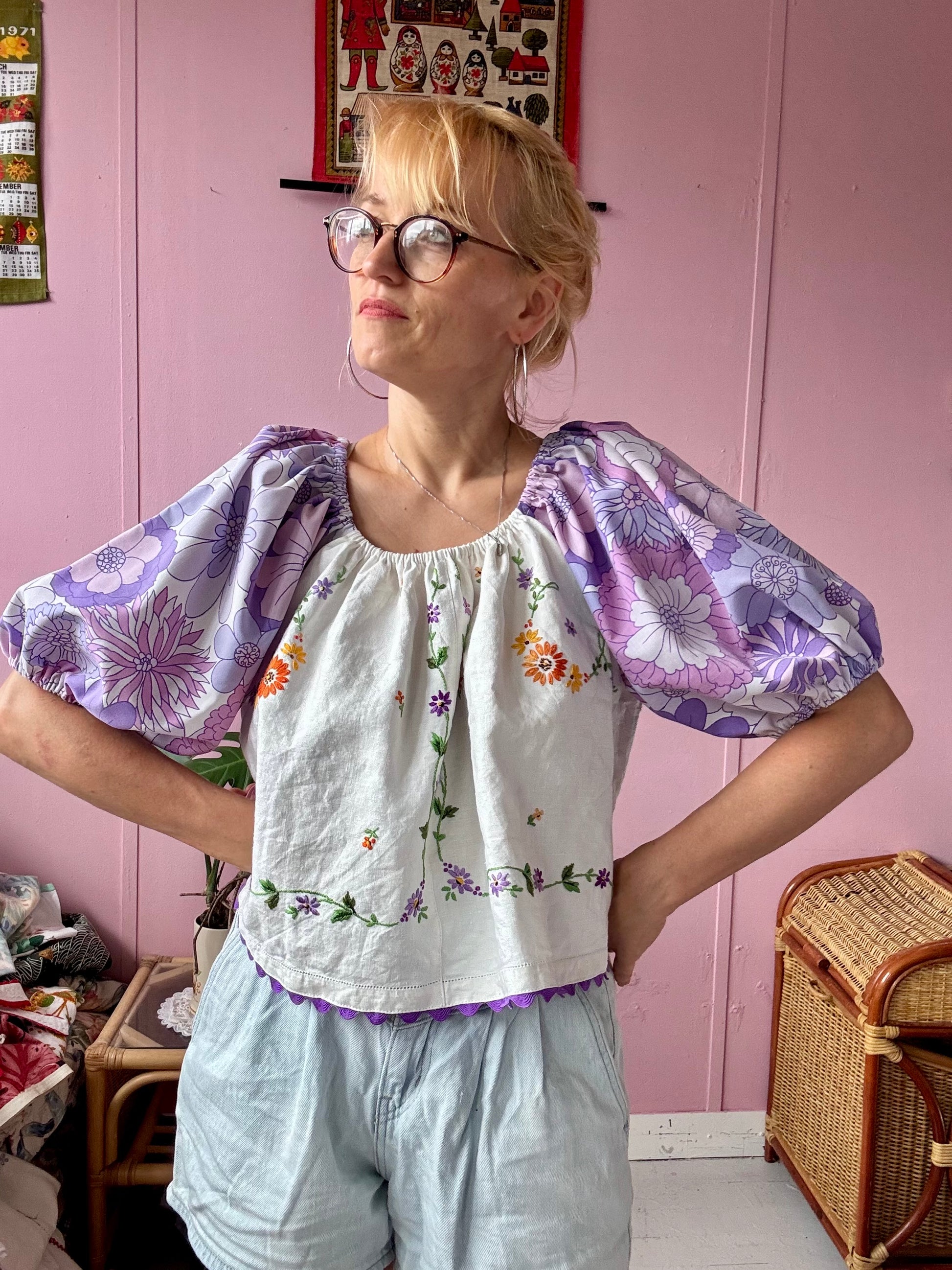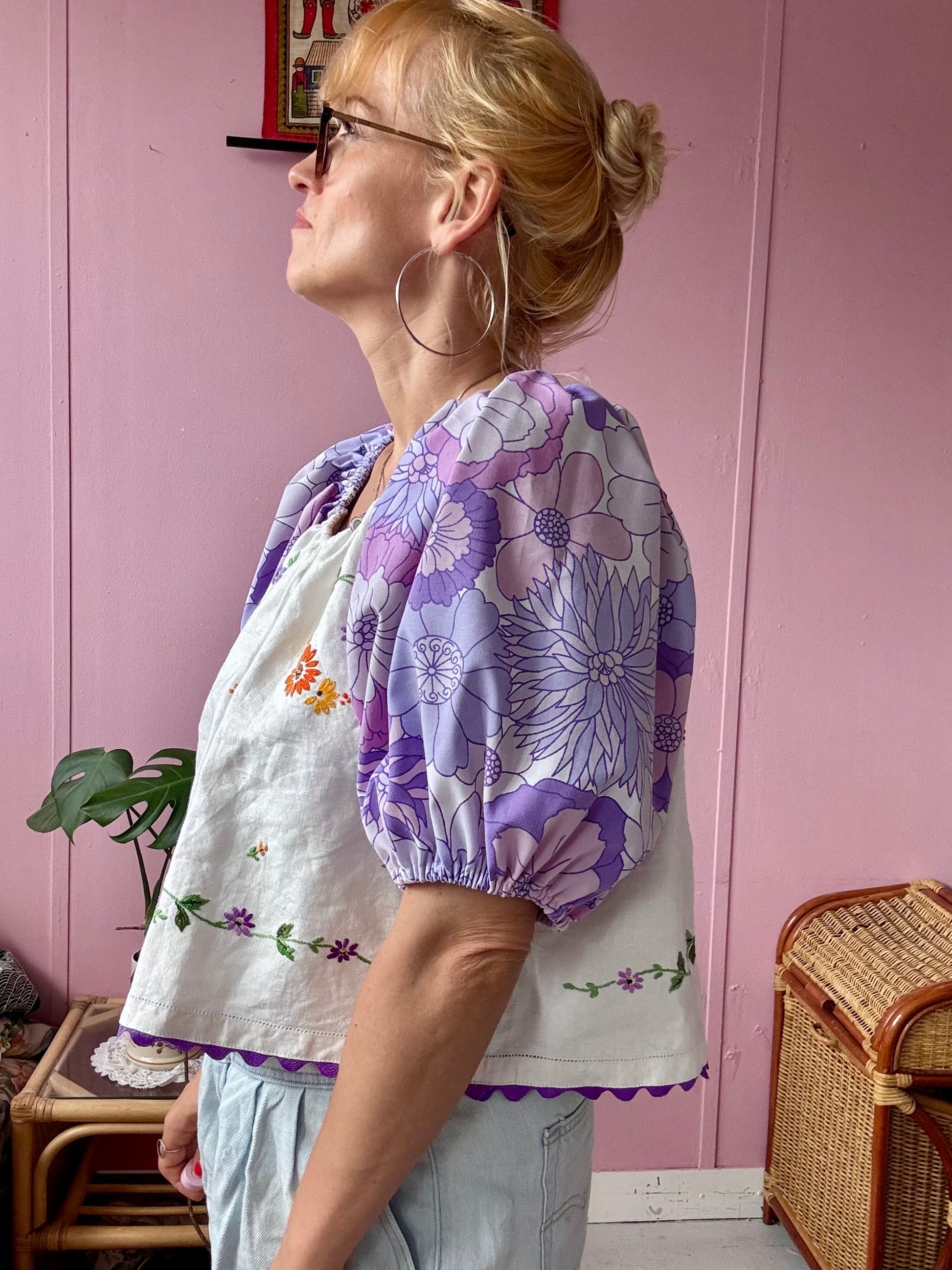 Floral blouse made from vintage tablecloth with floral hand embroidery and floral print vintage fabric