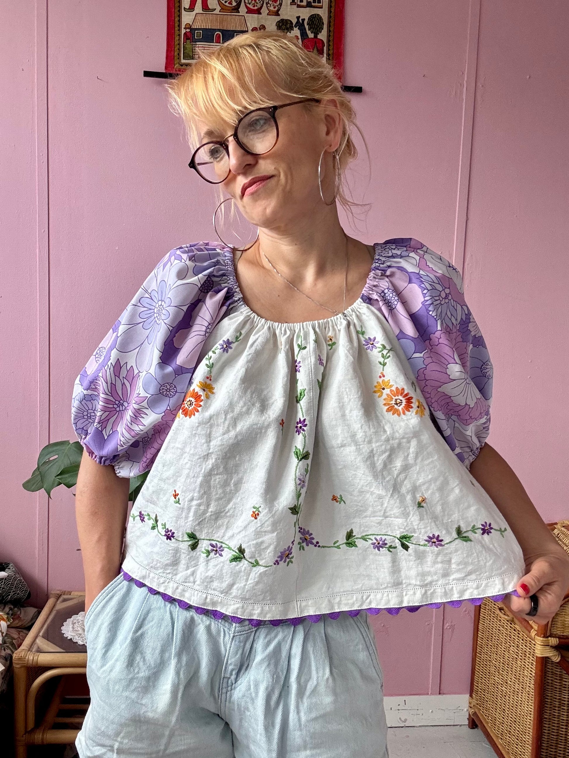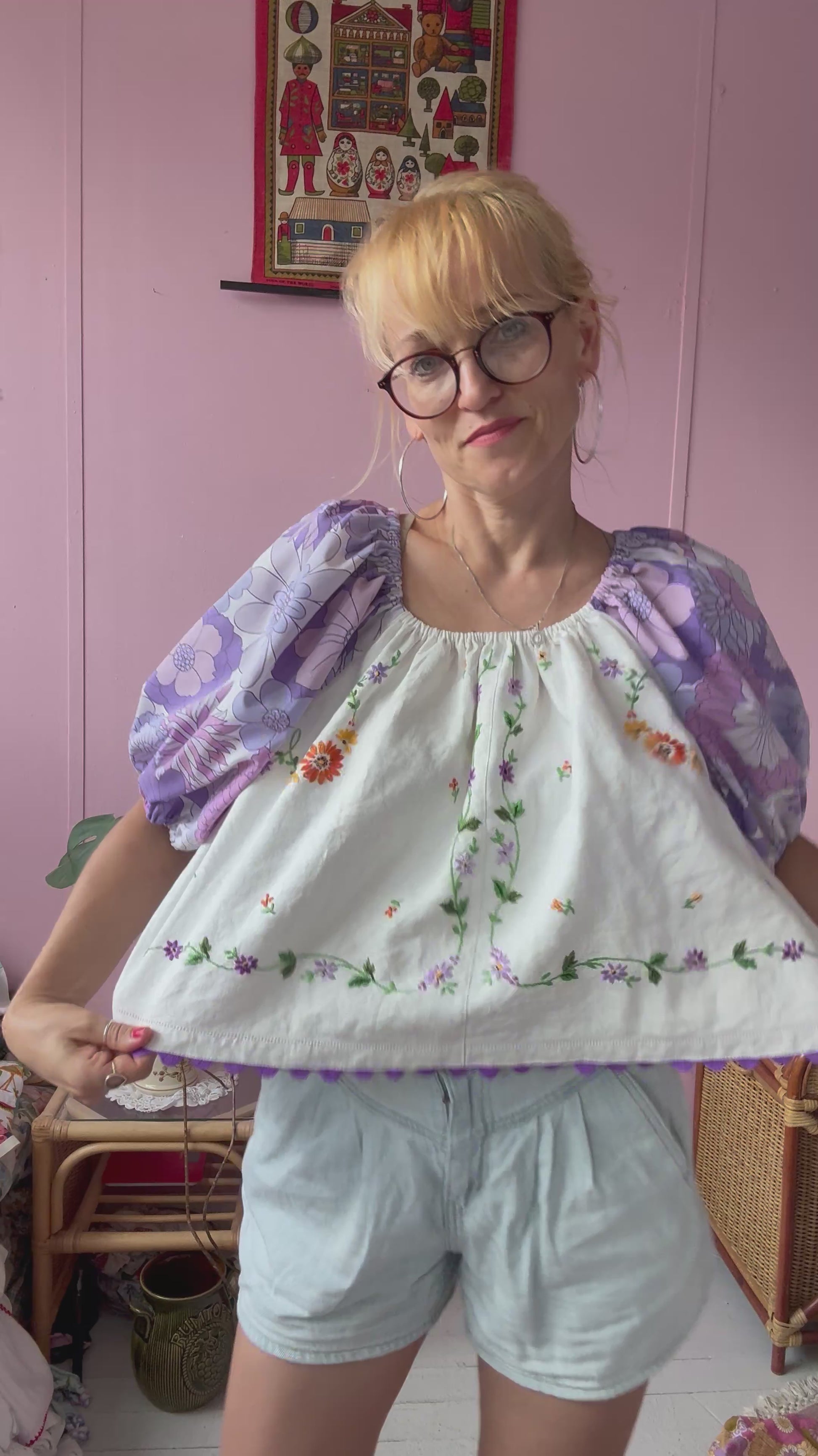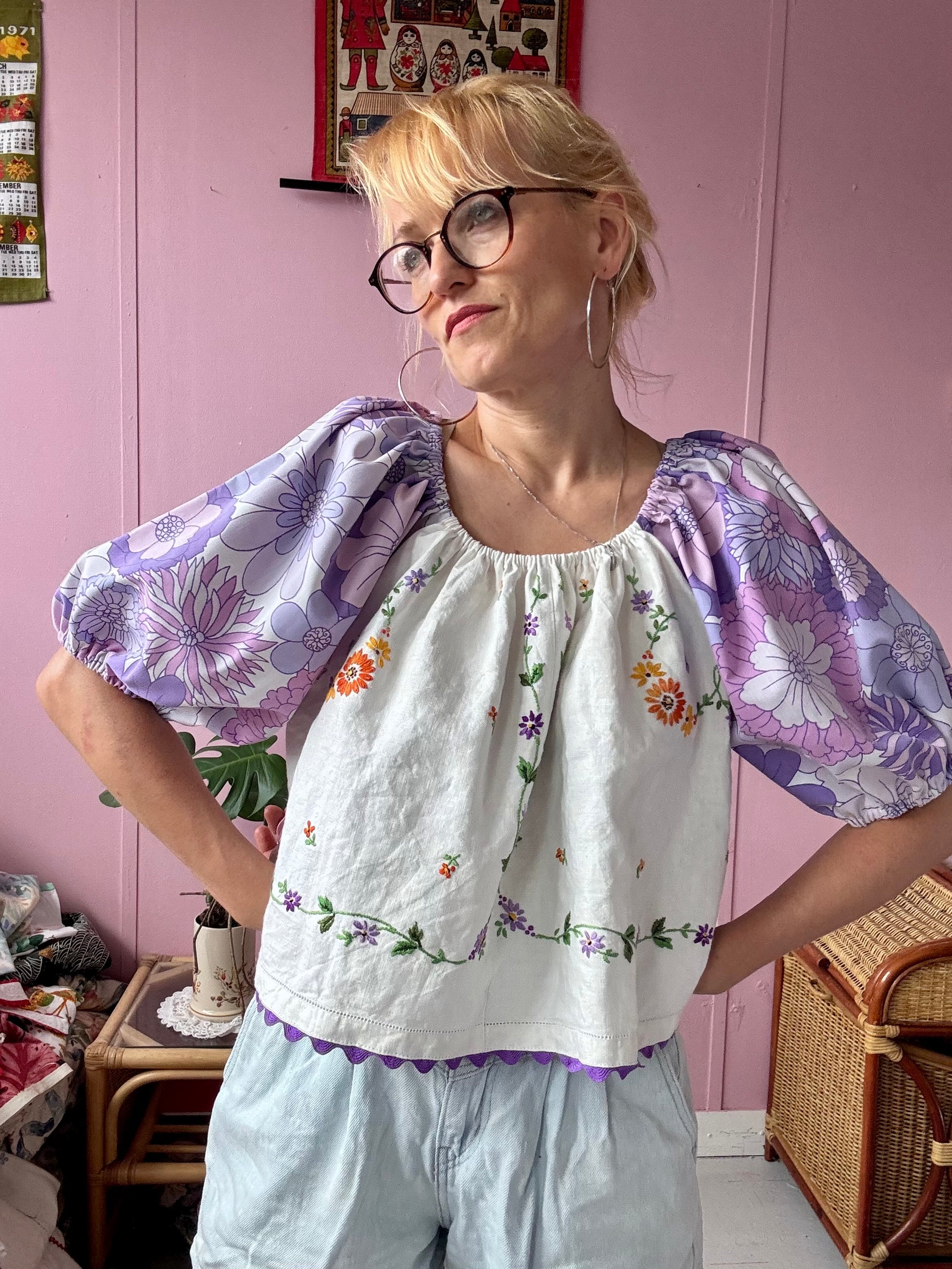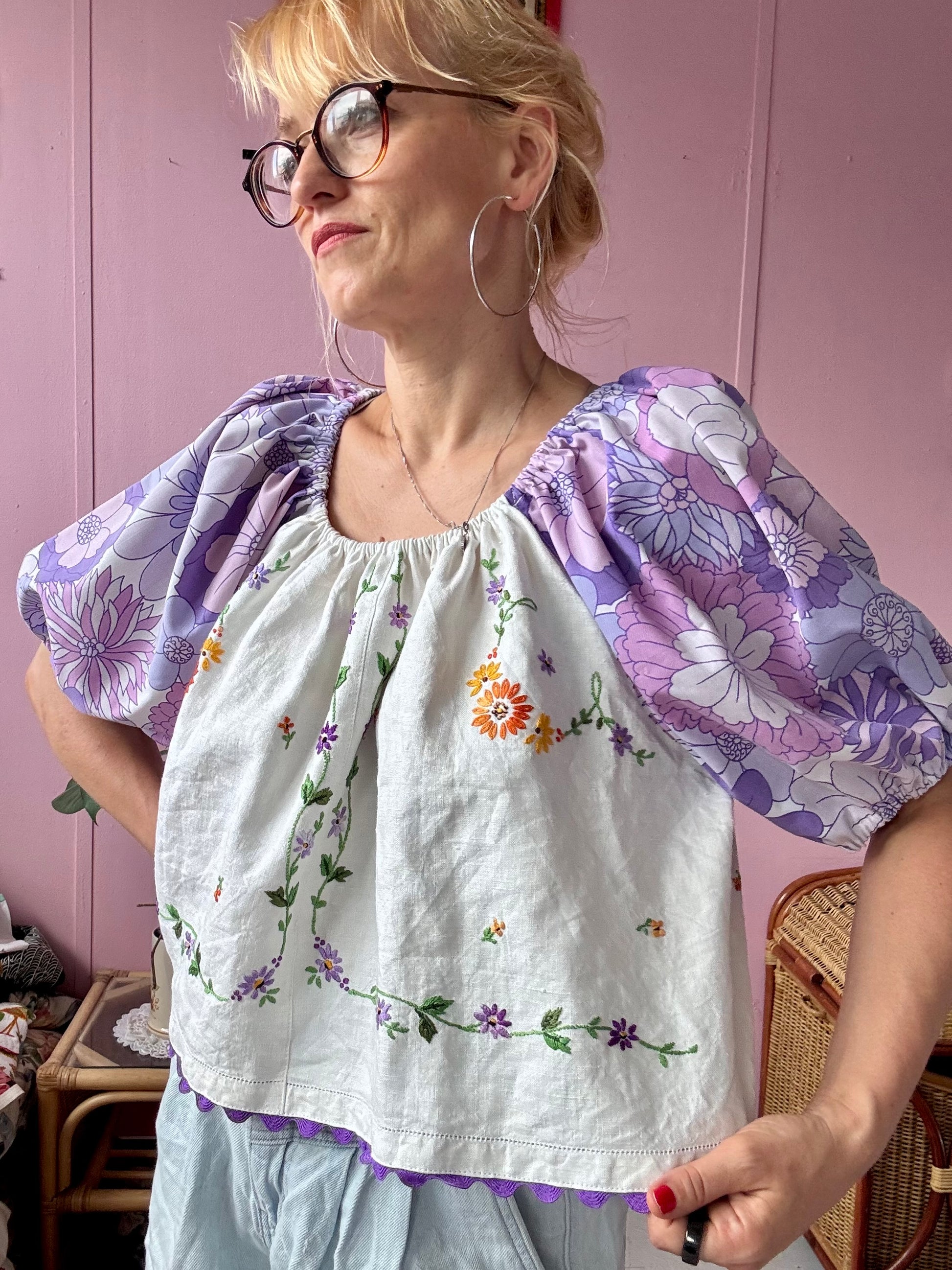Floral blouse made from vintage tablecloth with floral hand embroidery and floral print vintage fabric