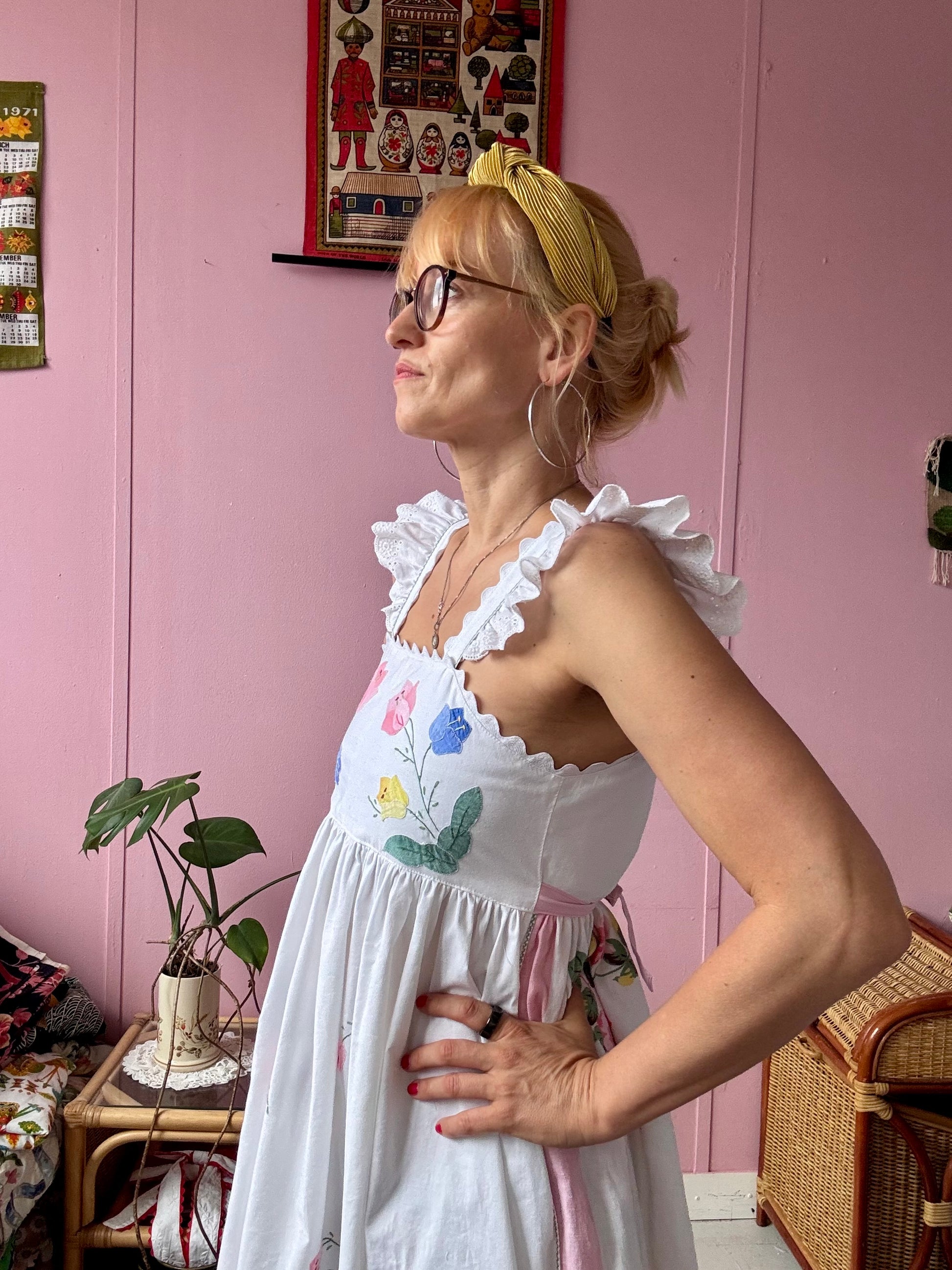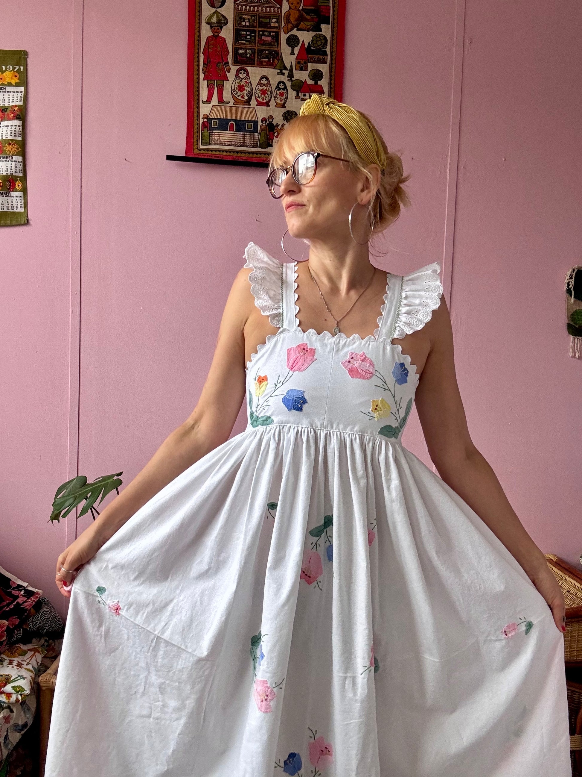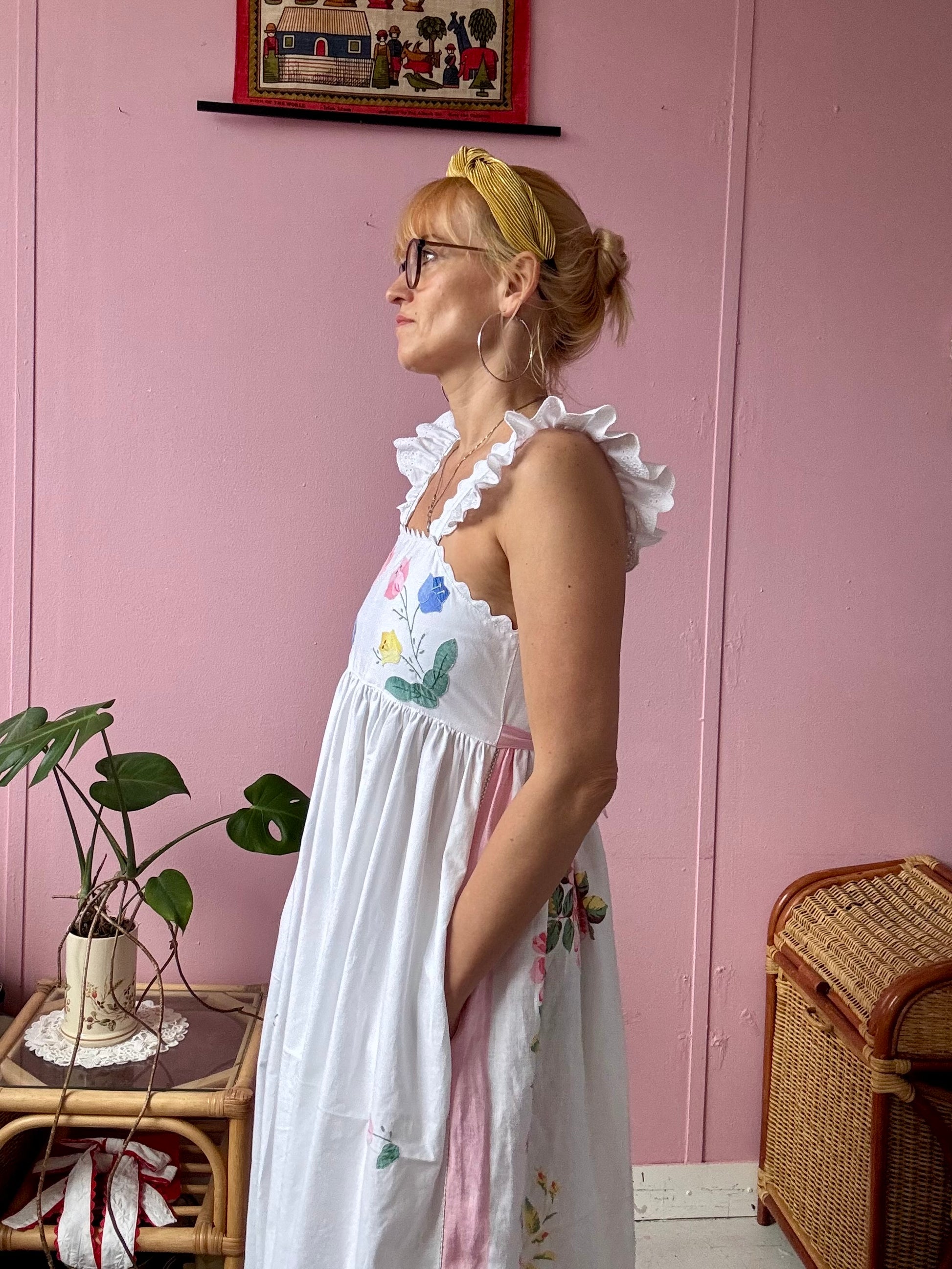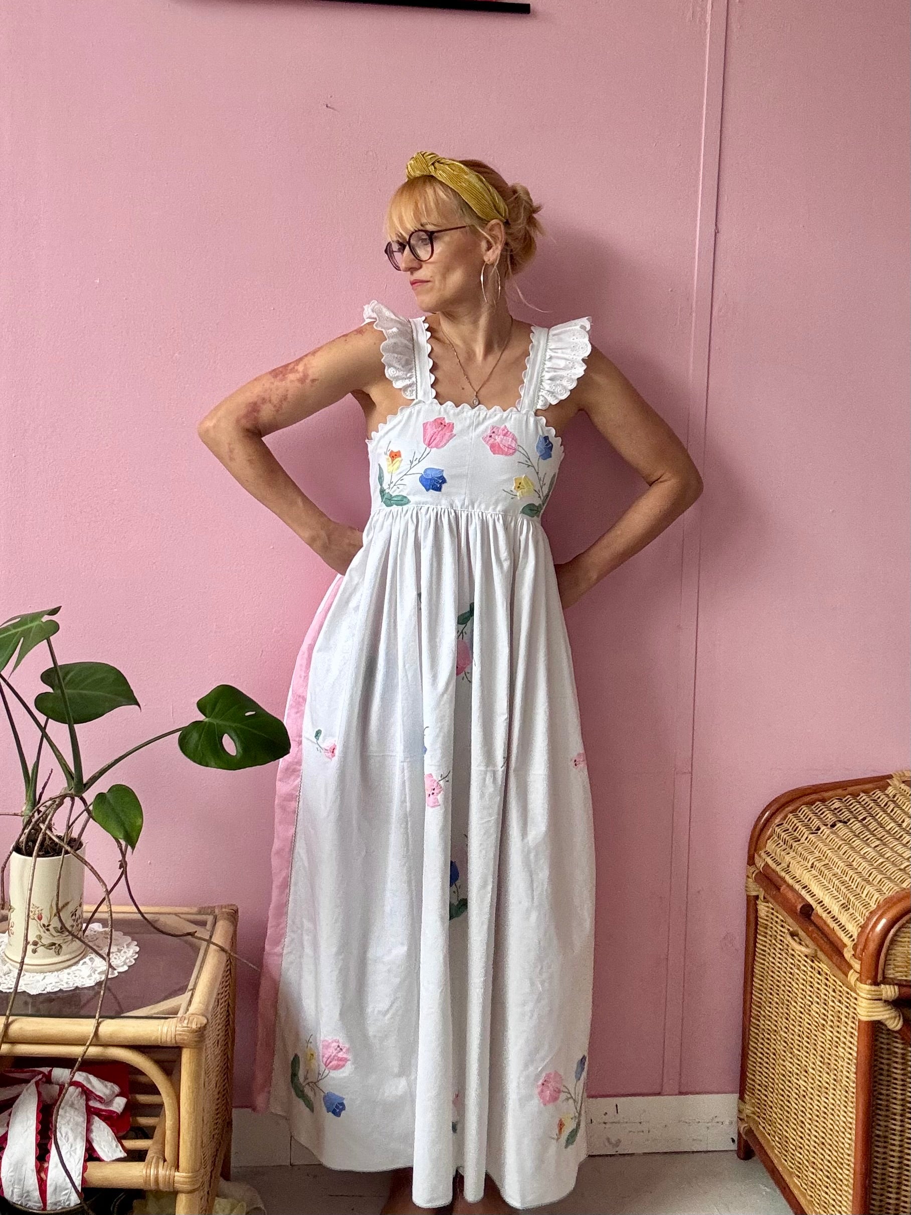 White cotton maxi dress made from 2 vintage tablecloths with floral appliqués and floral print