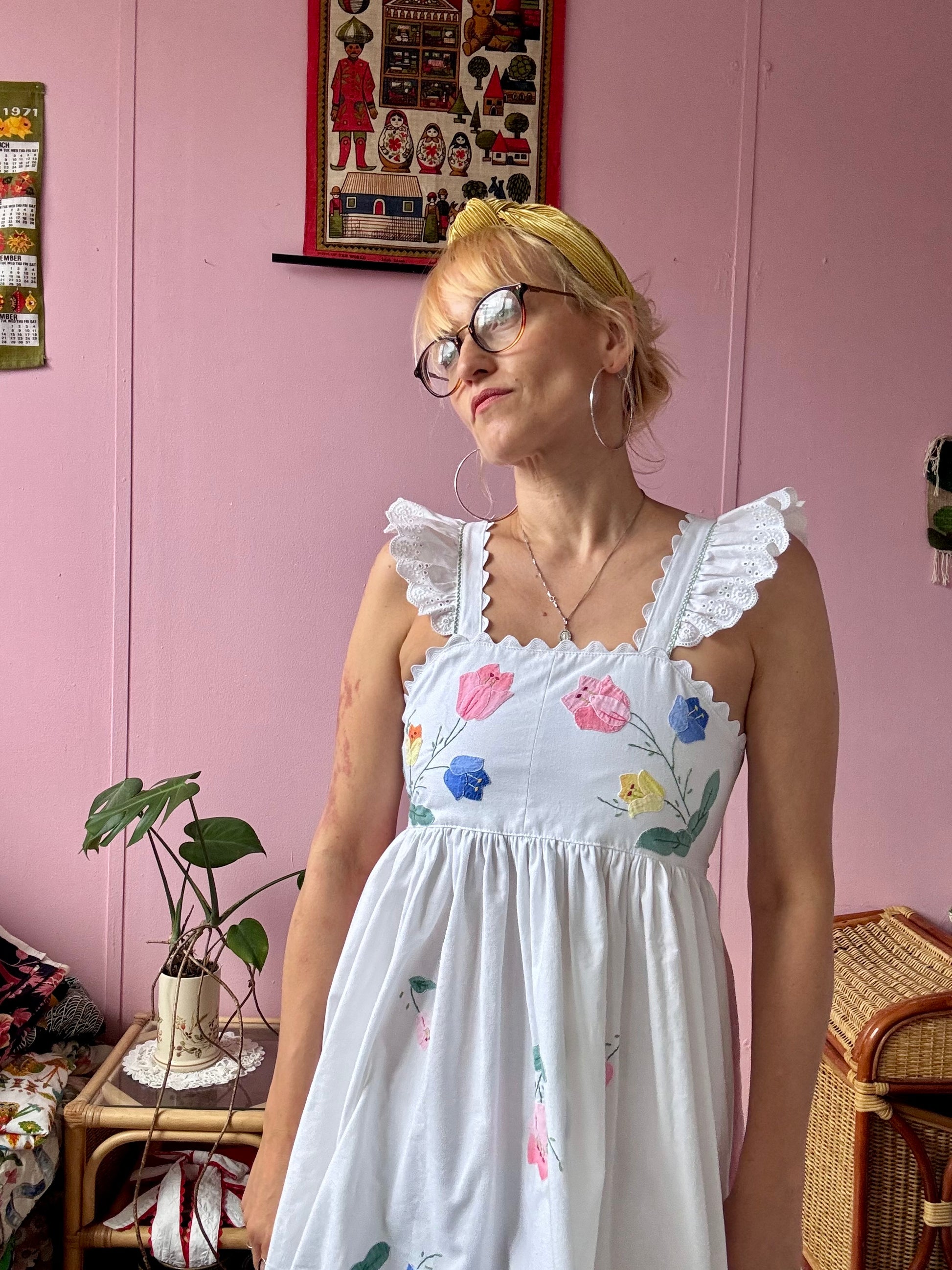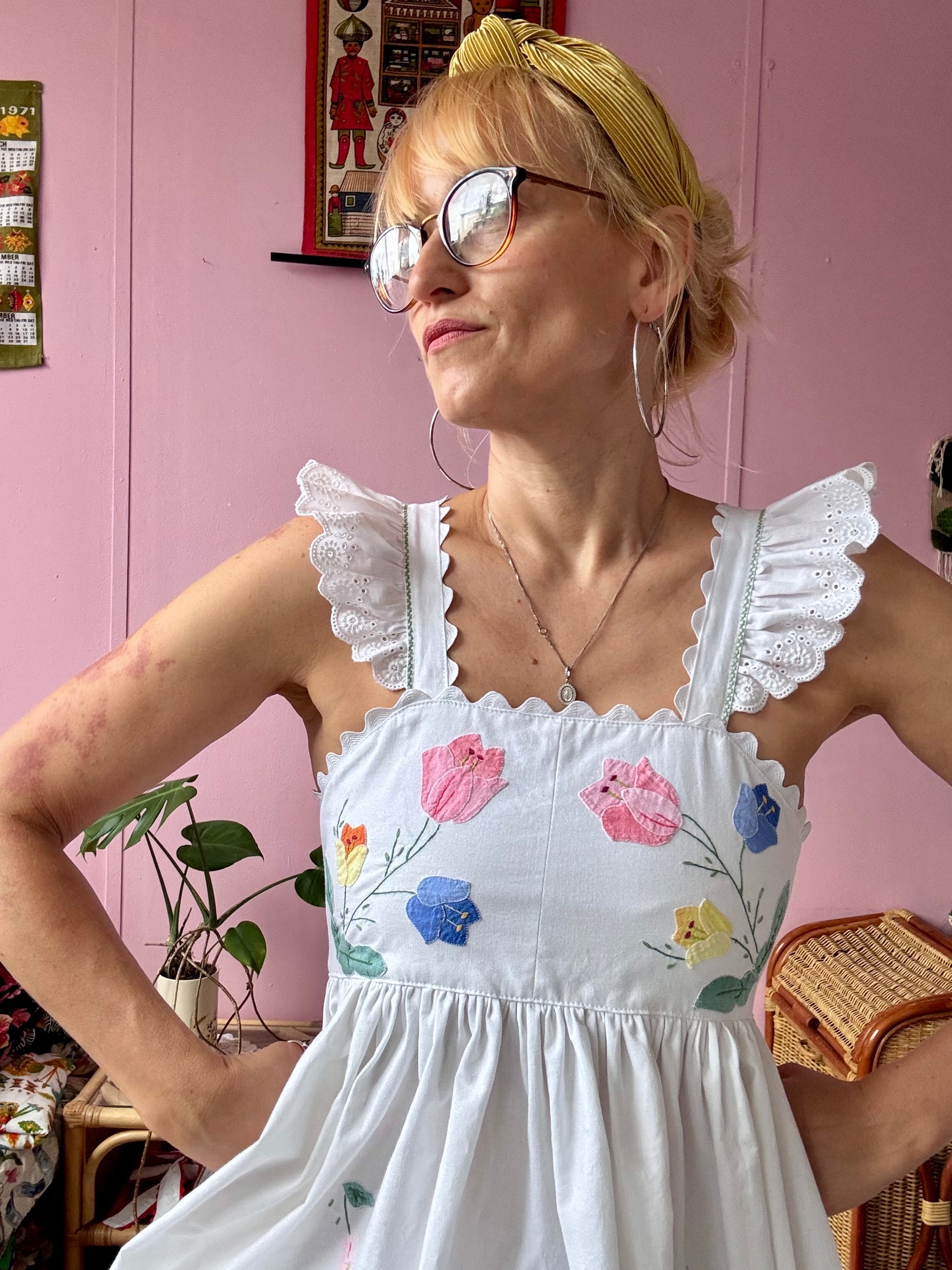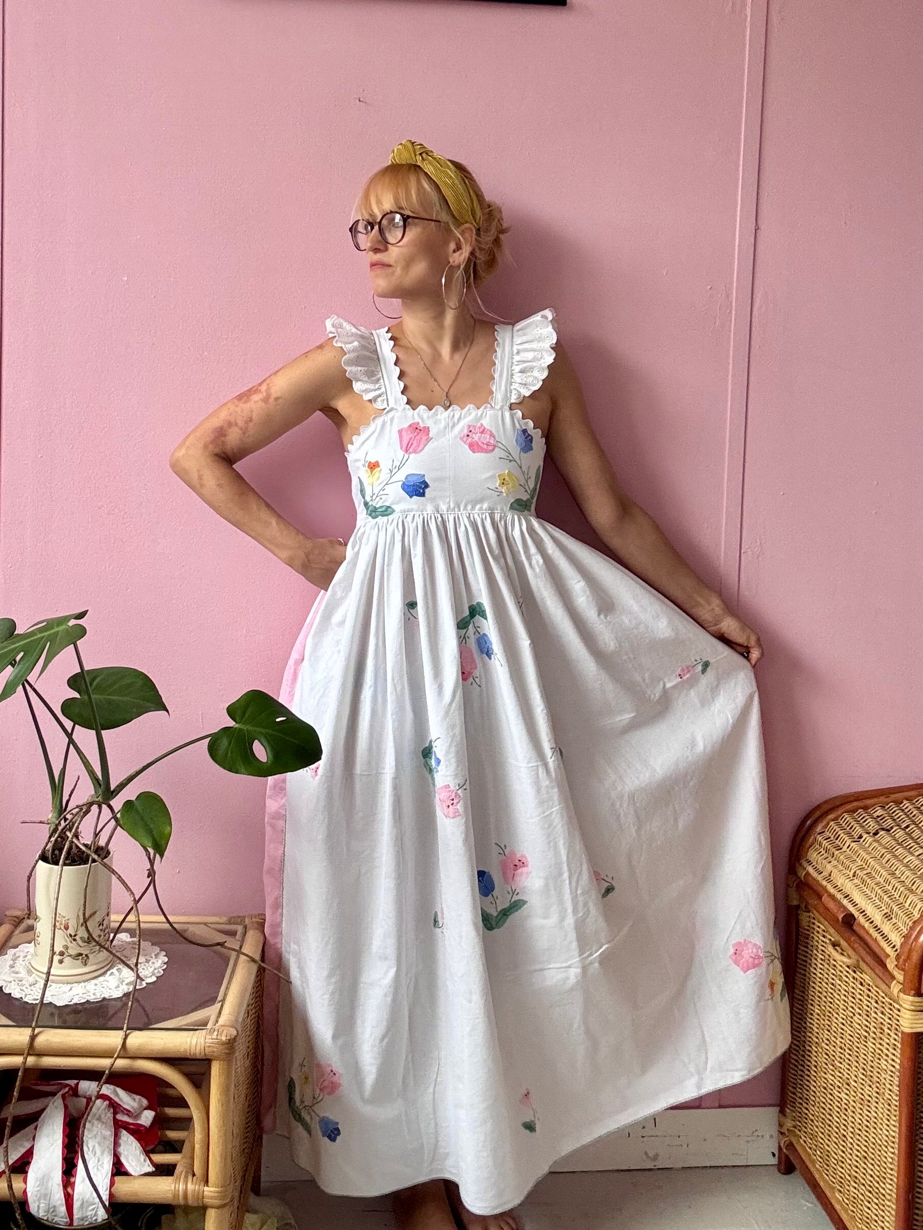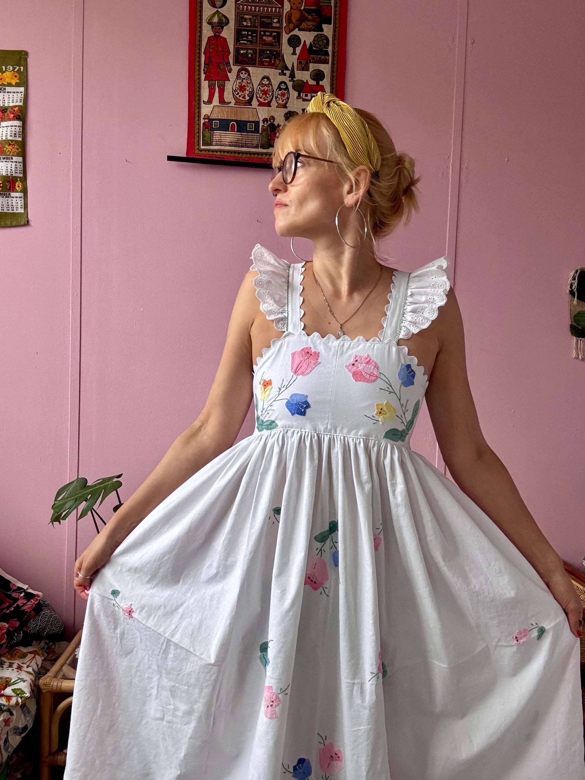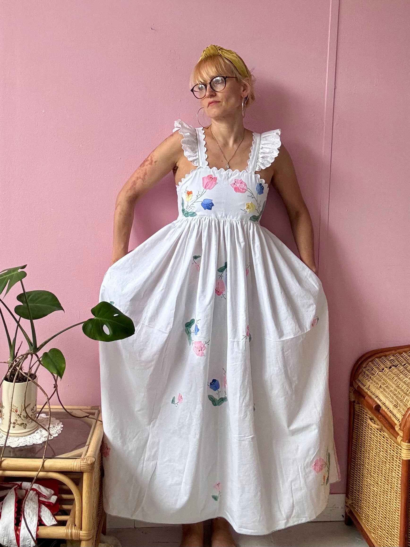 White cotton maxi dress made from 2 vintage tablecloths with floral appliqués and floral print