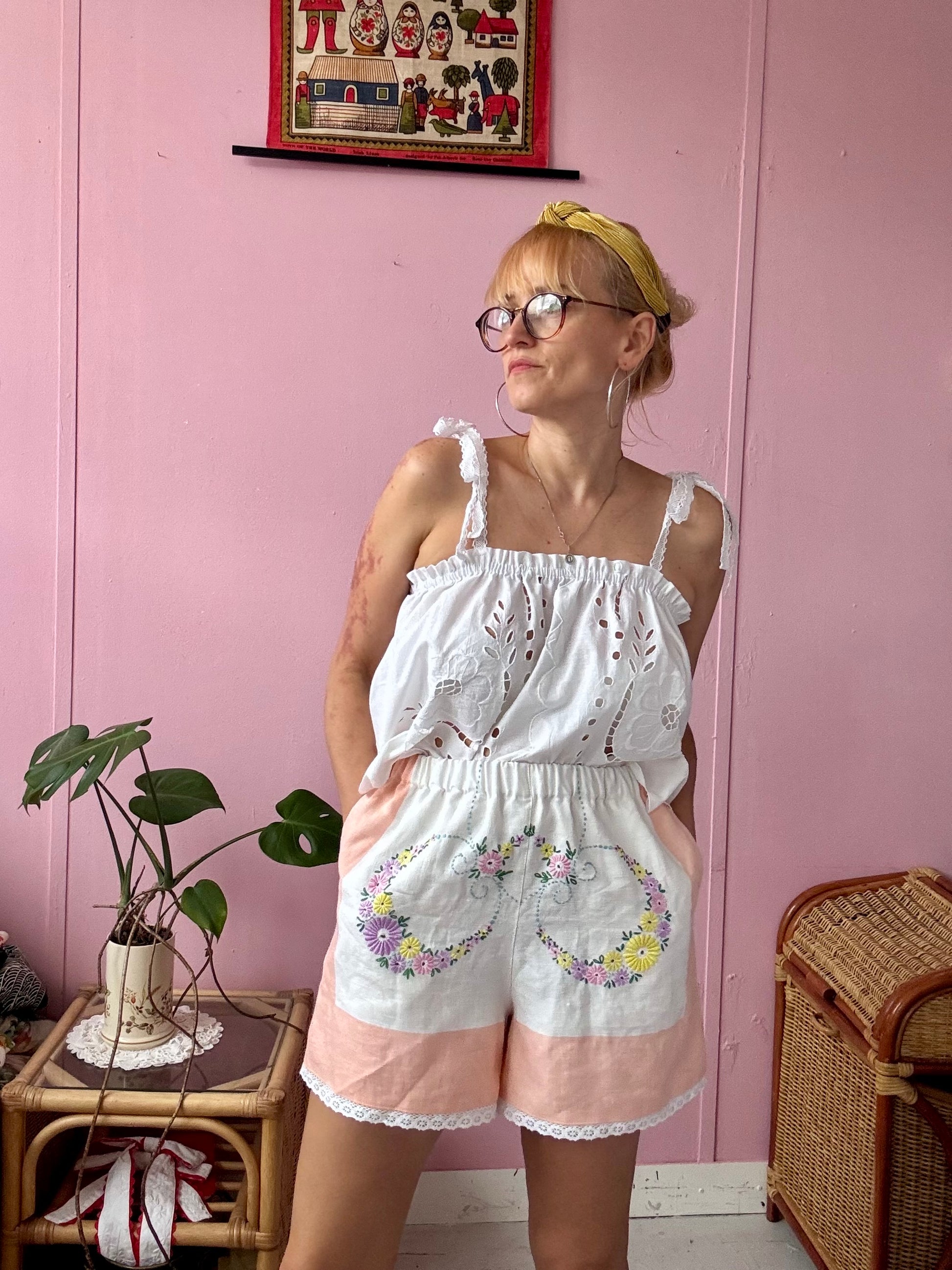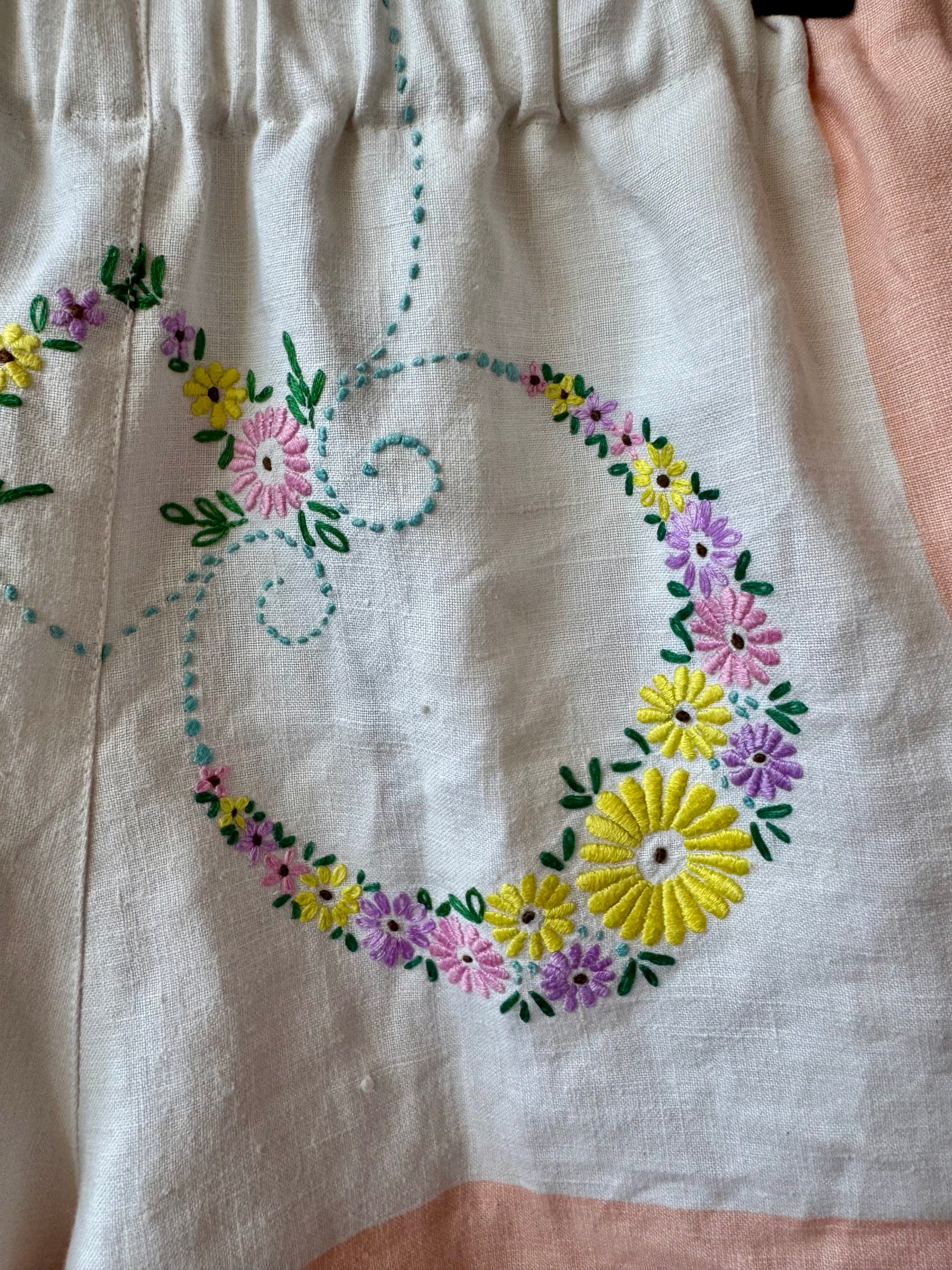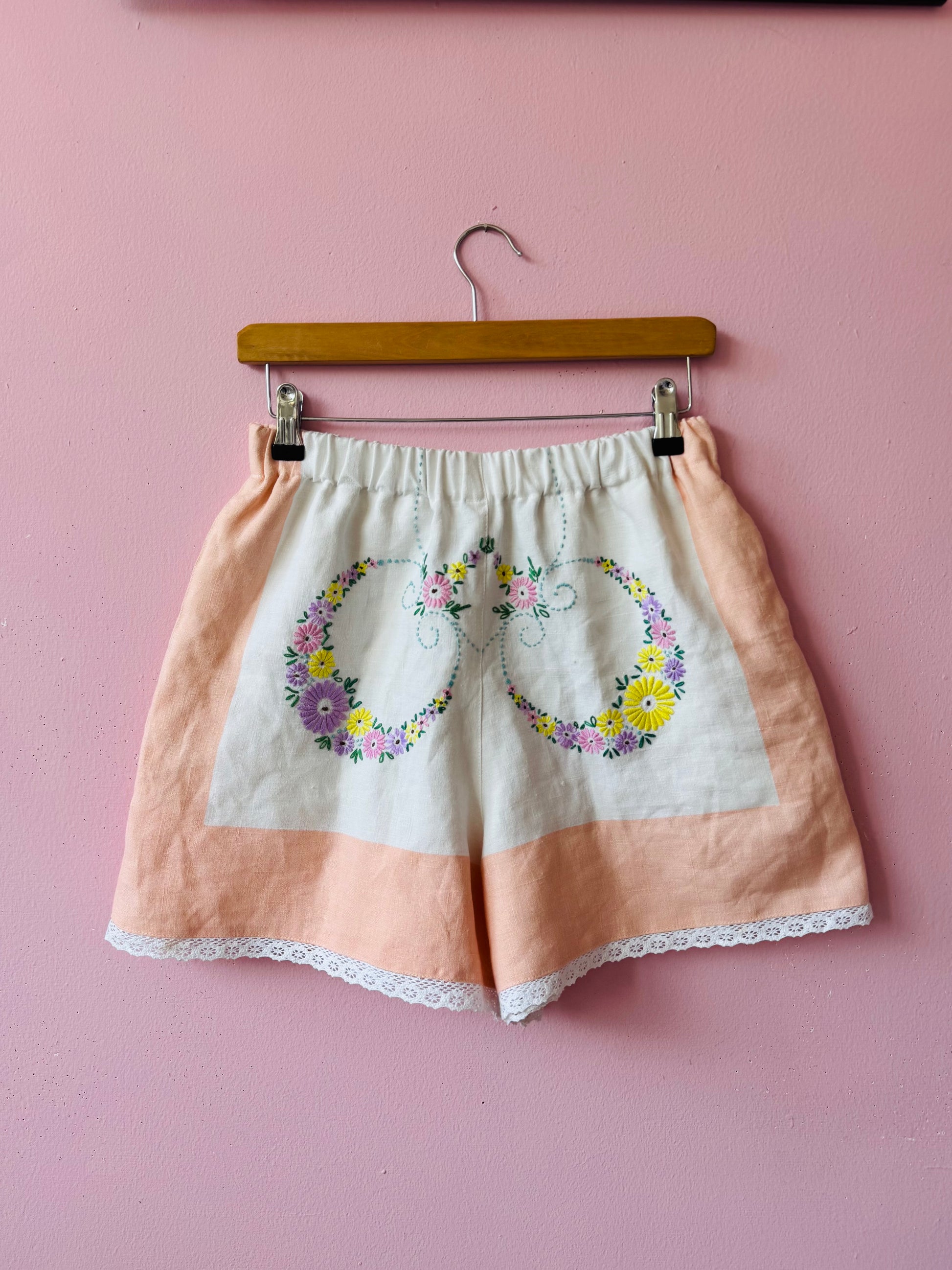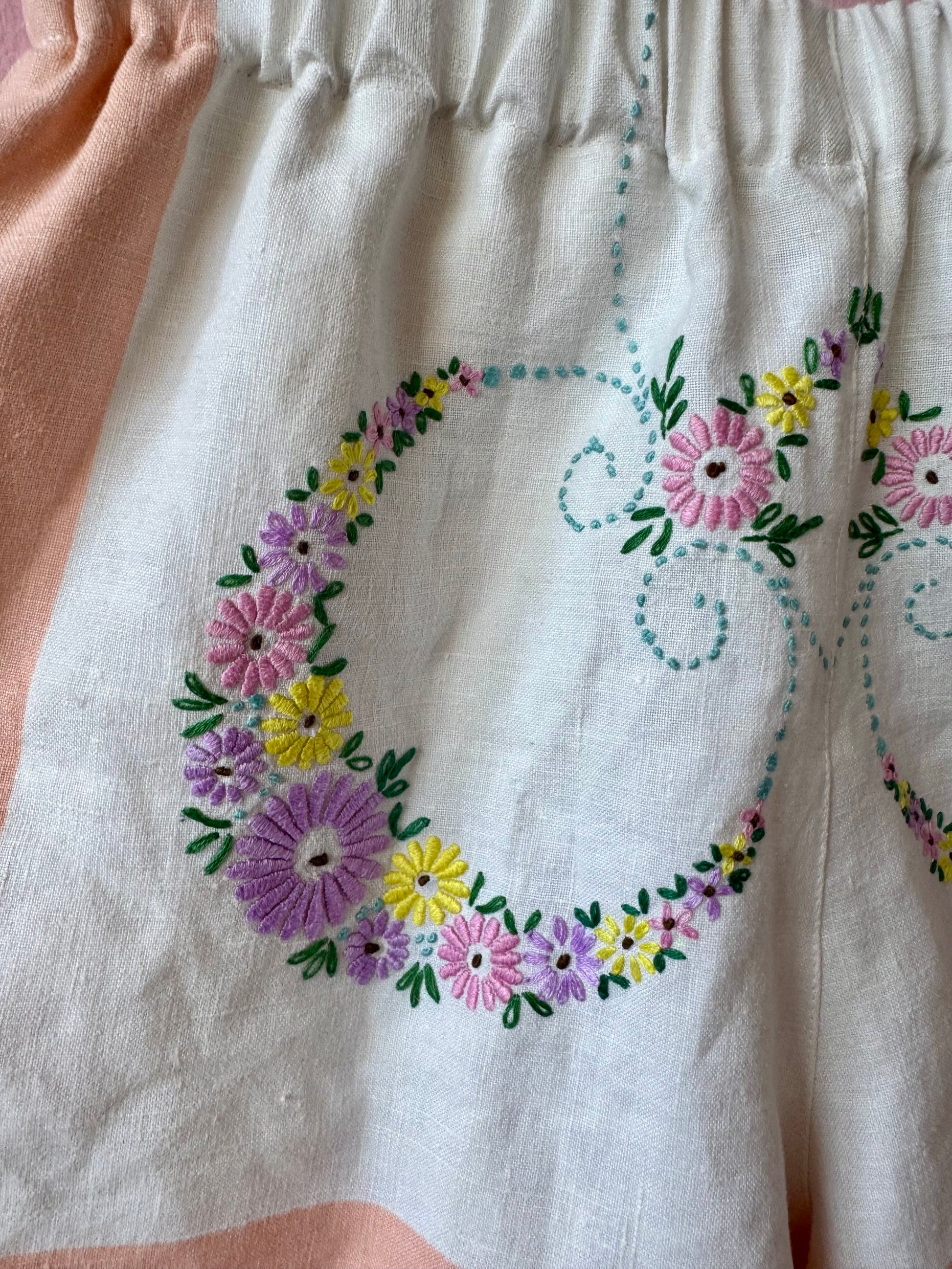 Linen shorts made from vintage tablecloth with floral hand embroidery and salmon pink borders