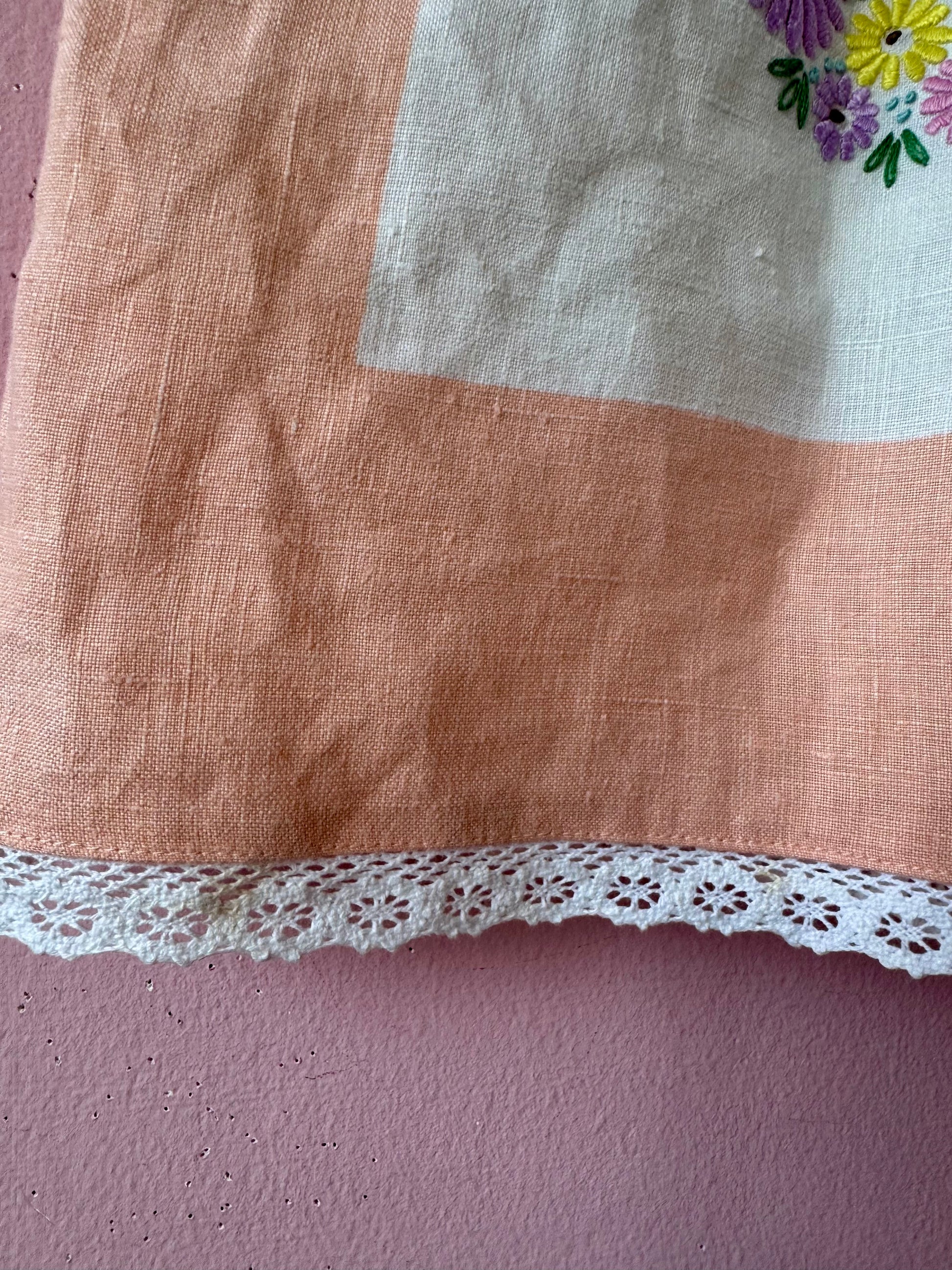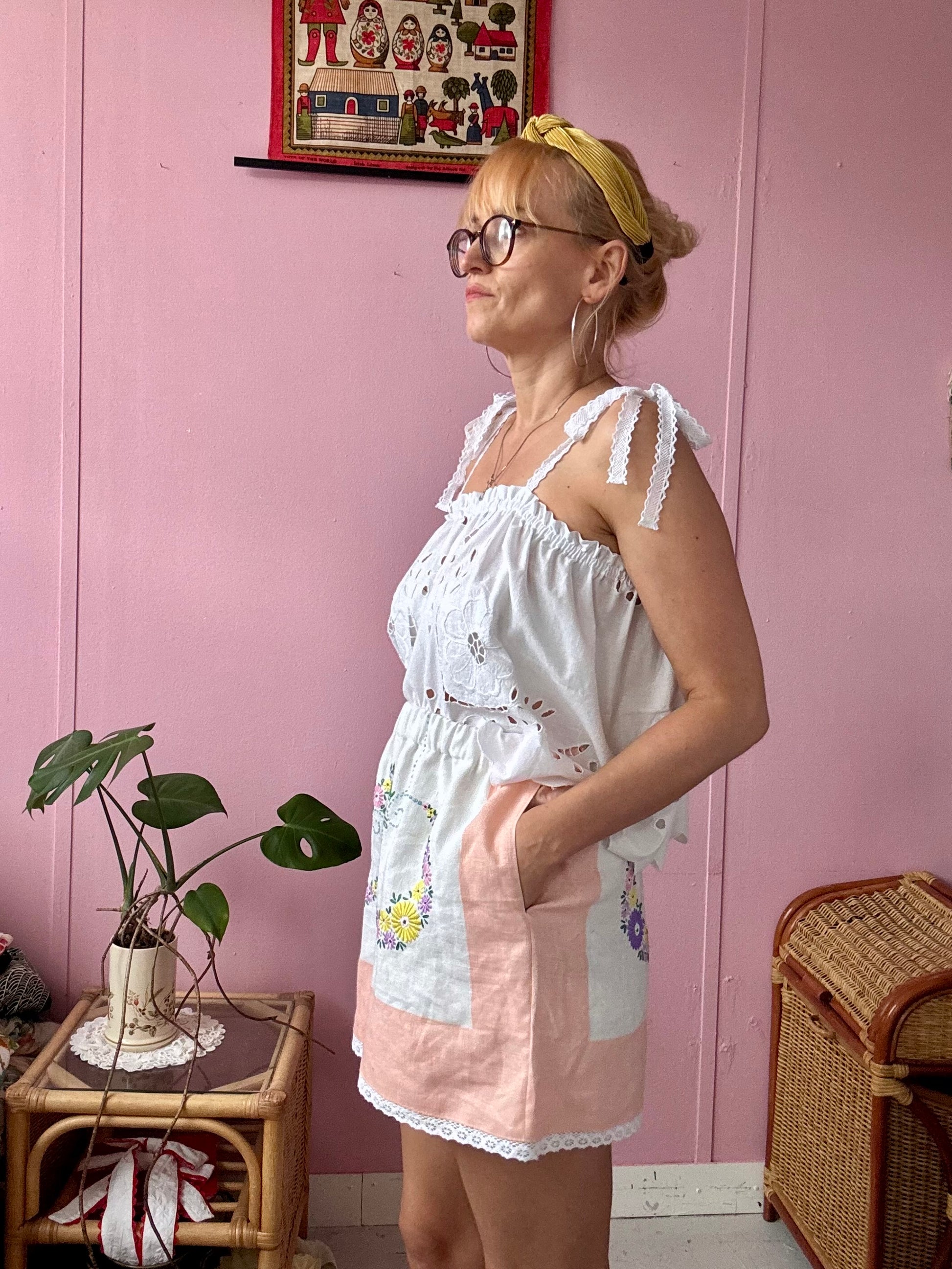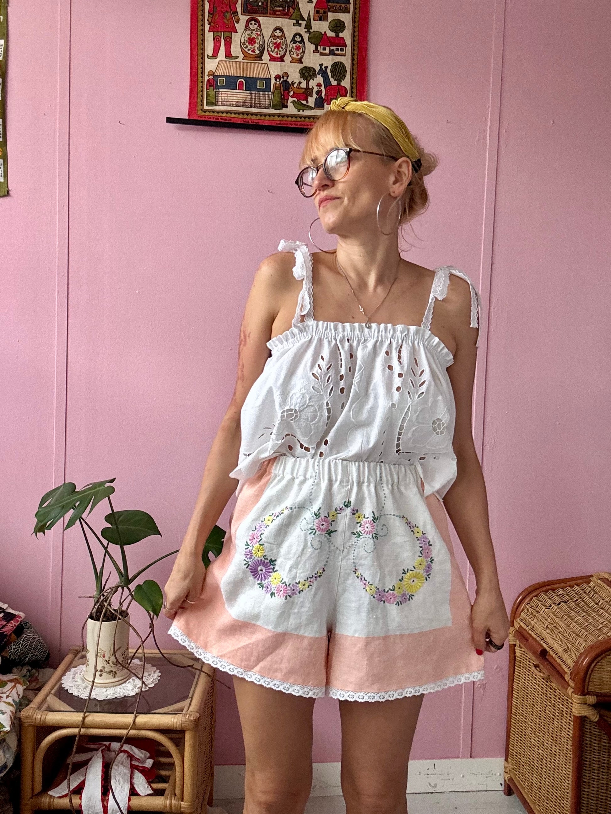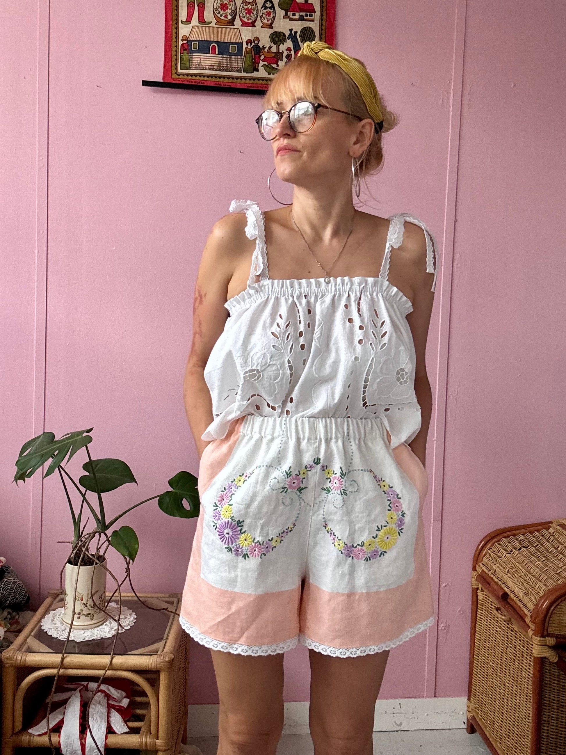 Linen shorts made from vintage tablecloth with floral hand embroidery and salmon pink borders
