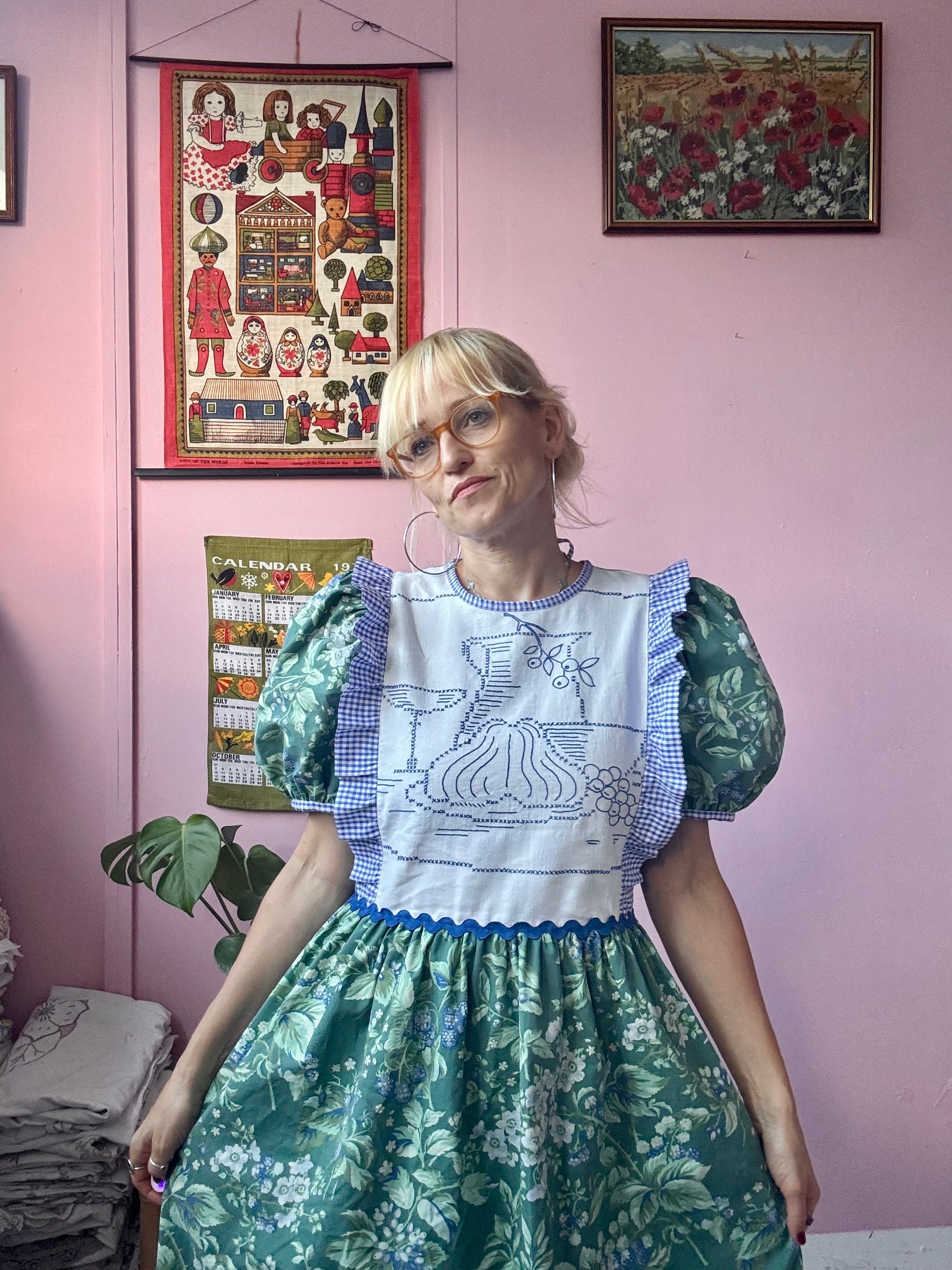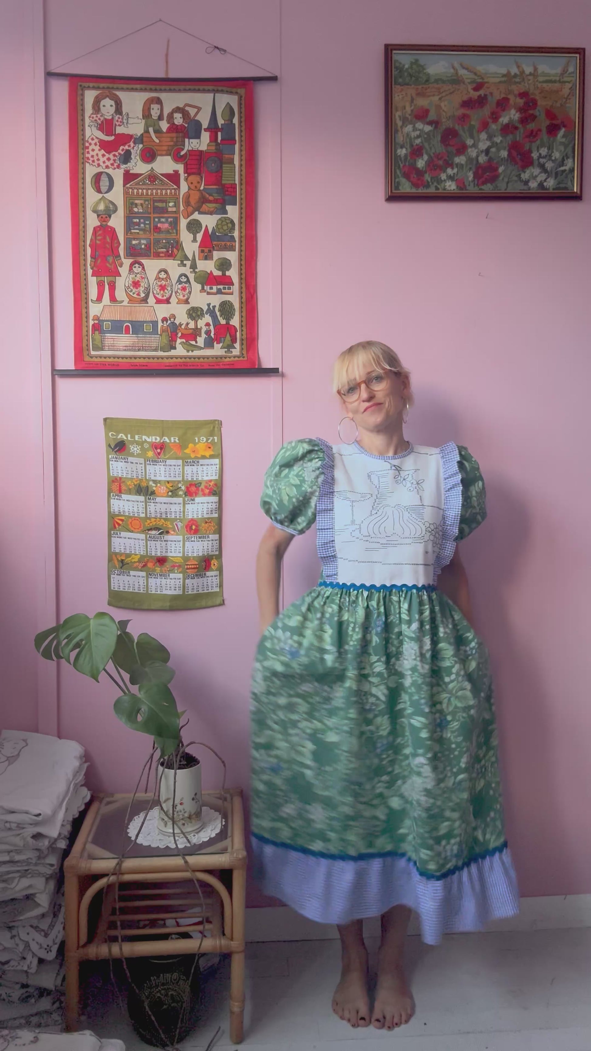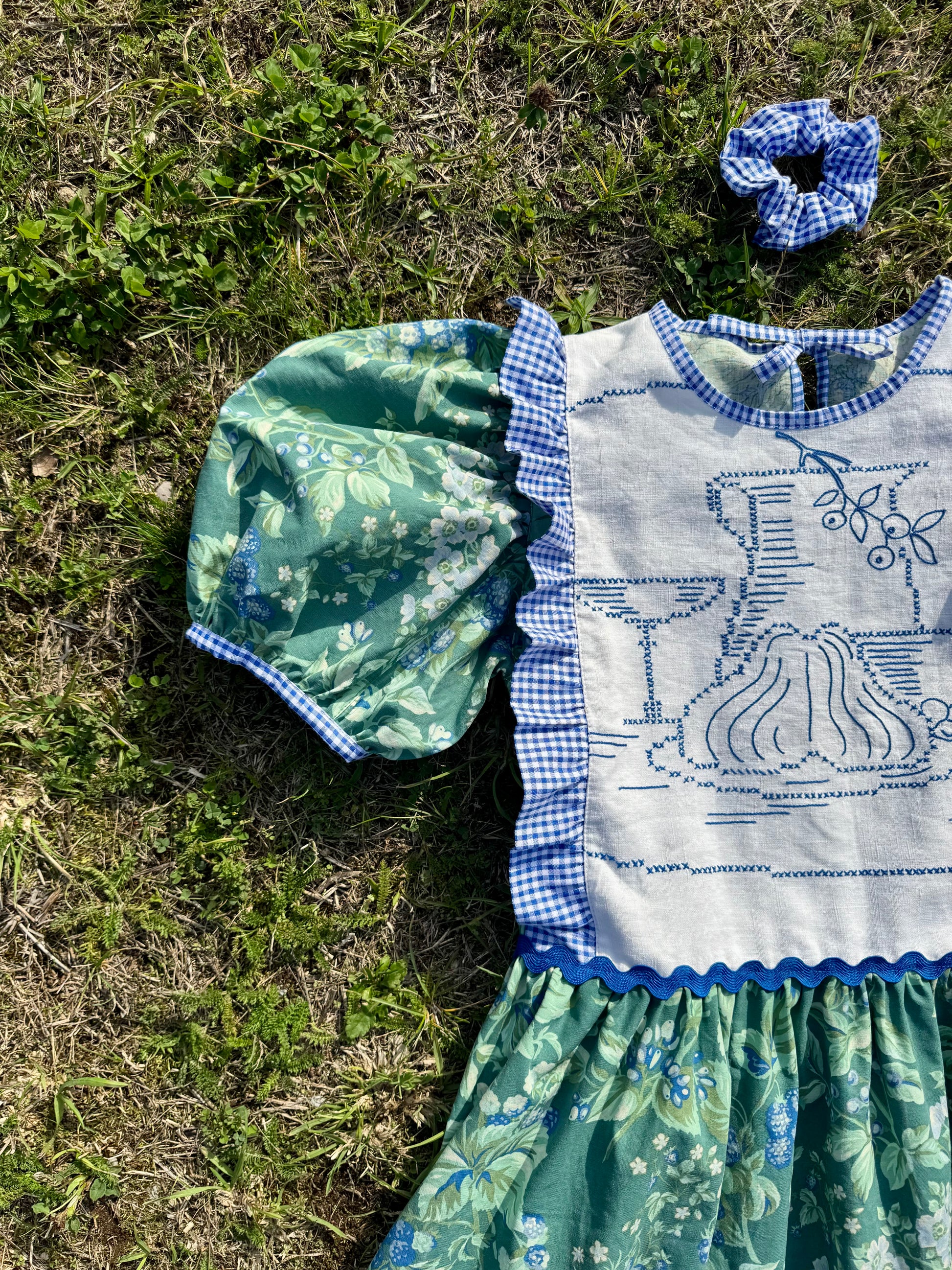 Front panel made from vintage vase and fruit hand embroidery tablecloth and gingham side frills