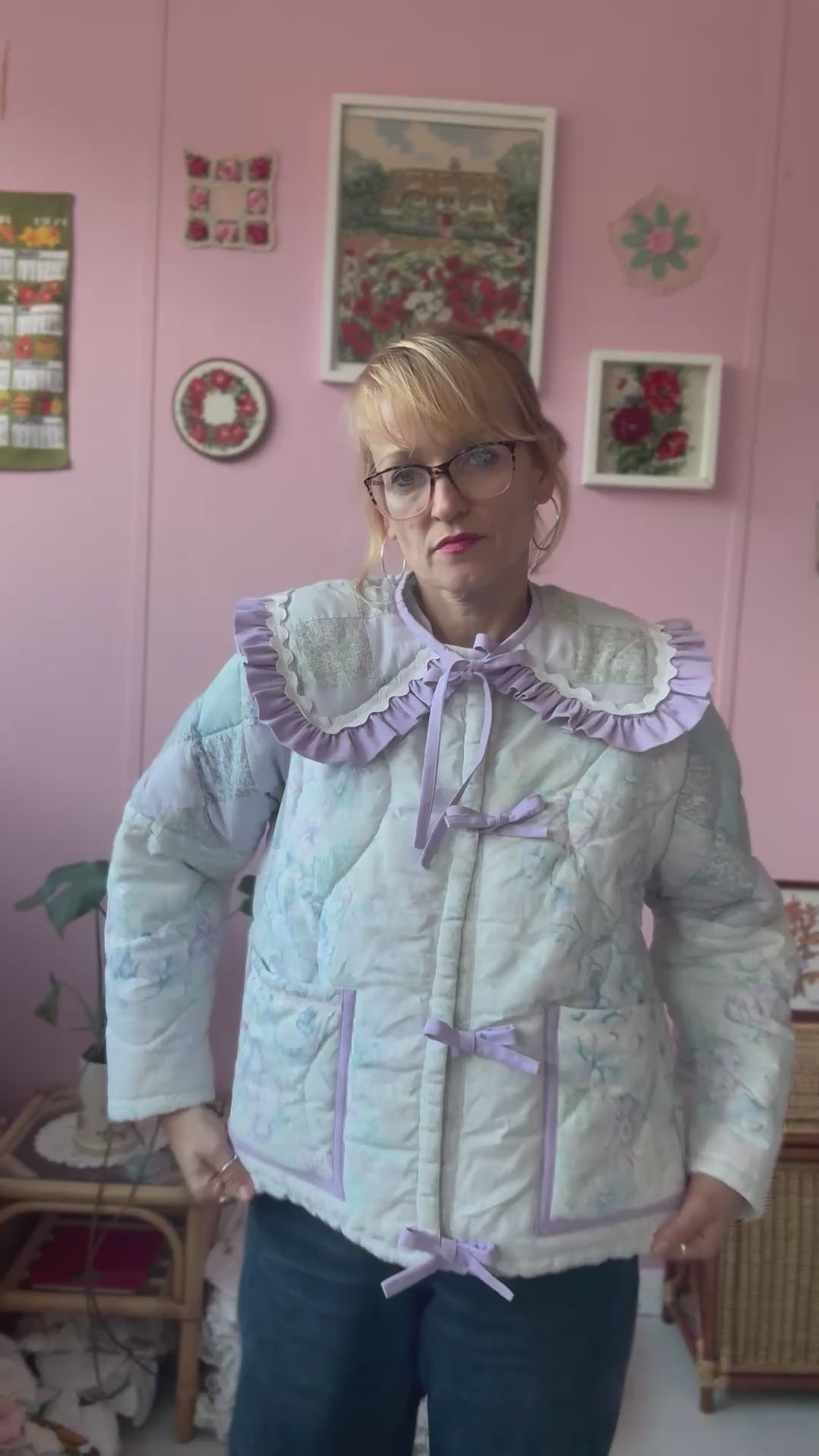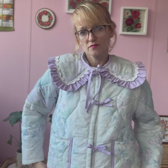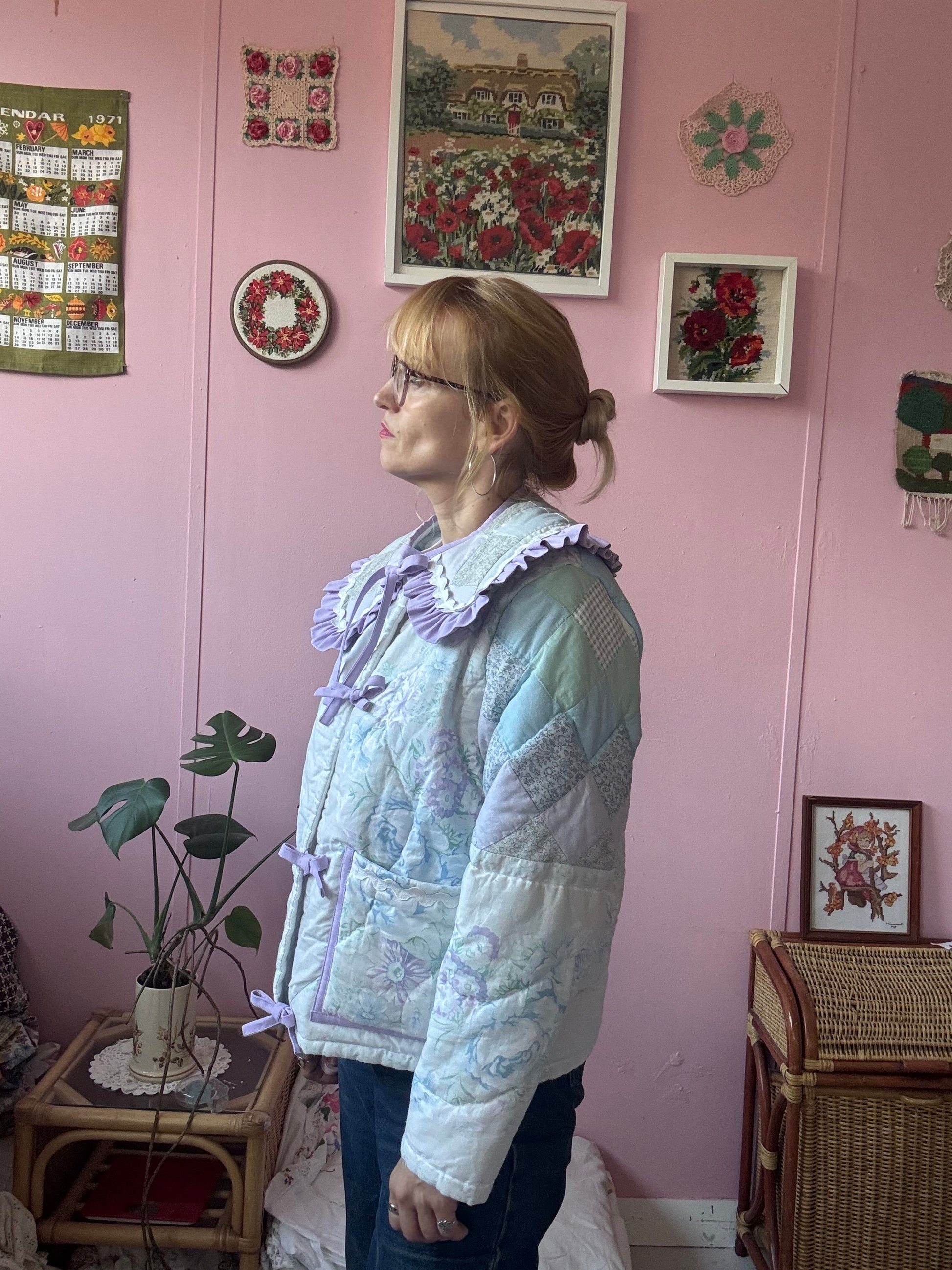 Light blue/light green/lilac patchwork jacket made from vintage blanket