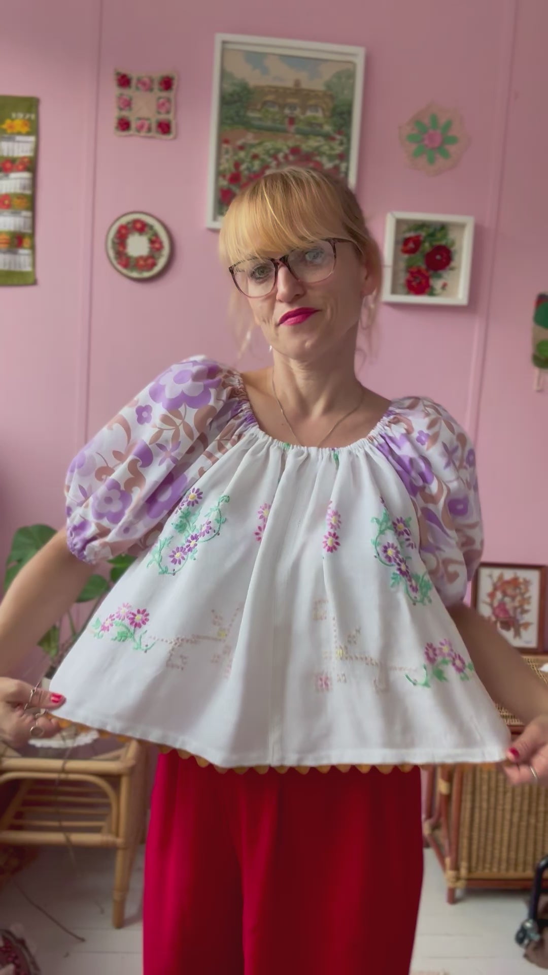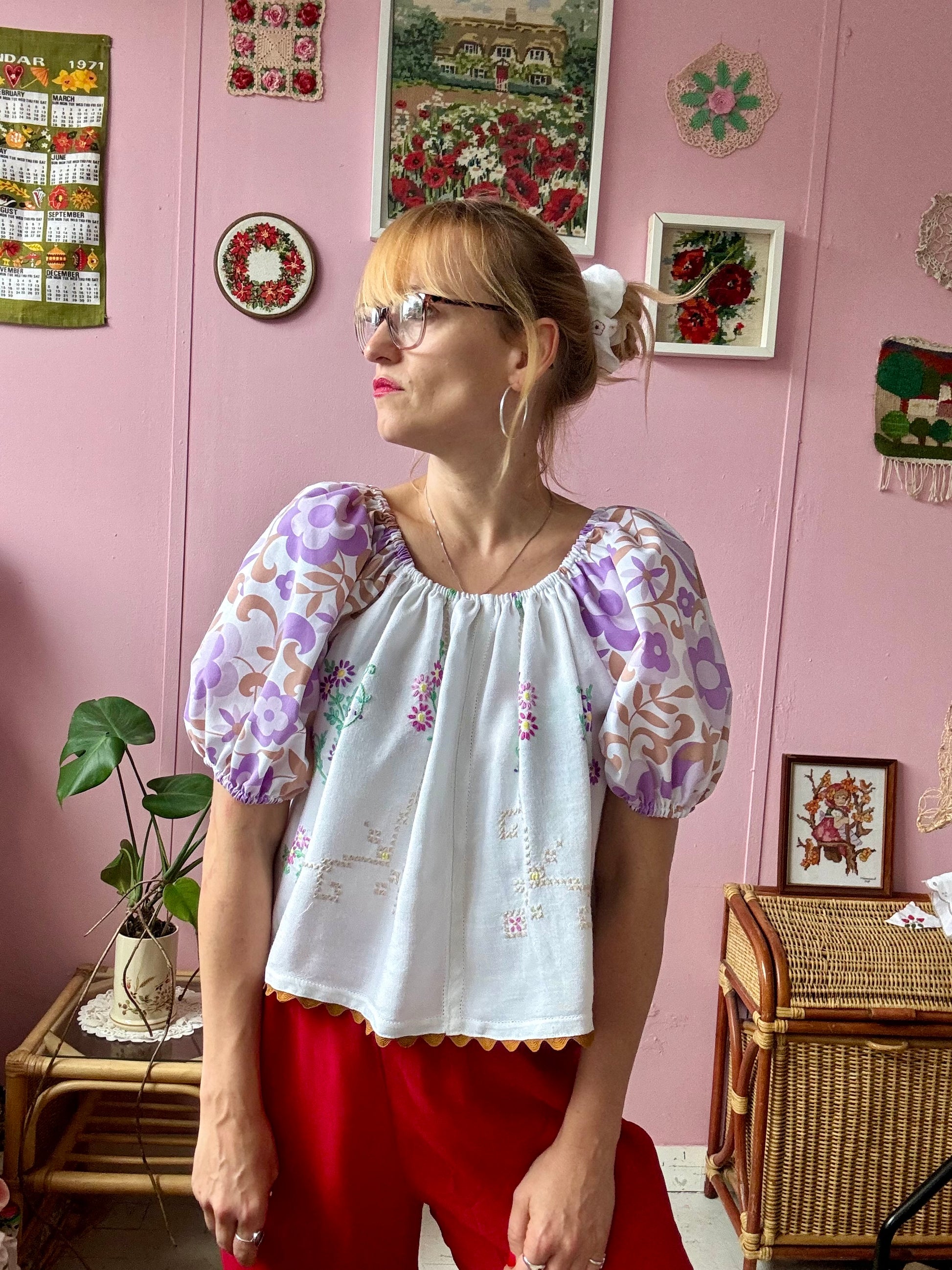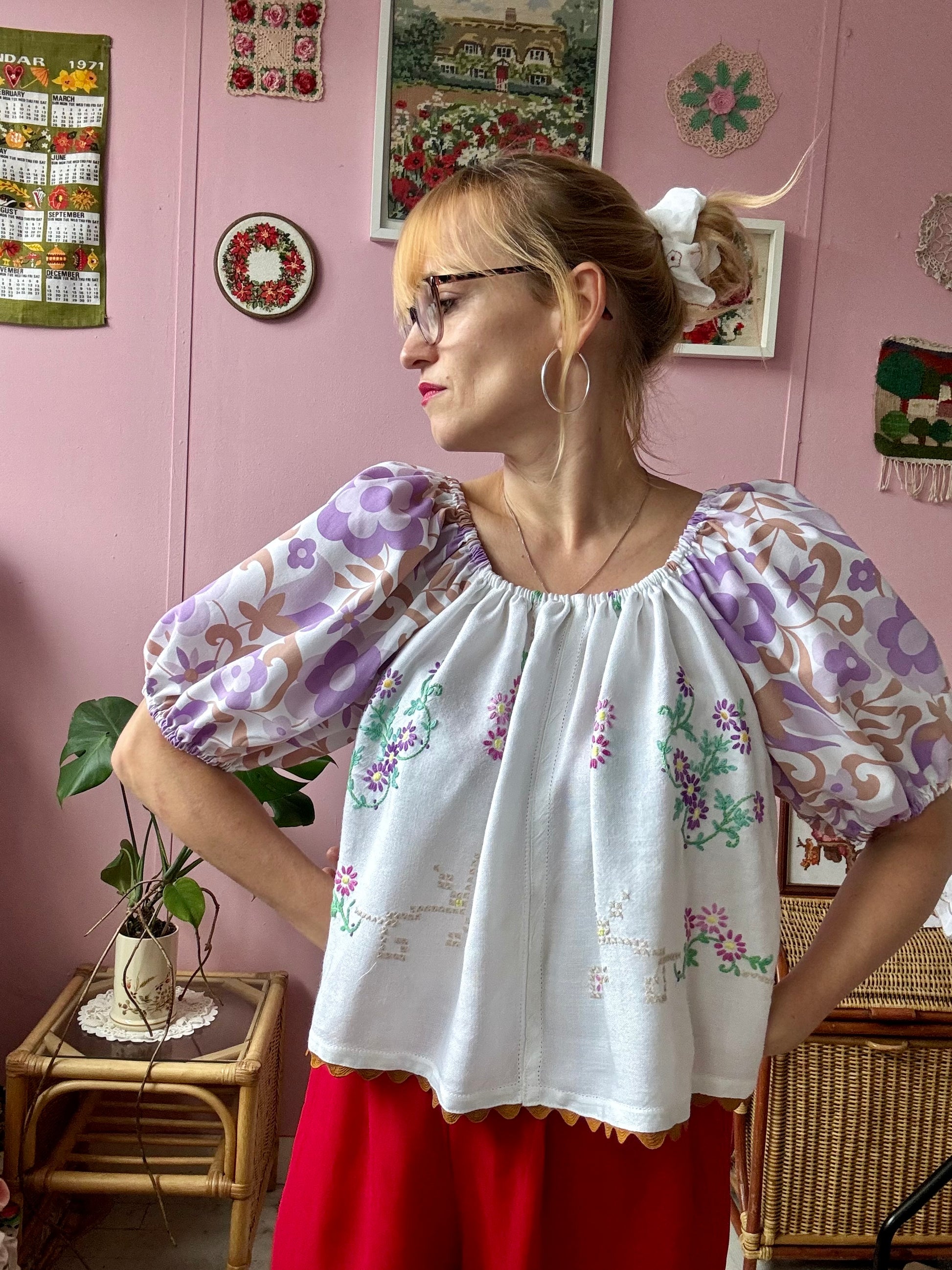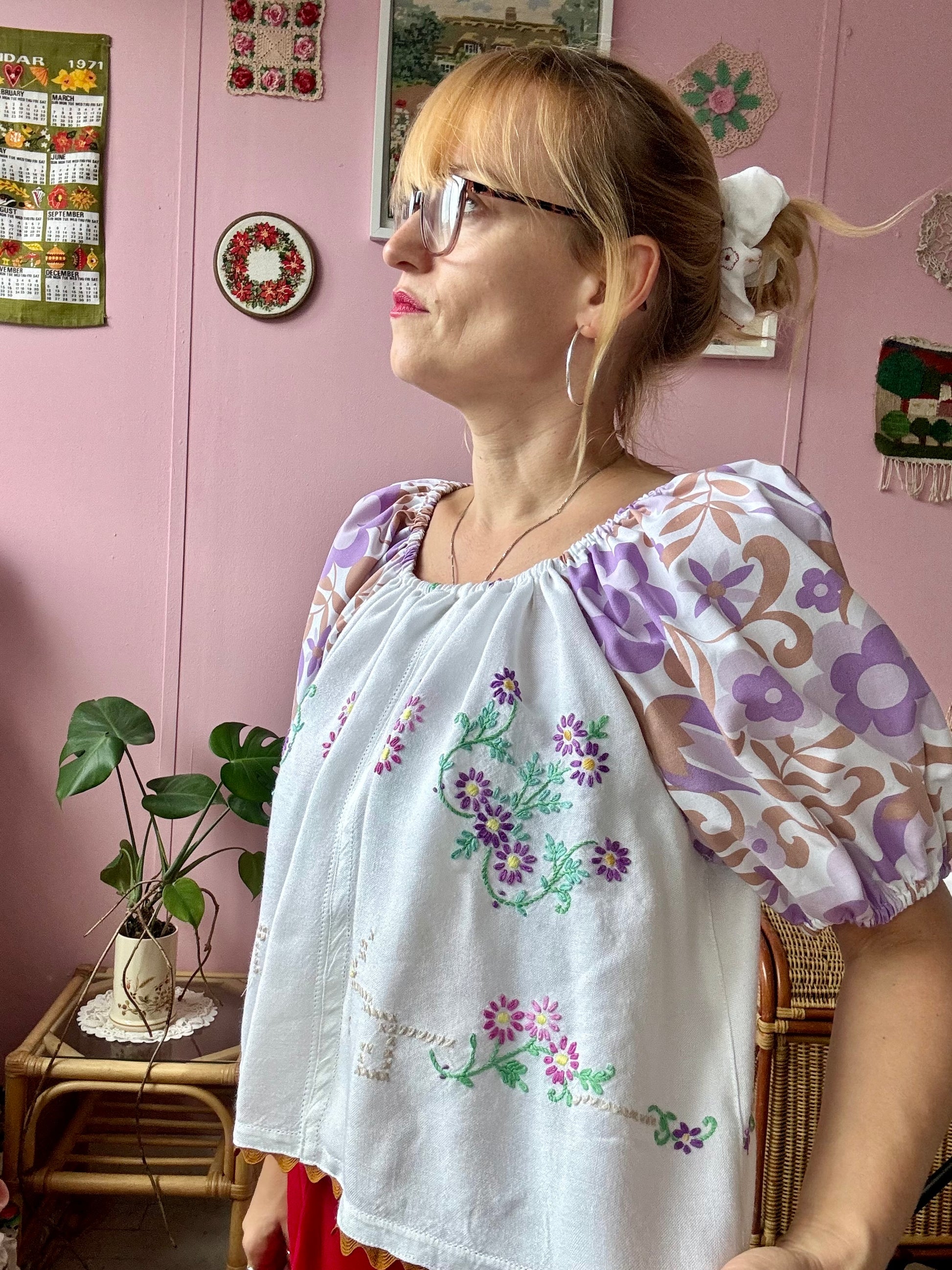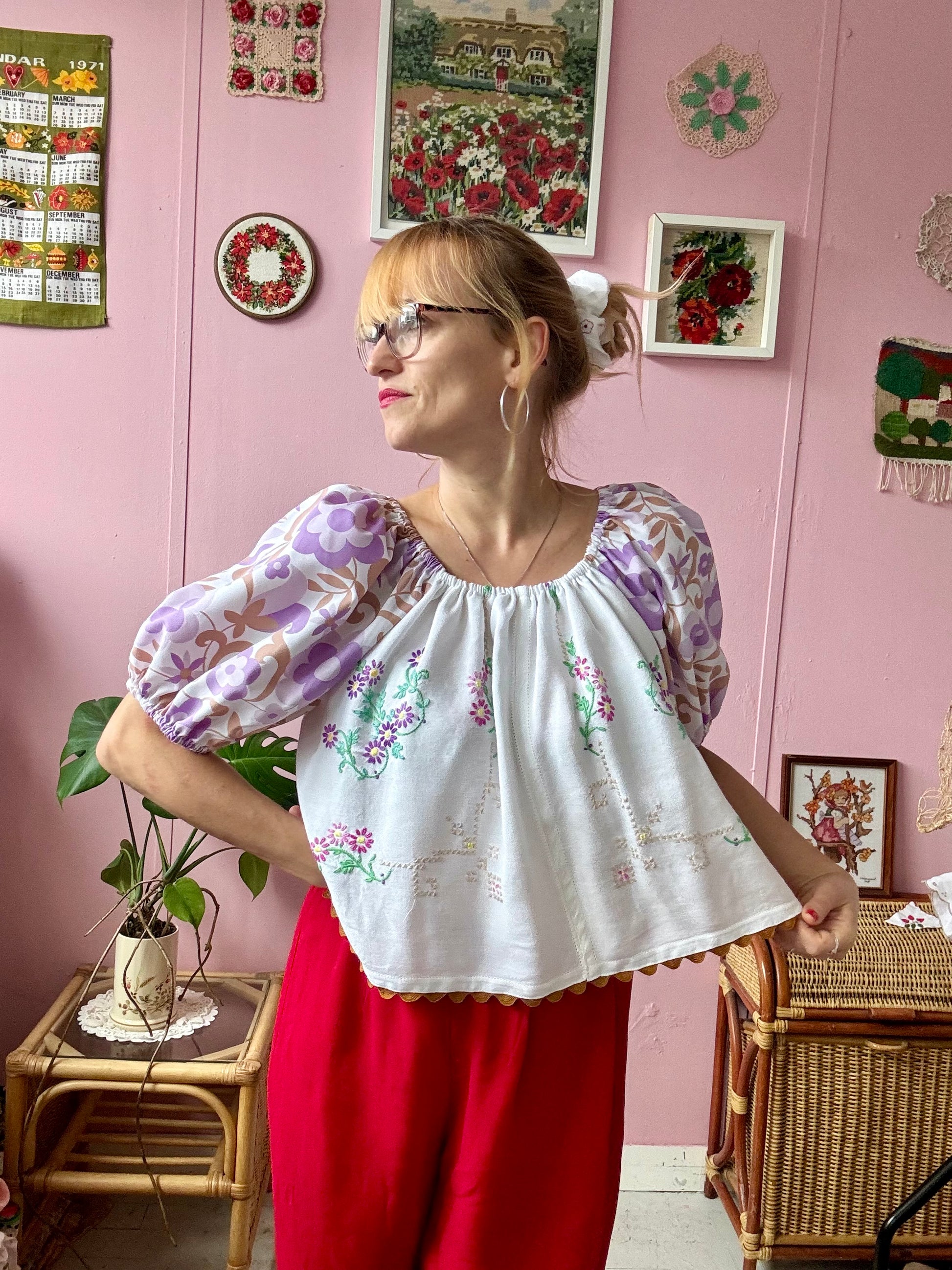 Lilac and brown blouse made from vintage tablecloth with floral hand embroidery and vintage floral bedding