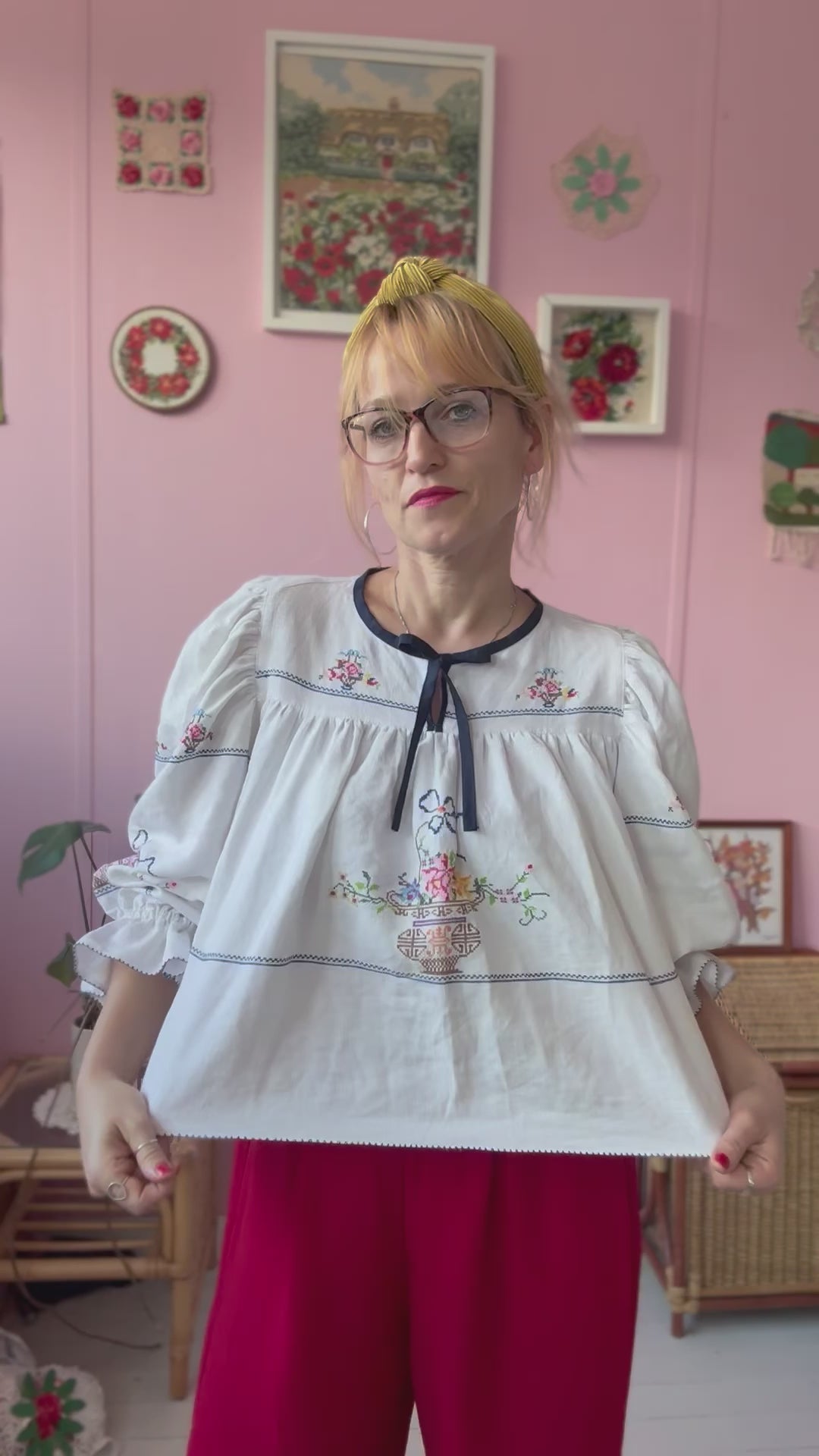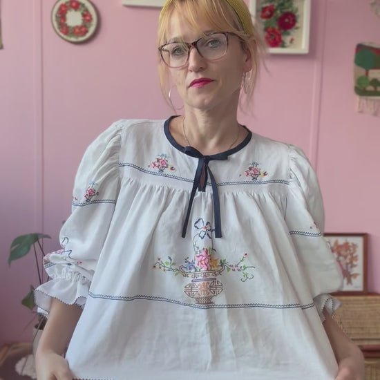 Linen blouse made from vintage tablecloth with cross stitching baskets hand embroidery