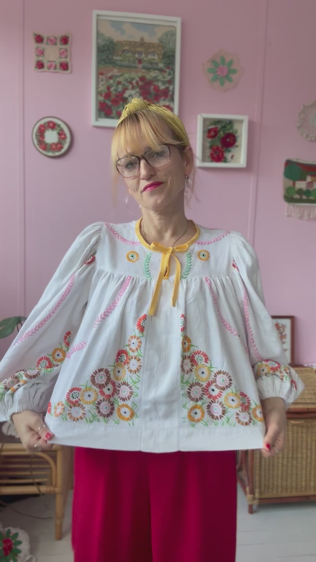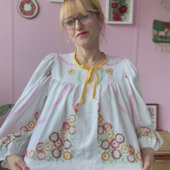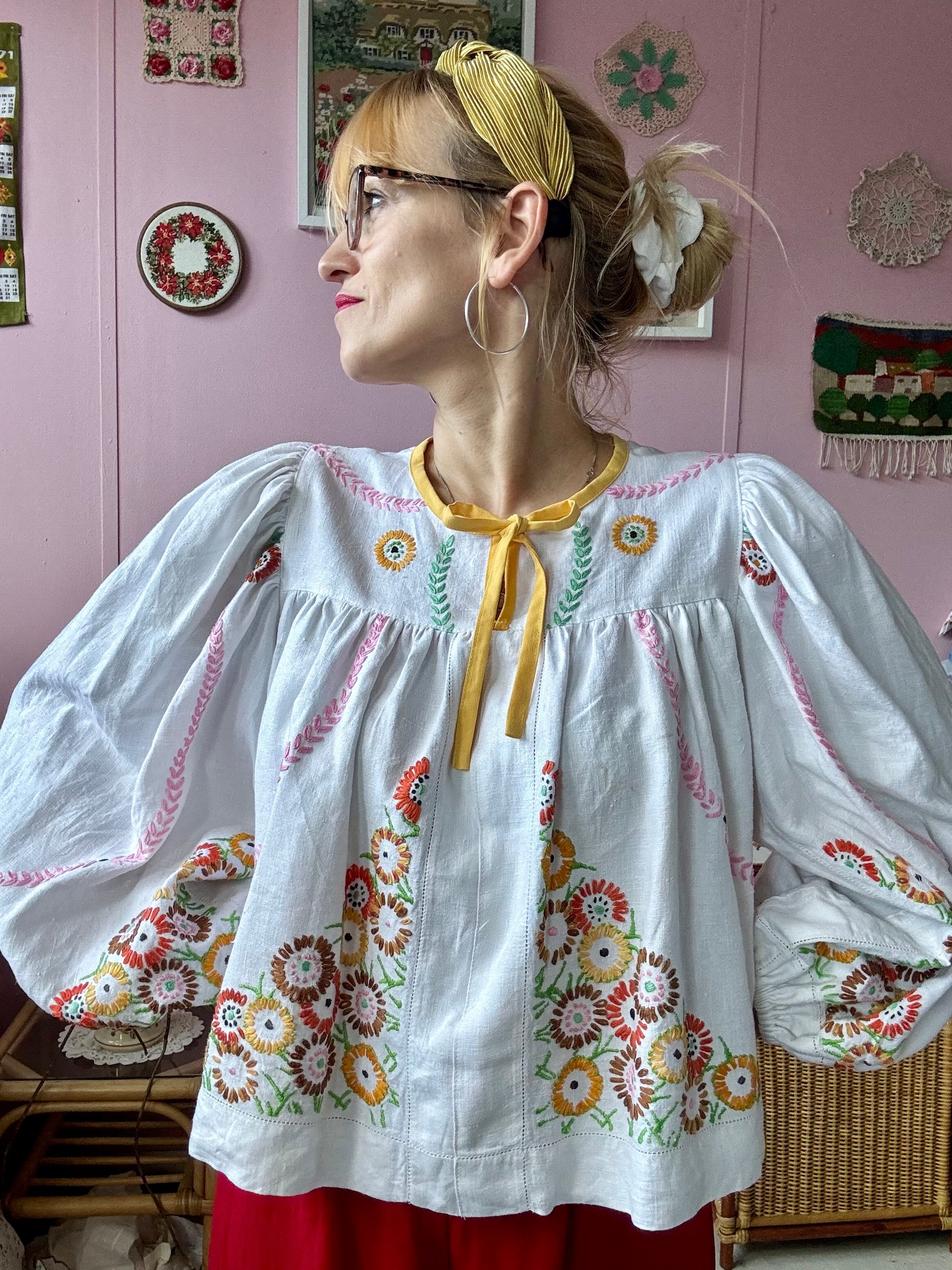 Linen blouse made from vintage tablecloth with floral hand embroidery and pink embroidery