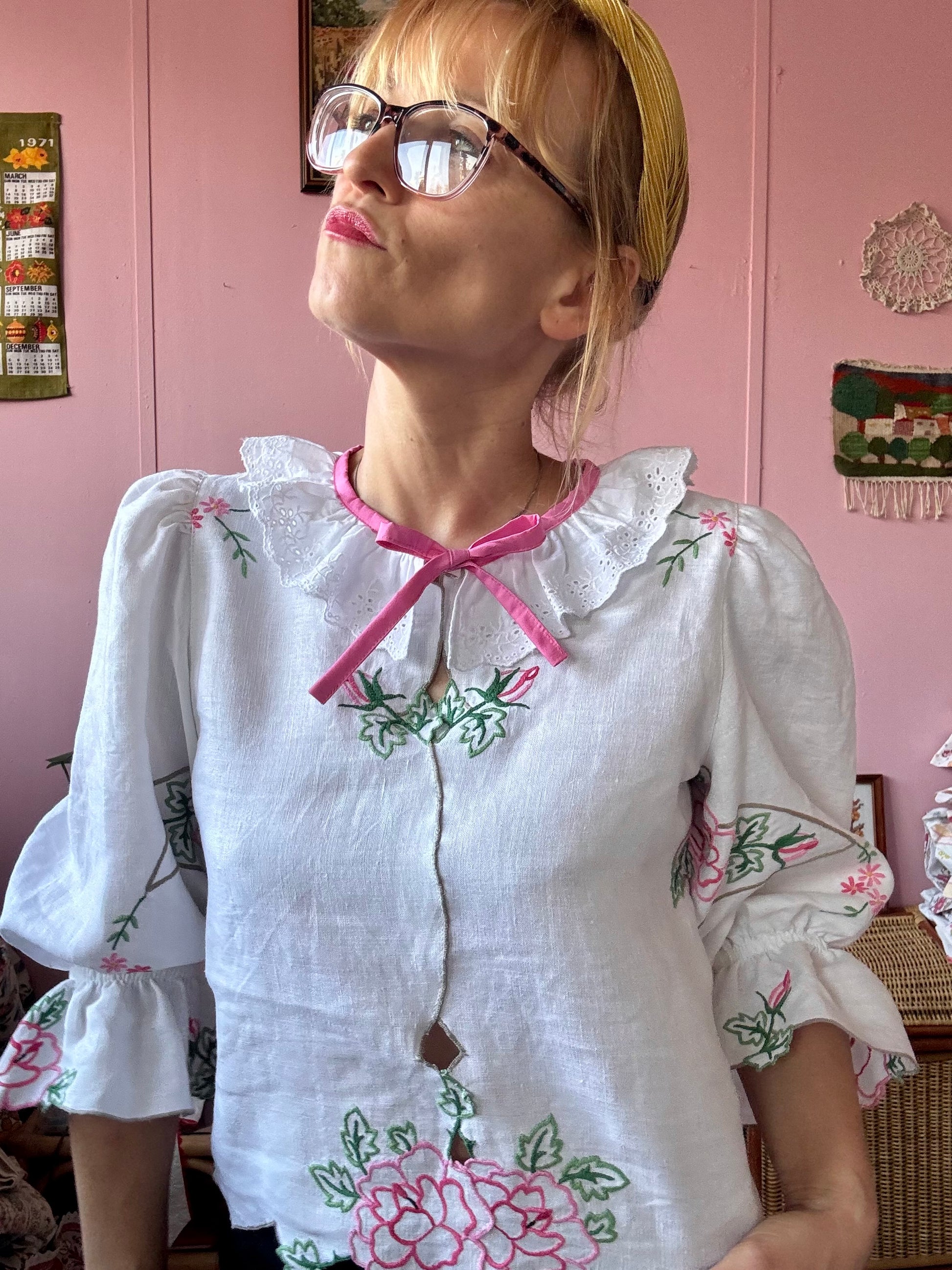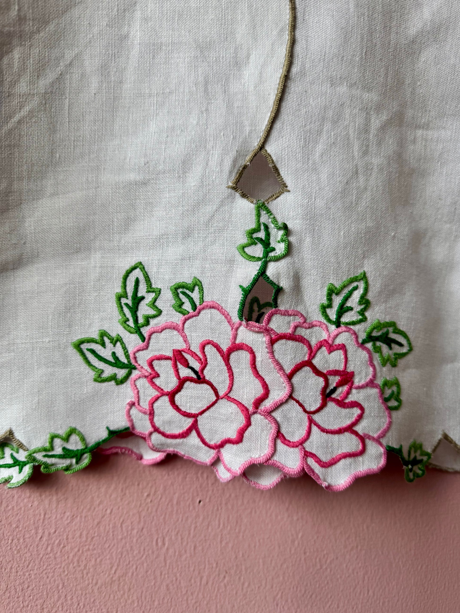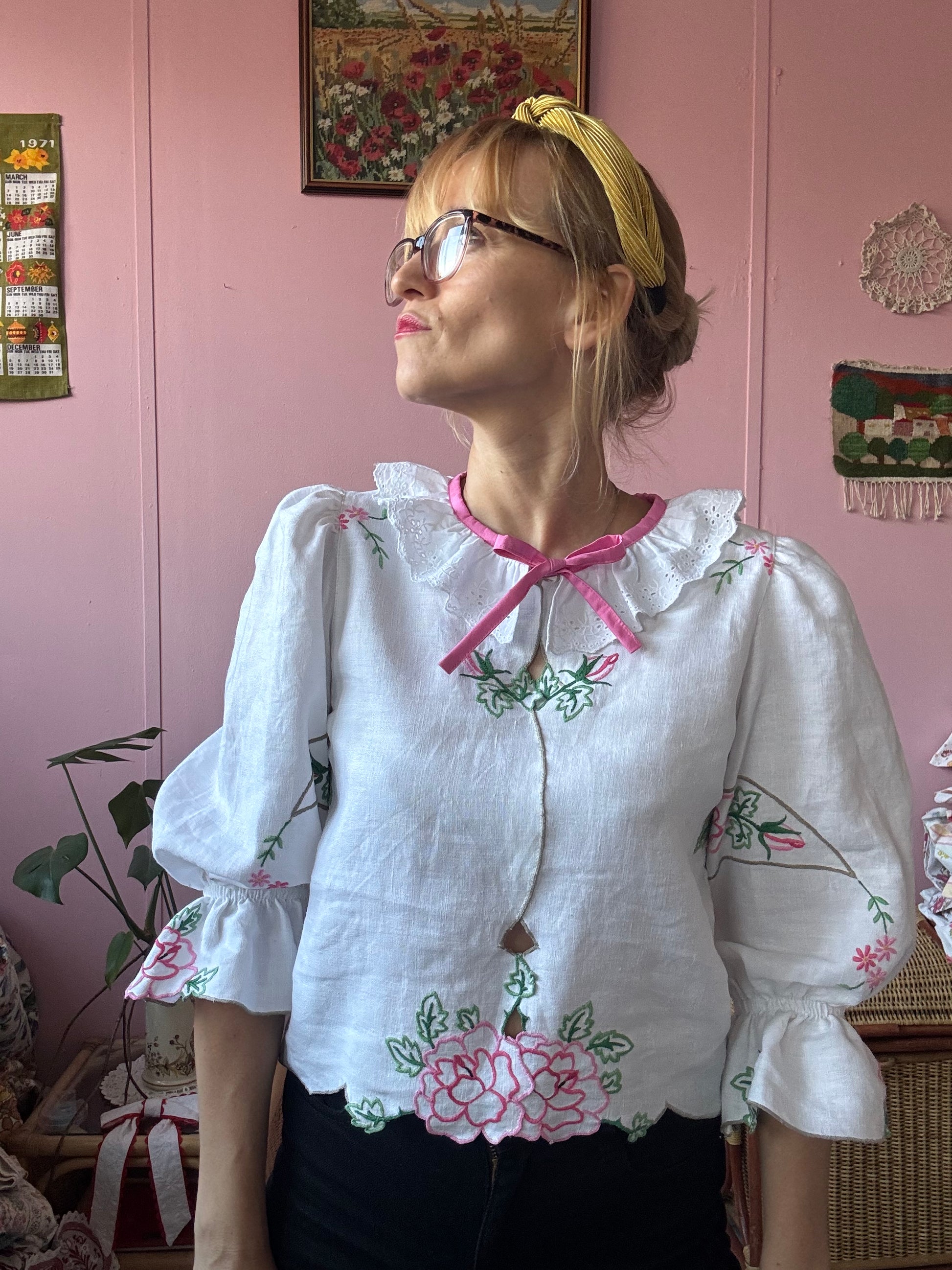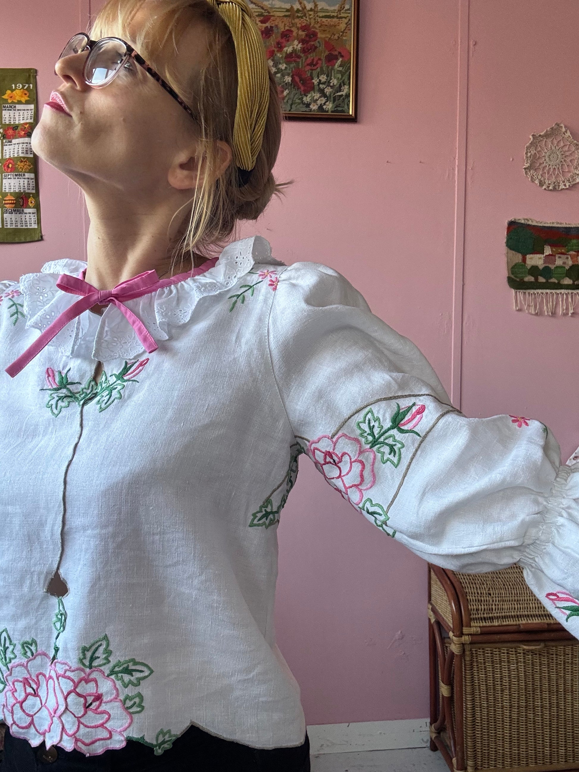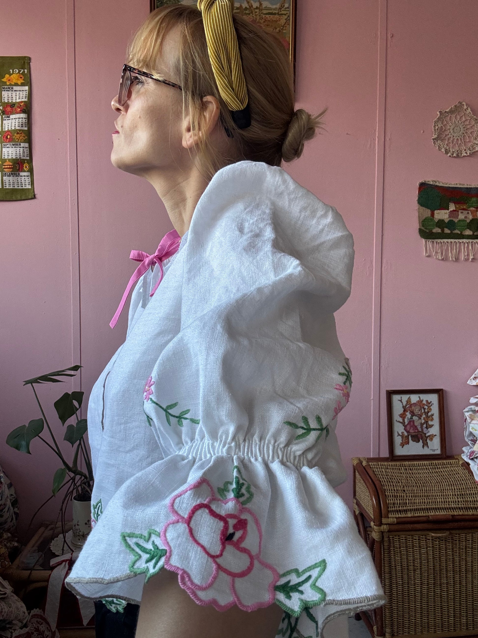 Linen blouse made from vintage tablecloth with pink flowers/roses hand embroidery