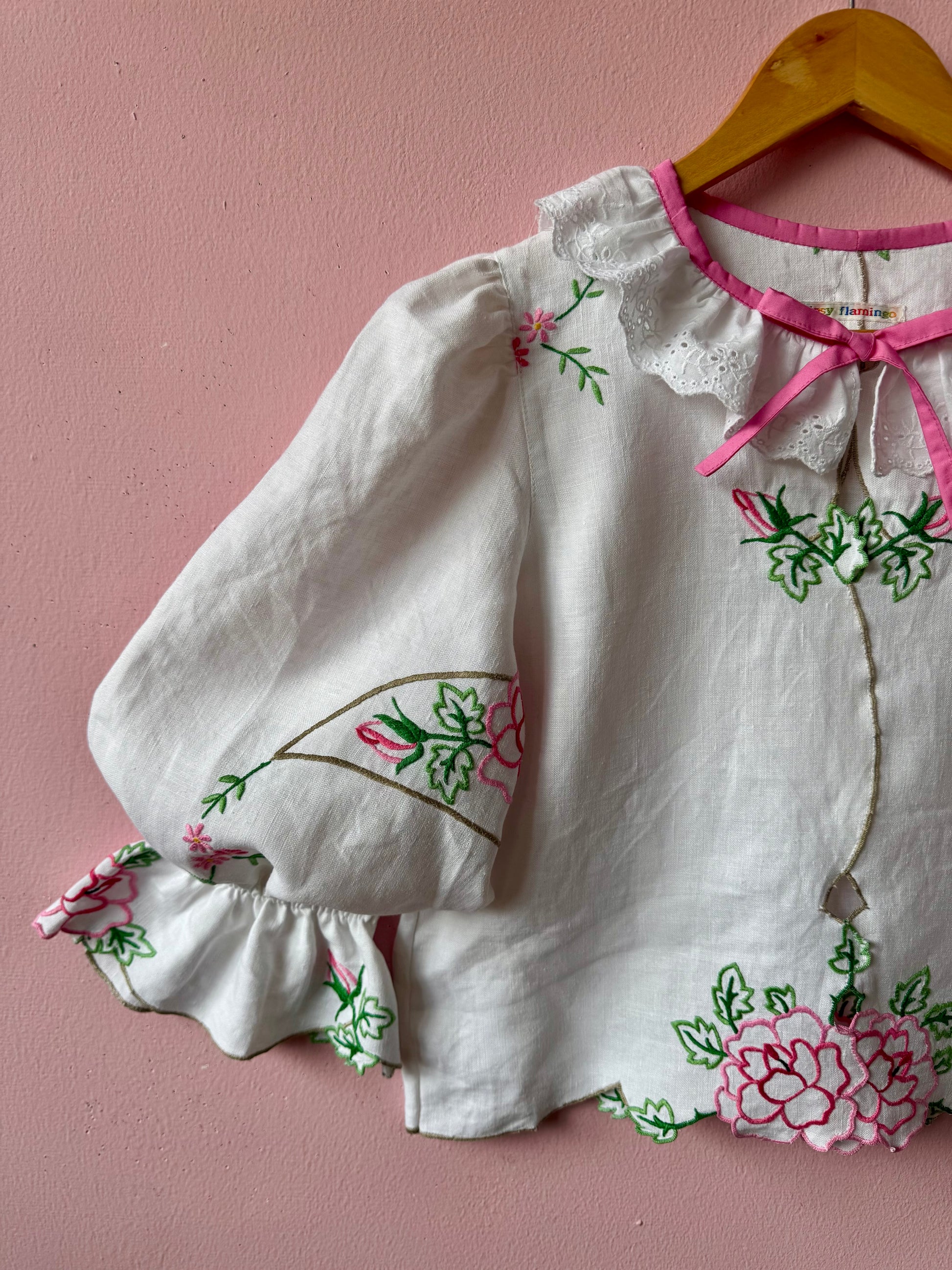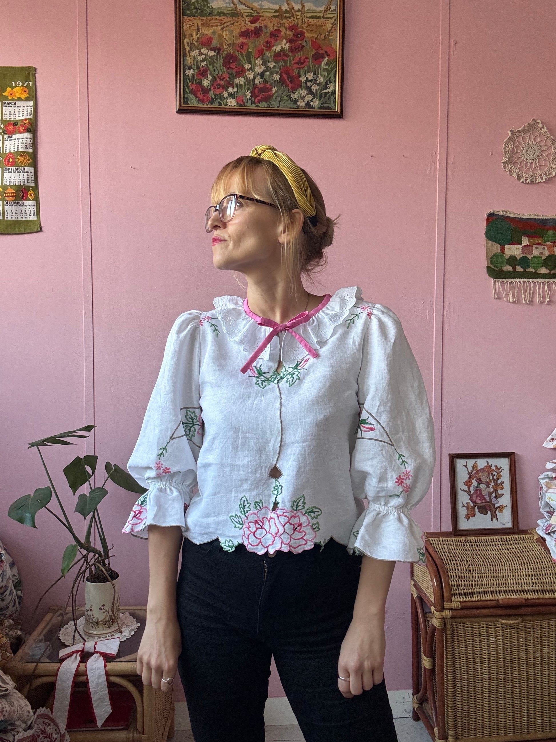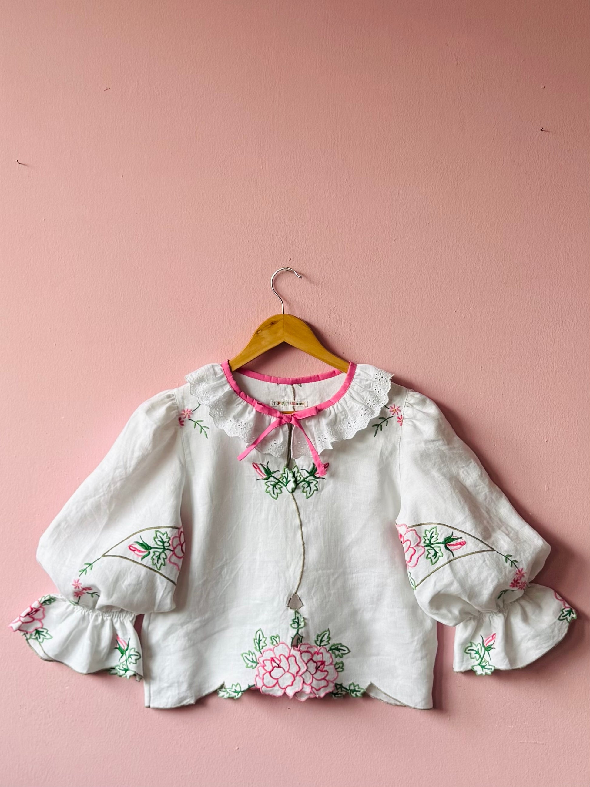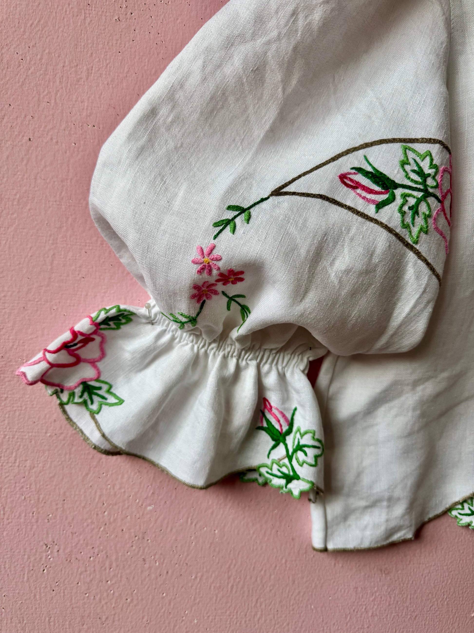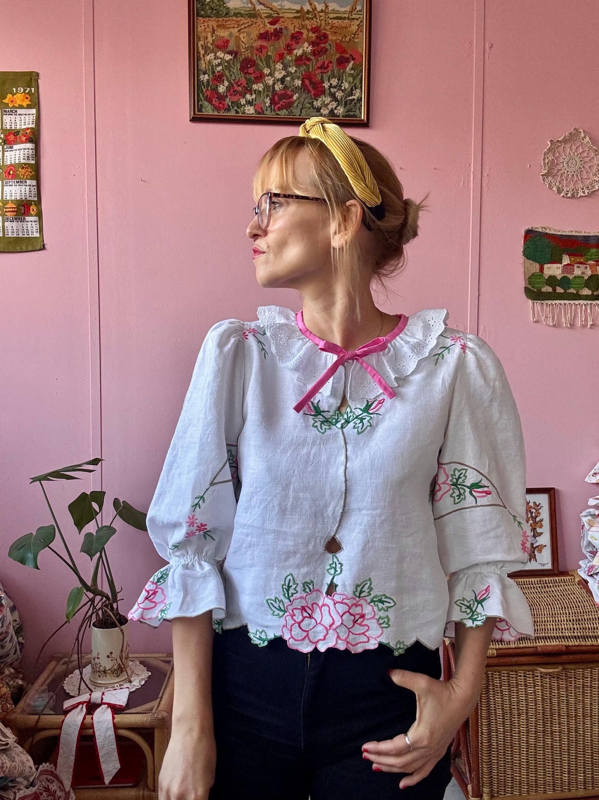 Linen blouse made from vintage tablecloth with pink flowers/roses hand embroidery