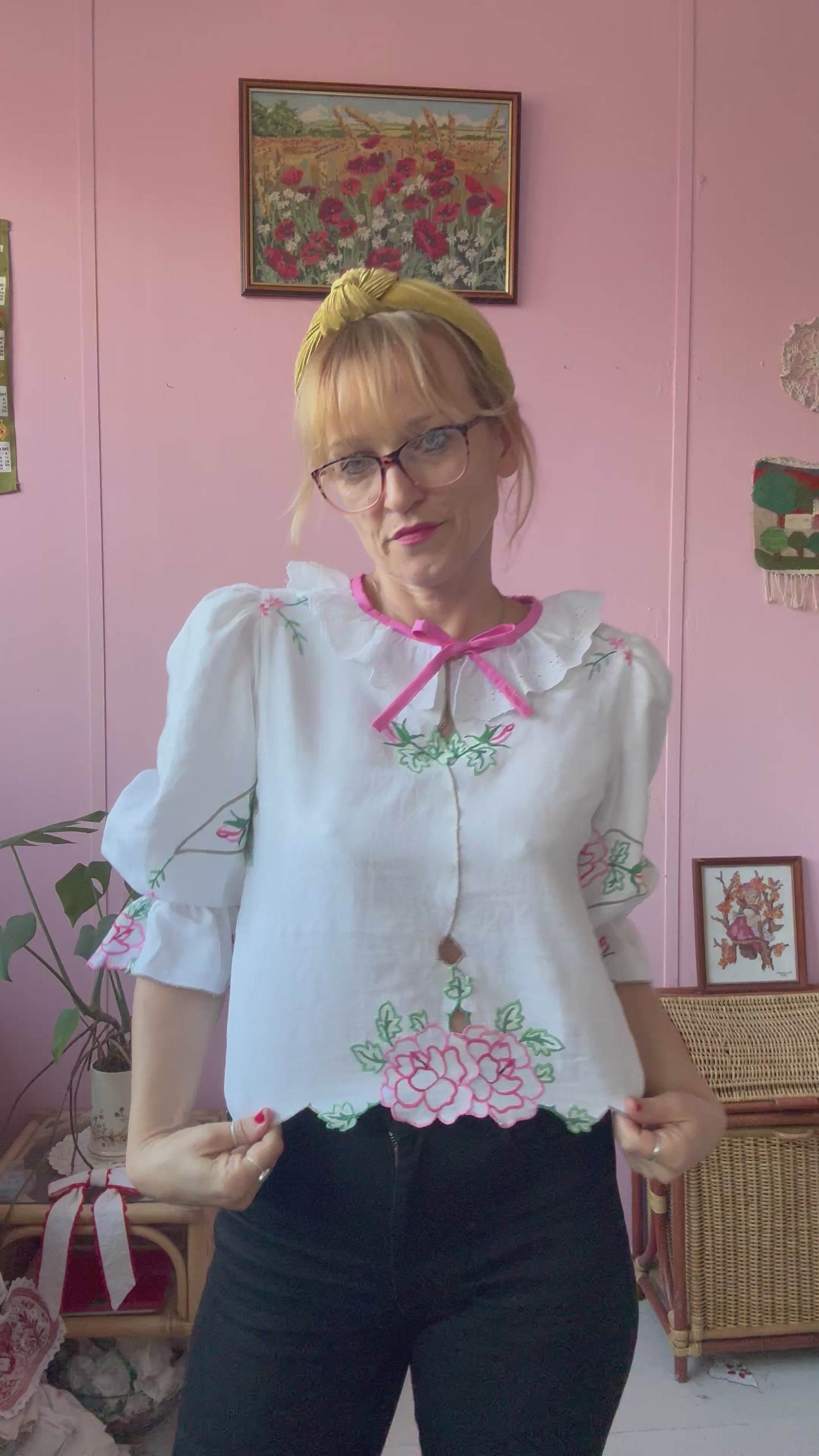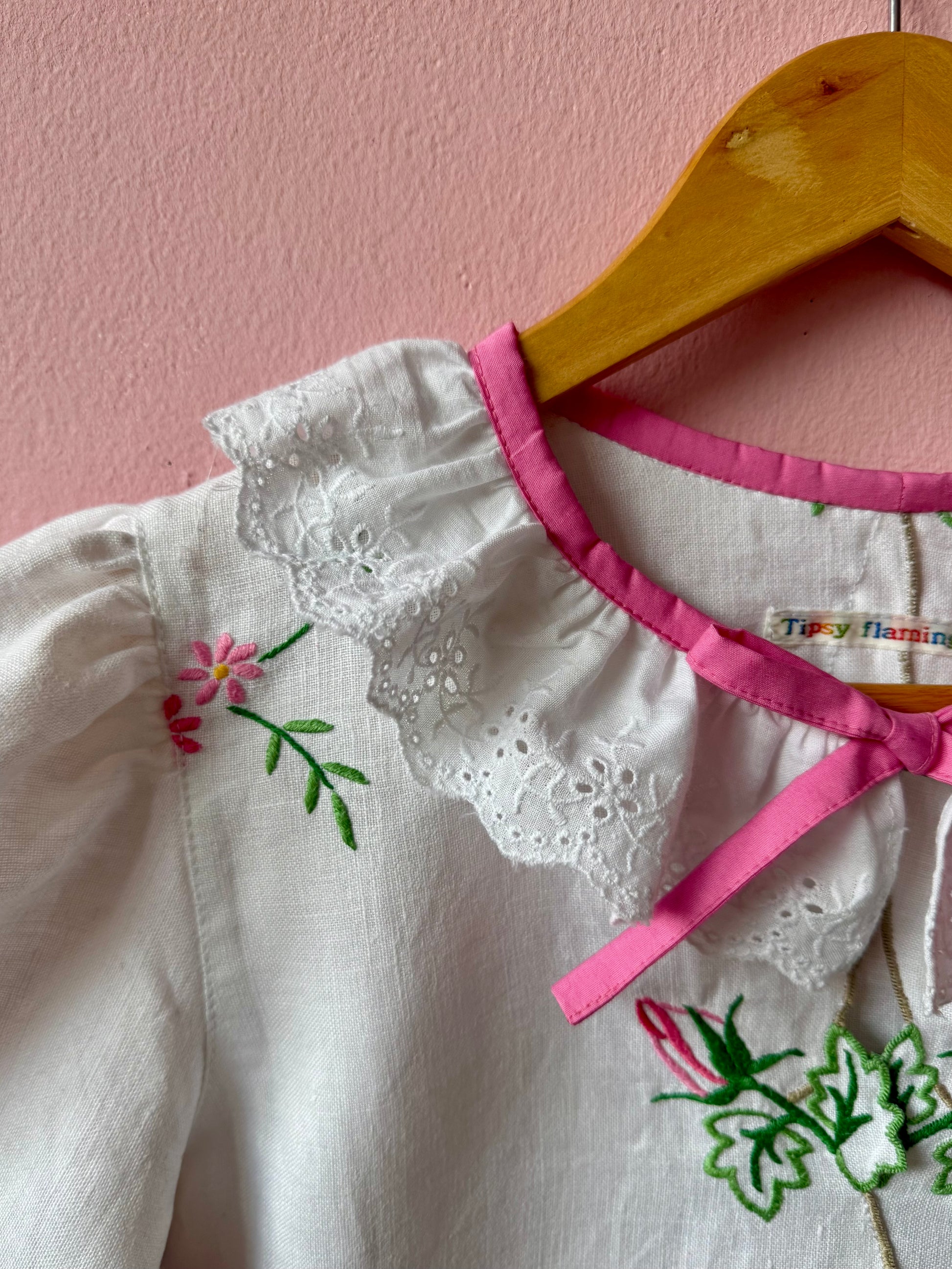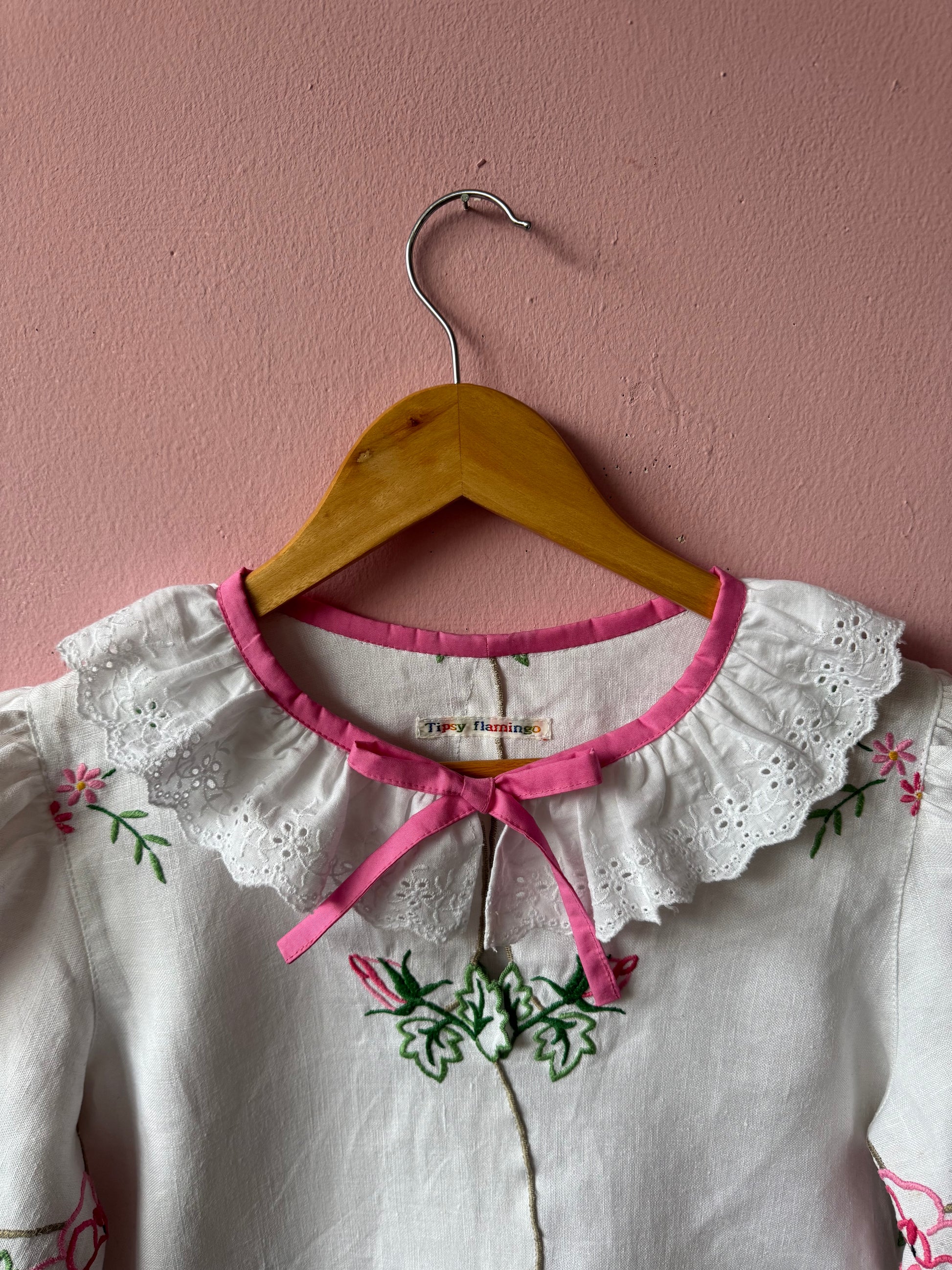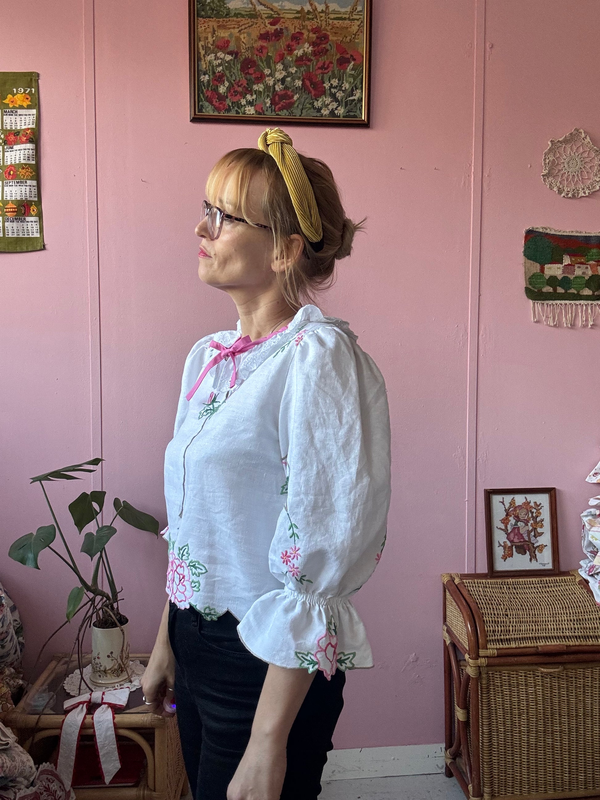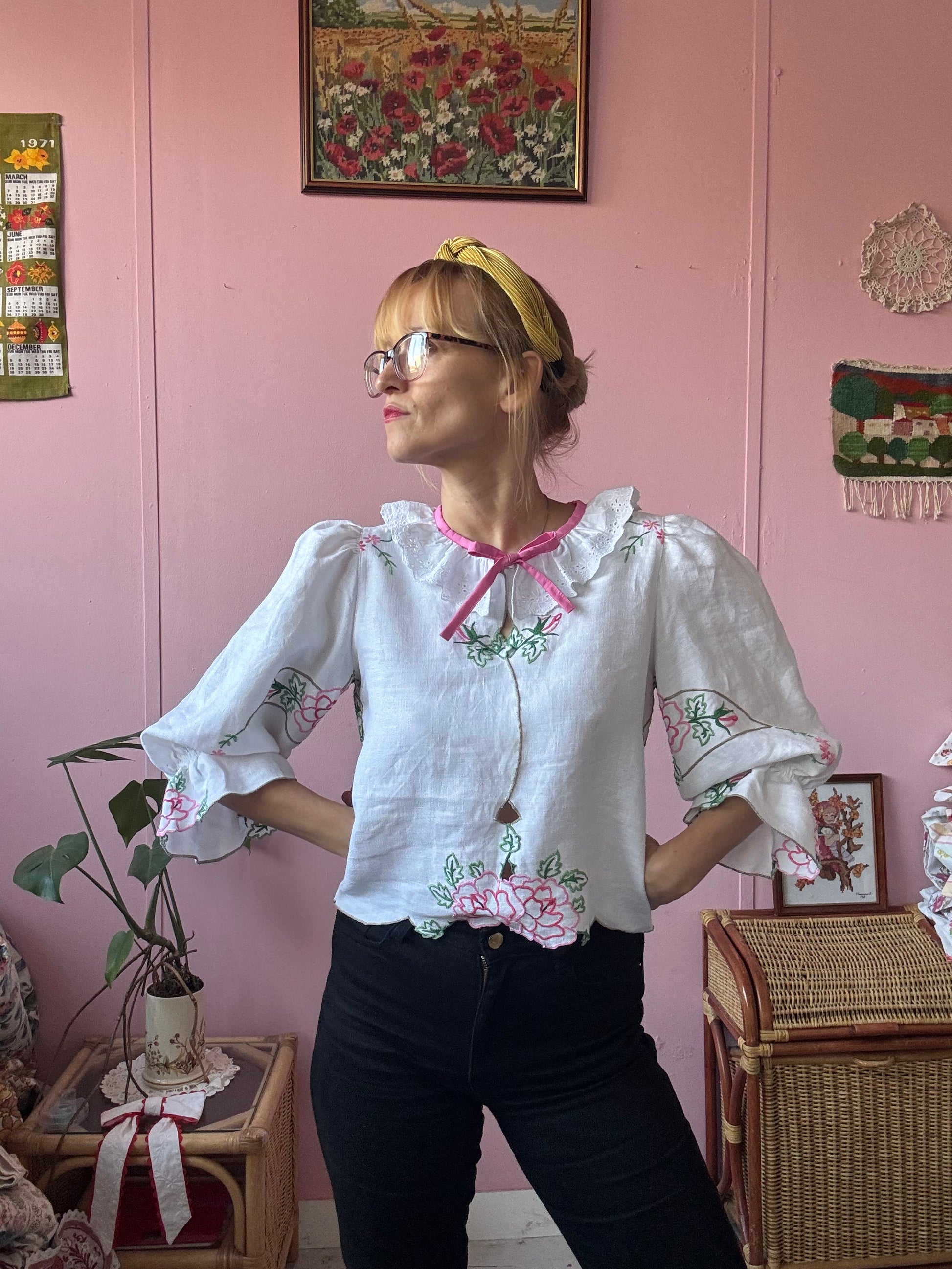 Linen blouse made from vintage tablecloth with pink flowers/roses hand embroidery
