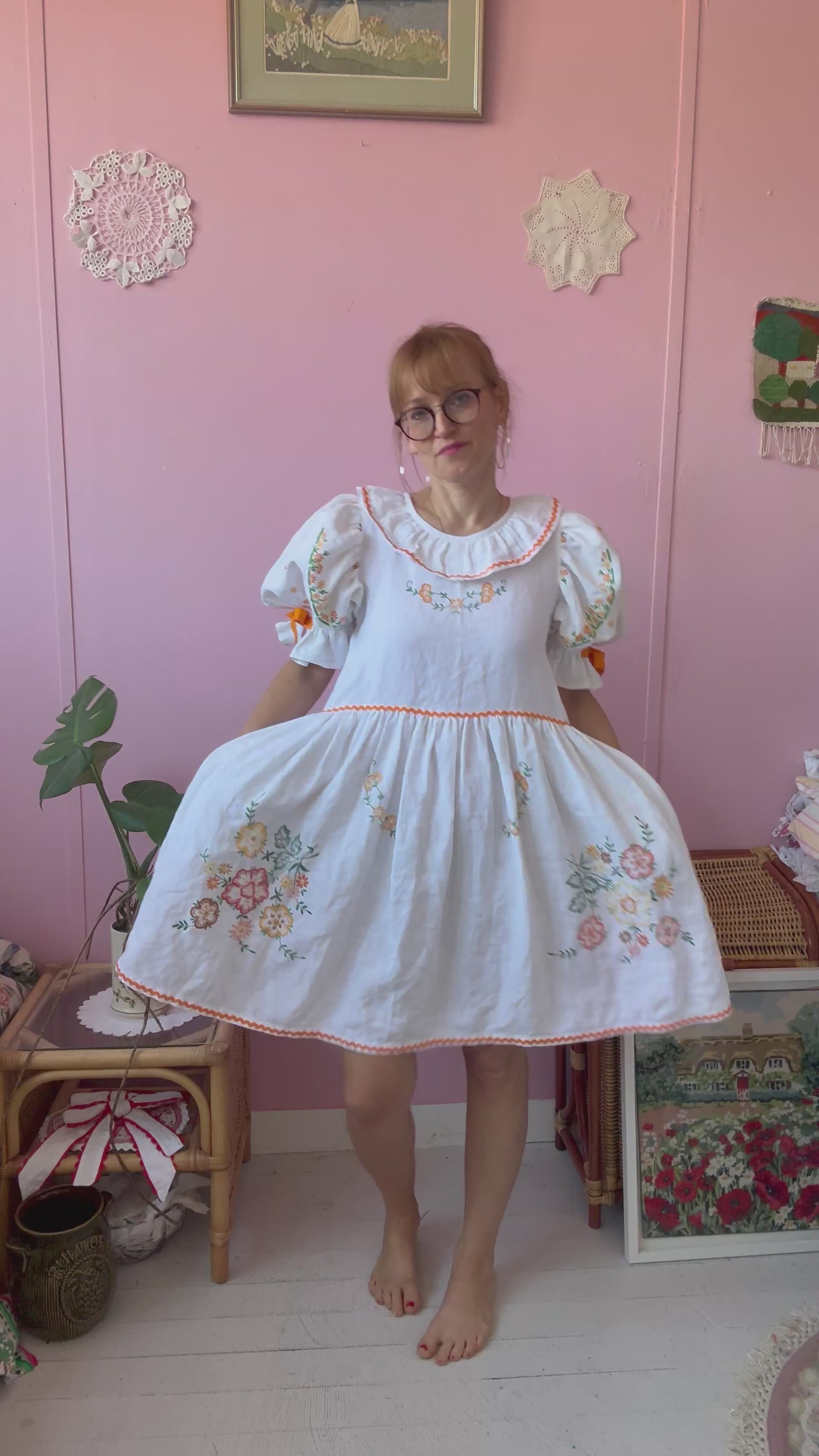 Linen dress made from 2 vintage tablecloths with floral hand embroidery-amazing details