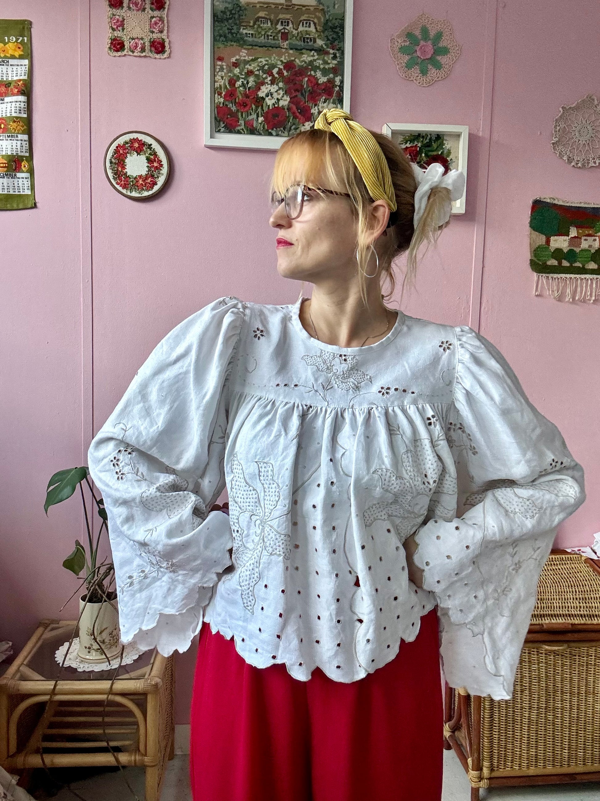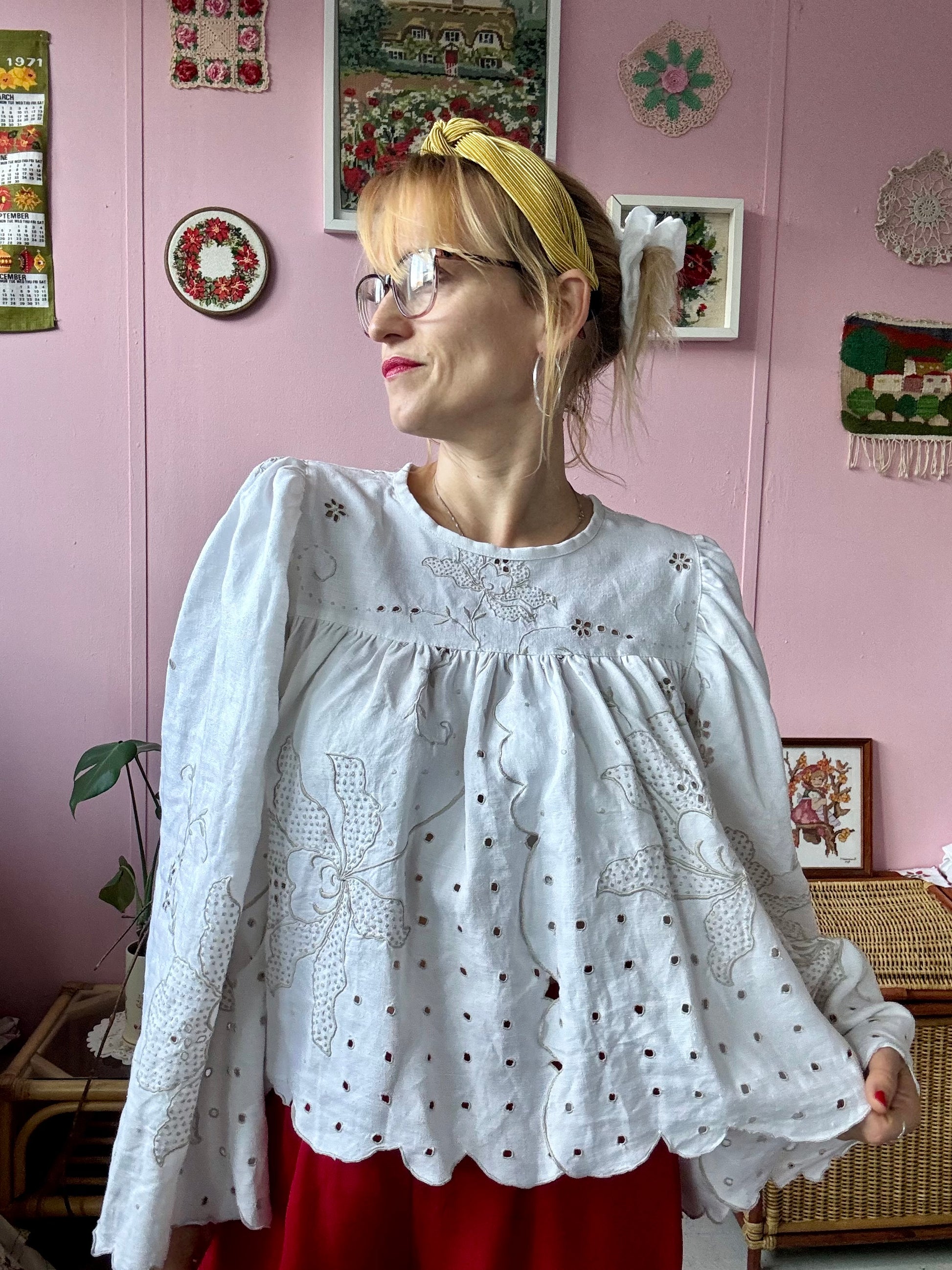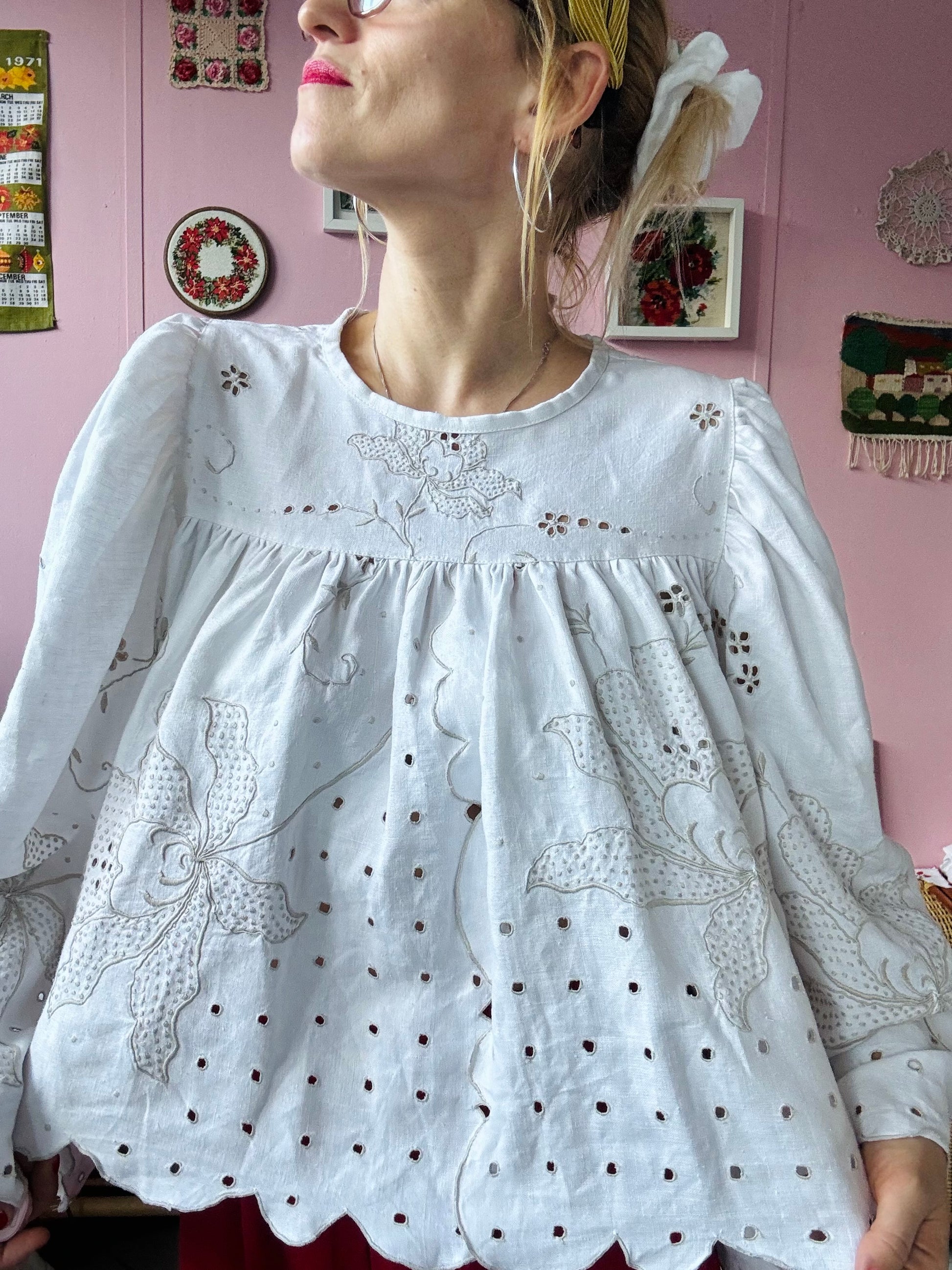 Linen blouse made from vintage tablecloth with floral Madeira embroidery
