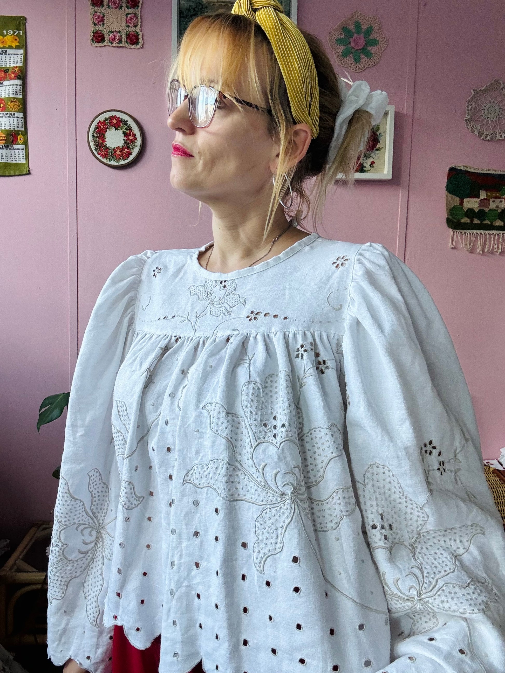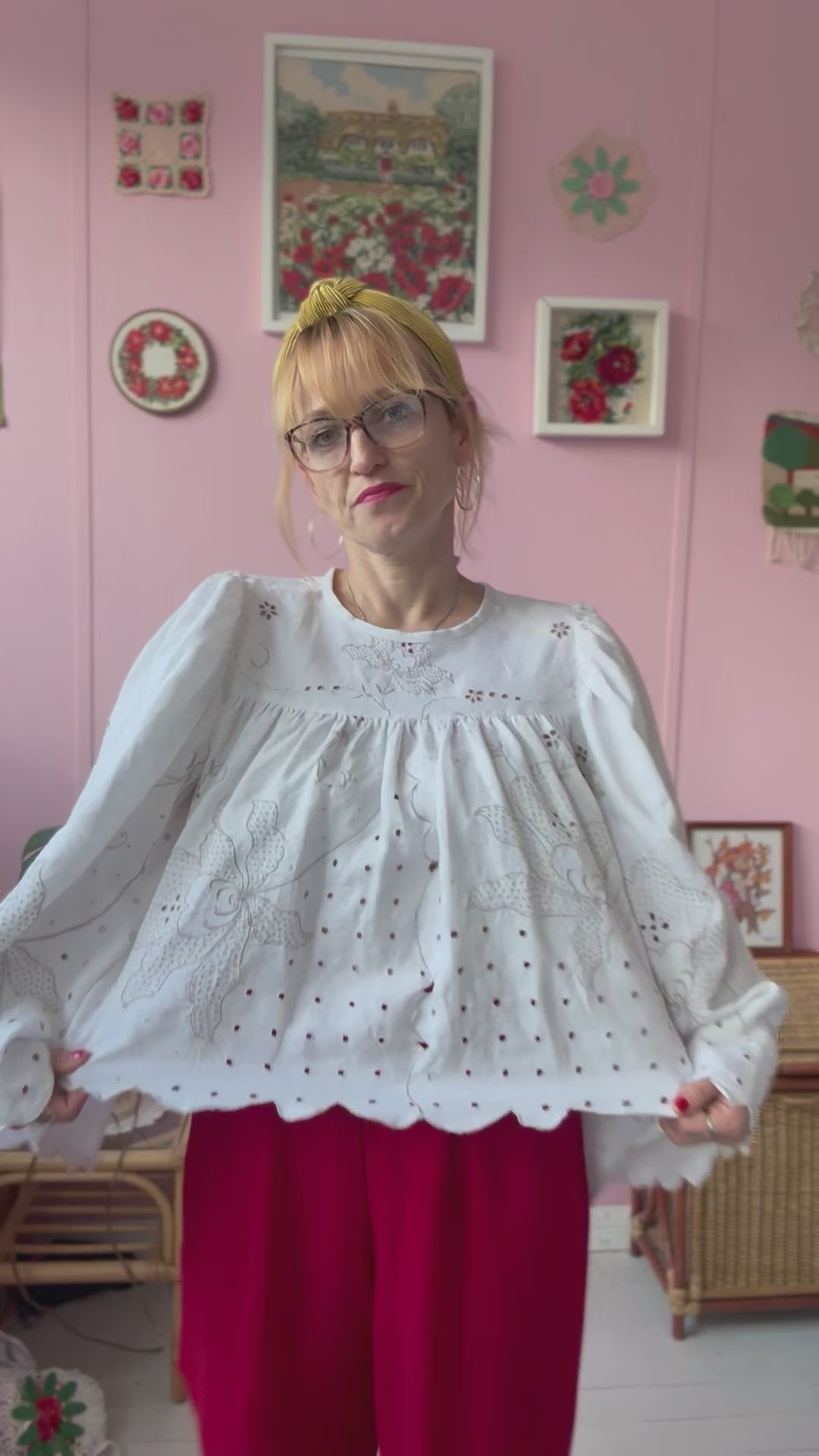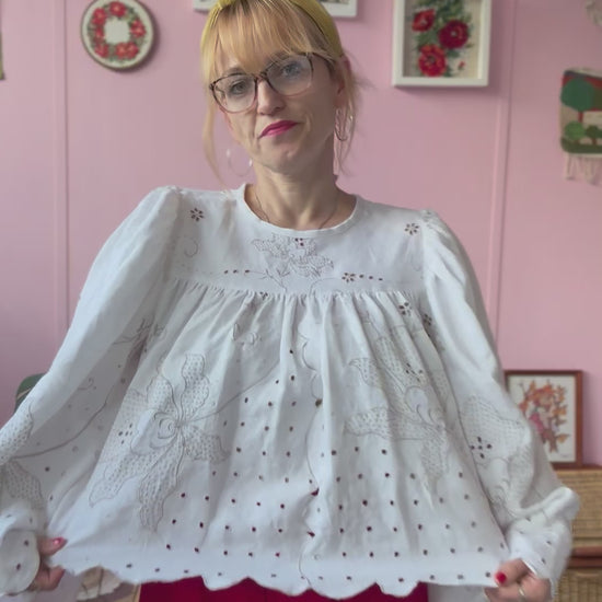 Linen blouse made from vintage tablecloth with floral Madeira embroidery