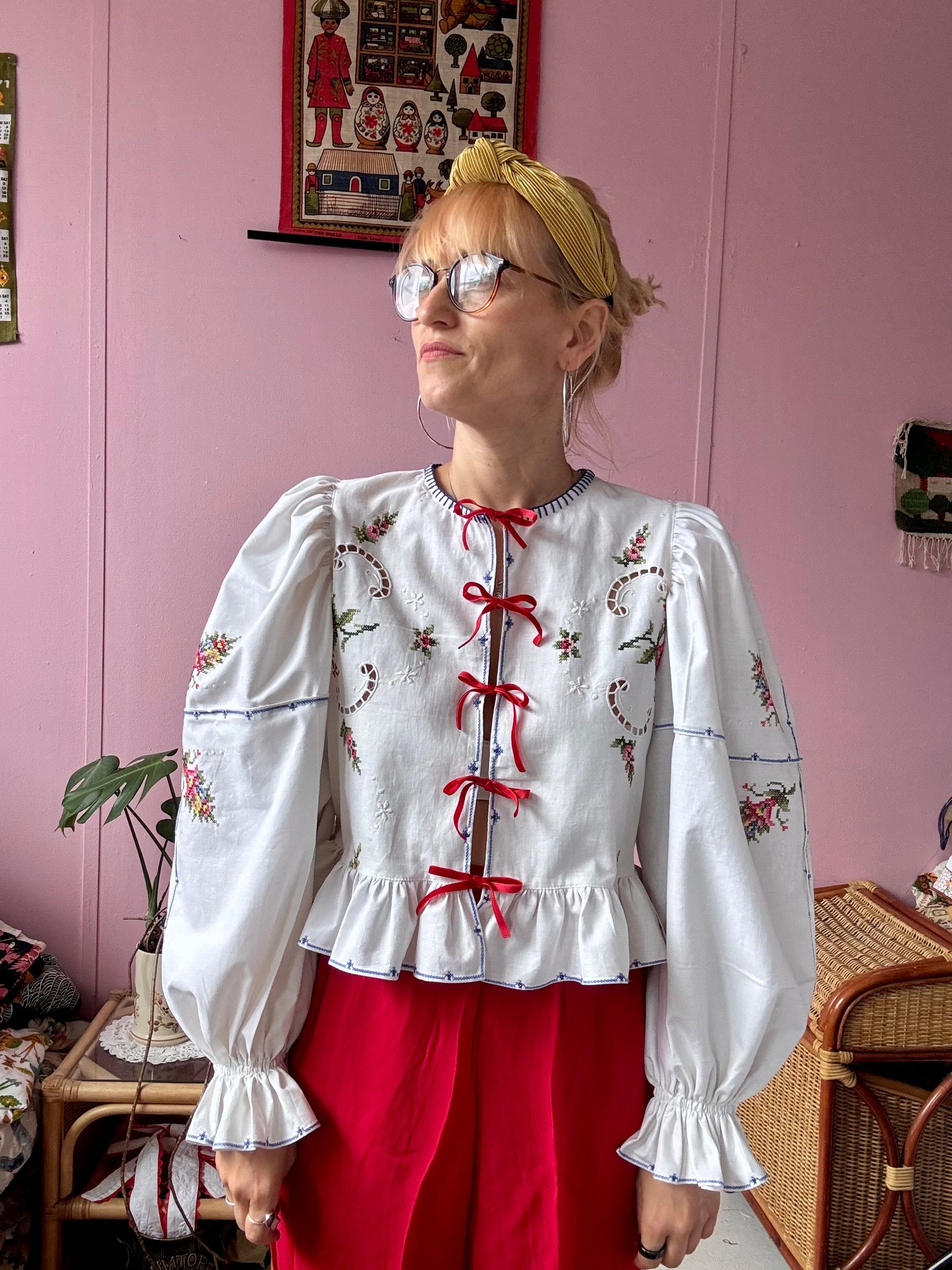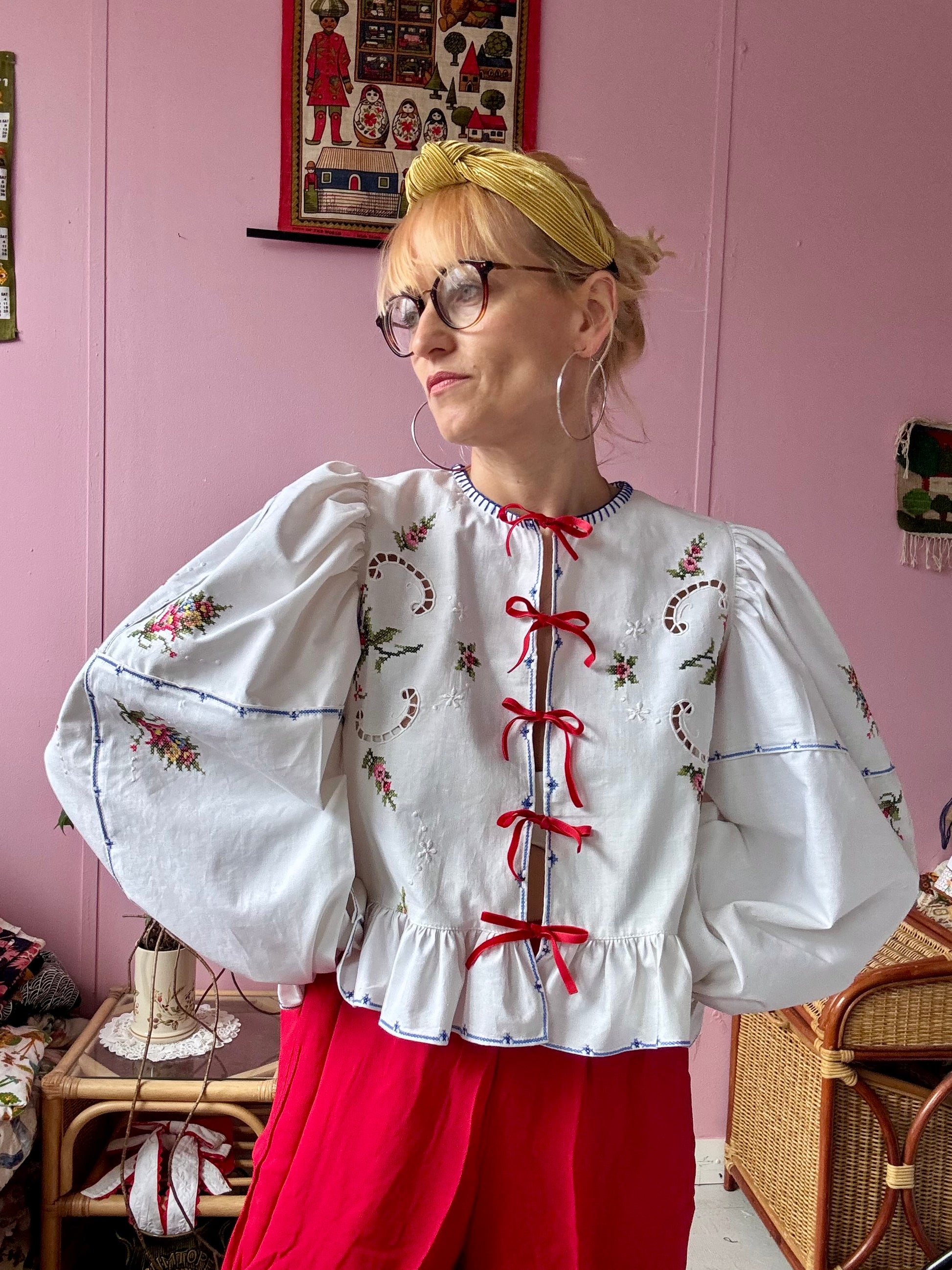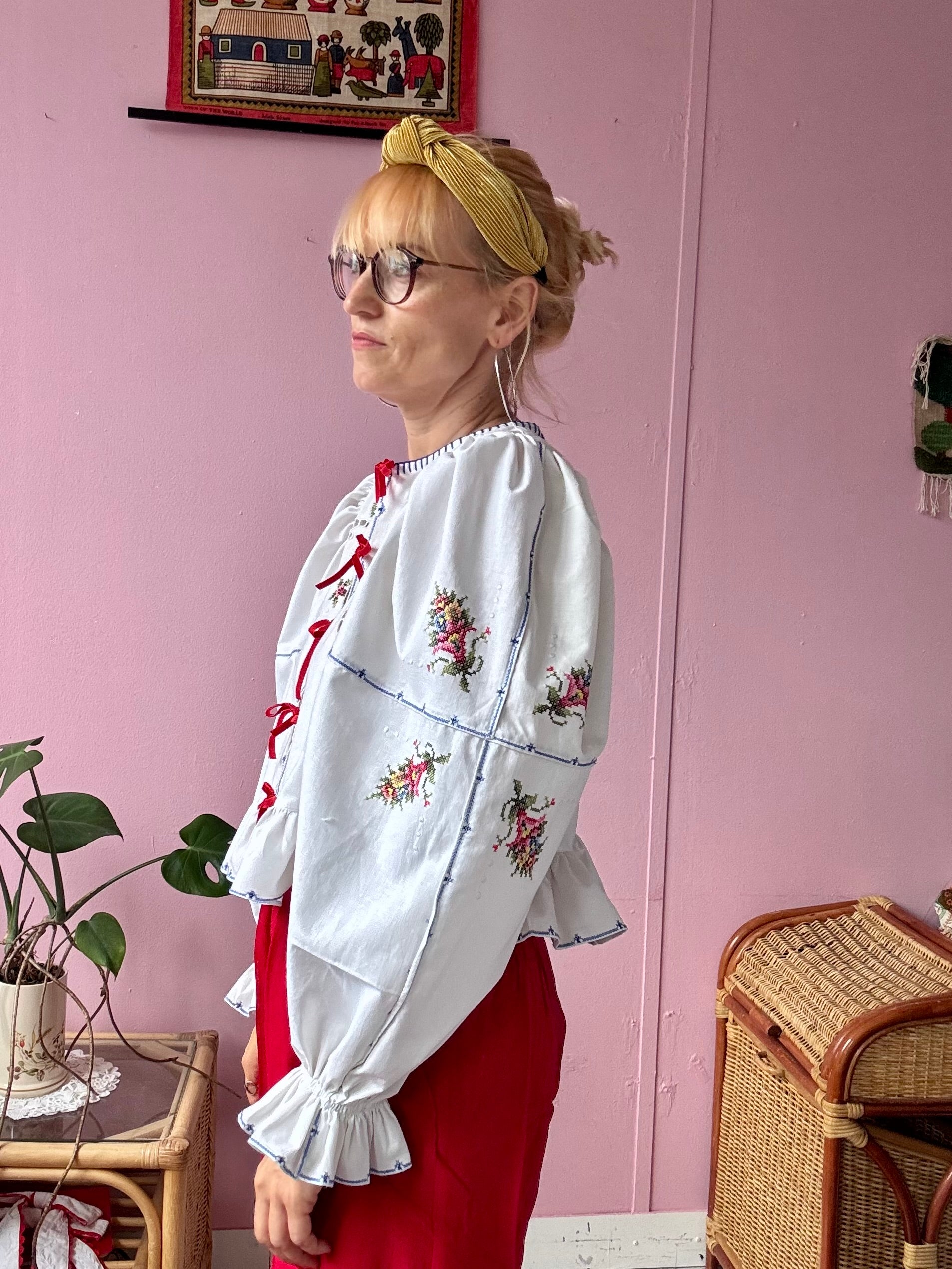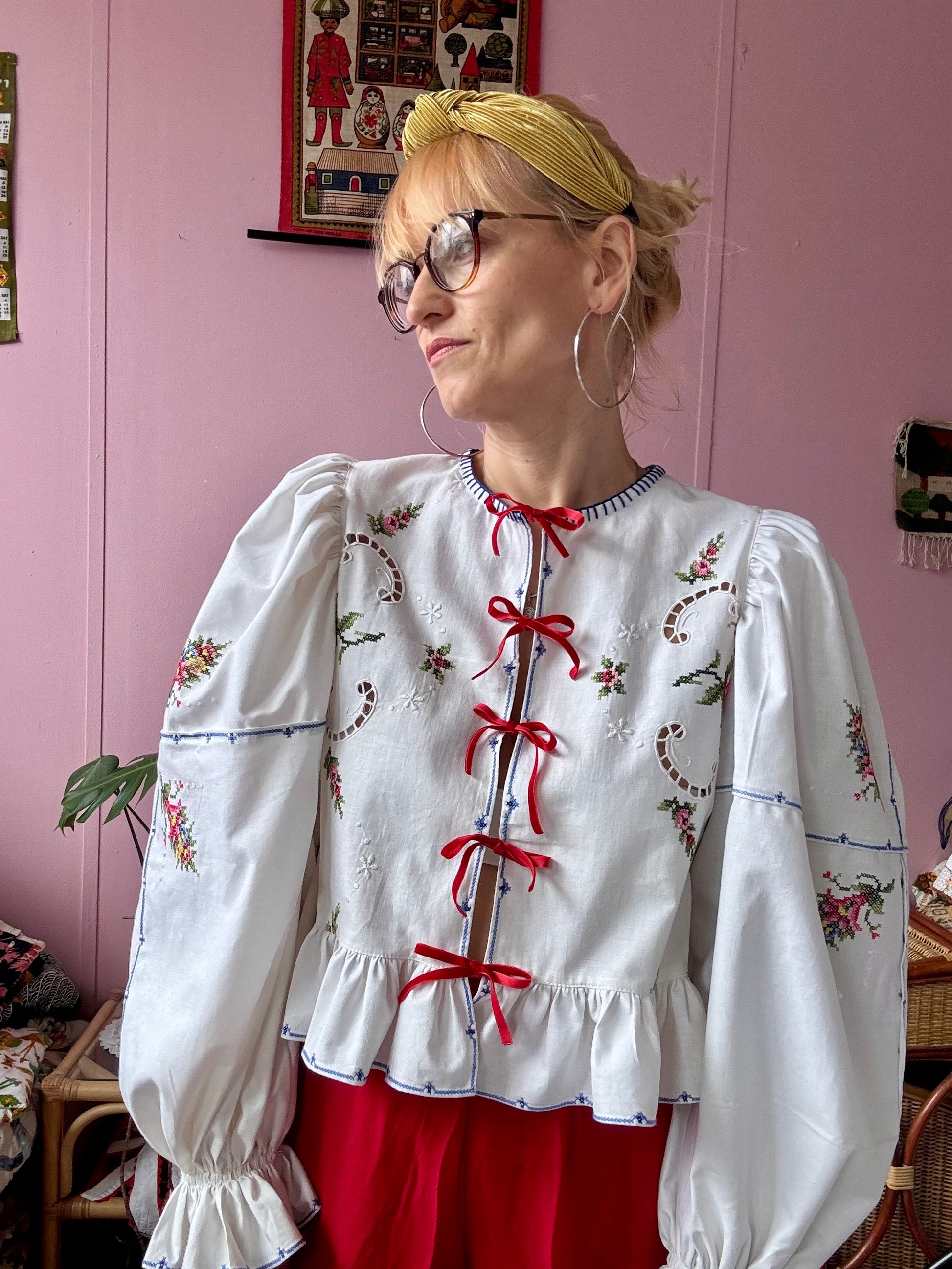 White floral blouse made from vintage tablecloth and napkins with hand embroidery and lace parts