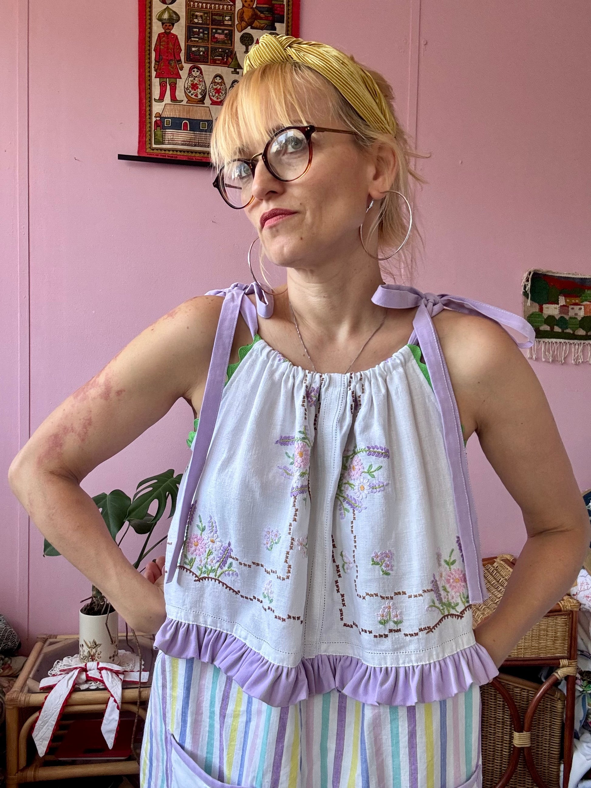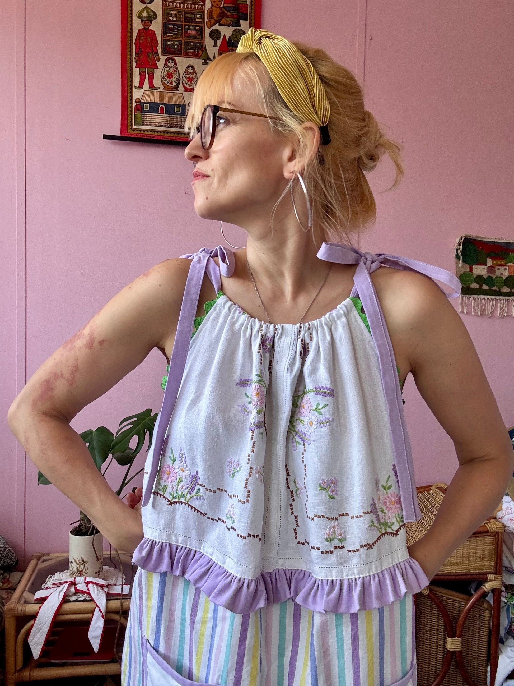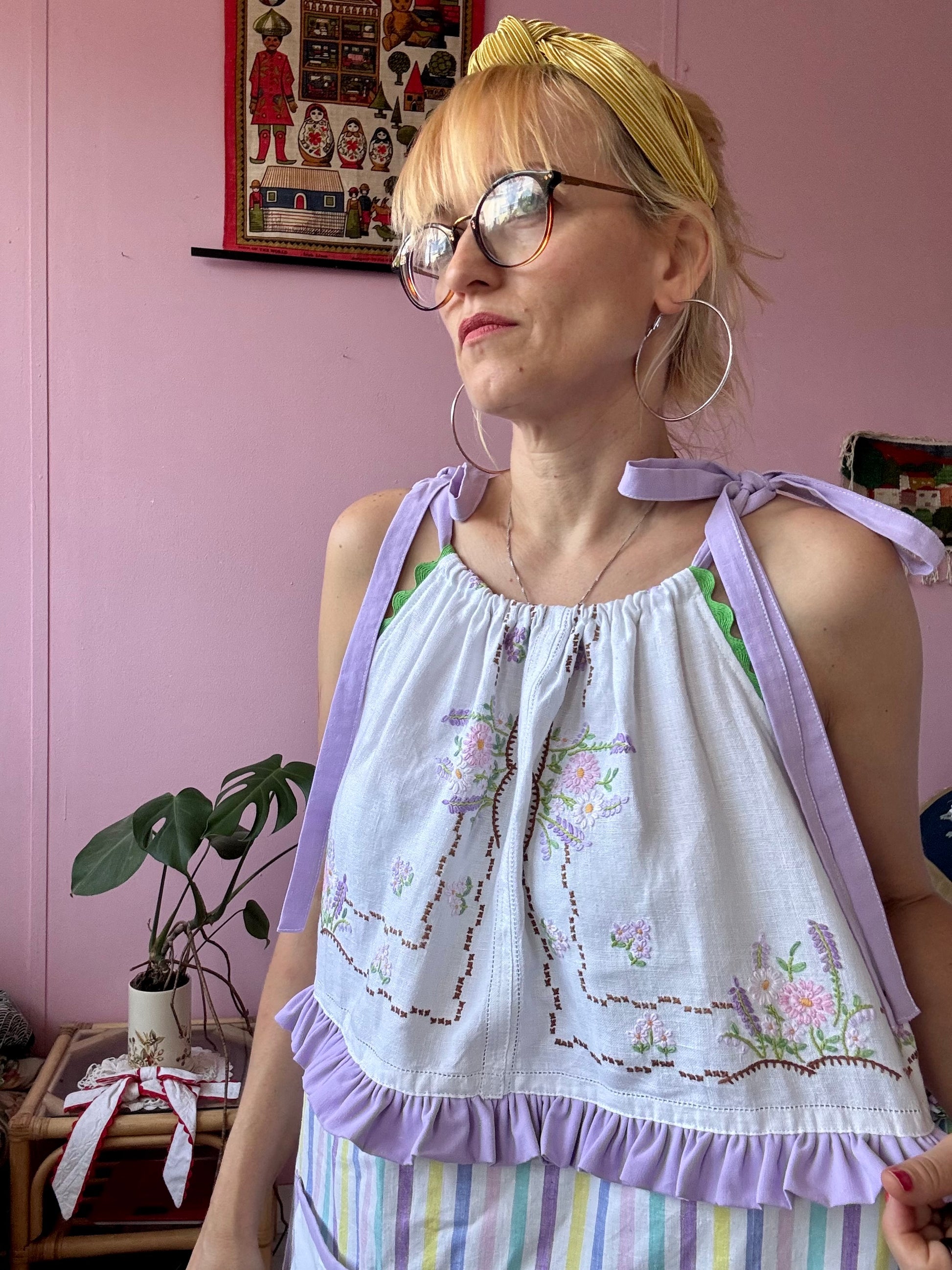 Top part is made from vintage linen tablecloth with floral hand embroidery