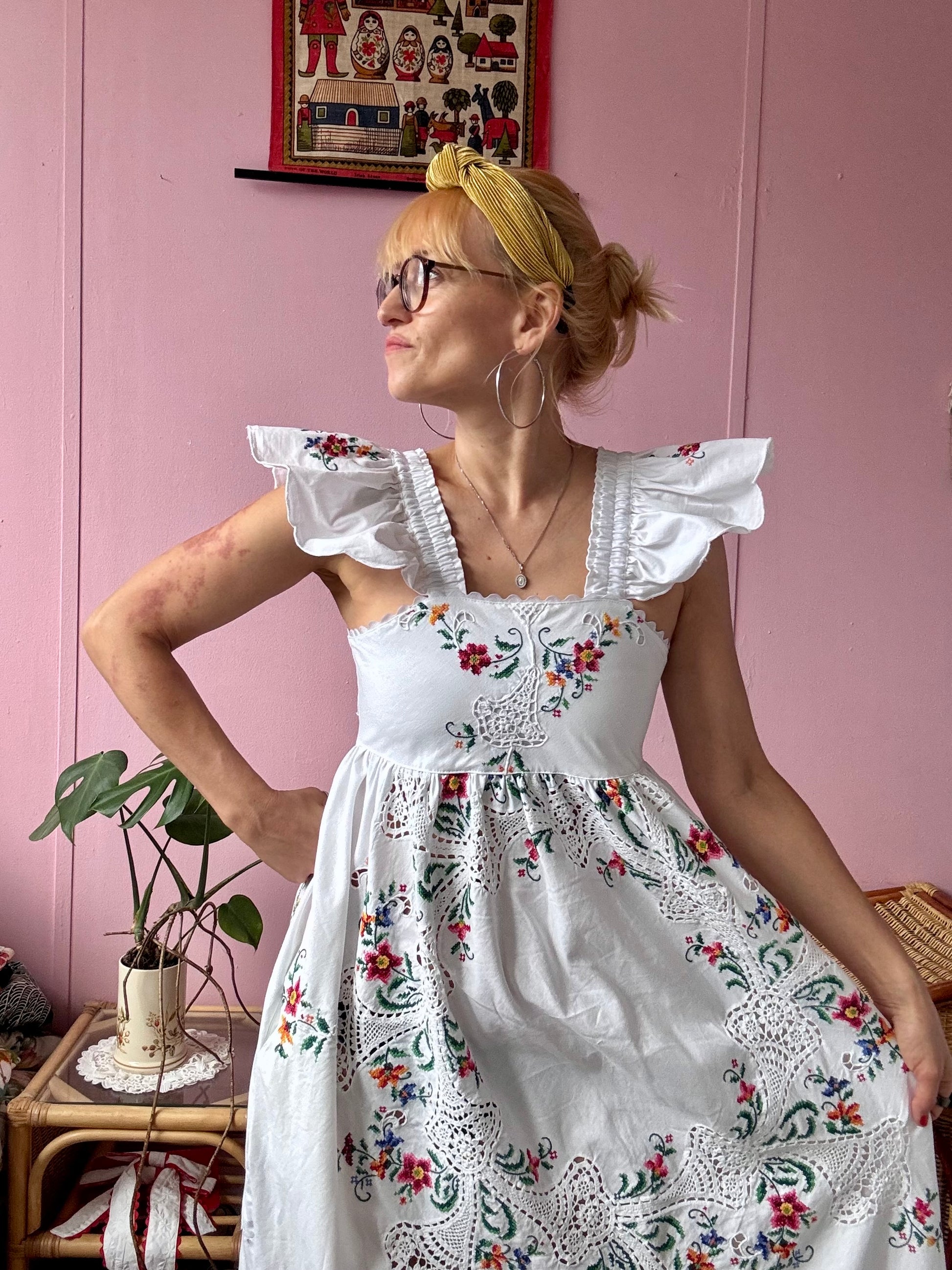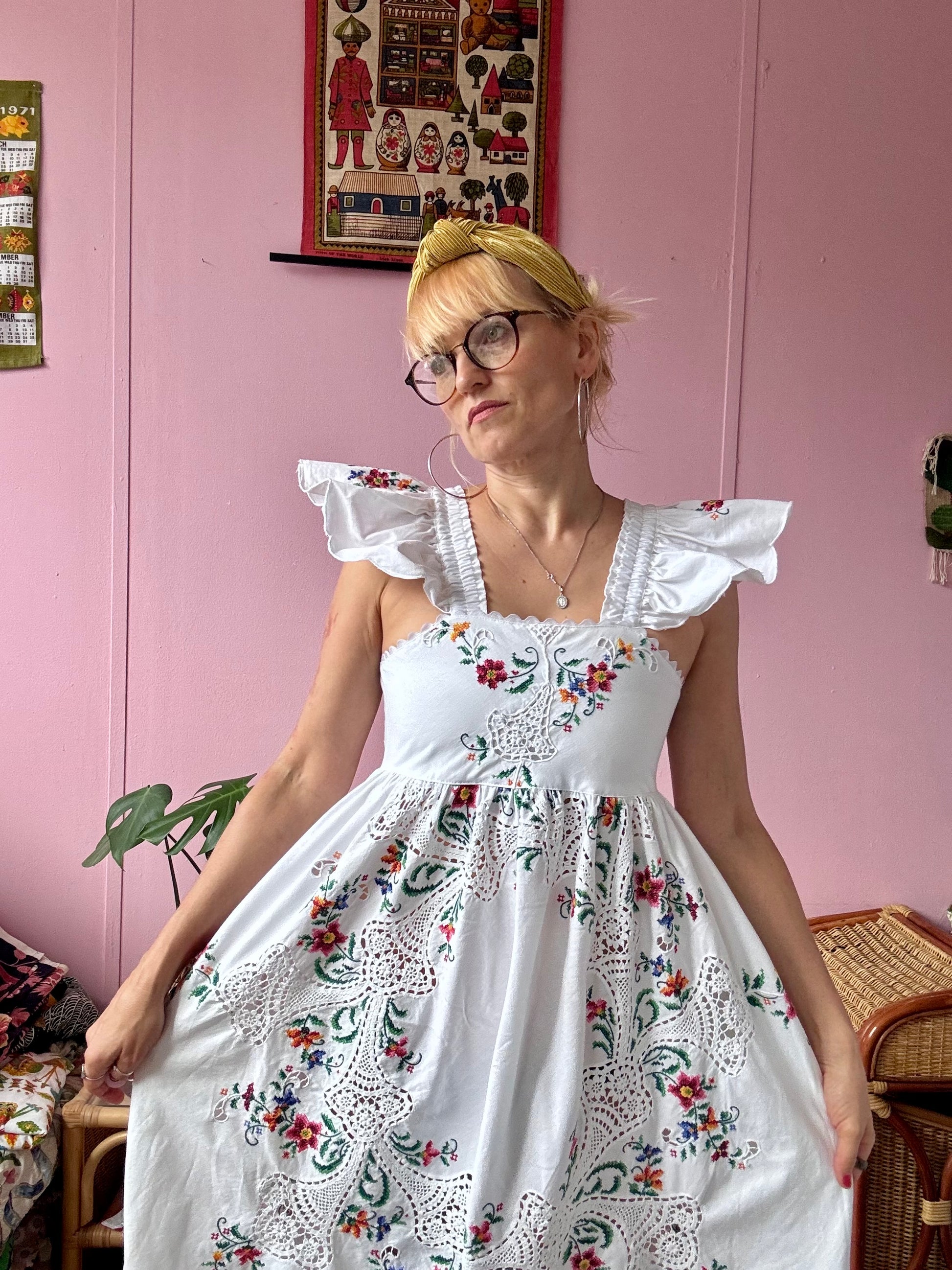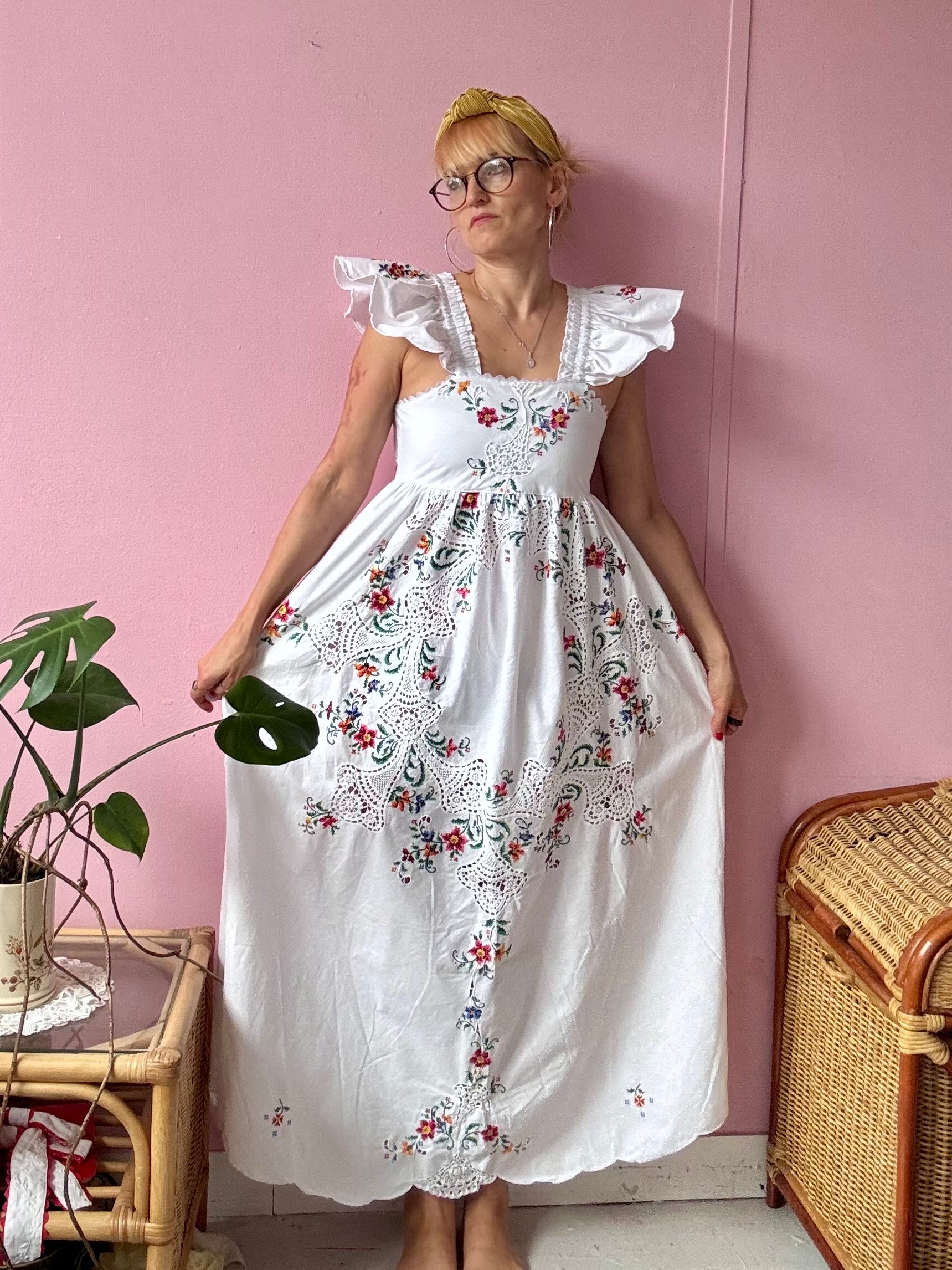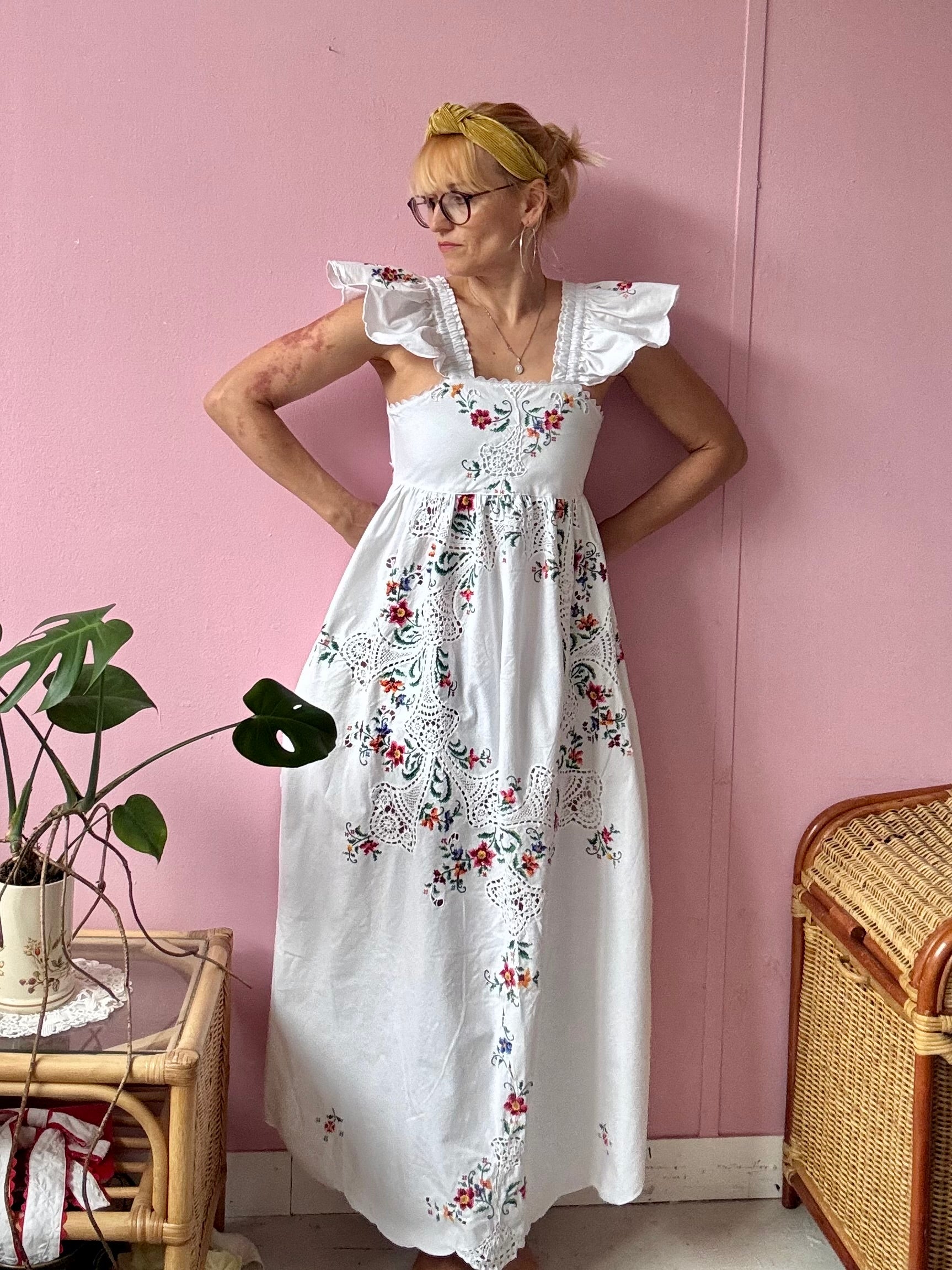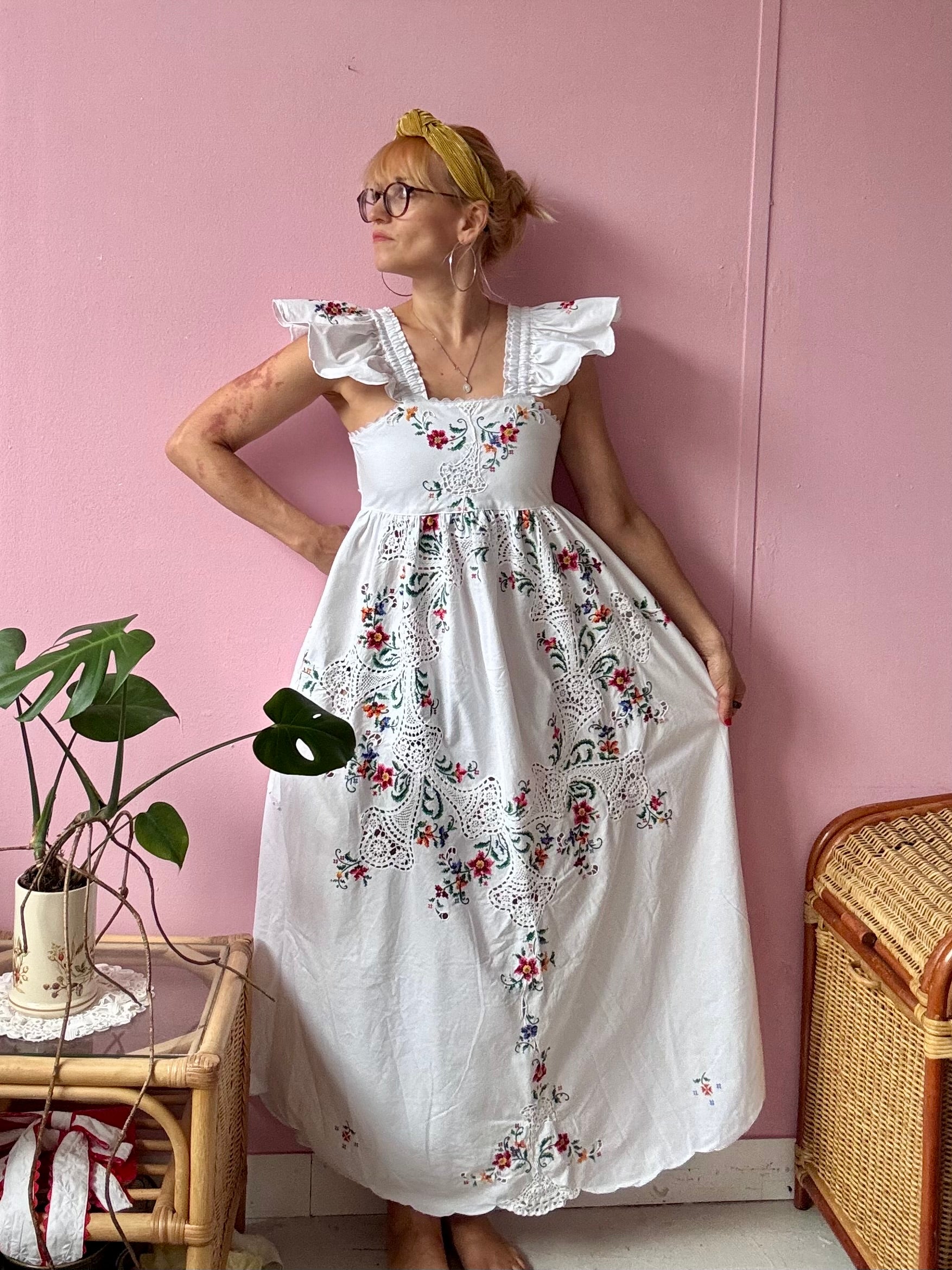 White cotton maxi dress made from 2 vintage tablecloths with floral hand embroidery and lace panels-amazing details all over