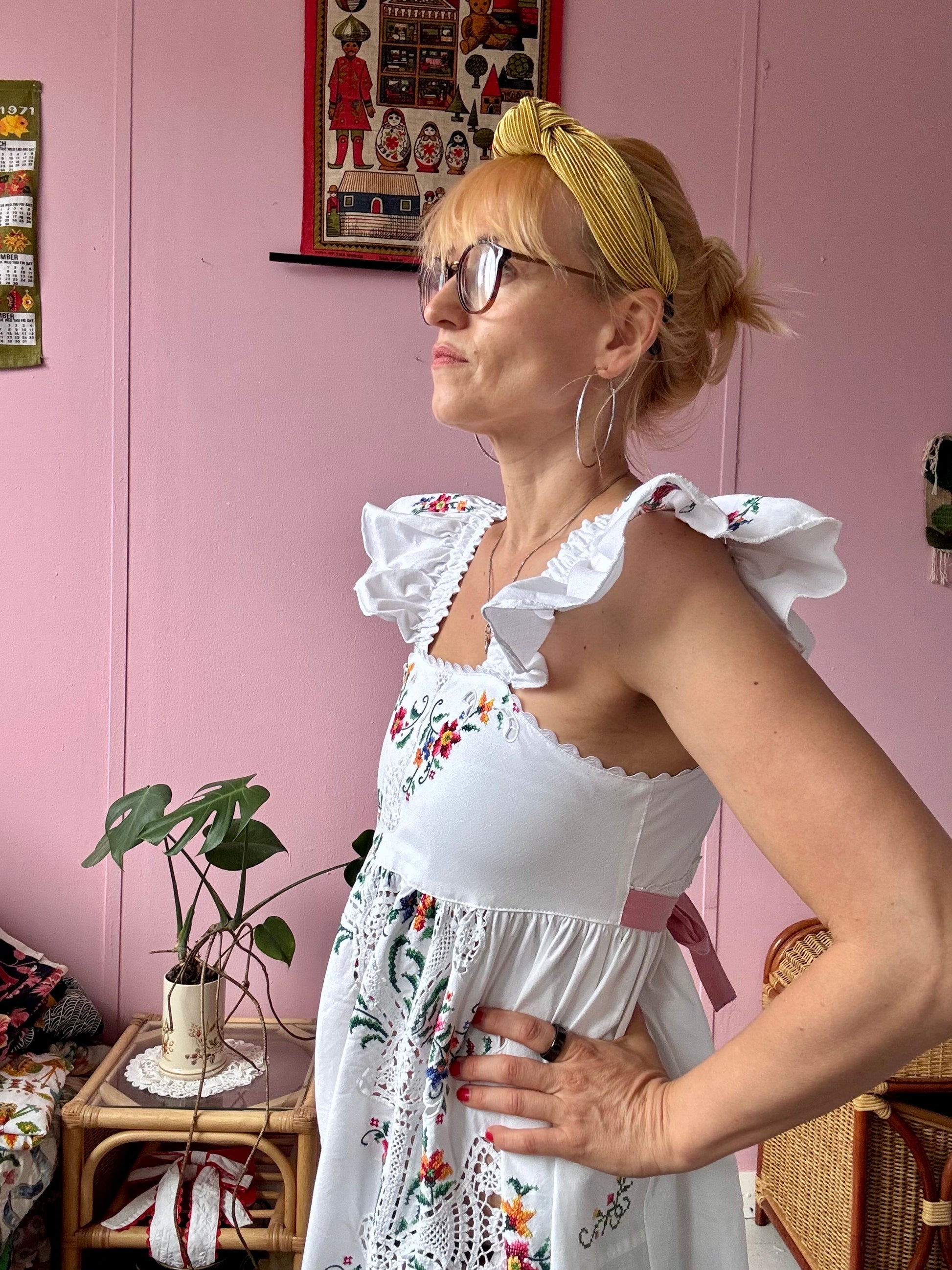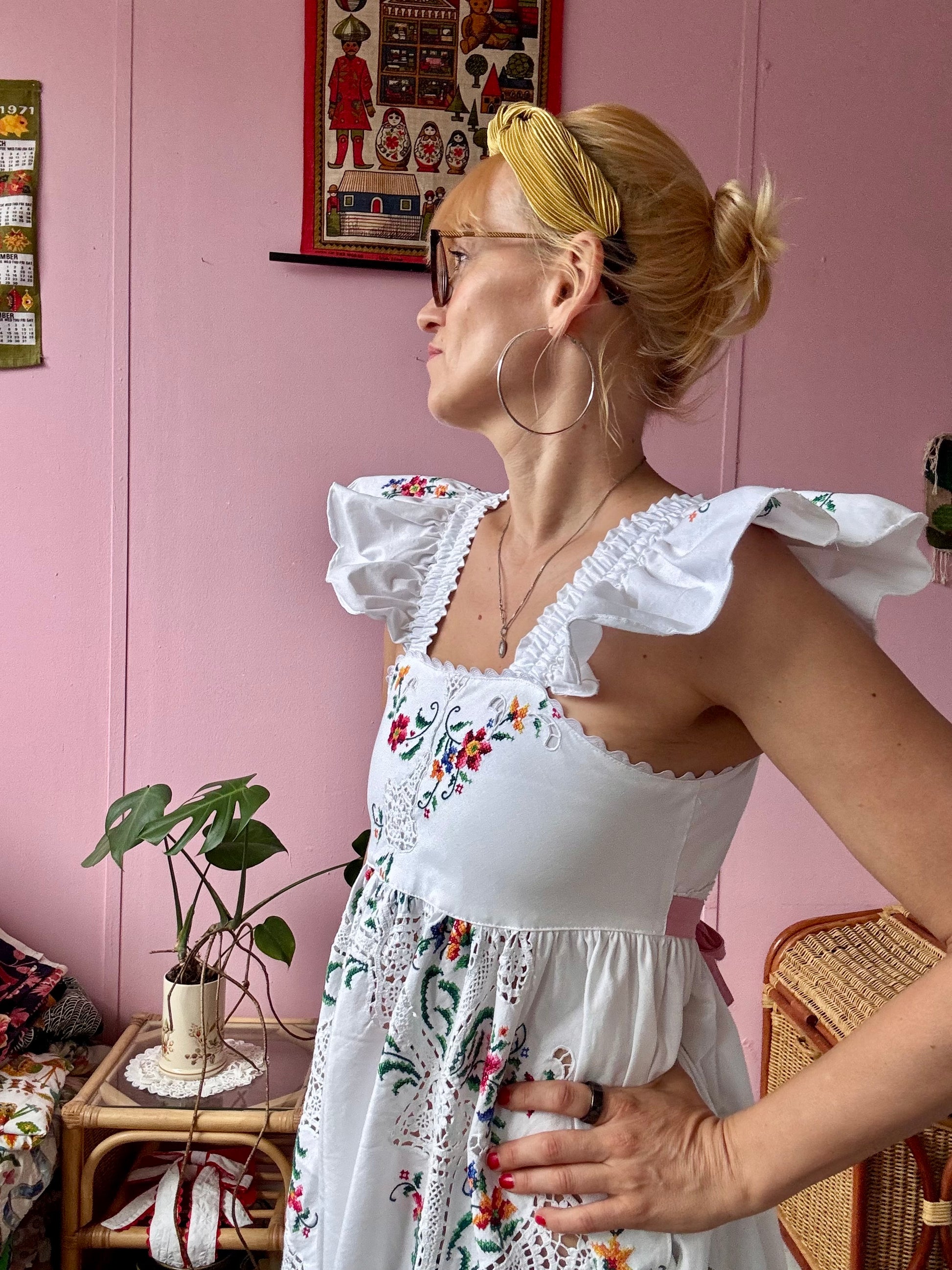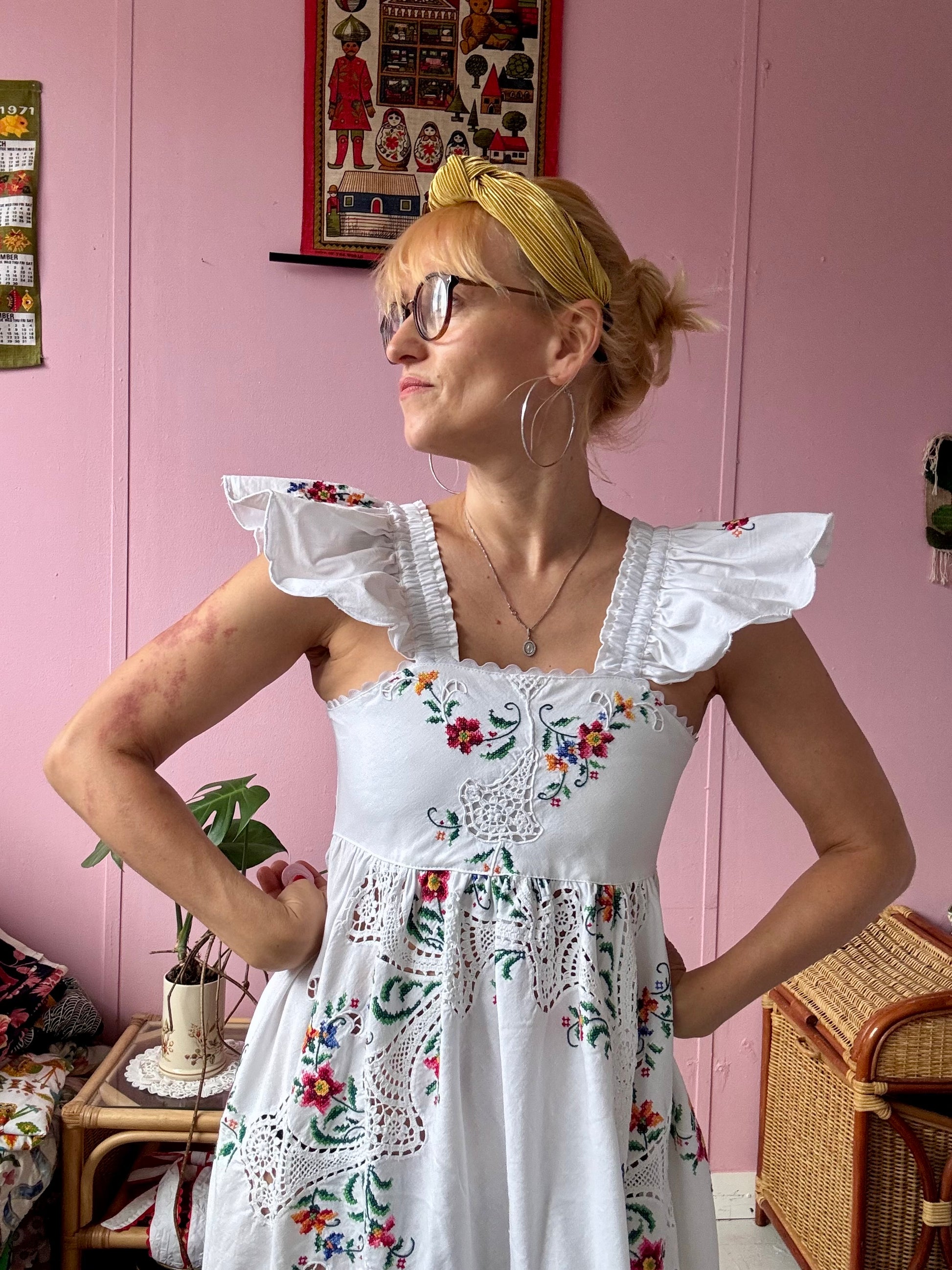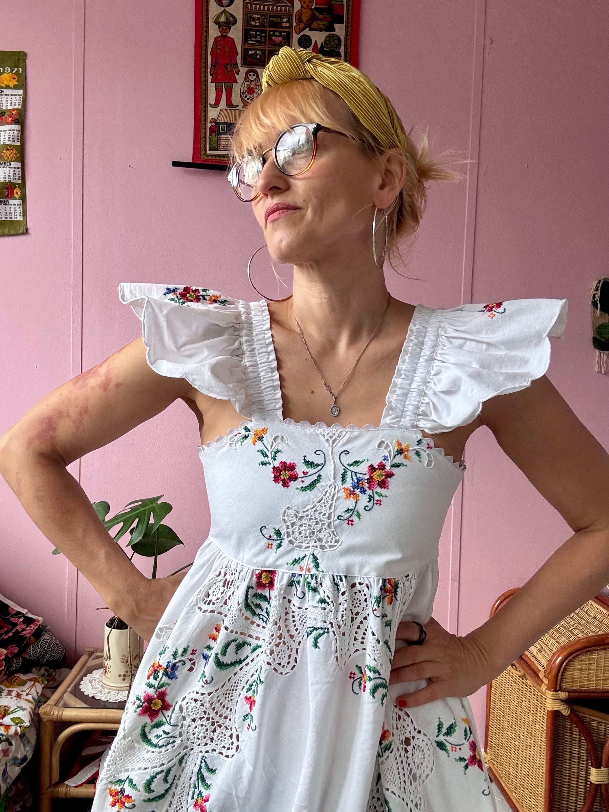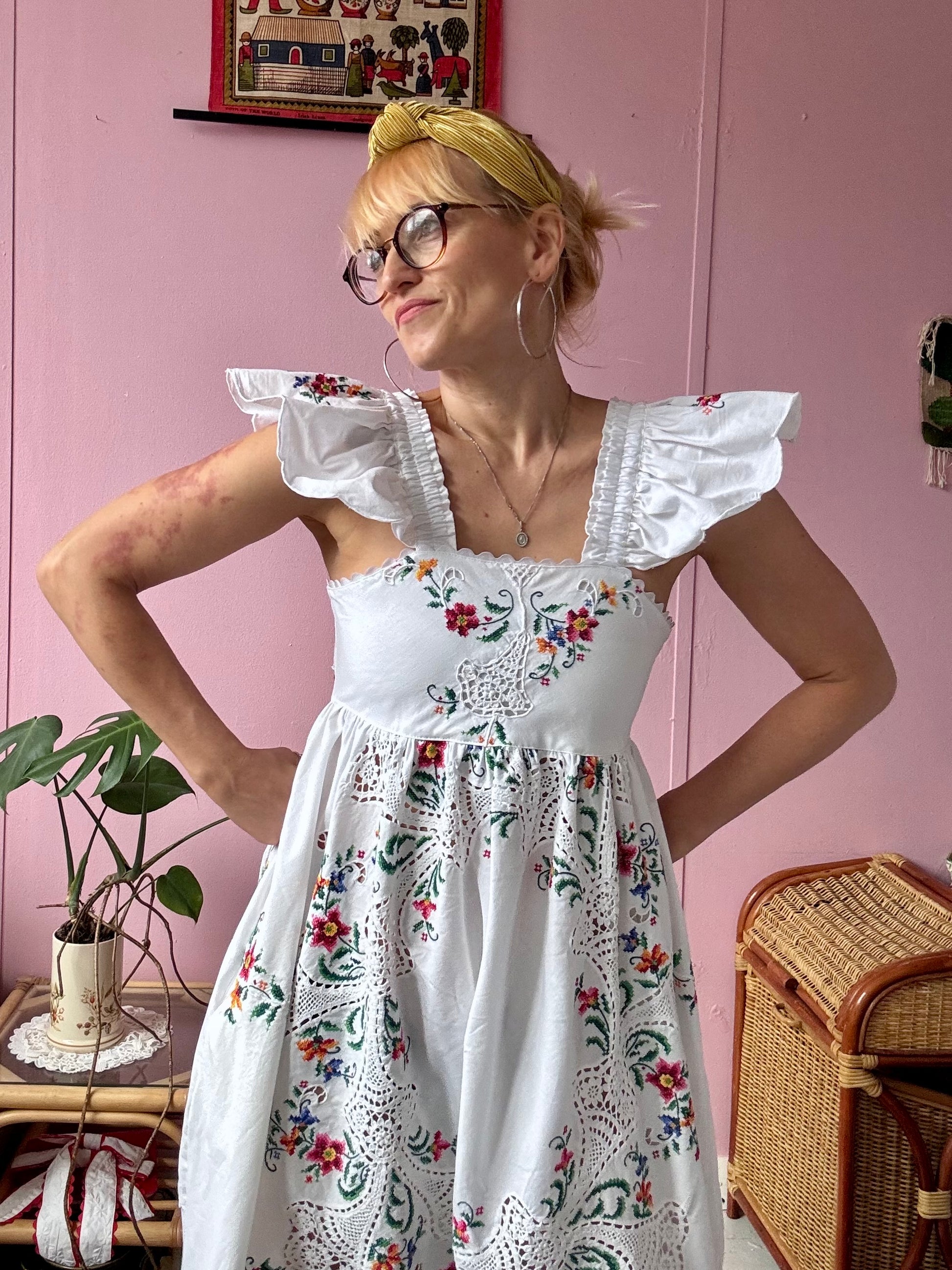 White cotton maxi dress made from 2 vintage tablecloths with floral hand embroidery and lace panels-amazing details all over